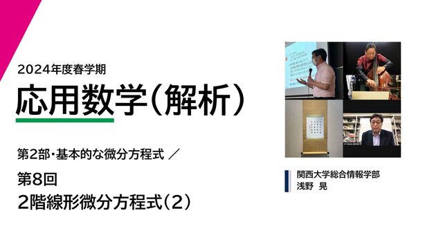A cos 2t , なので, を元の方程式に代入すると x′ = − 2A sin 2t x′ ′ = − 4A cos 2t x′ , x′ ′ これが t に関係なくなりたつから, A = − 1 3 非斉次形の方程式の特殊解(のひとつ)は x = − 1 3 cos 2t x′′ + x = cos 2t このように「勘」をはたらかせる −4A cos 2t + A cos 2t = cos 2t (−4A + A − 1)cos 2t = 0 あとは,対応する斉次形の方程式 の一般解を求めてください。 x′ ′ + x = 0