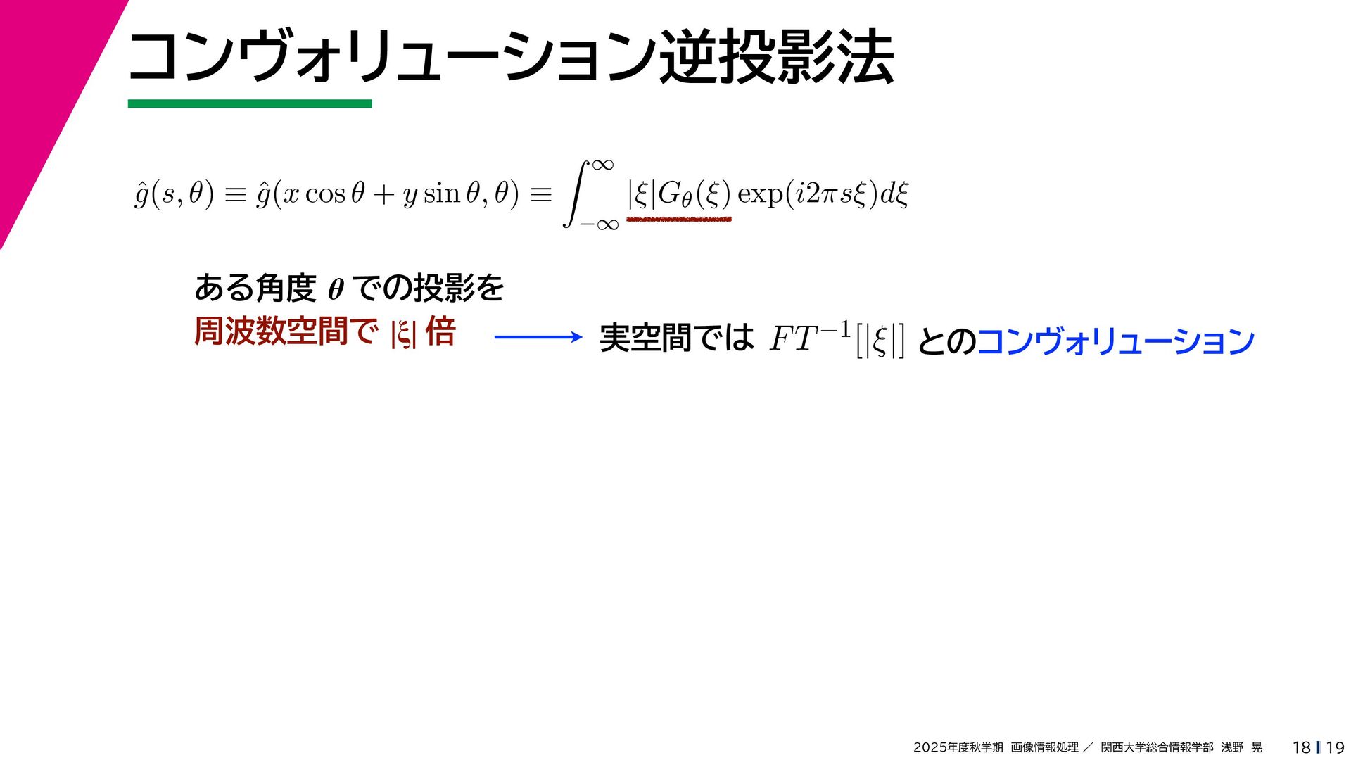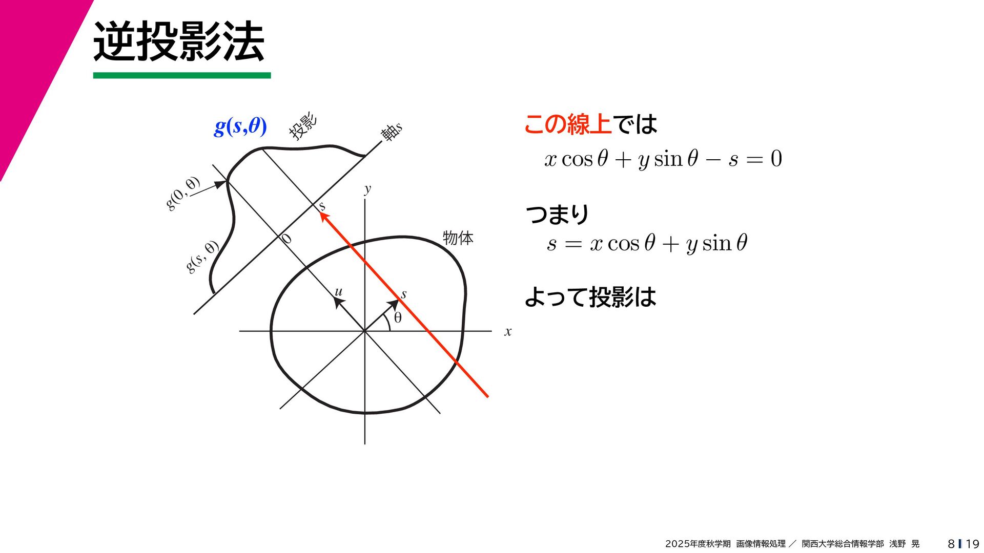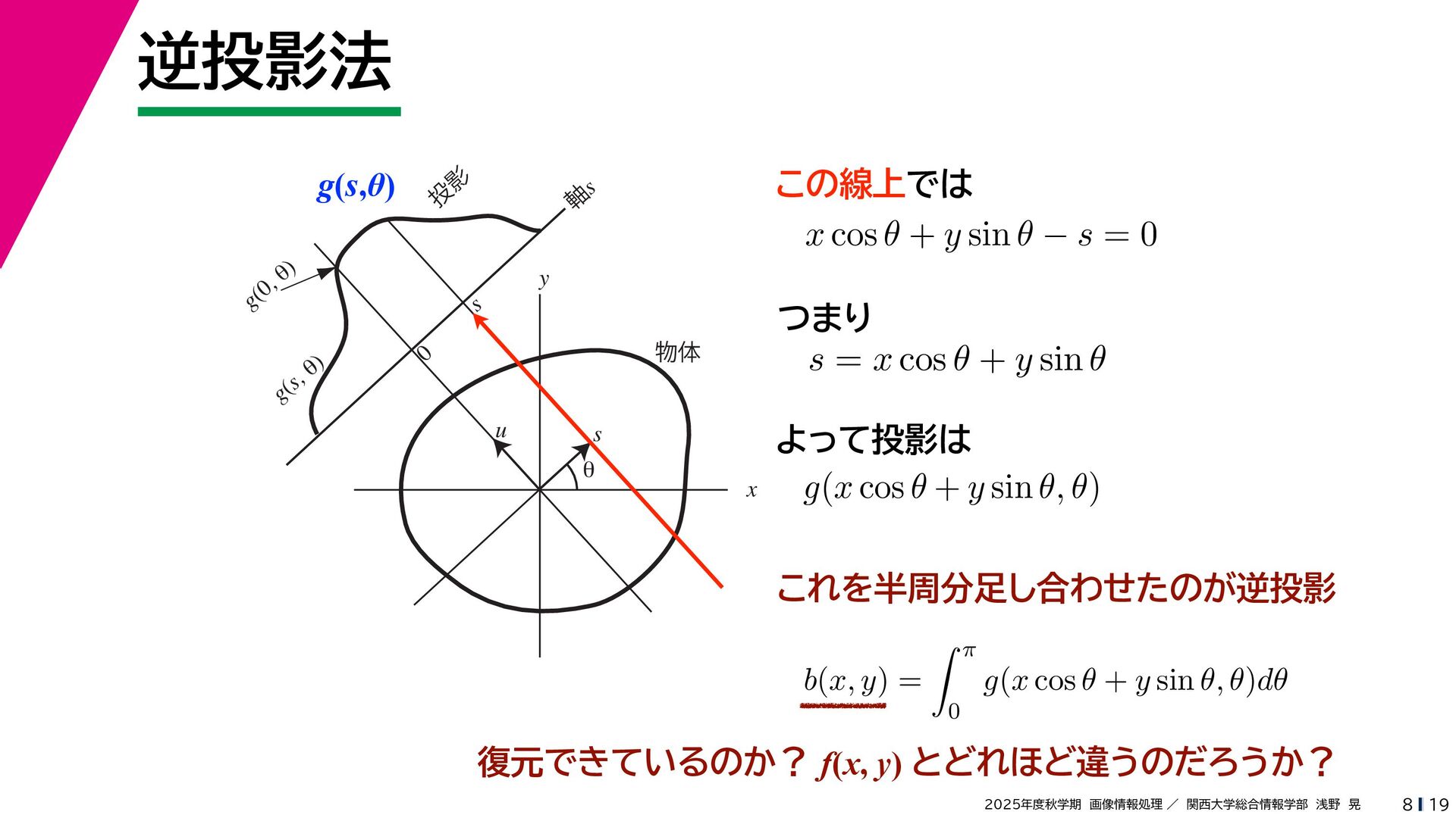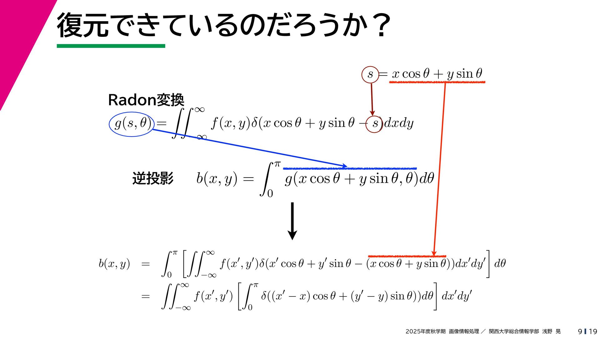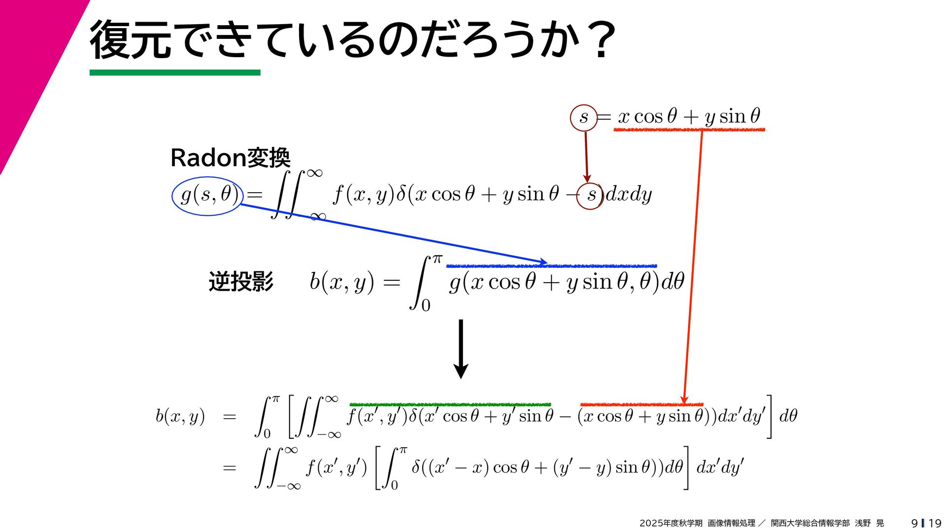 + y sin θ b(x, y) = π 0 g(x cos θ + y sin θ, θ)dθ g(s, θ) = ∞ −∞ f(x, y)δ(x cos θ + y sin θ − s)dxdy Radon変換 逆投影 b(x, y) = π 0 ∞ −∞ f(x , y )δ(x cos θ + y sin θ − (x cos θ + y sin θ))dx dy dθ = ∞ −∞ f(x , y ) π 0 δ((x − x) cos θ + (y − y) sin θ))dθ dx dy