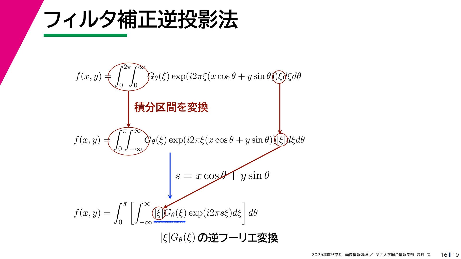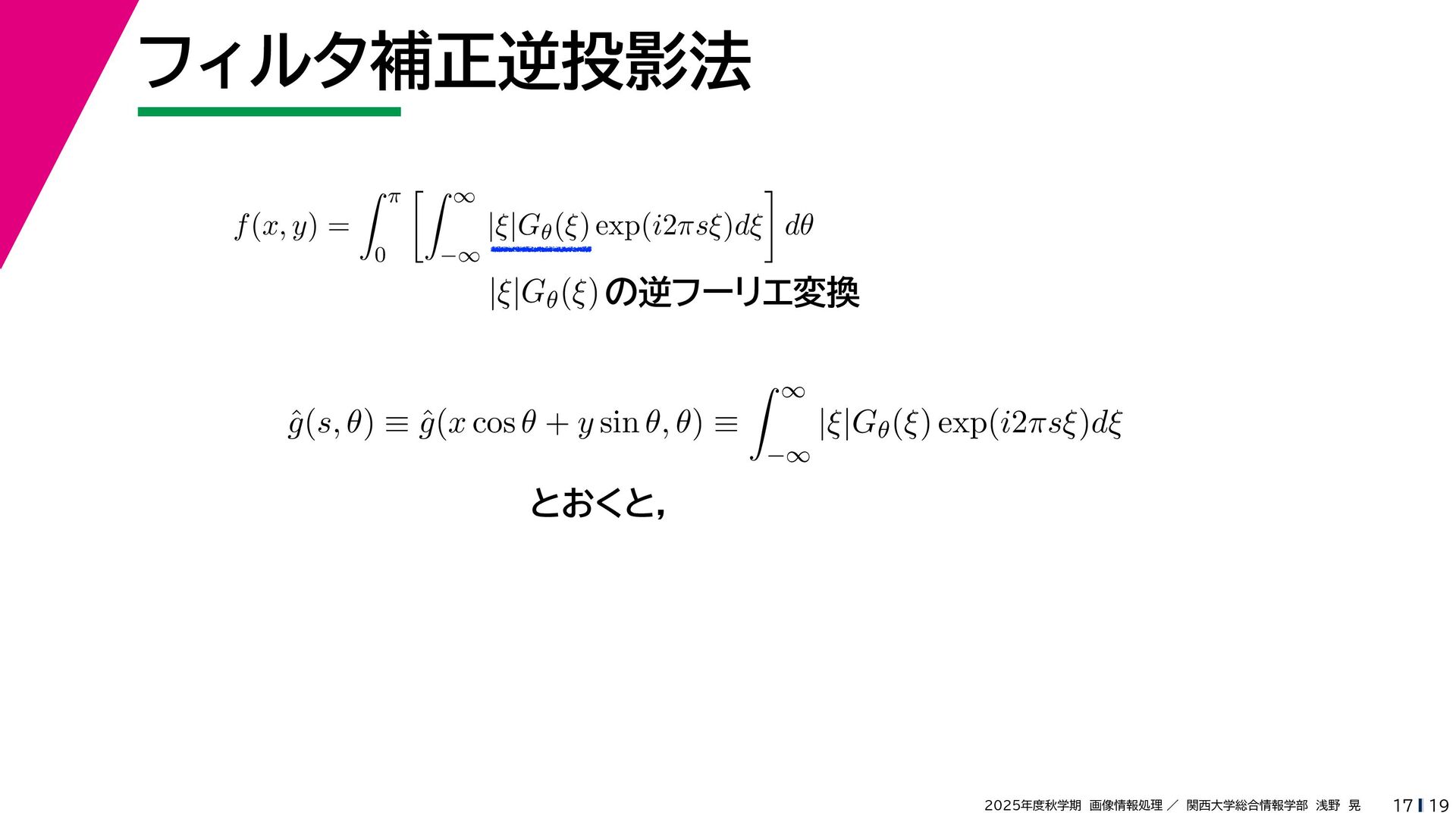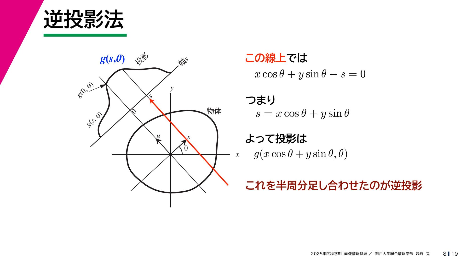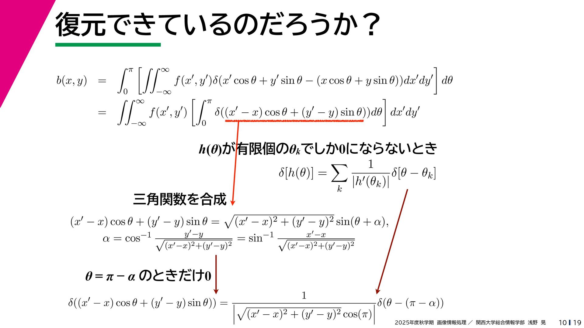 + y sin θ b(x, y) = π 0 g(x cos θ + y sin θ, θ)dθ g(s, θ) = ∞ −∞ f(x, y)δ(x cos θ + y sin θ − s)dxdy Radon変換 逆投影 b(x, y) = π 0 ∞ −∞ f(x , y )δ(x cos θ + y sin θ − (x cos θ + y sin θ))dx dy dθ = ∞ −∞ f(x , y ) π 0 δ((x − x) cos θ + (y − y) sin θ))dθ dx dy