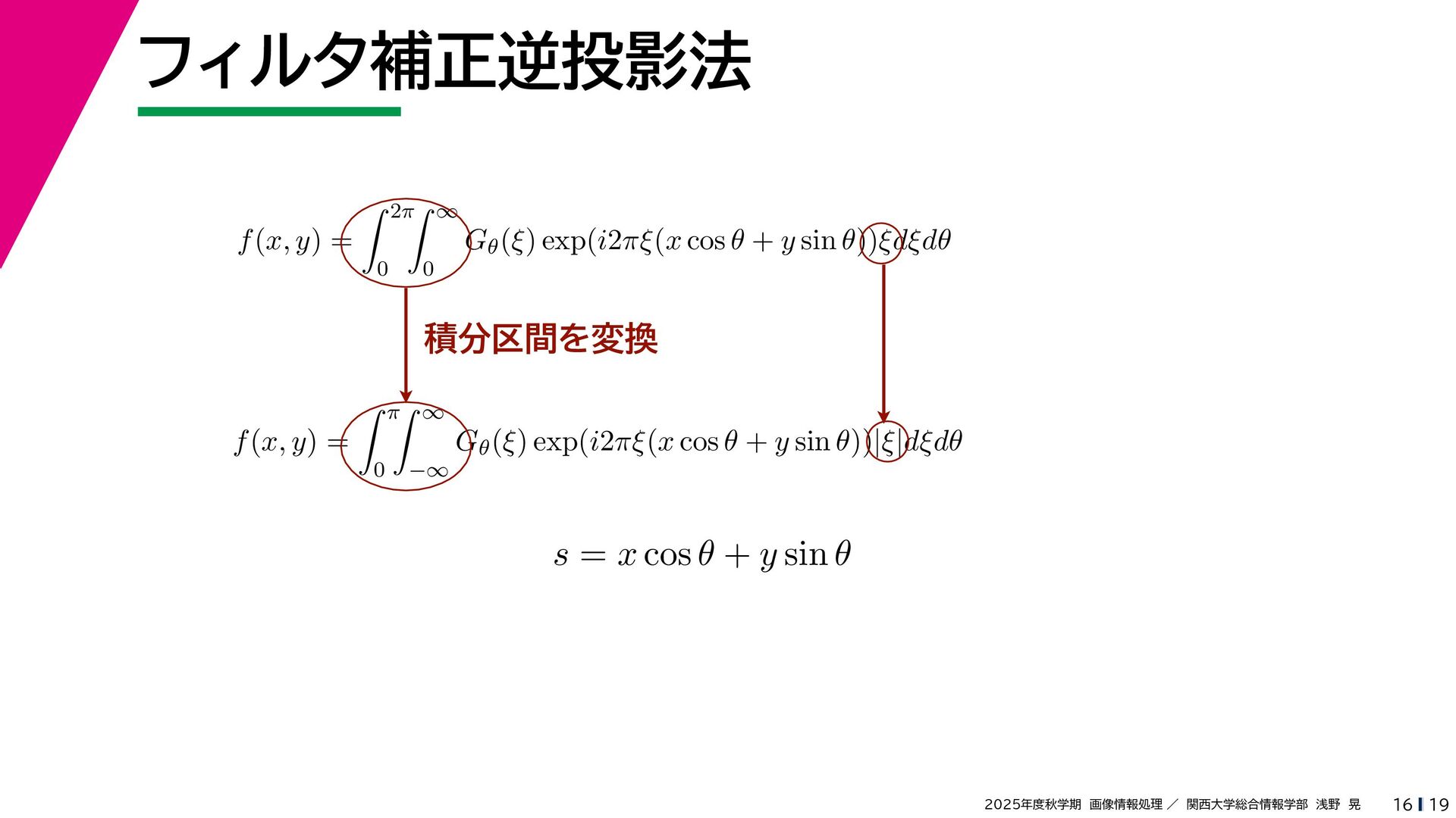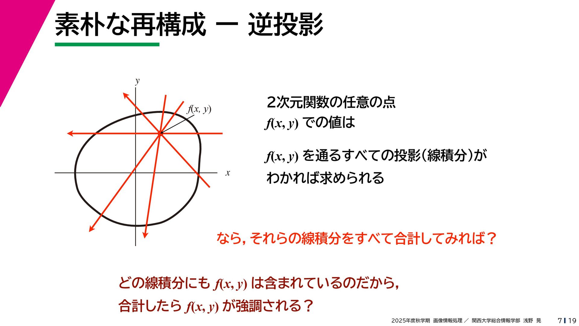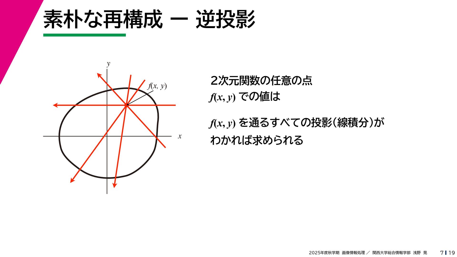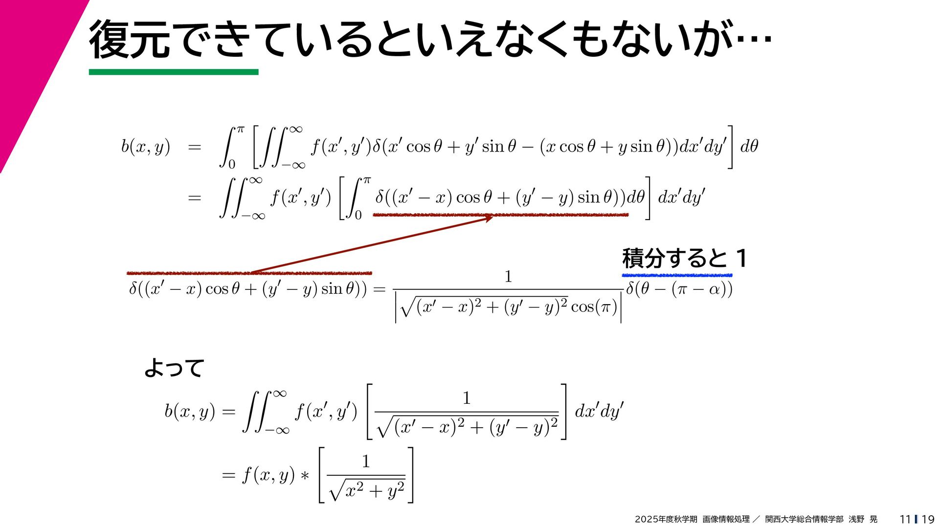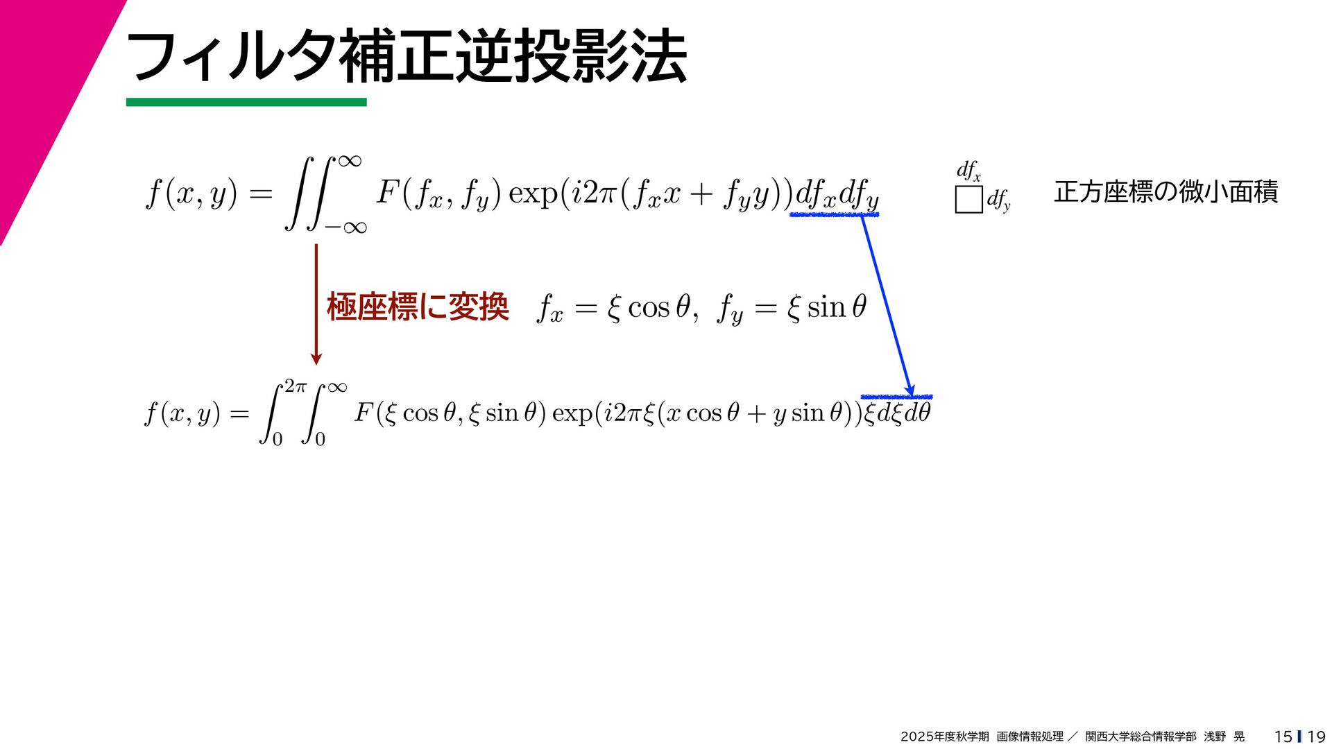 + y sin θ b(x, y) = π 0 g(x cos θ + y sin θ, θ)dθ g(s, θ) = ∞ −∞ f(x, y)δ(x cos θ + y sin θ − s)dxdy Radon変換 逆投影 b(x, y) = π 0 ∞ −∞ f(x , y )δ(x cos θ + y sin θ − (x cos θ + y sin θ))dx dy dθ = ∞ −∞ f(x , y ) π 0 δ((x − x) cos θ + (y − y) sin θ))dθ dx dy