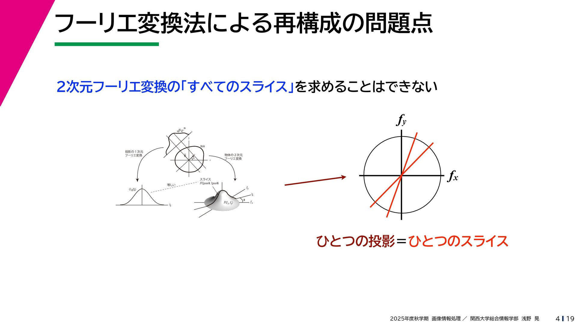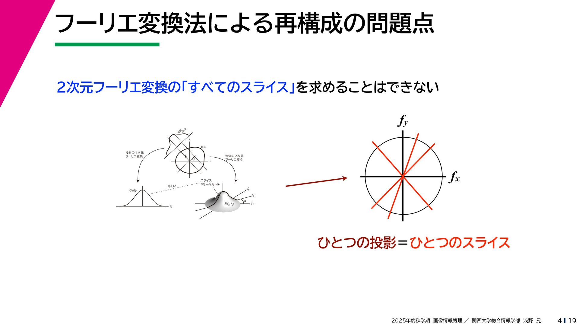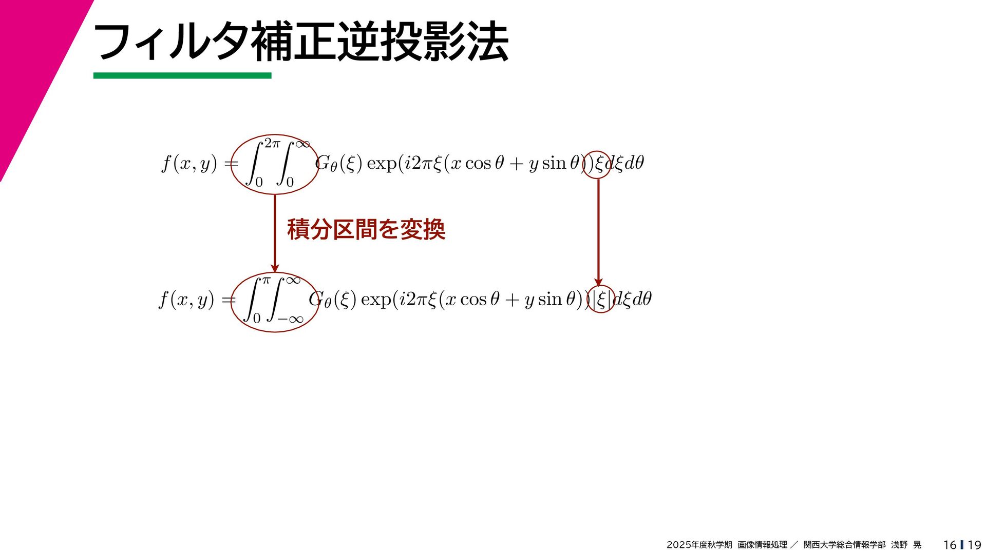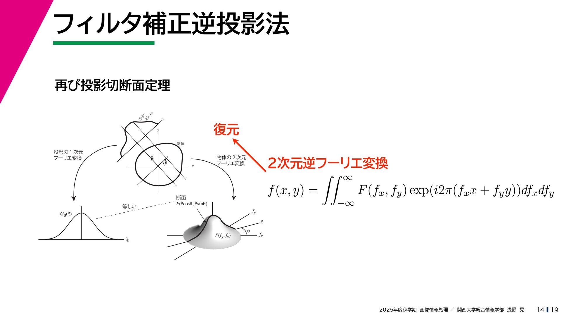 + y sin θ b(x, y) = π 0 g(x cos θ + y sin θ, θ)dθ g(s, θ) = ∞ −∞ f(x, y)δ(x cos θ + y sin θ − s)dxdy Radon変換 逆投影 b(x, y) = π 0 ∞ −∞ f(x , y )δ(x cos θ + y sin θ − (x cos θ + y sin θ))dx dy dθ = ∞ −∞ f(x , y ) π 0 δ((x − x) cos θ + (y − y) sin θ))dθ dx dy