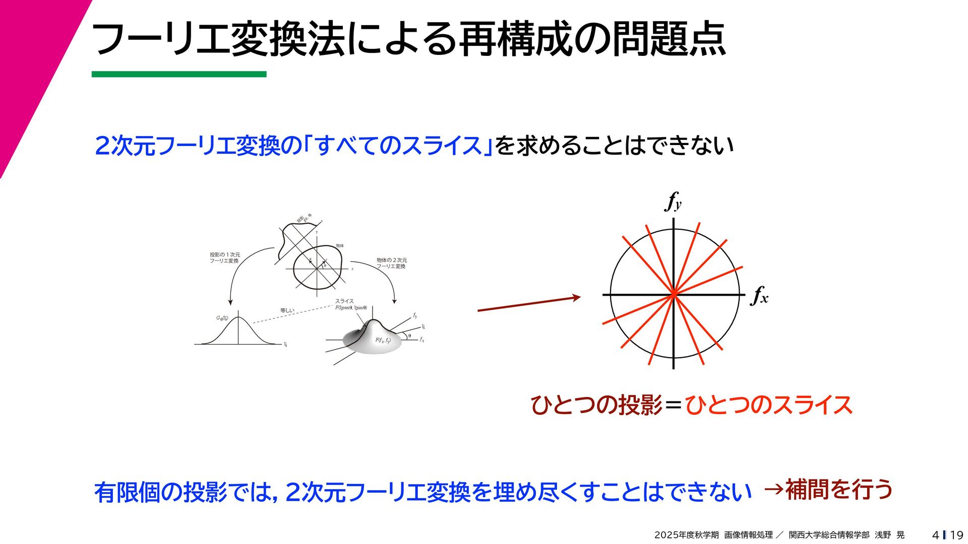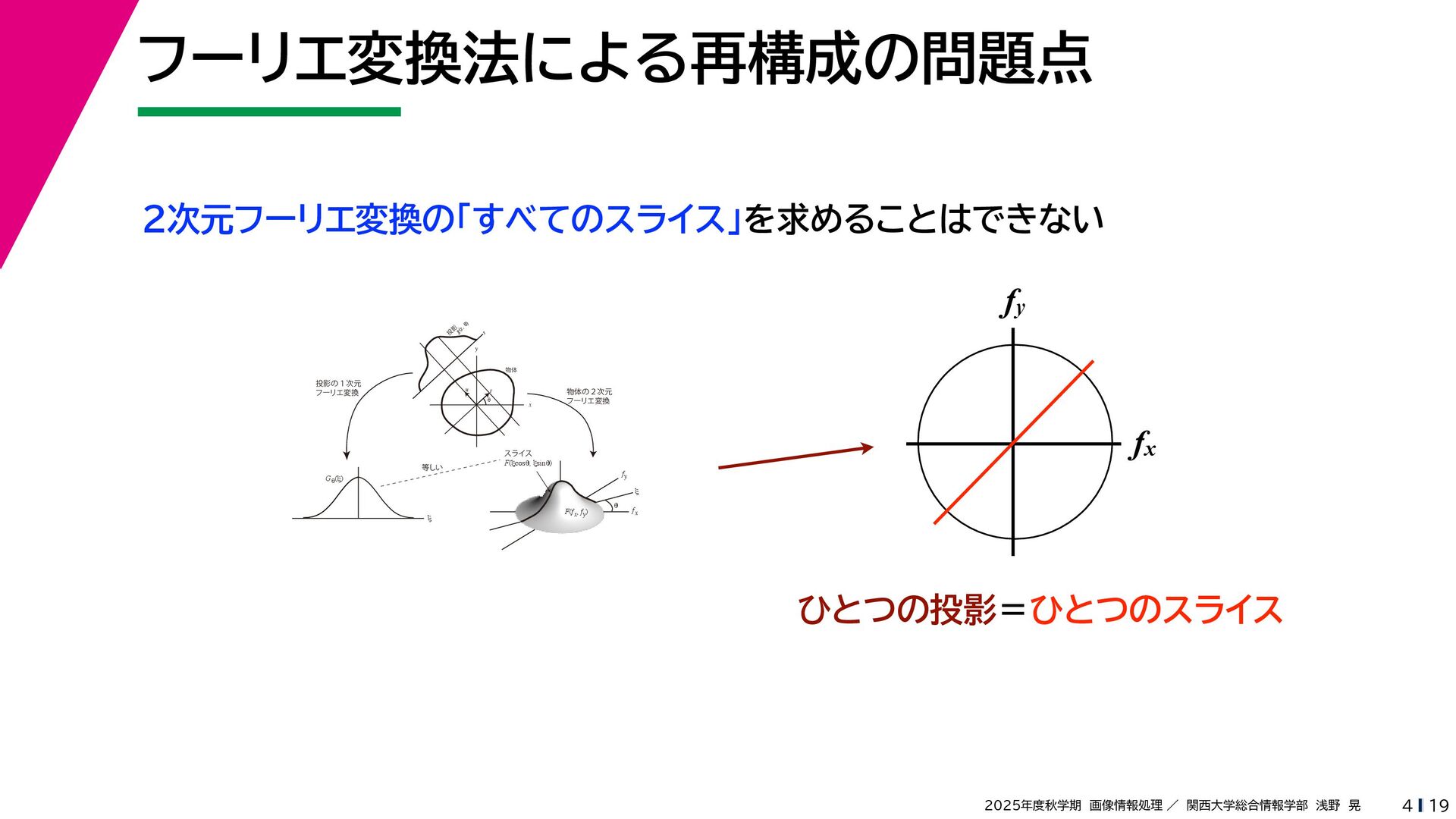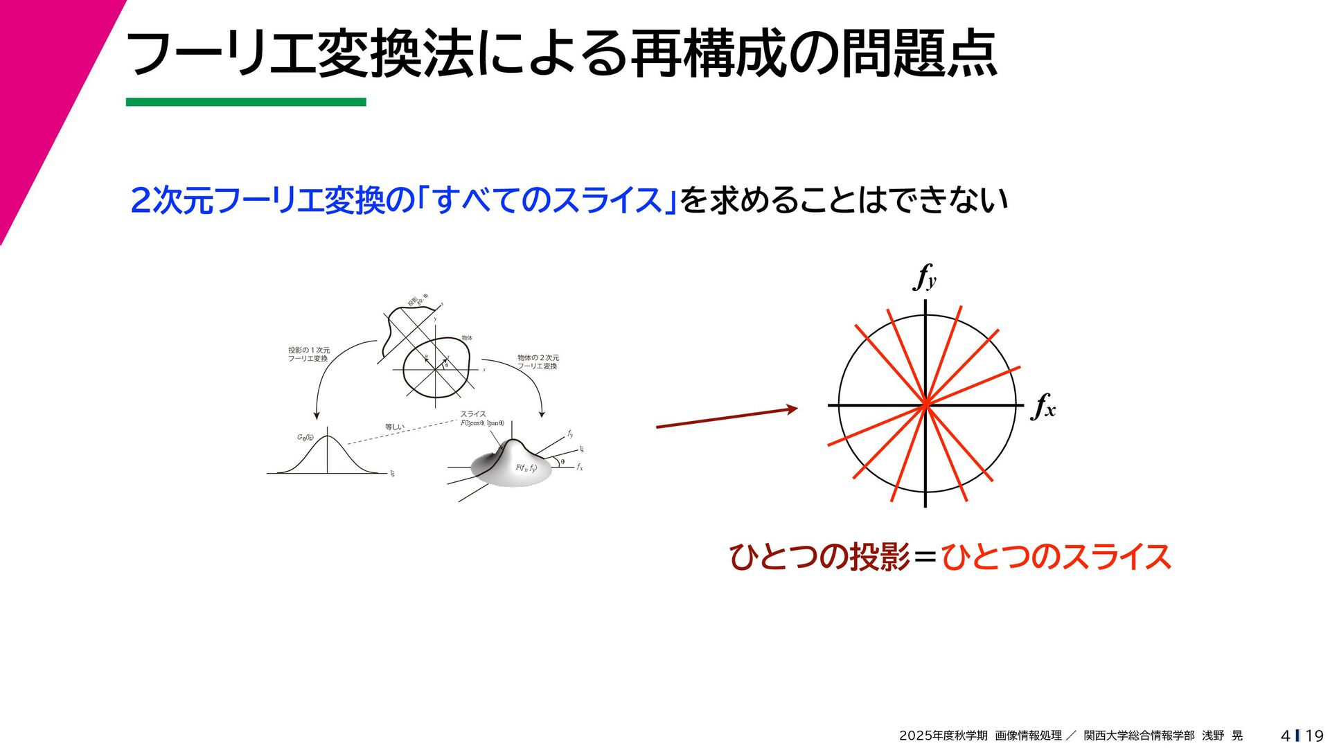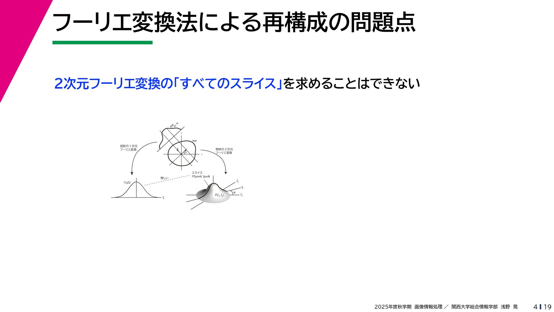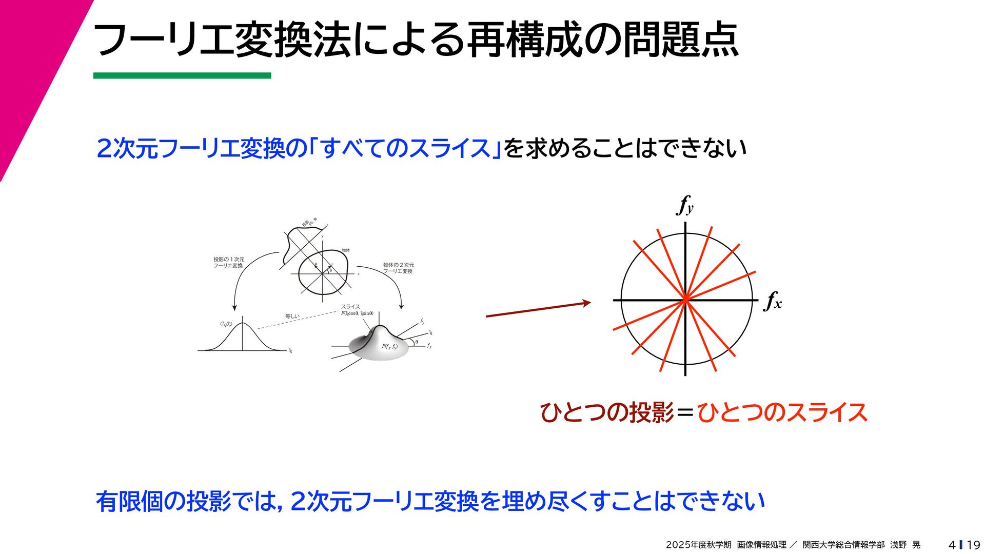 + y sin θ b(x, y) = π 0 g(x cos θ + y sin θ, θ)dθ g(s, θ) = ∞ −∞ f(x, y)δ(x cos θ + y sin θ − s)dxdy Radon変換 逆投影 b(x, y) = π 0 ∞ −∞ f(x , y )δ(x cos θ + y sin θ − (x cos θ + y sin θ))dx dy dθ = ∞ −∞ f(x , y ) π 0 δ((x − x) cos θ + (y − y) sin θ))dθ dx dy