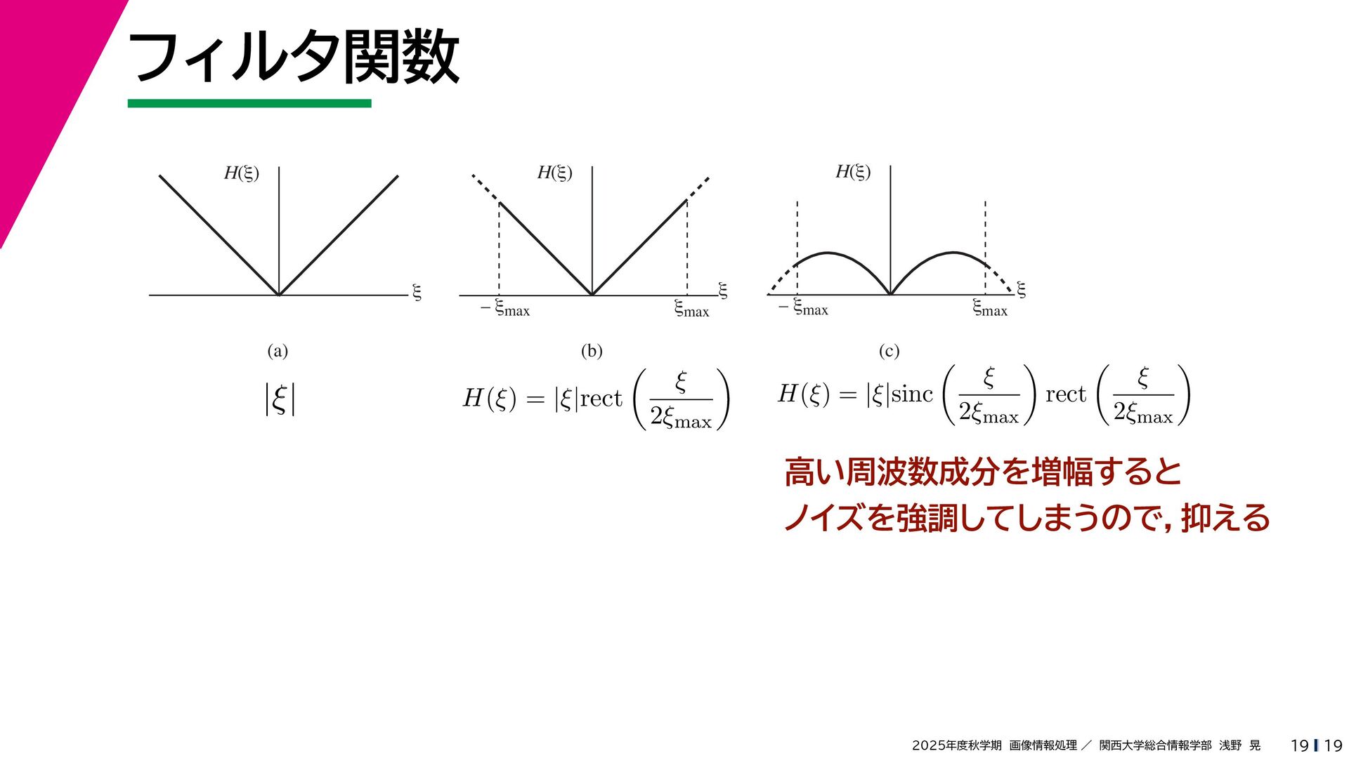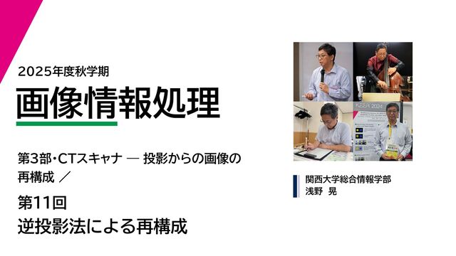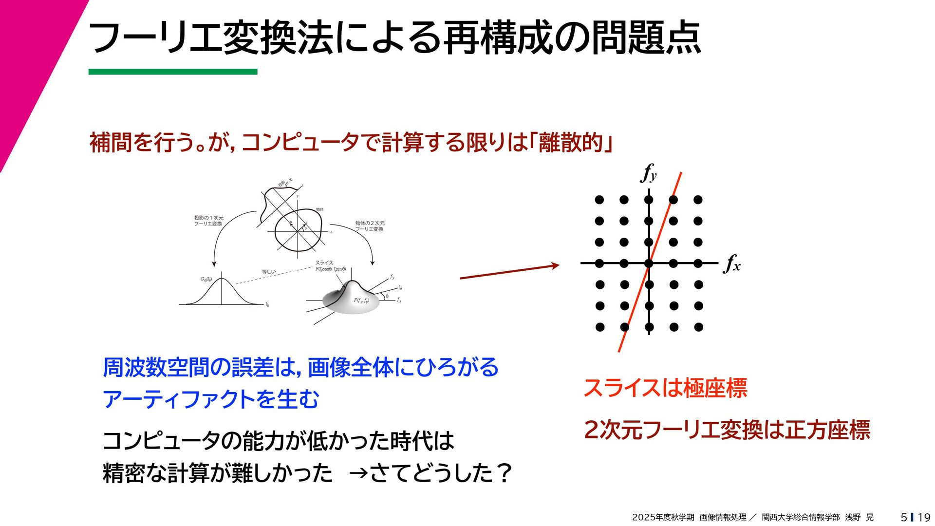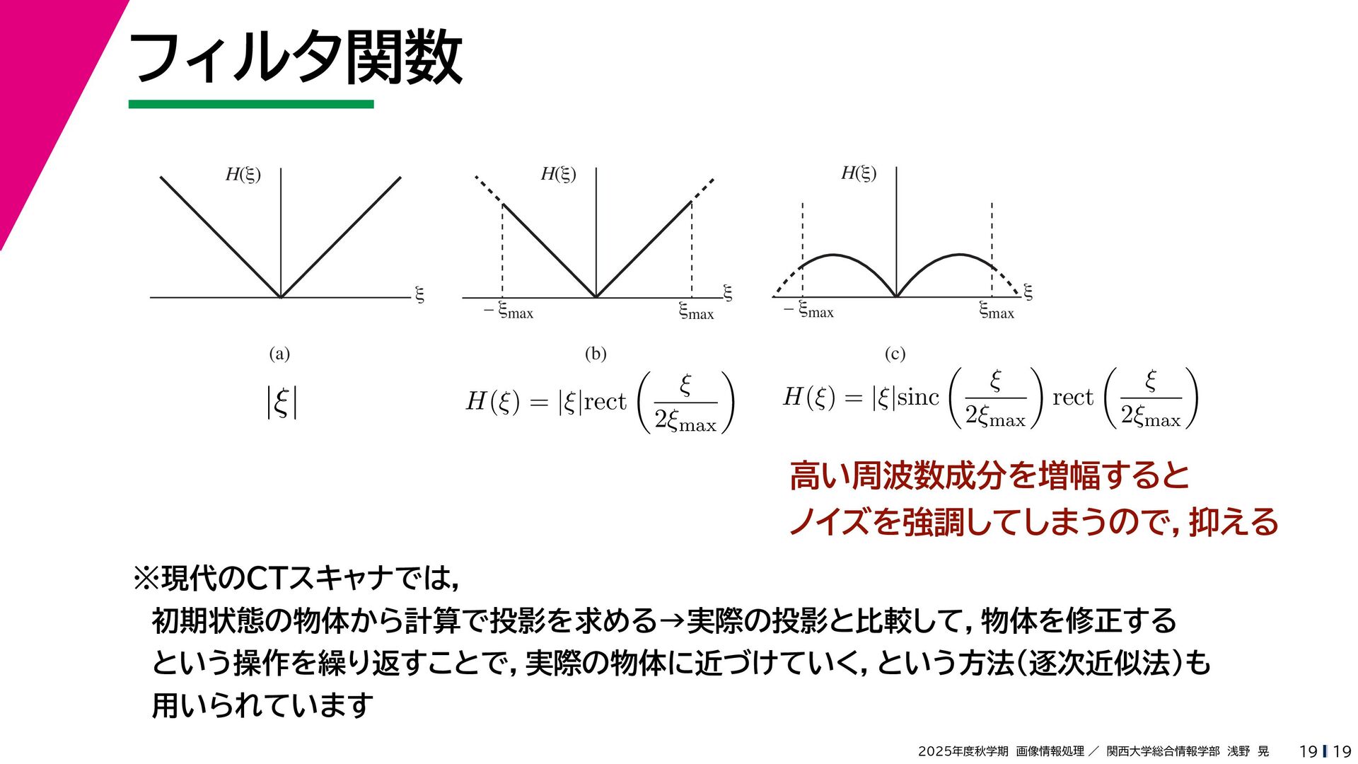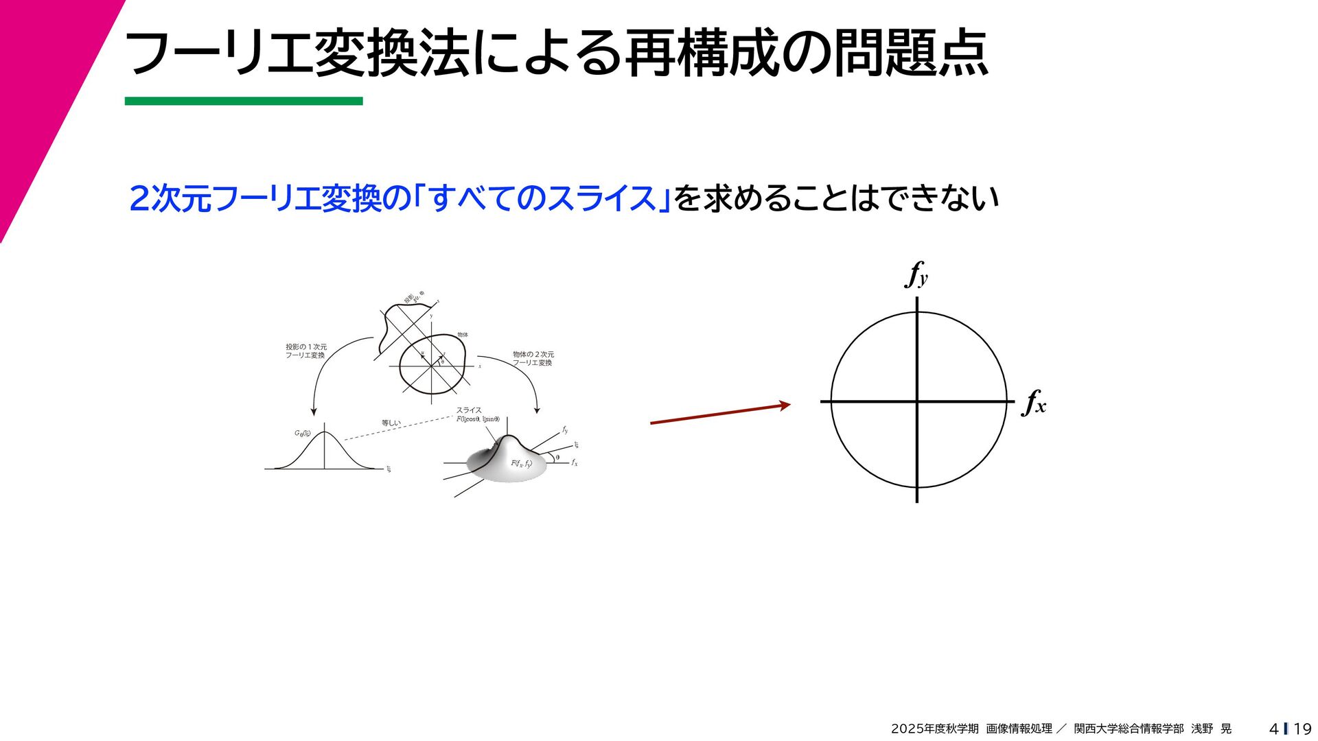 + y sin θ b(x, y) = π 0 g(x cos θ + y sin θ, θ)dθ g(s, θ) = ∞ −∞ f(x, y)δ(x cos θ + y sin θ − s)dxdy Radon変換 逆投影 b(x, y) = π 0 ∞ −∞ f(x , y )δ(x cos θ + y sin θ − (x cos θ + y sin θ))dx dy dθ = ∞ −∞ f(x , y ) π 0 δ((x − x) cos θ + (y − y) sin θ))dθ dx dy