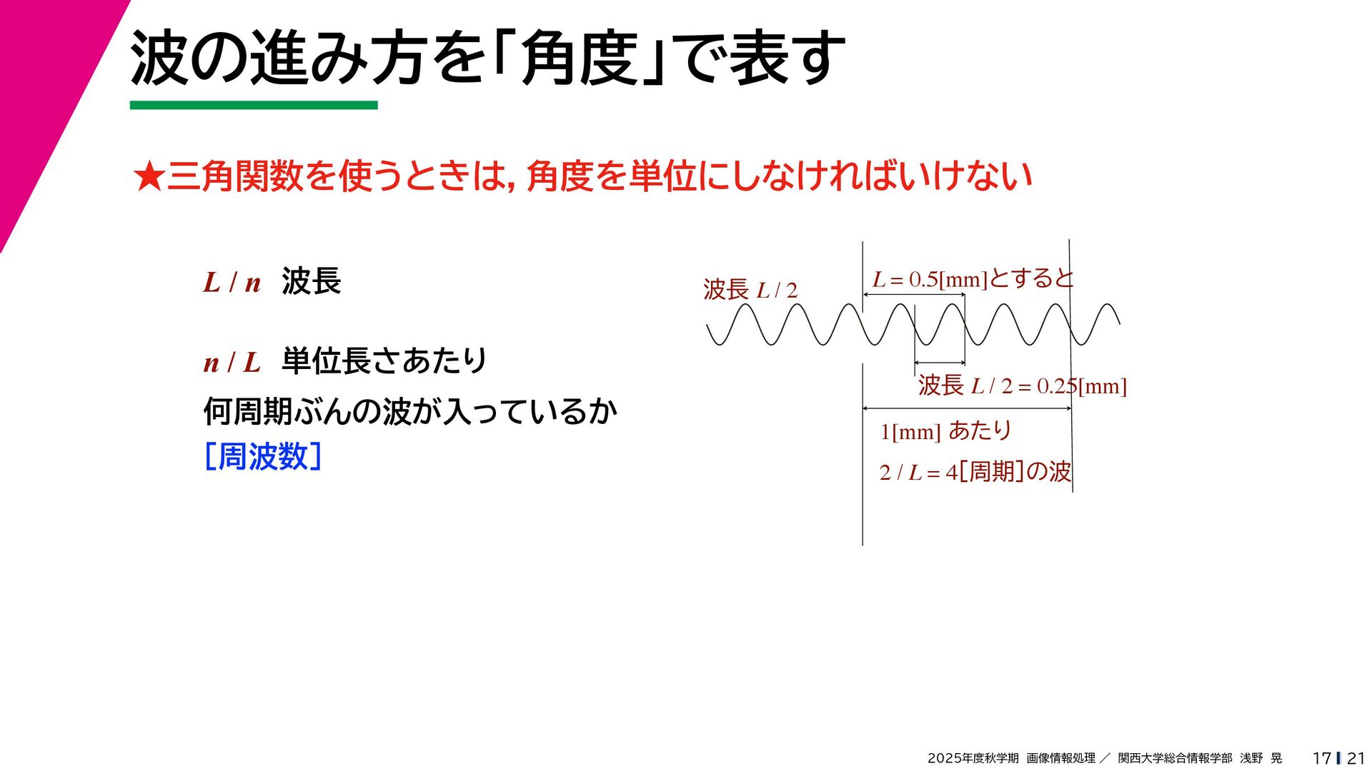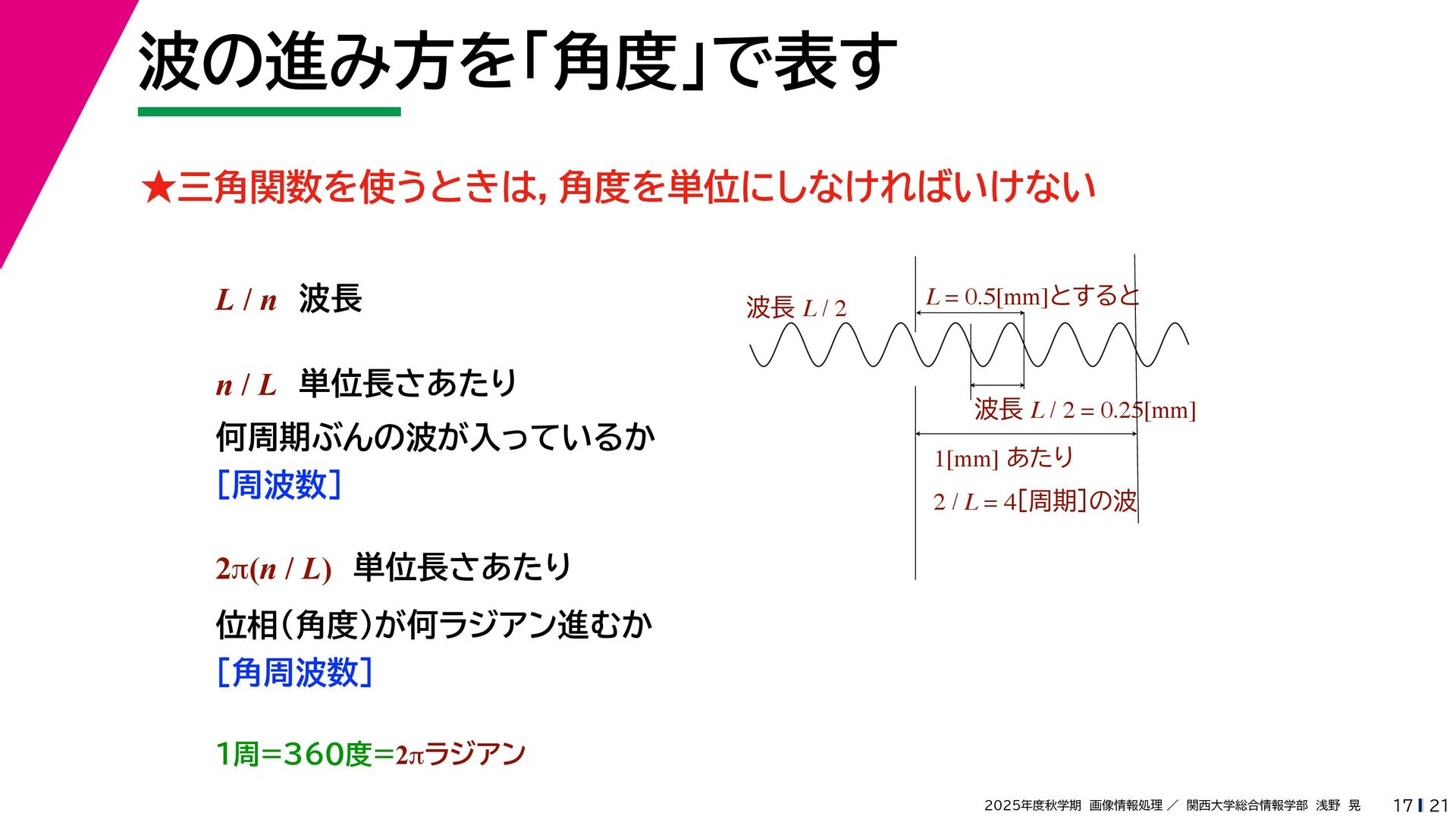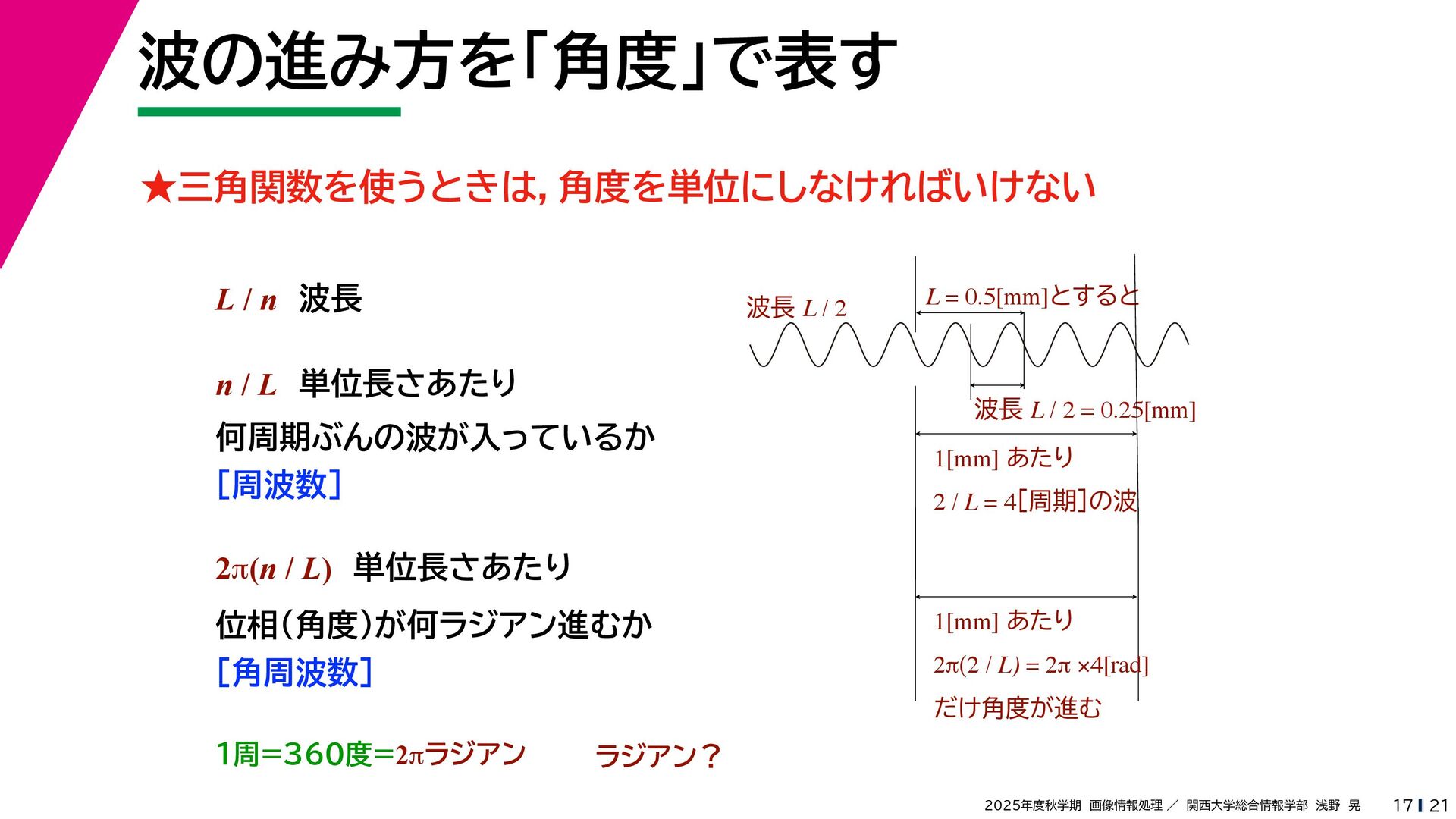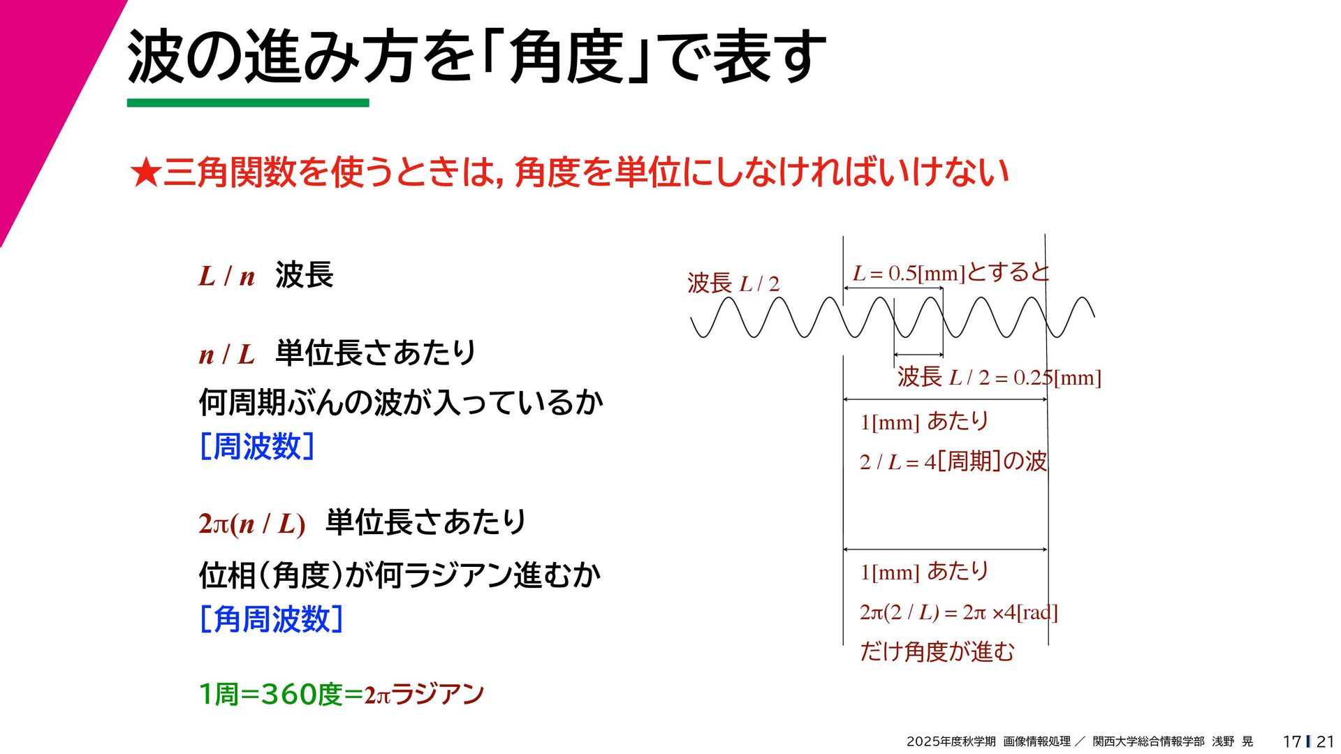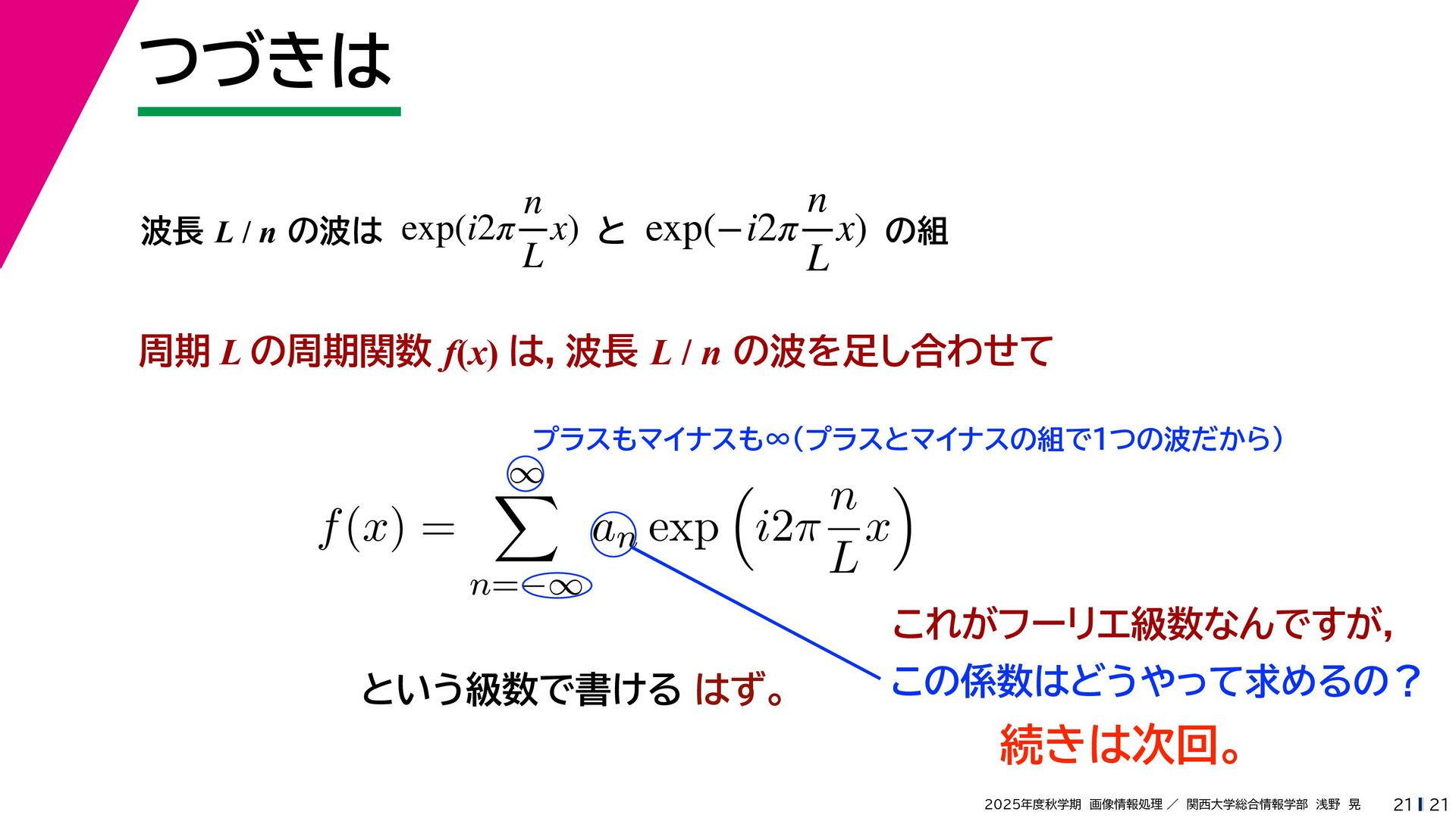 L / n の波を足し合わせて はず。 波長 L / n の波は f(x) = ∞ n=−∞ an exp i2π n L x という級数で書ける exp(i2π n L x) exp(−i2π n L x) と の組 プラスもマイナスも∞(プラスとマイナスの組で1つの波だから) この係数はどうやって求めるの? 続きは次回。 これがフーリエ級数なんですが,