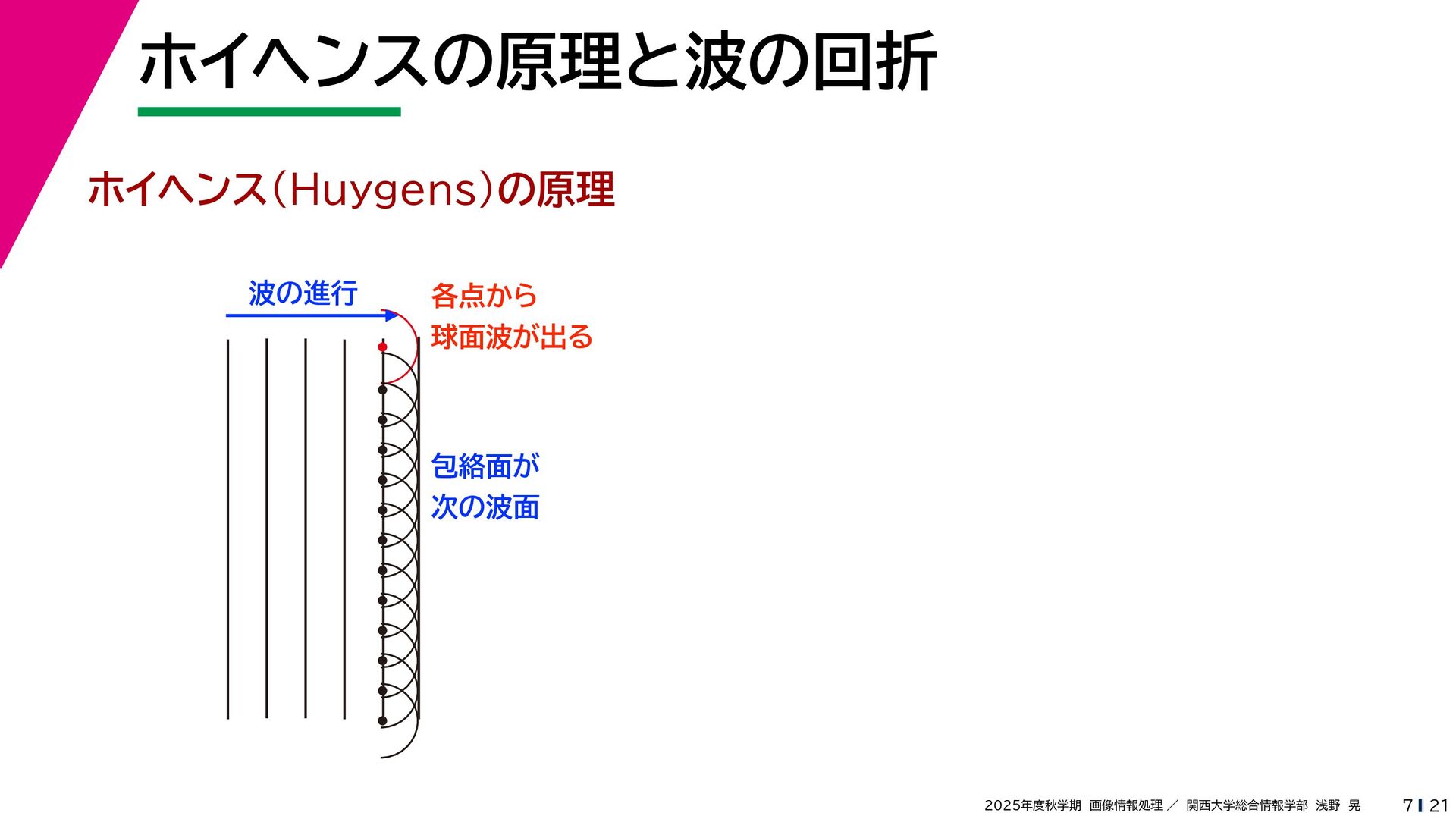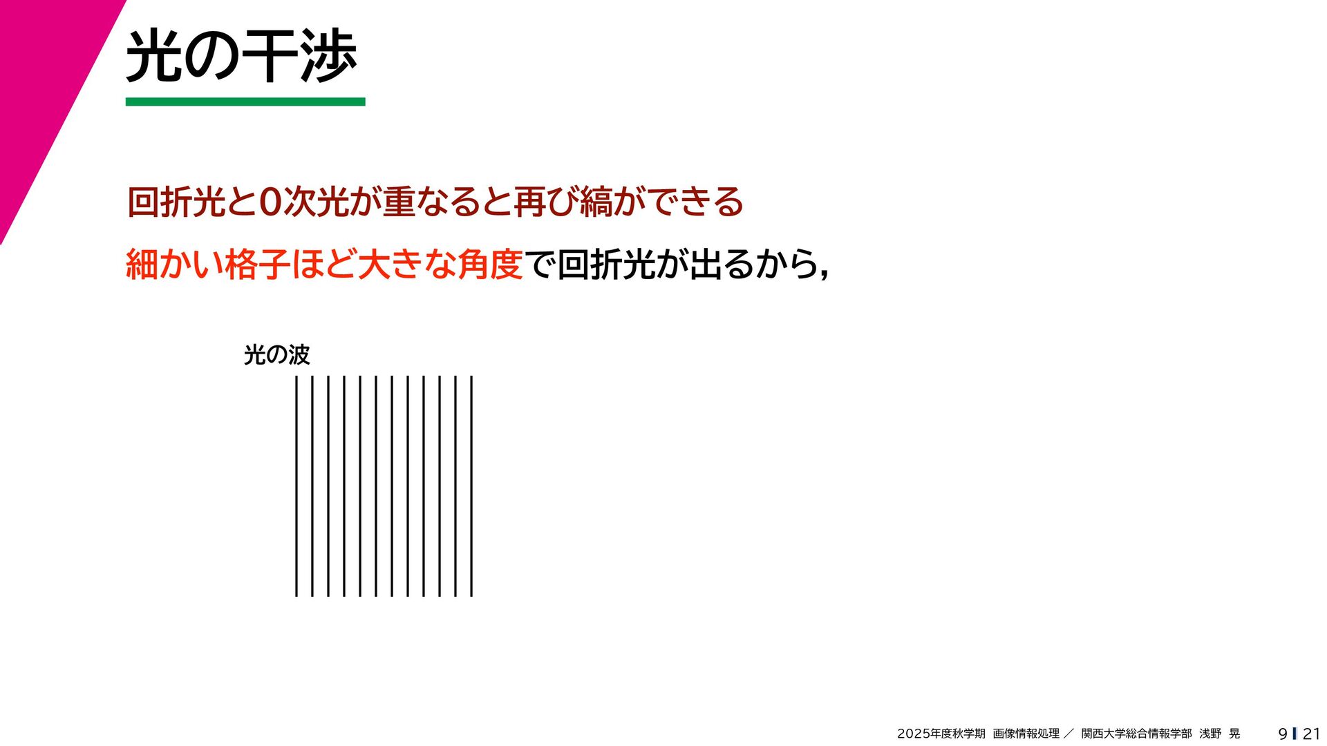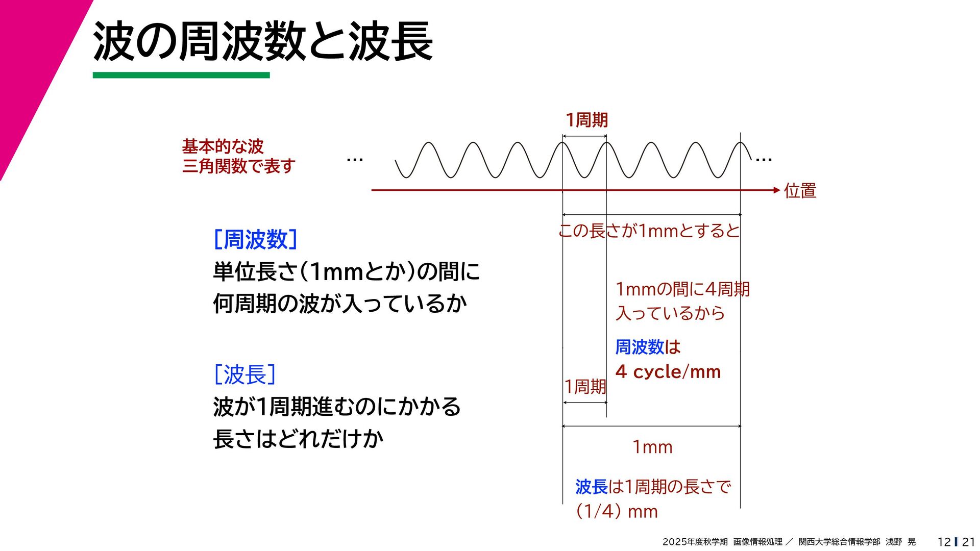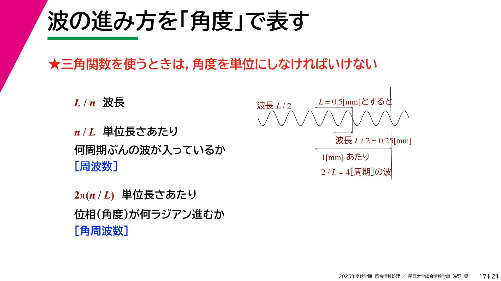 L / n の波を足し合わせて はず。 波長 L / n の波は f(x) = ∞ n=−∞ an exp i2π n L x という級数で書ける exp(i2π n L x) exp(−i2π n L x) と の組 プラスもマイナスも∞(プラスとマイナスの組で1つの波だから) この係数はどうやって求めるの? 続きは次回。 これがフーリエ級数なんですが,