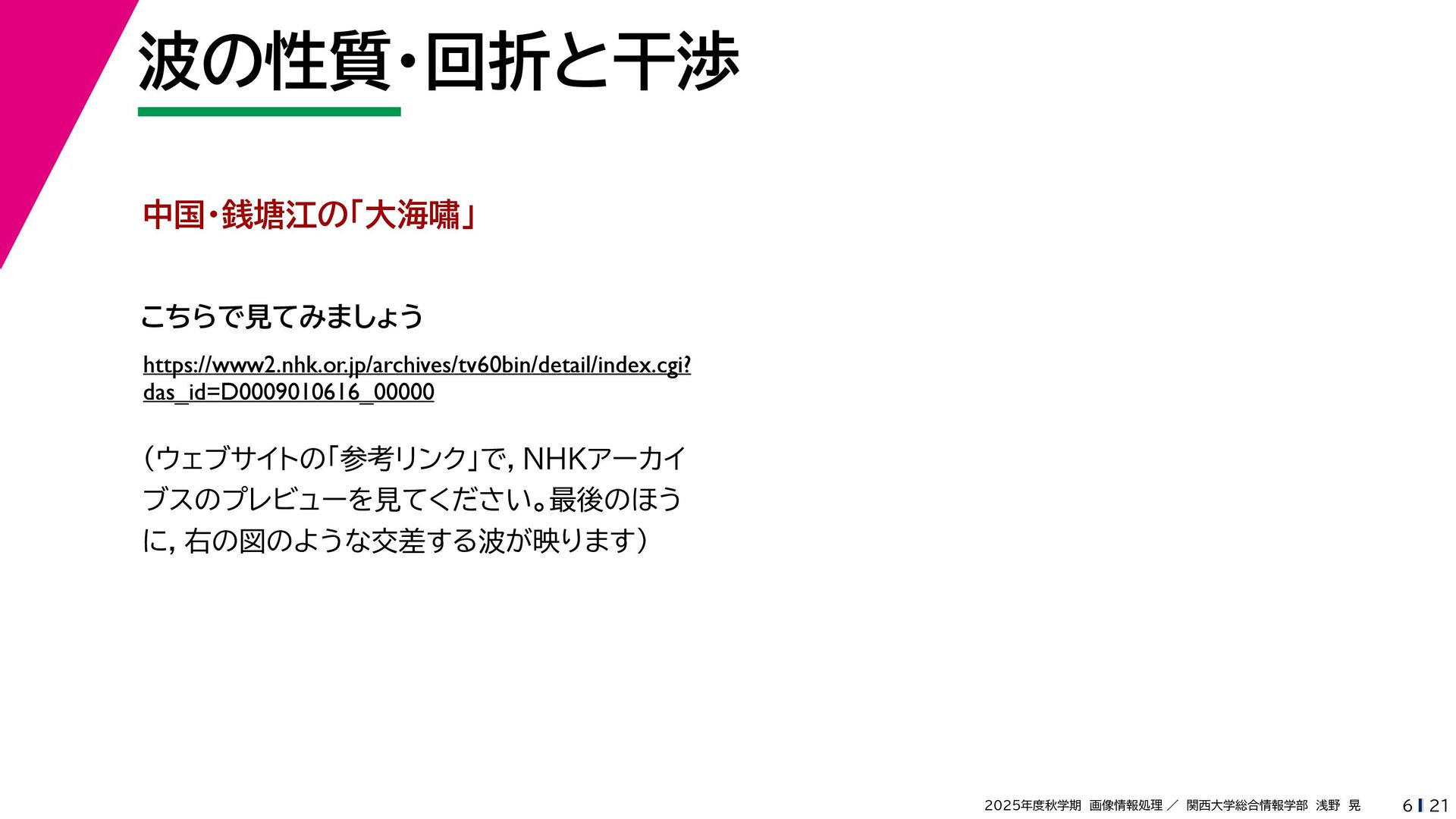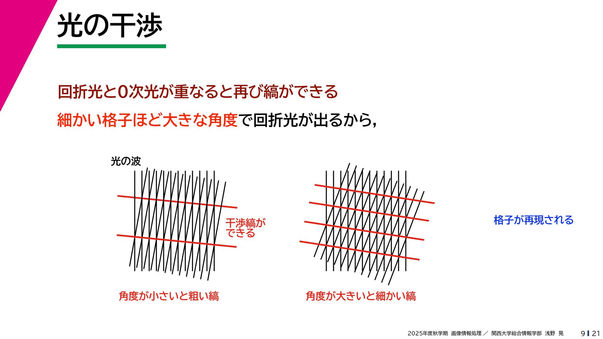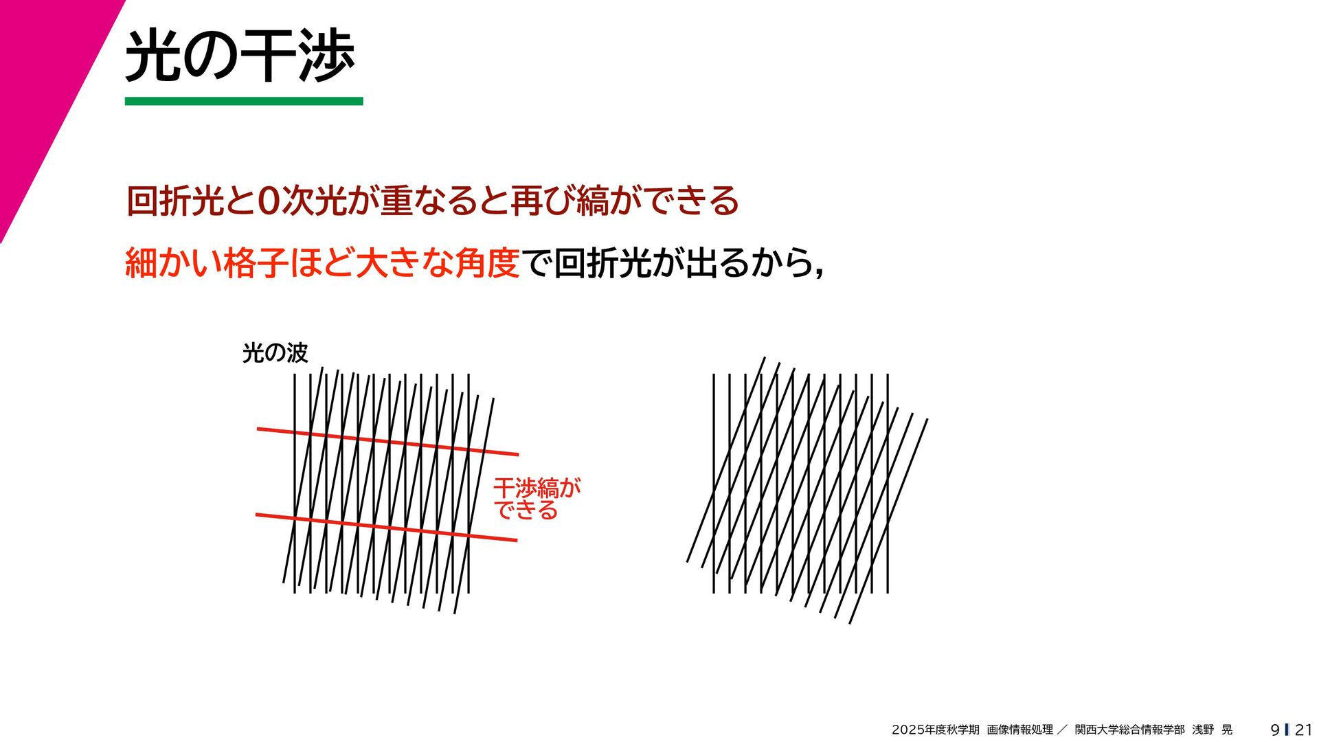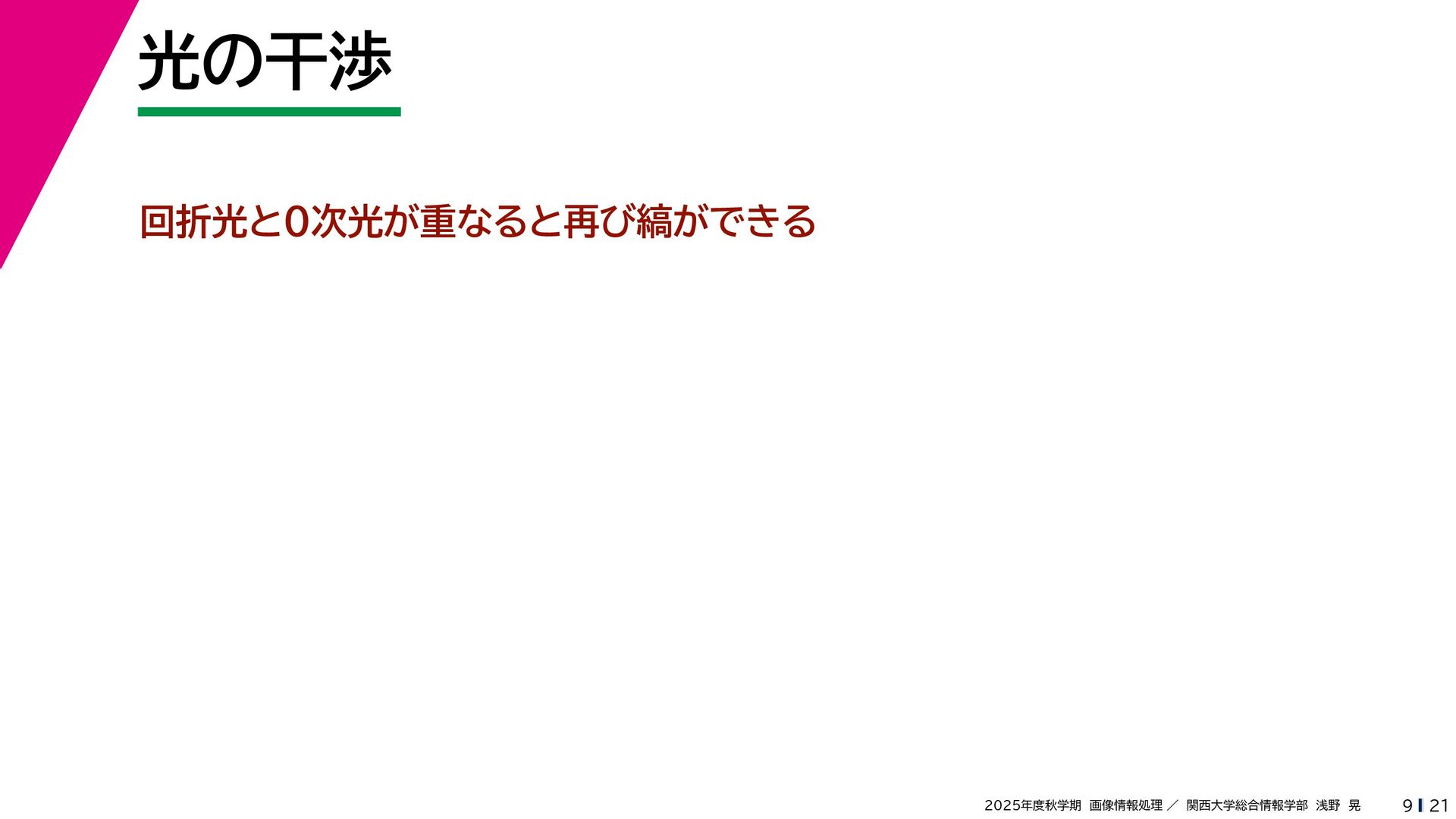 L / n の波を足し合わせて はず。 波長 L / n の波は f(x) = ∞ n=−∞ an exp i2π n L x という級数で書ける exp(i2π n L x) exp(−i2π n L x) と の組 プラスもマイナスも∞(プラスとマイナスの組で1つの波だから) この係数はどうやって求めるの? 続きは次回。 これがフーリエ級数なんですが,