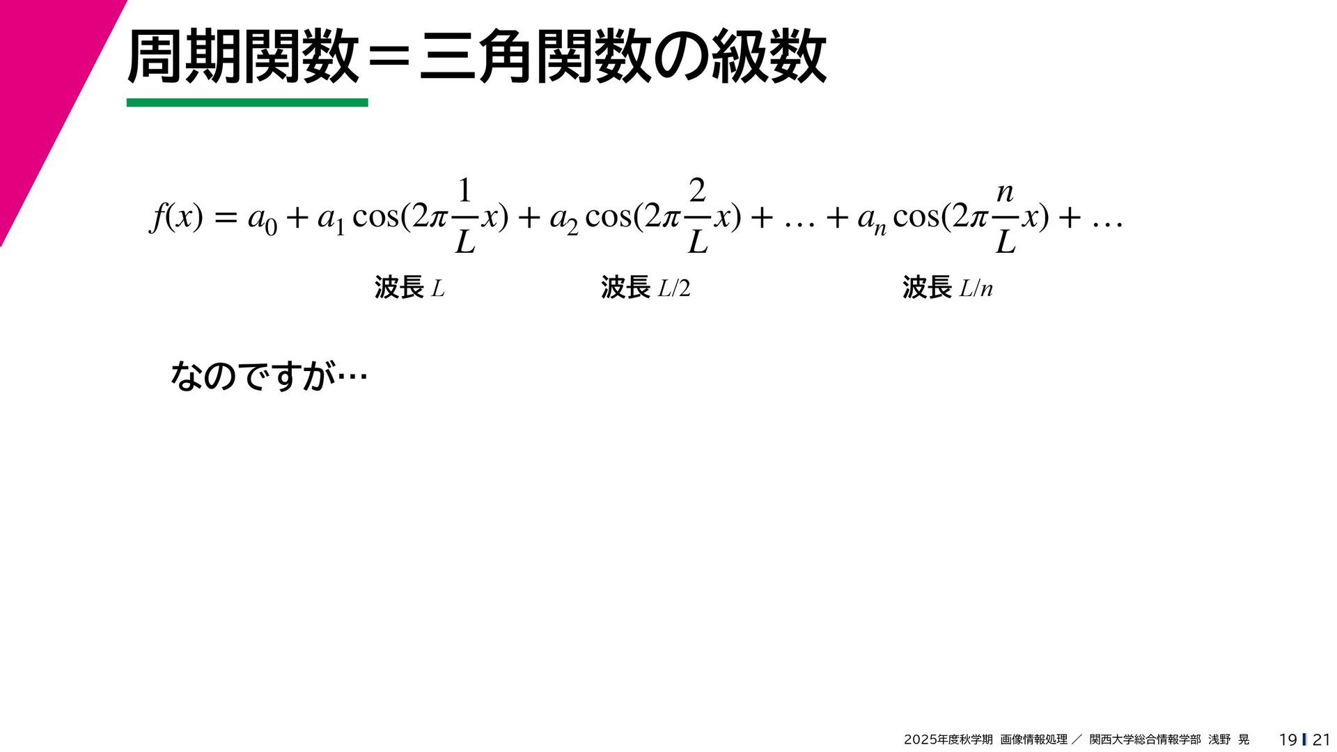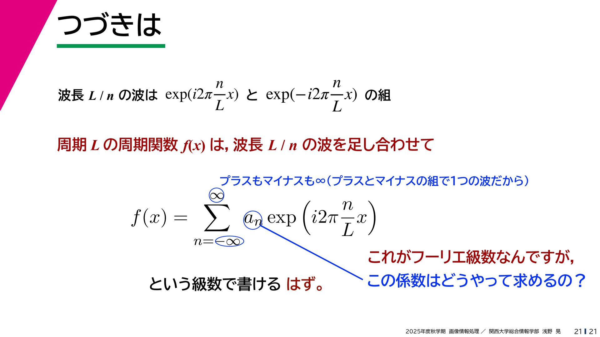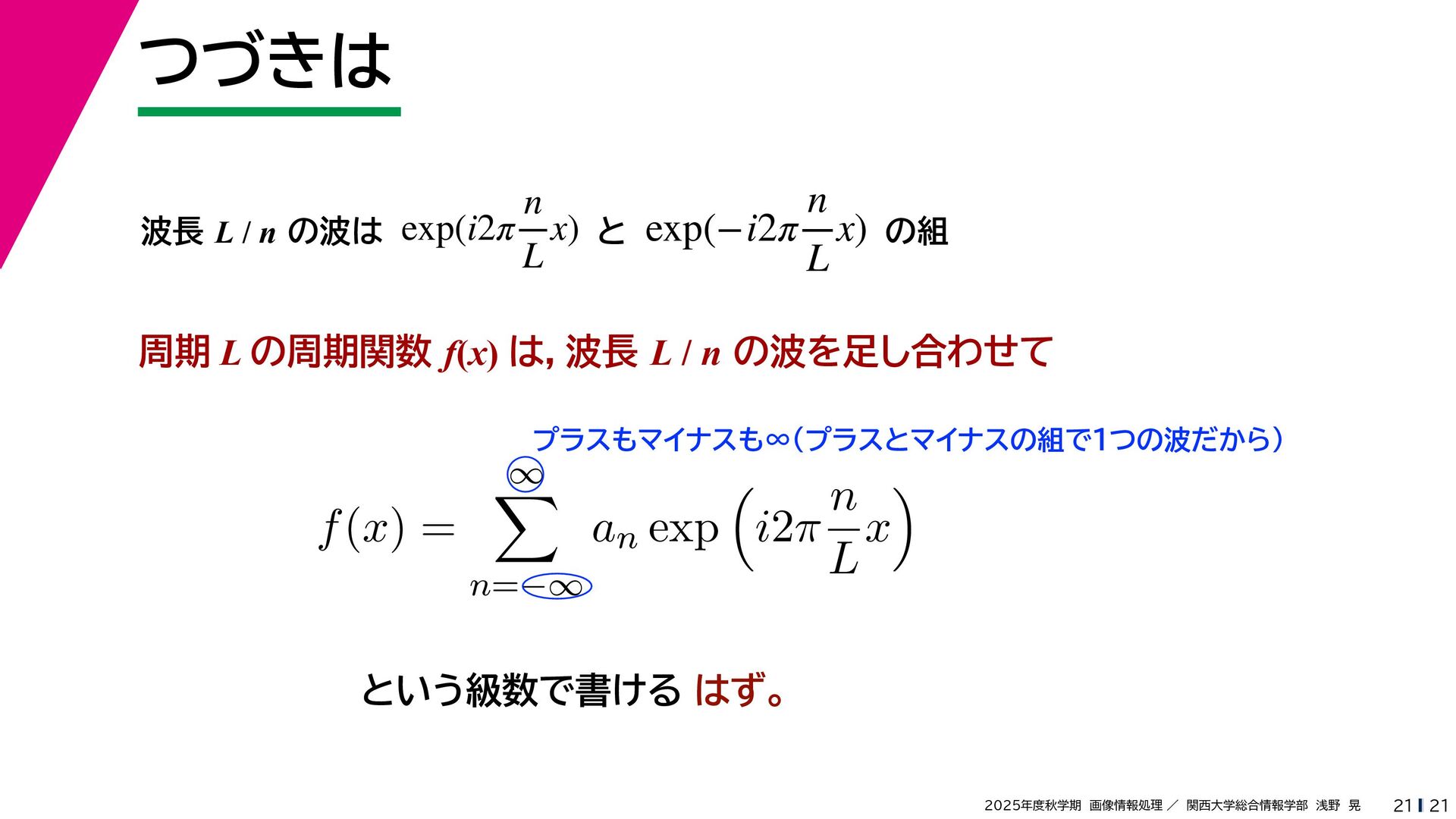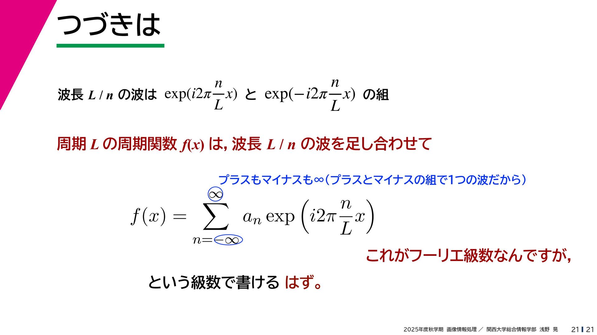 L / n の波を足し合わせて はず。 波長 L / n の波は f(x) = ∞ n=−∞ an exp i2π n L x という級数で書ける exp(i2π n L x) exp(−i2π n L x) と の組 プラスもマイナスも∞(プラスとマイナスの組で1つの波だから) これがフーリエ級数なんですが,