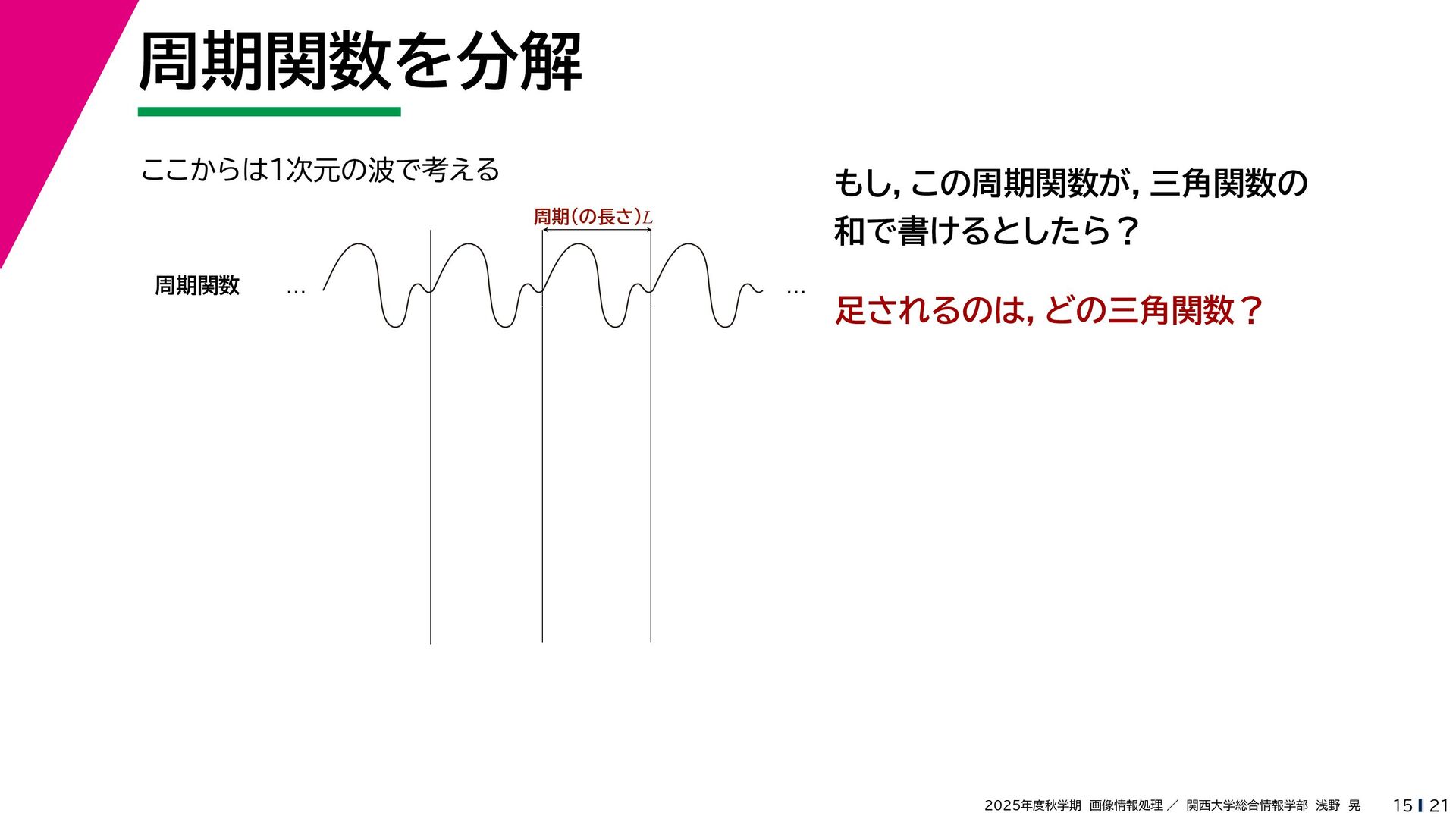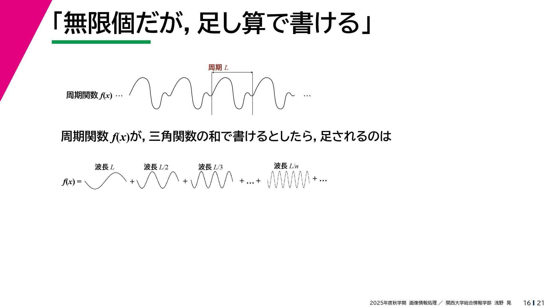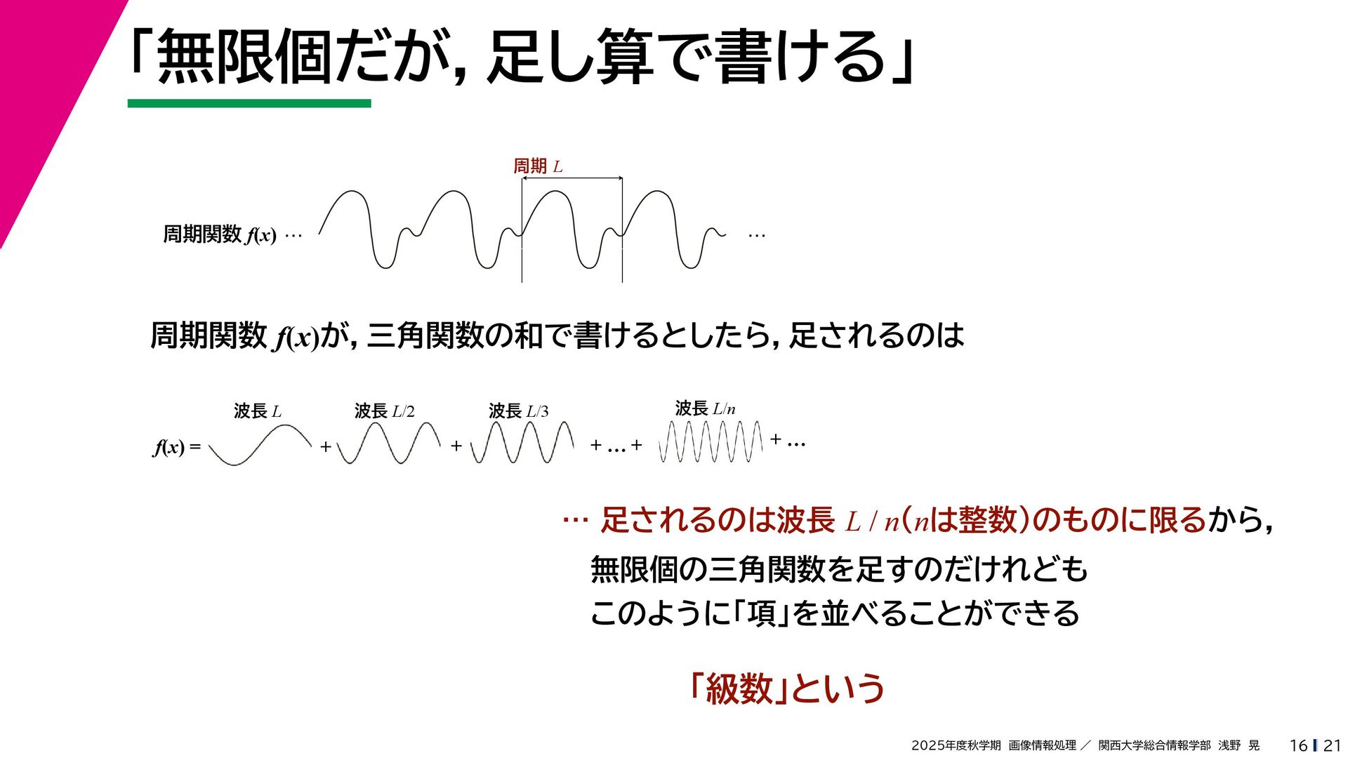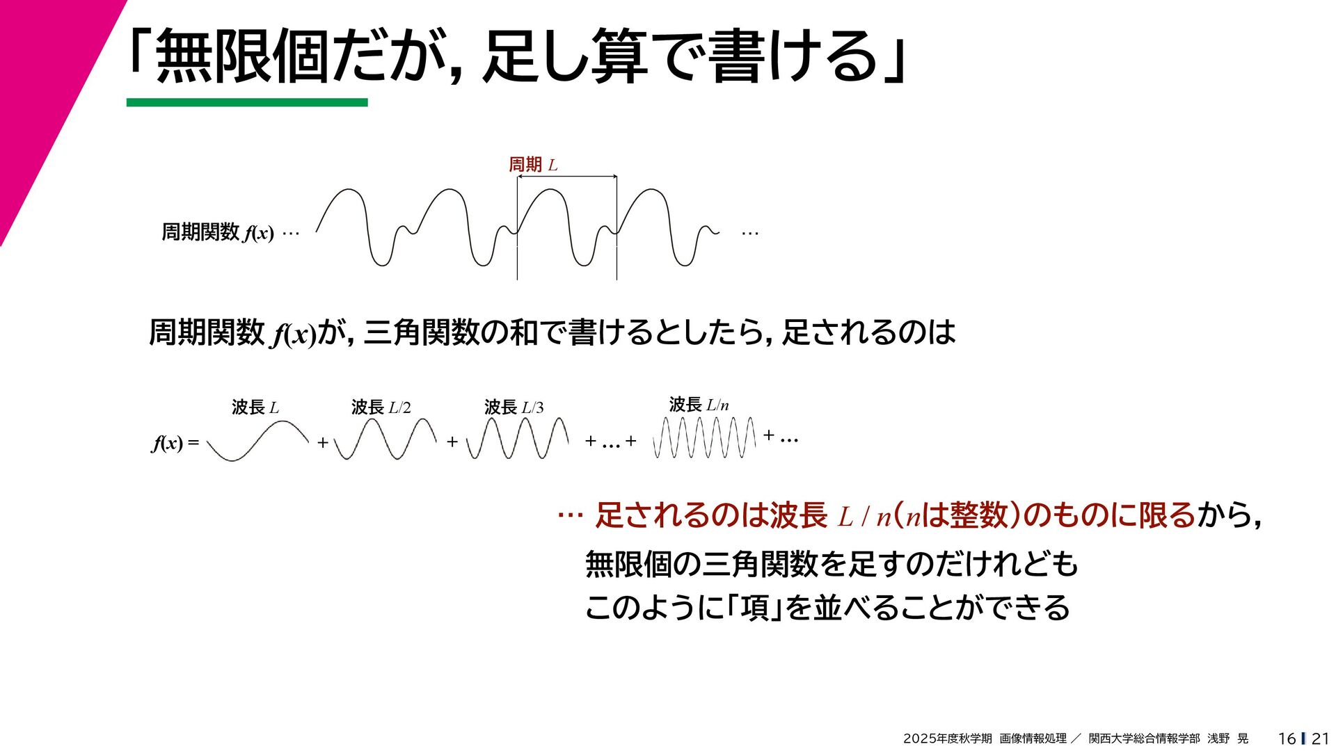 L / n の波を足し合わせて はず。 波長 L / n の波は f(x) = ∞ n=−∞ an exp i2π n L x という級数で書ける exp(i2π n L x) exp(−i2π n L x) と の組 プラスもマイナスも∞(プラスとマイナスの組で1つの波だから) これがフーリエ級数なんですが,