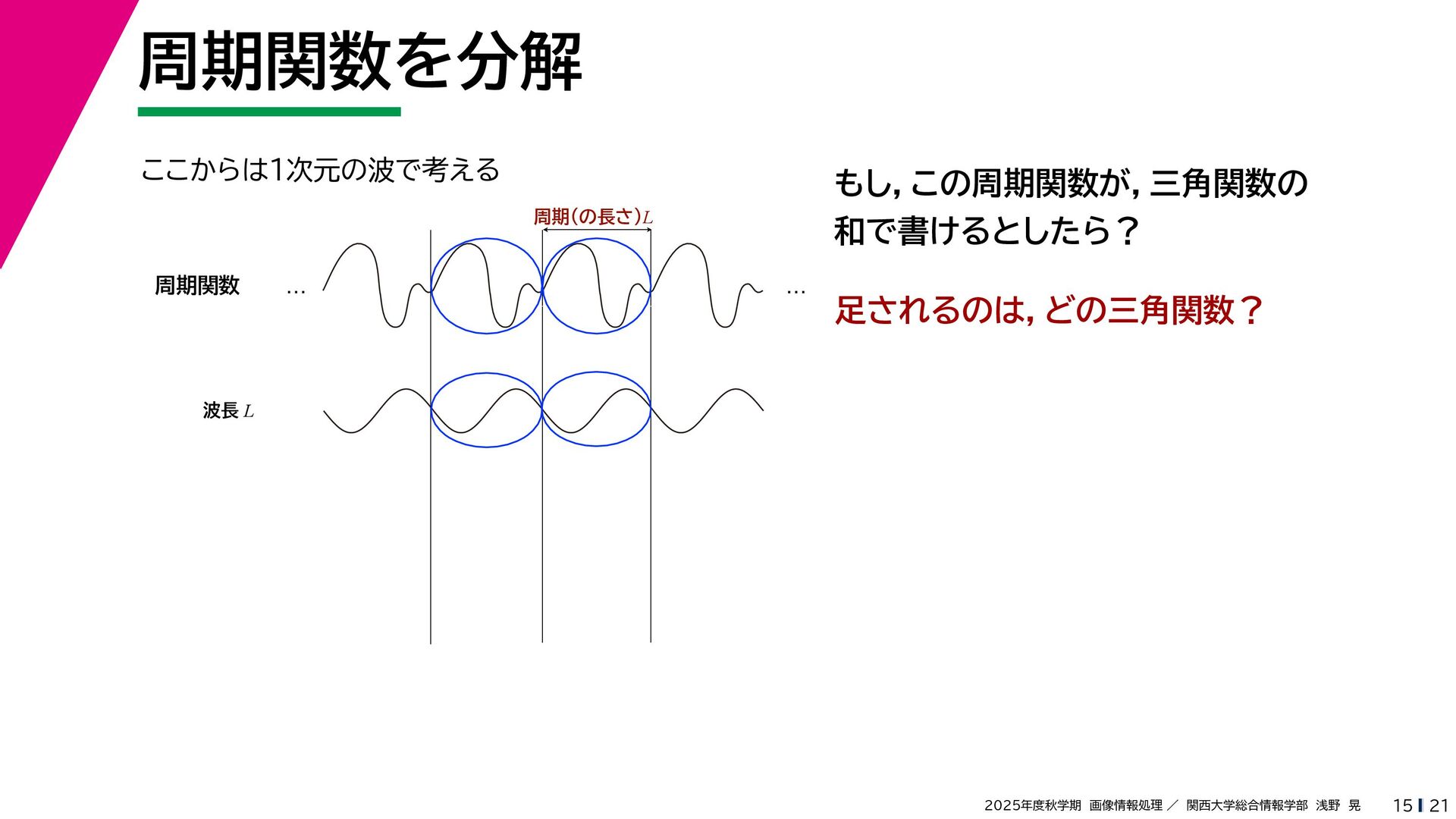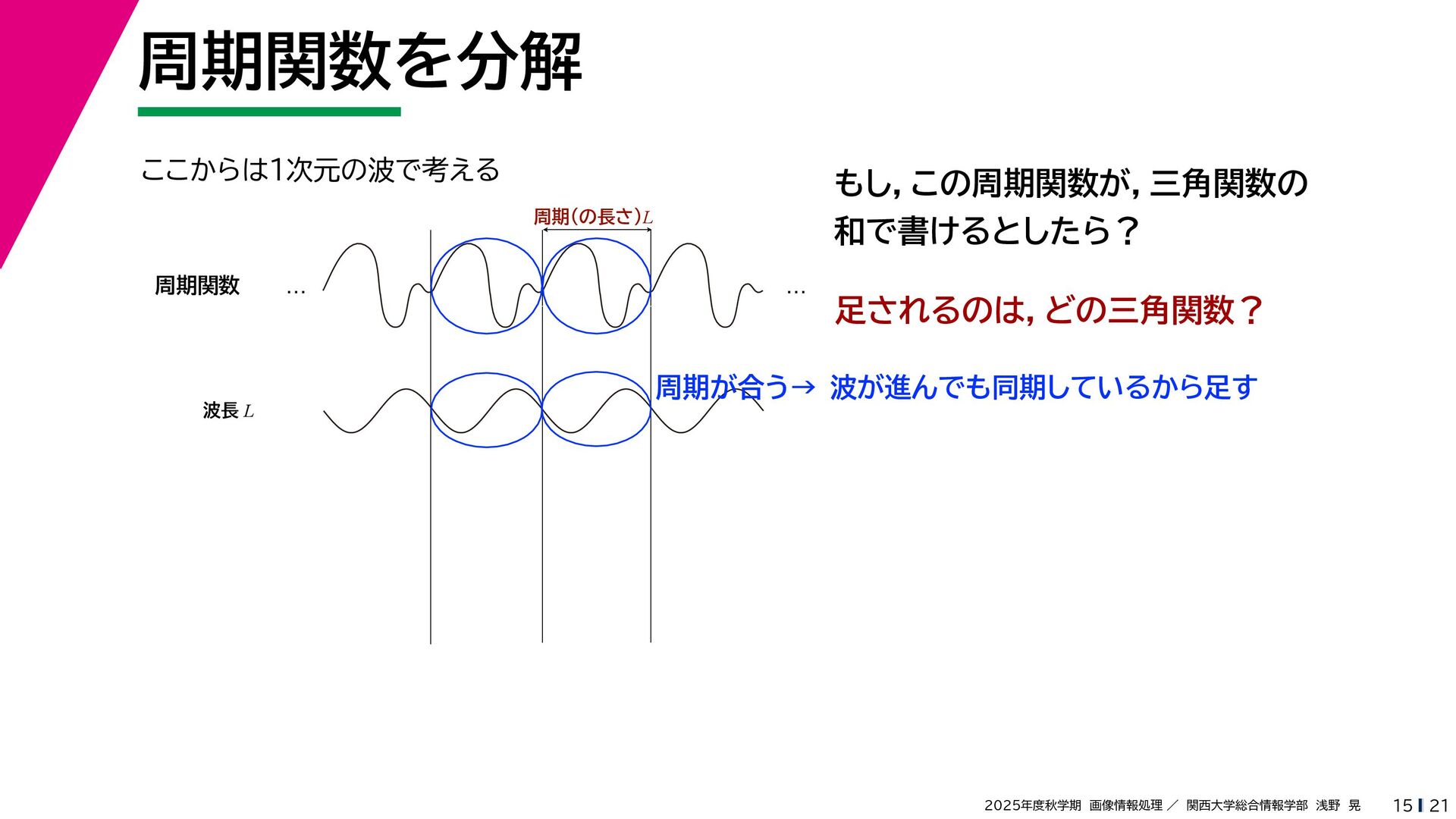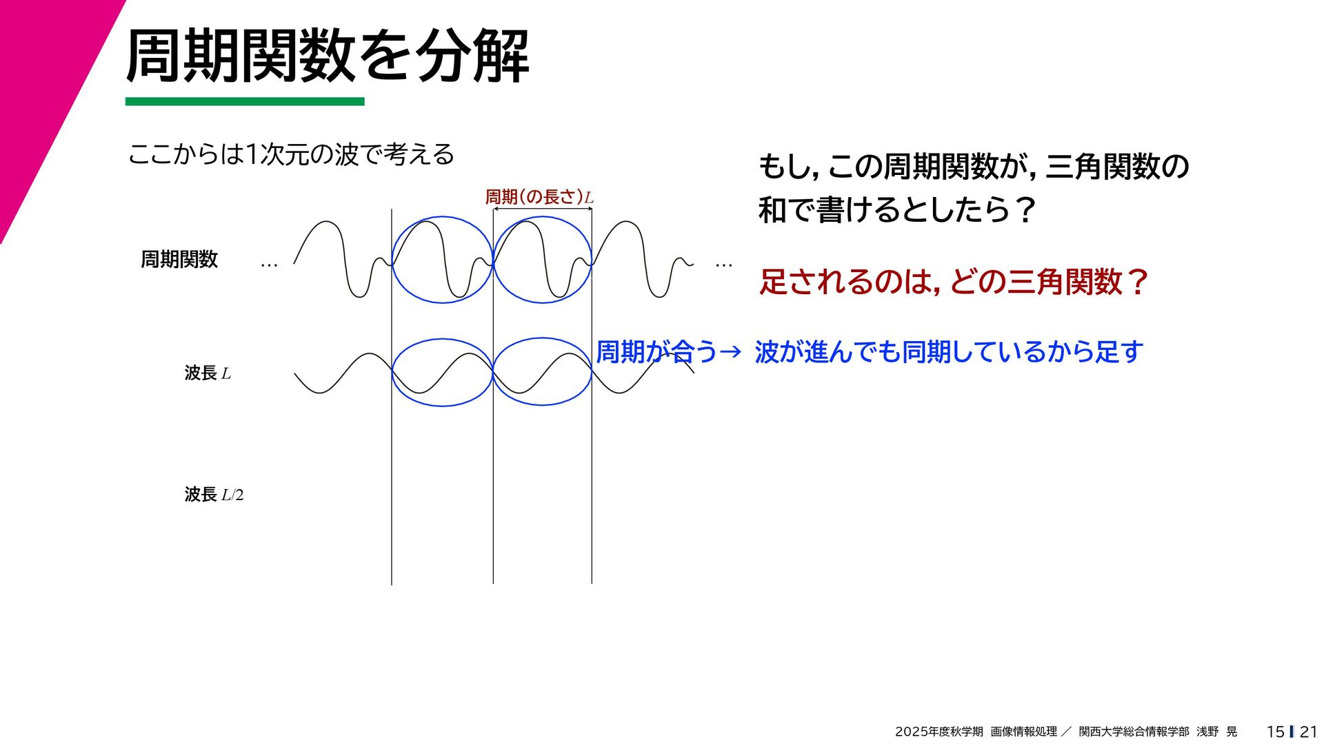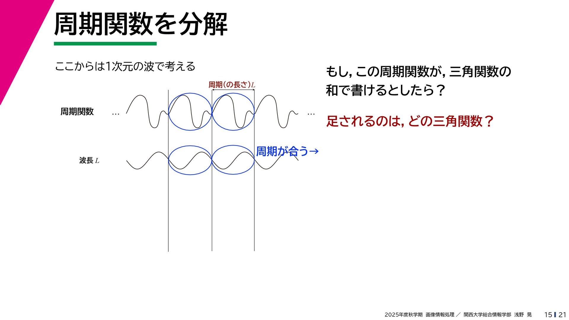 L / n の波を足し合わせて はず。 波長 L / n の波は f(x) = ∞ n=−∞ an exp i2π n L x という級数で書ける exp(i2π n L x) exp(−i2π n L x) と の組 プラスもマイナスも∞(プラスとマイナスの組で1つの波だから) これがフーリエ級数なんですが,