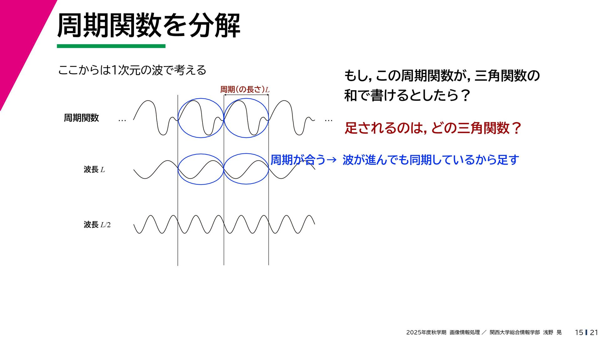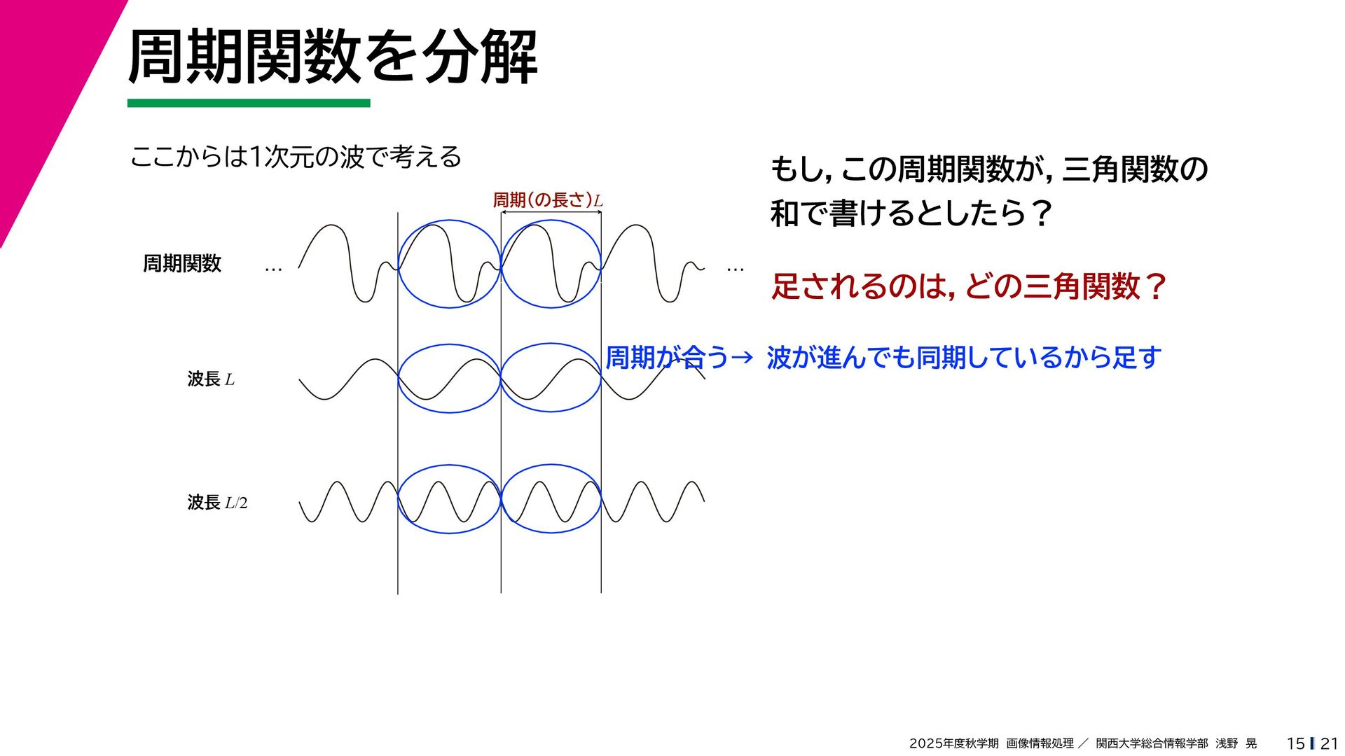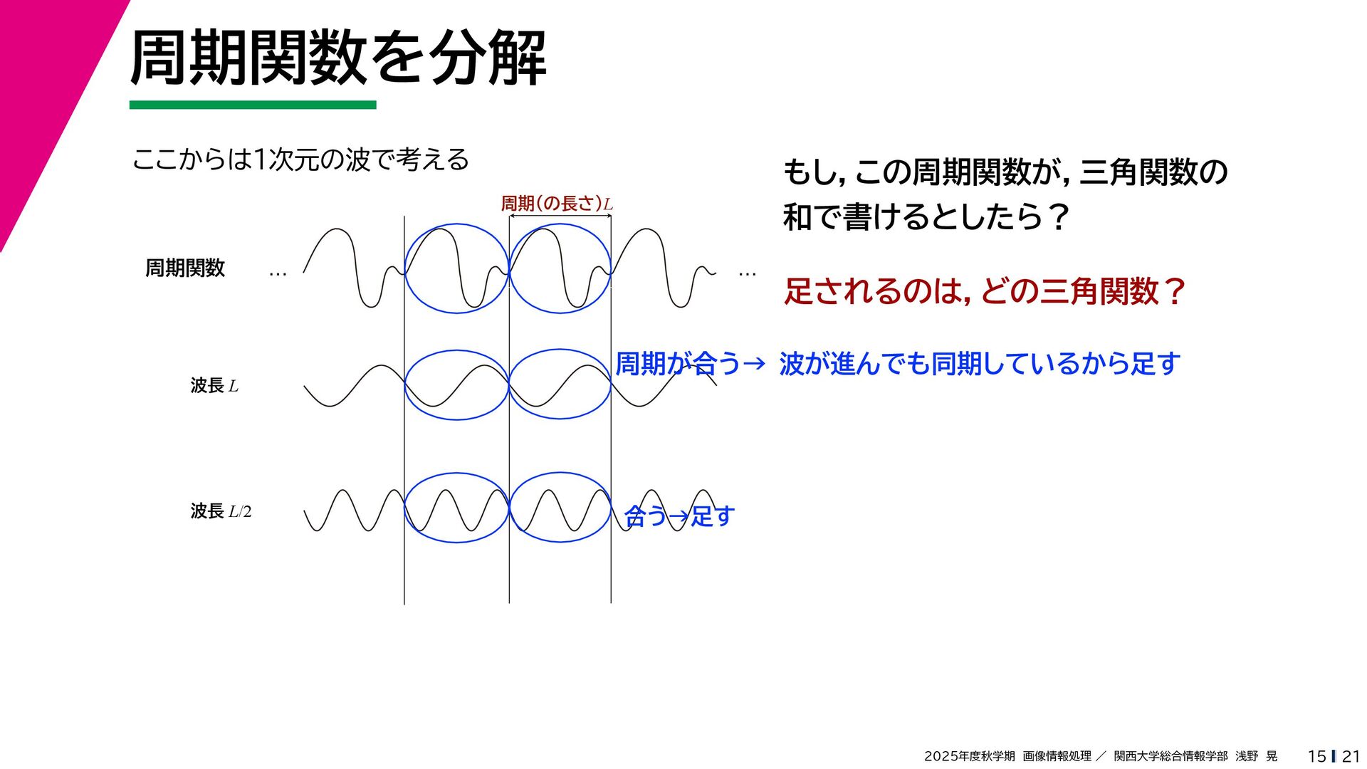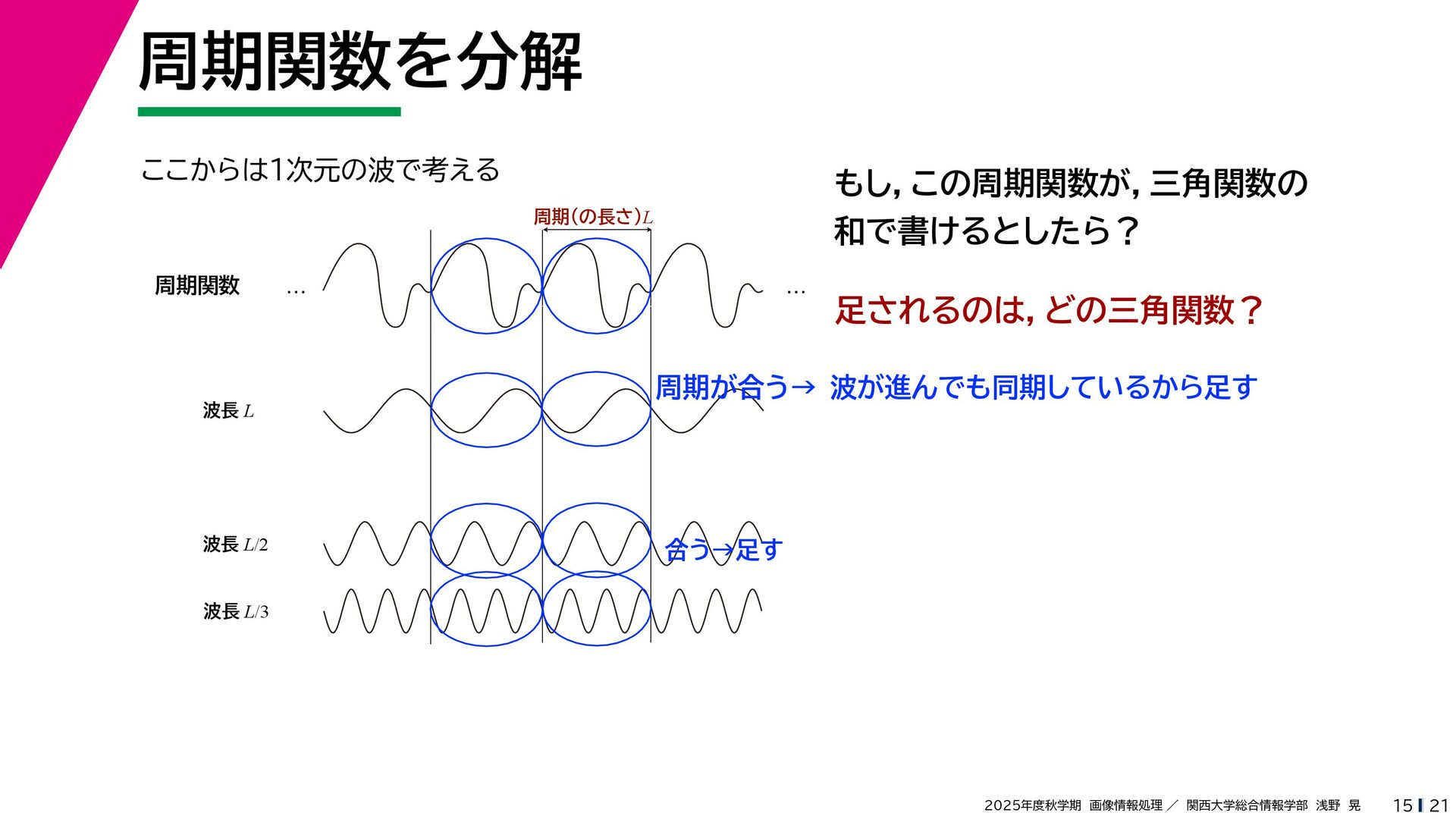 L / n の波を足し合わせて はず。 波長 L / n の波は f(x) = ∞ n=−∞ an exp i2π n L x という級数で書ける exp(i2π n L x) exp(−i2π n L x) と の組 プラスもマイナスも∞(プラスとマイナスの組で1つの波だから) これがフーリエ級数なんですが,
