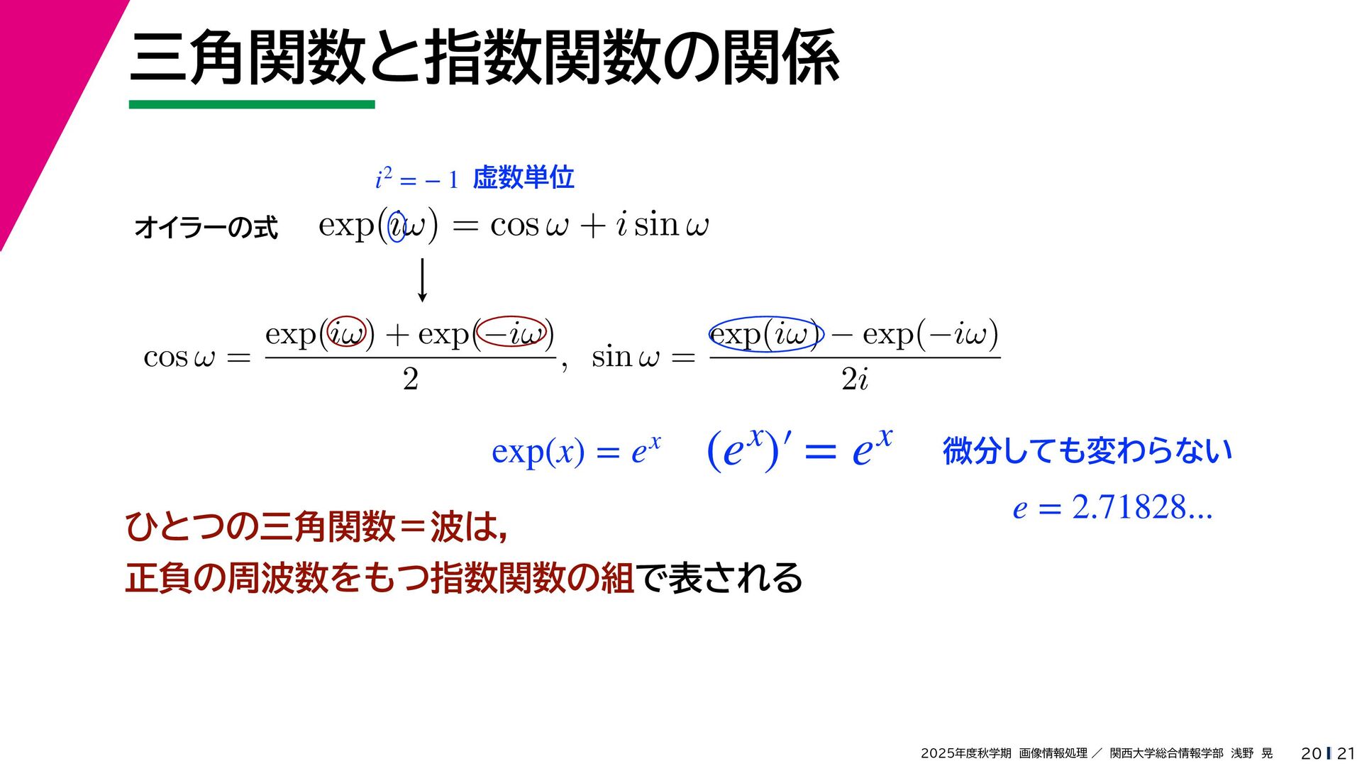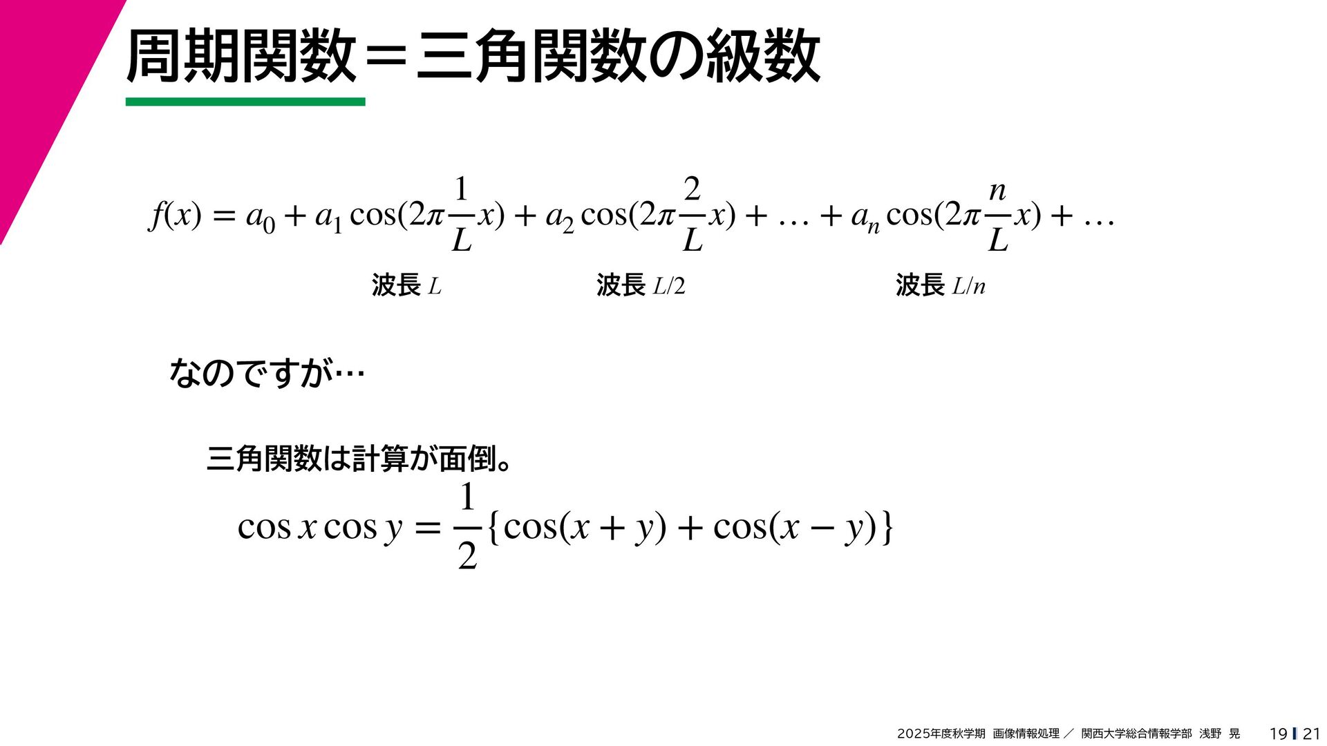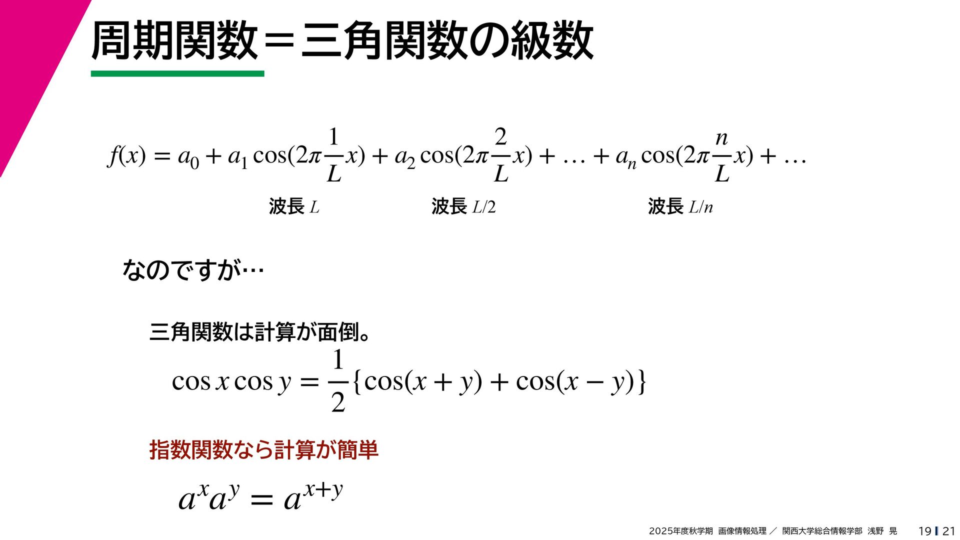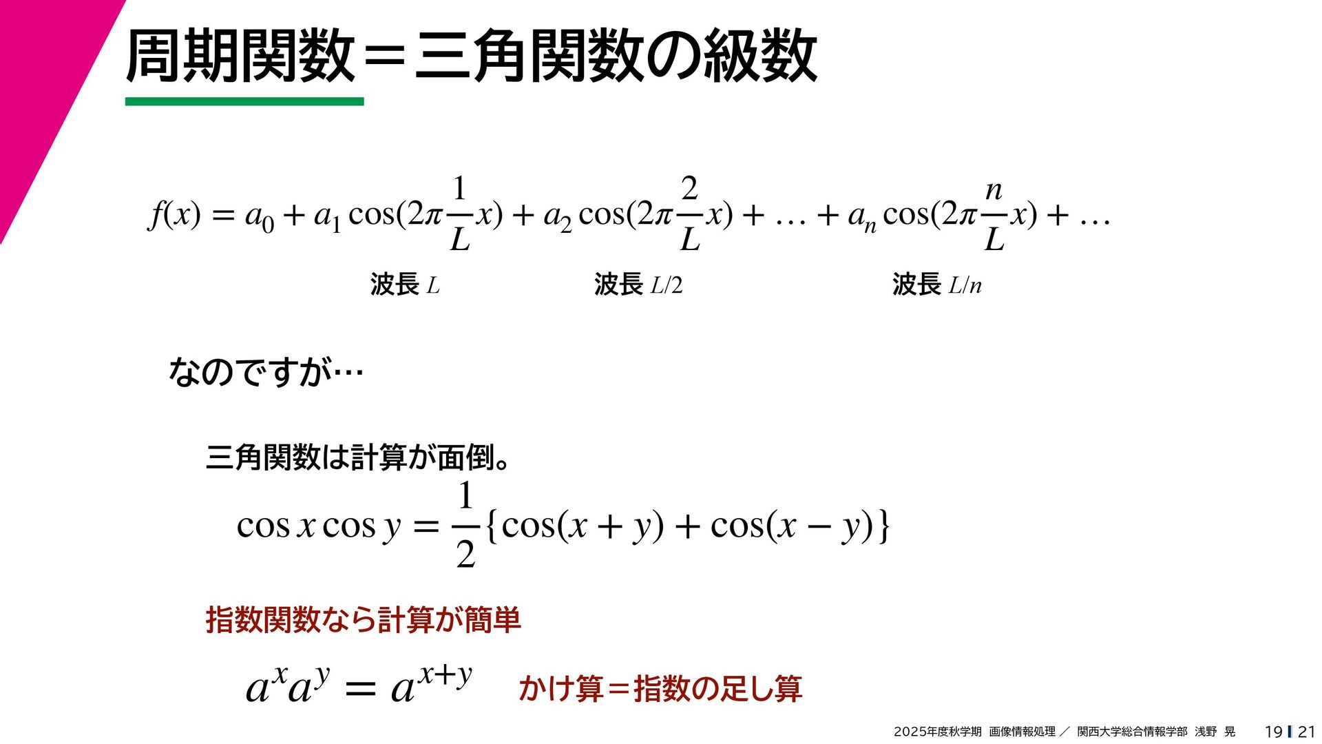 a0 + a1 cos(2π 1 L x) + a2 cos(2π 2 L x) + … + an cos(2π n L x) + … 波長 L 波長 L/2 波長 L/n cos x cos y = 1 2 {cos(x + y) + cos(x − y)} axay = ax+y かけ算=指数の足し算