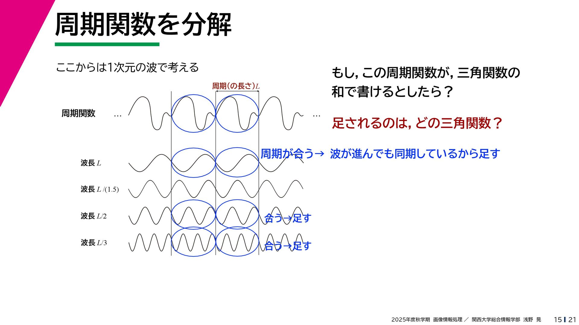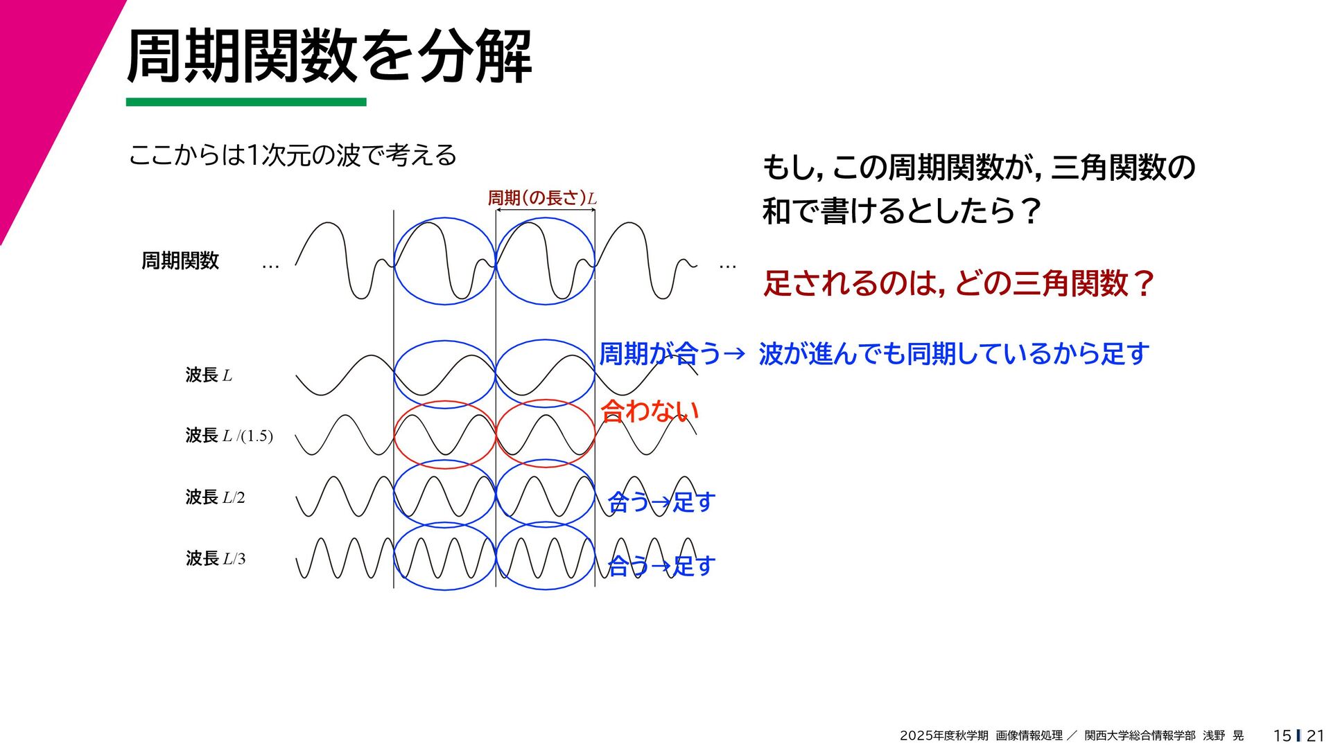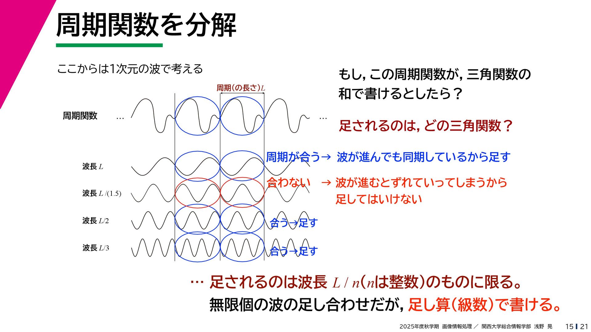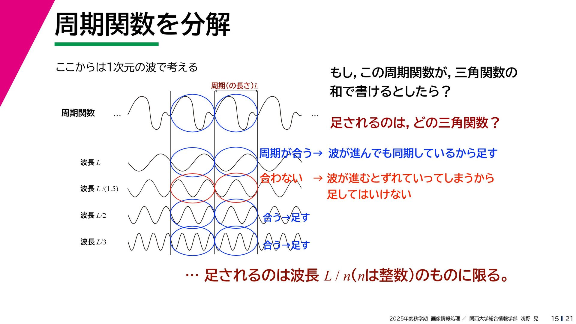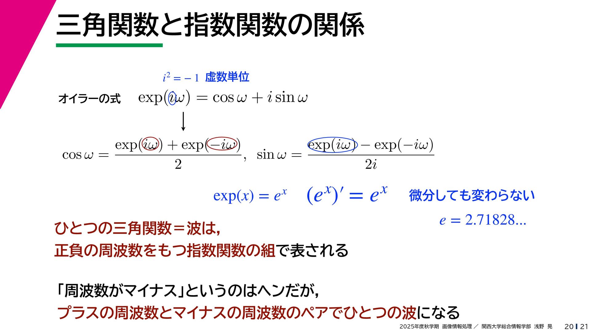a0 + a1 cos(2π 1 L x) + a2 cos(2π 2 L x) + … + an cos(2π n L x) + … 波長 L 波長 L/2 波長 L/n cos x cos y = 1 2 {cos(x + y) + cos(x − y)} axay = ax+y かけ算=指数の足し算