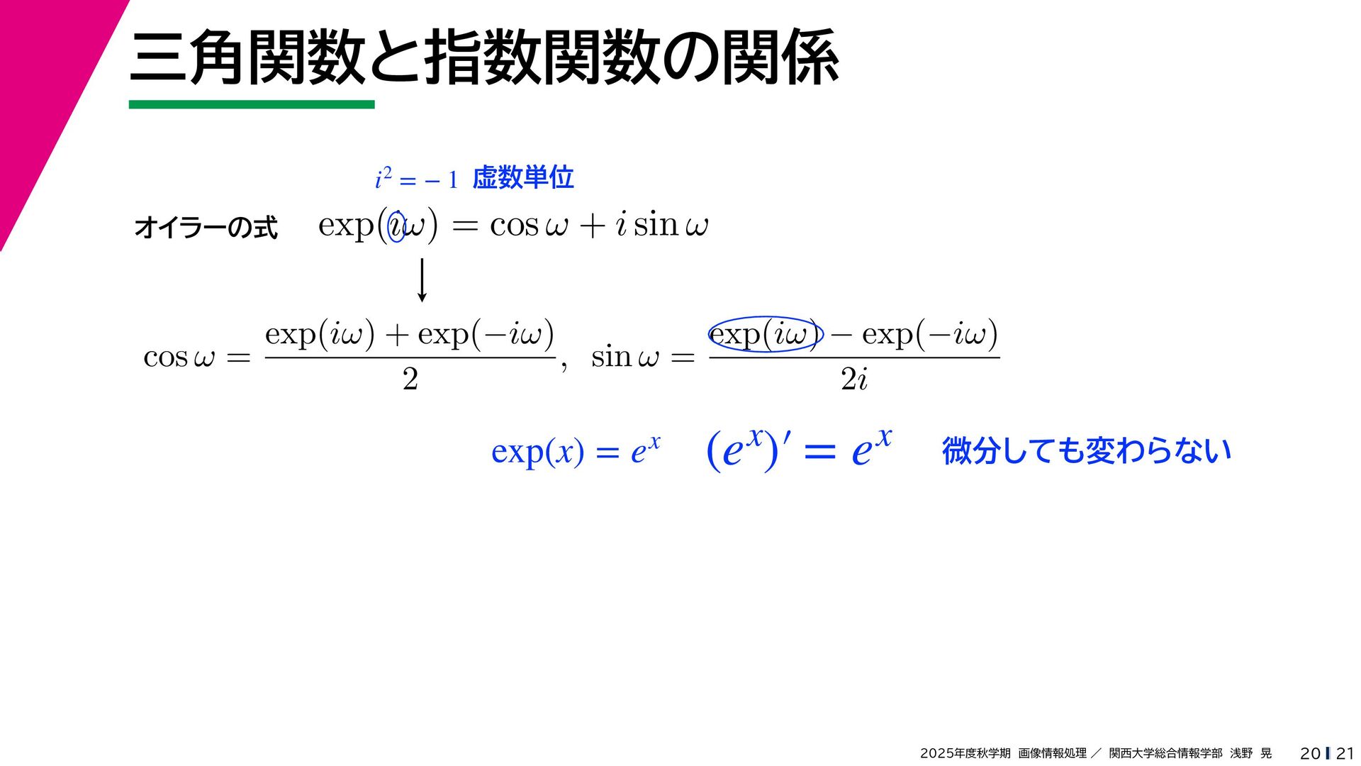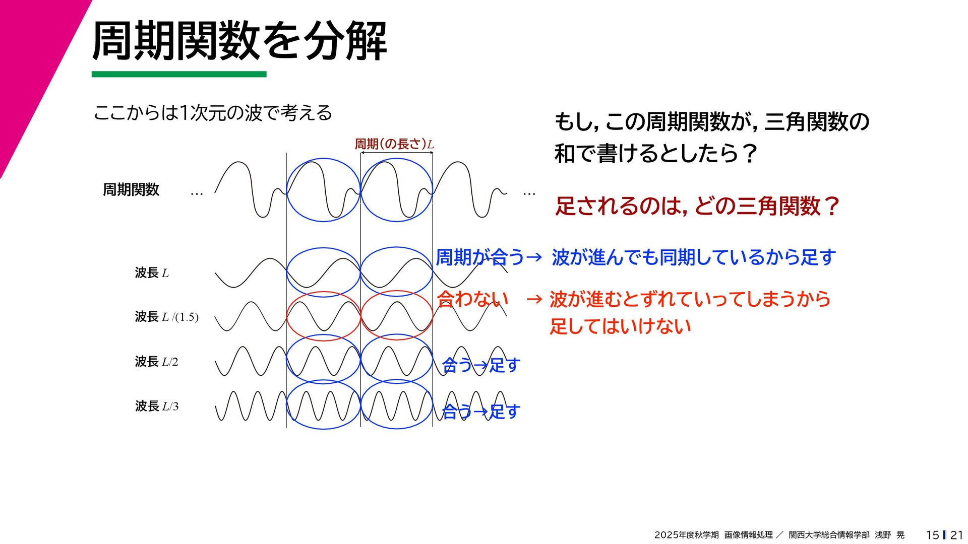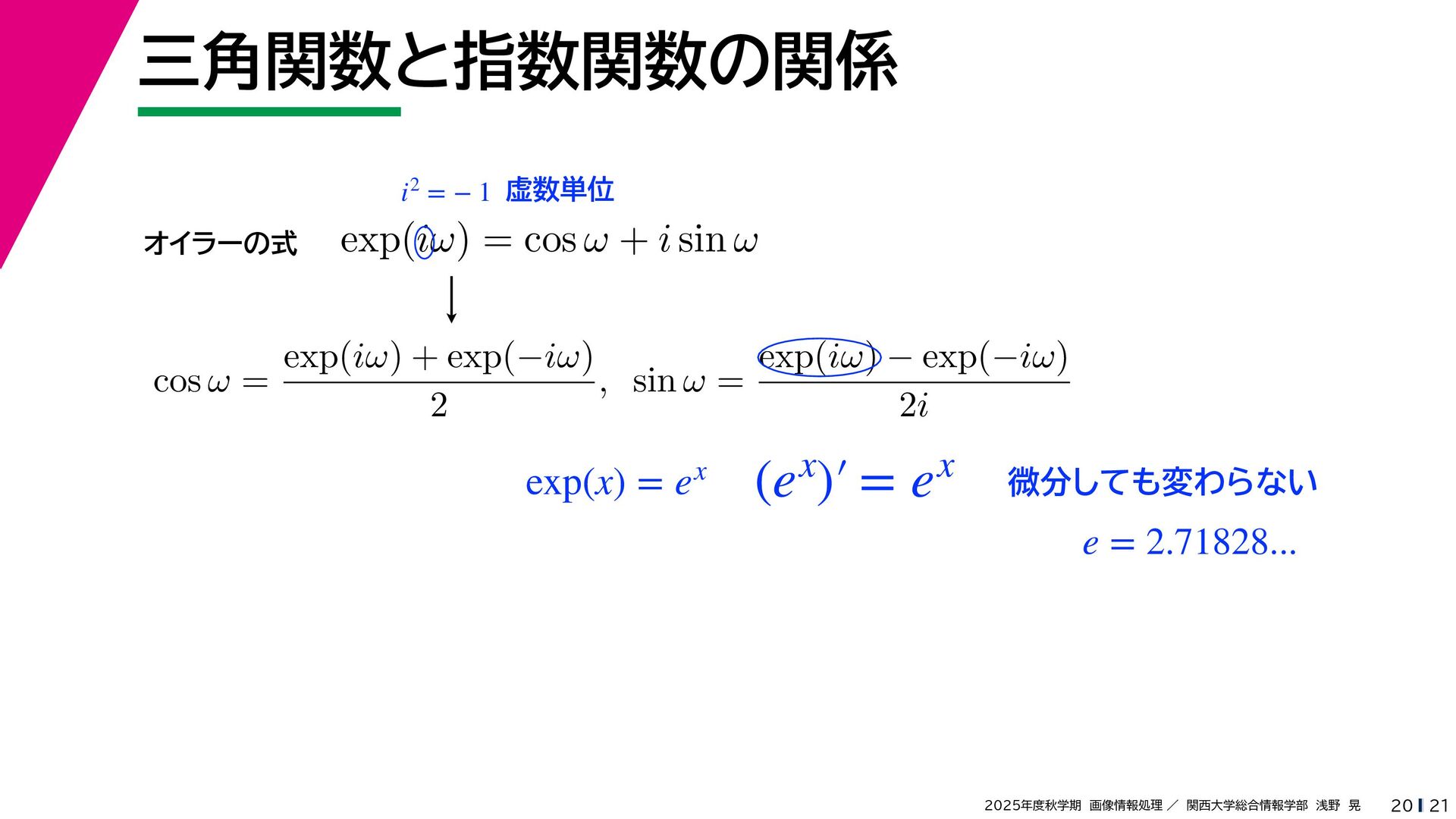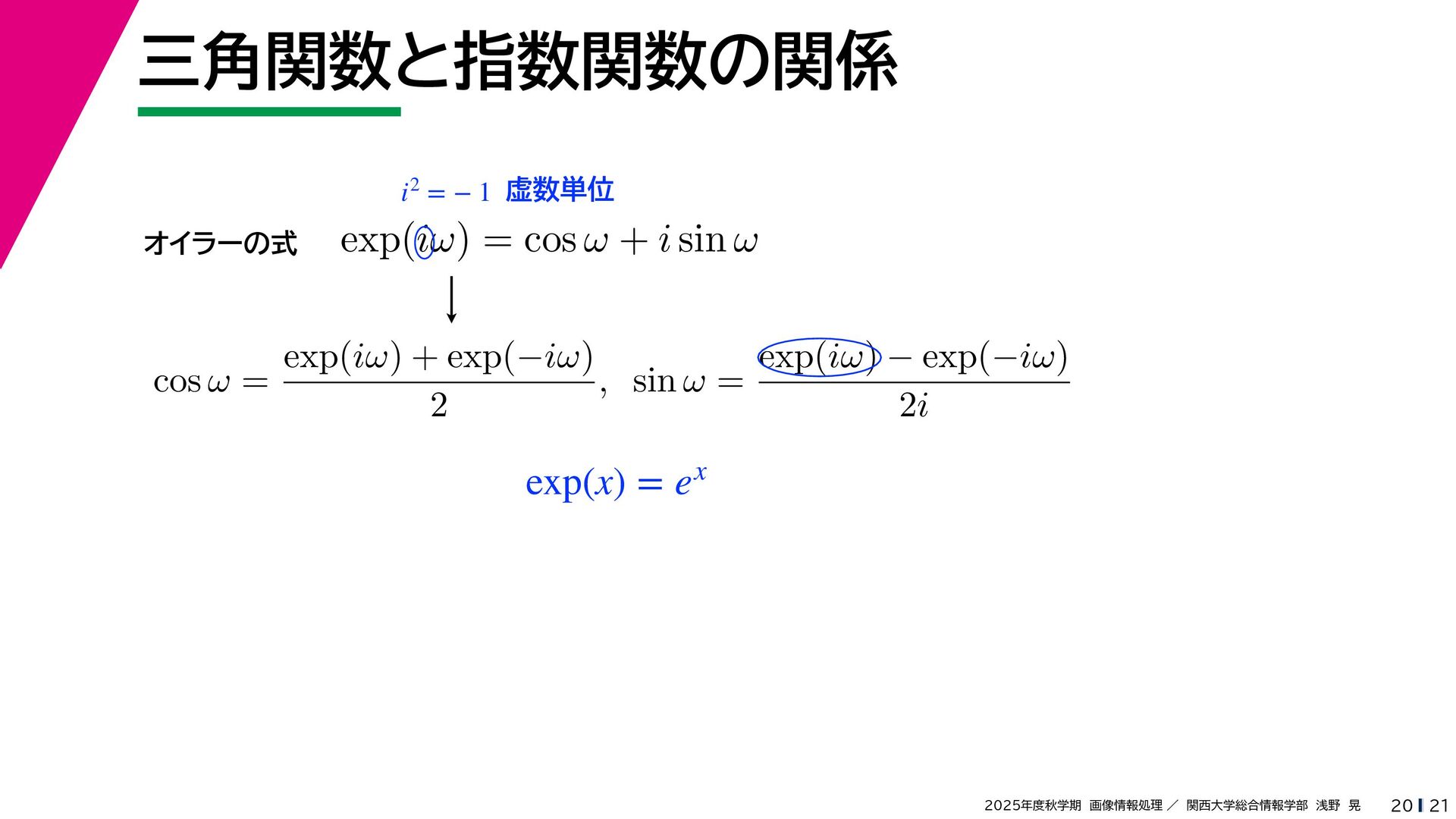 a0 + a1 cos(2π 1 L x) + a2 cos(2π 2 L x) + … + an cos(2π n L x) + … 波長 L 波長 L/2 波長 L/n cos x cos y = 1 2 {cos(x + y) + cos(x − y)} axay = ax+y かけ算=指数の足し算