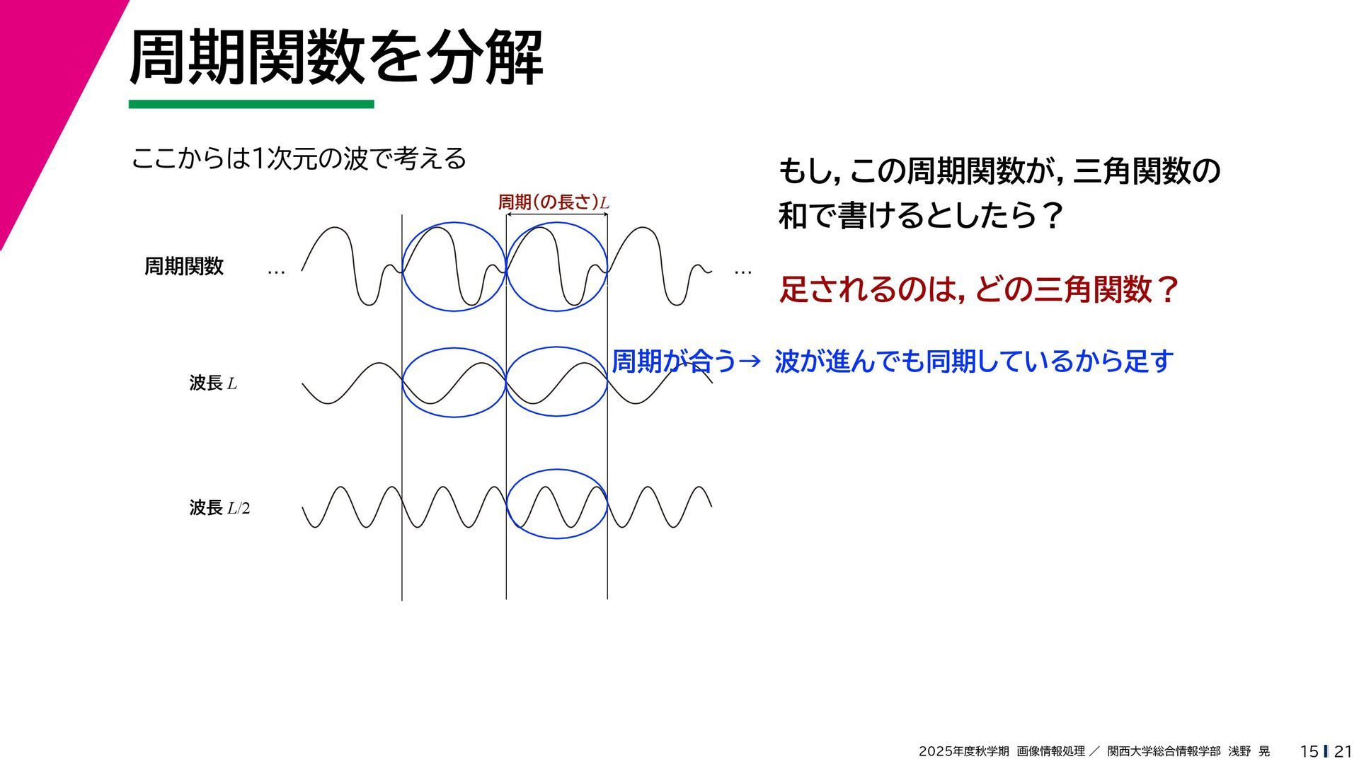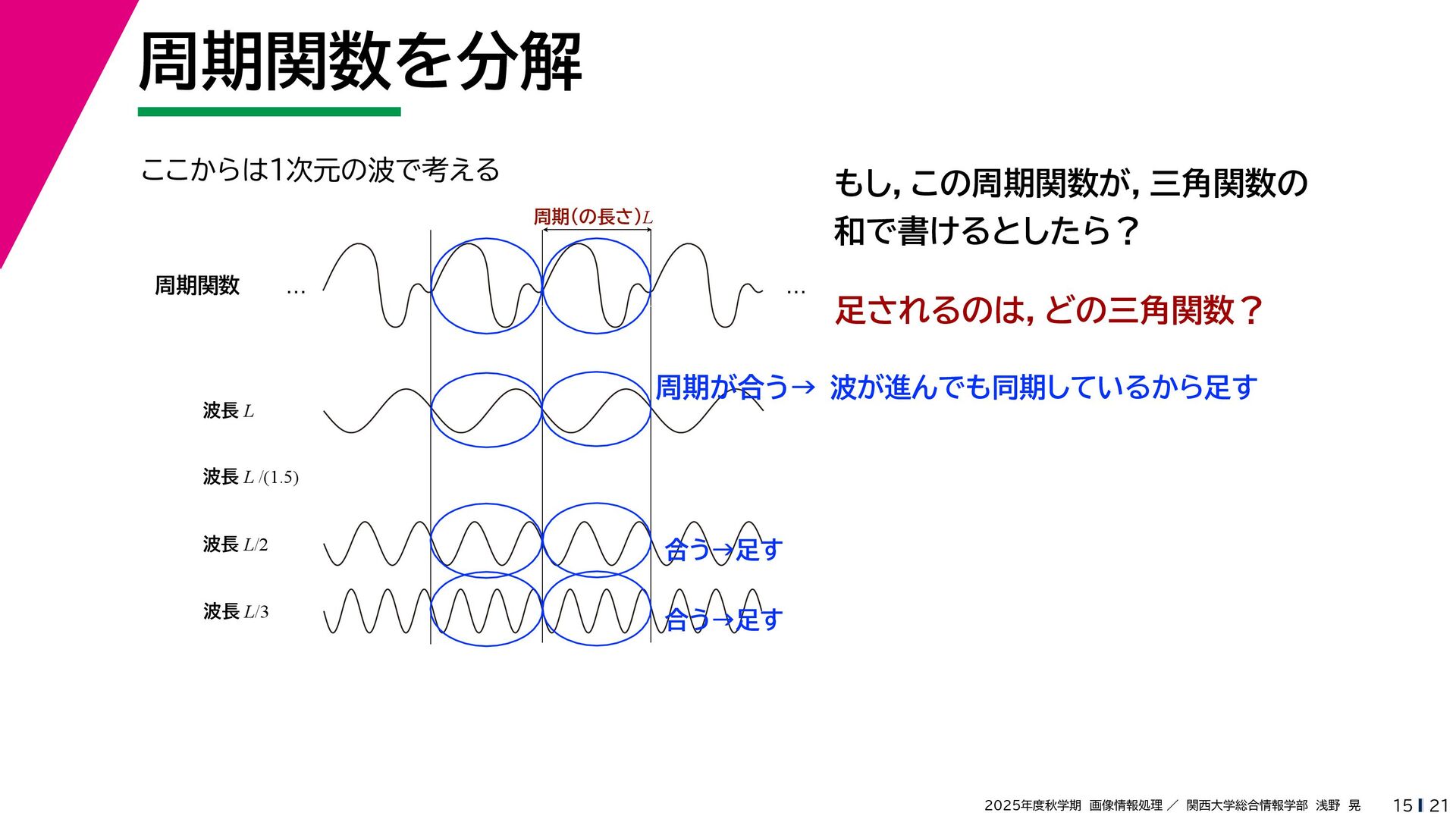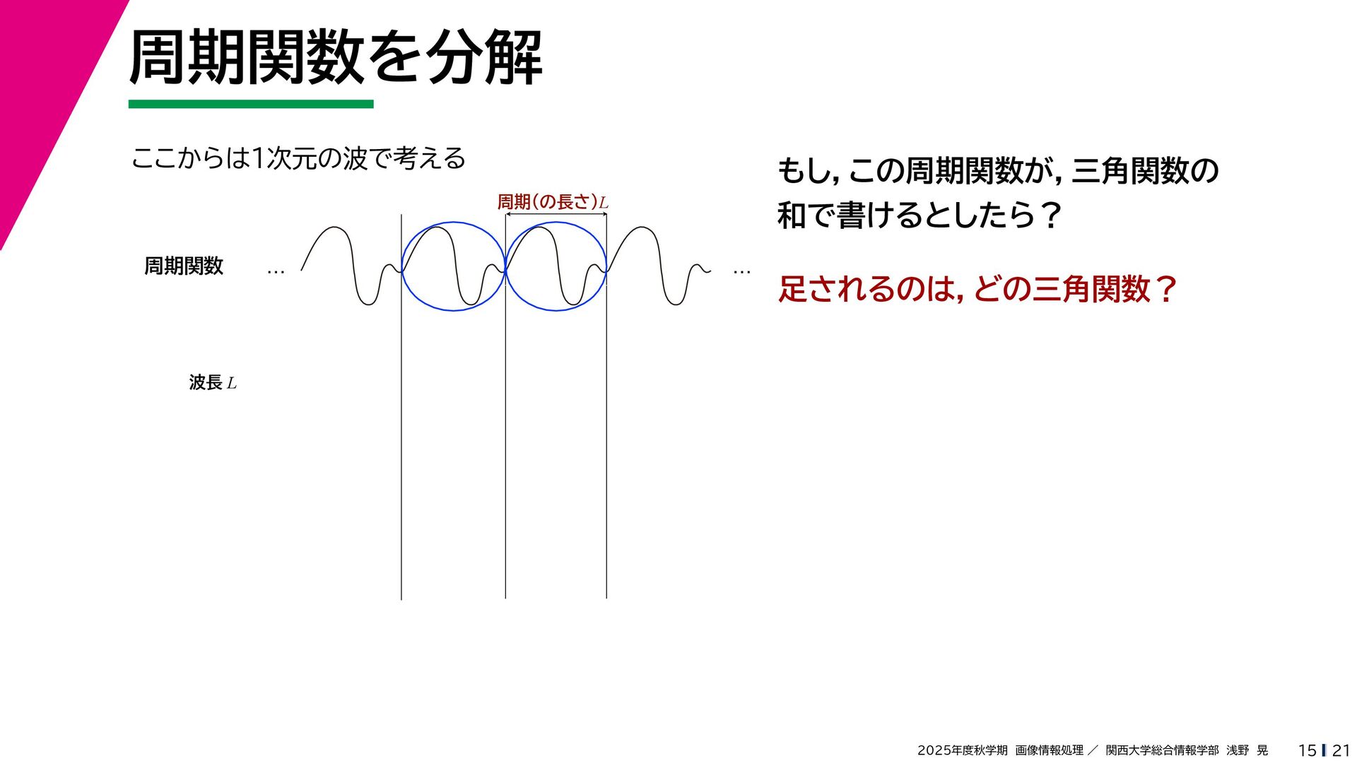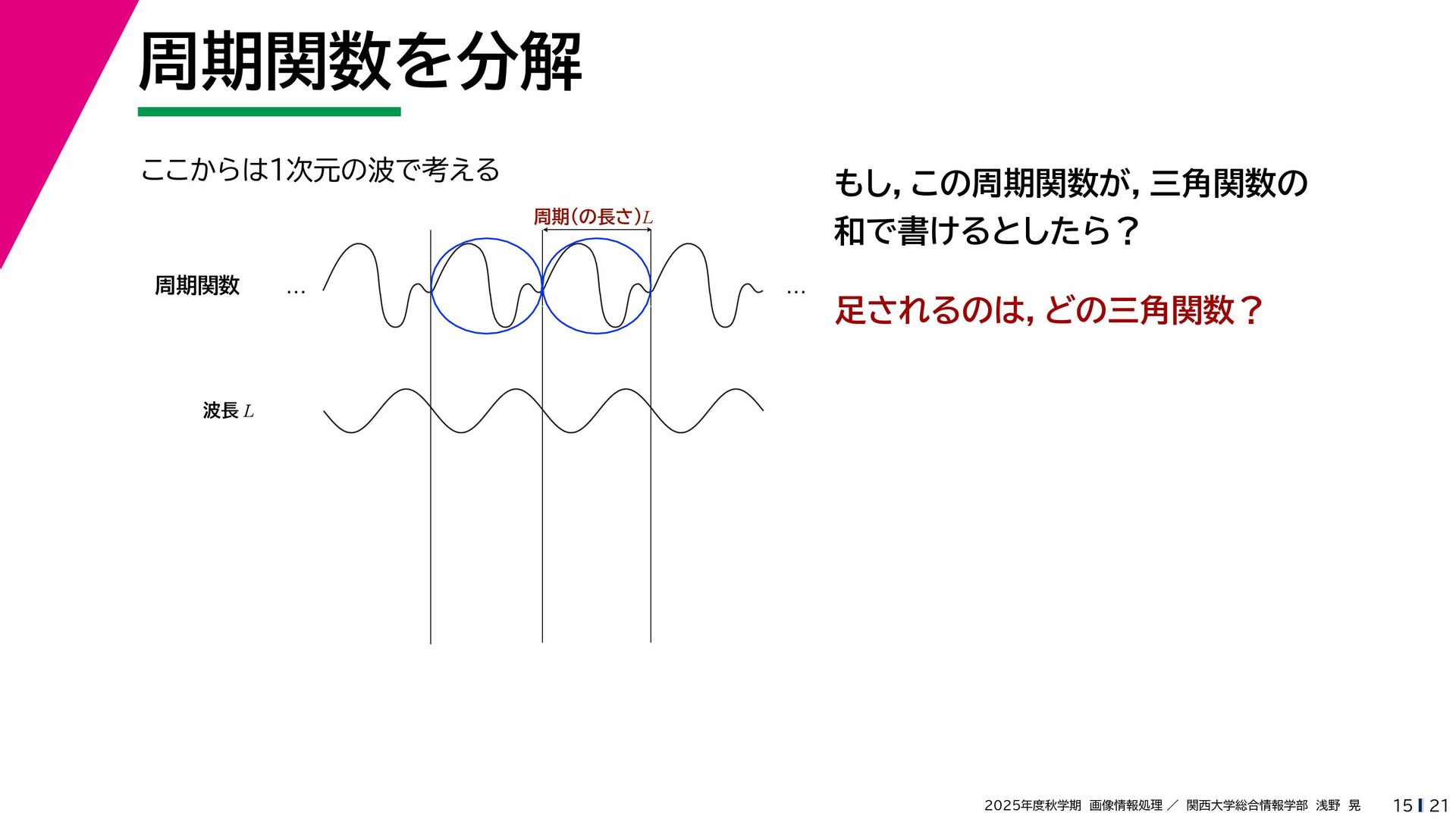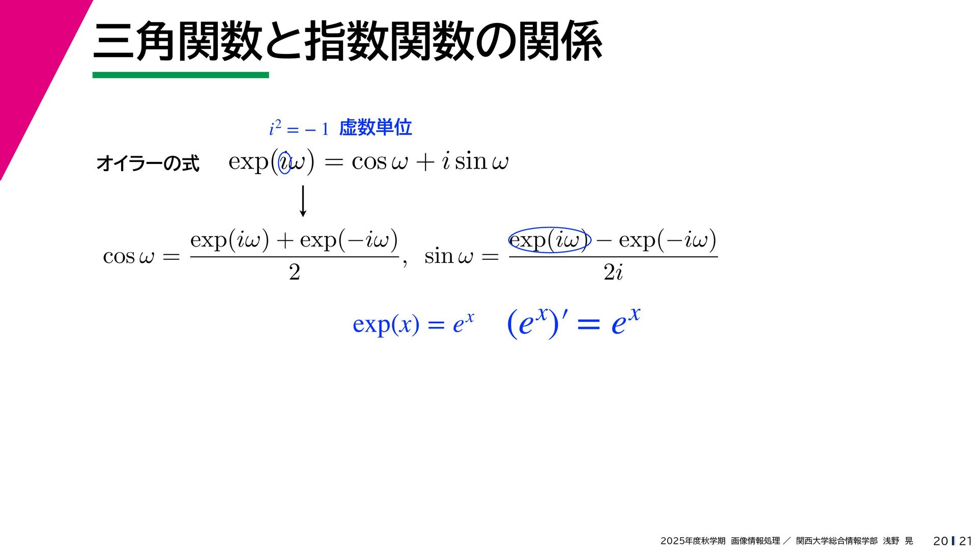 a0 + a1 cos(2π 1 L x) + a2 cos(2π 2 L x) + … + an cos(2π n L x) + … 波長 L 波長 L/2 波長 L/n cos x cos y = 1 2 {cos(x + y) + cos(x − y)} axay = ax+y かけ算=指数の足し算