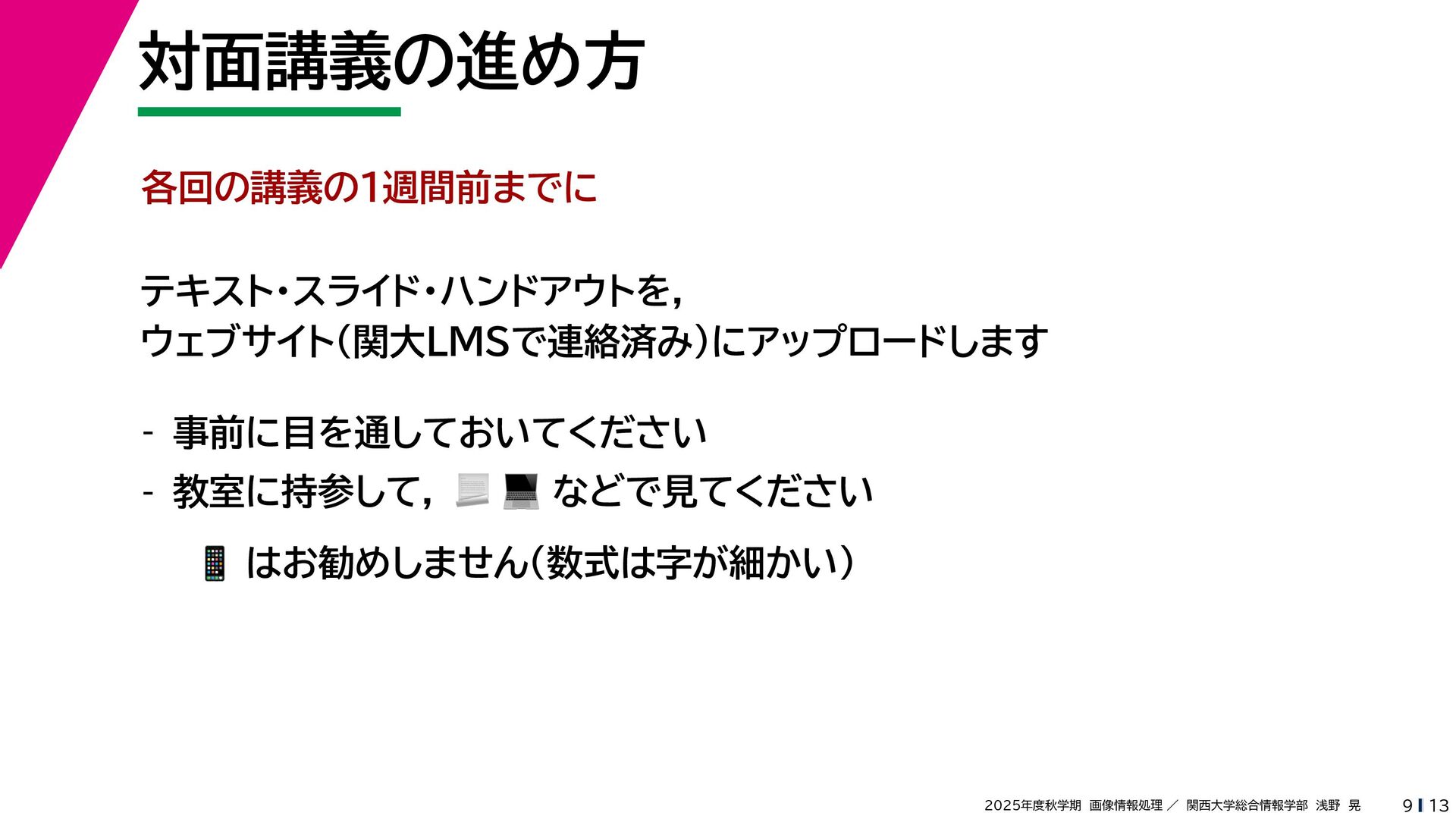 13 2025年度秋学期 画像情報処理 / 関西大学総合情報学部 浅野 晃 対面講義の進め方 9 各回の講義の1週間前までに テキスト・スライド・ハンドアウトを, ウェブサイト(関大LMSで連絡済み)にアップロードします - 事前に目を通しておいてください