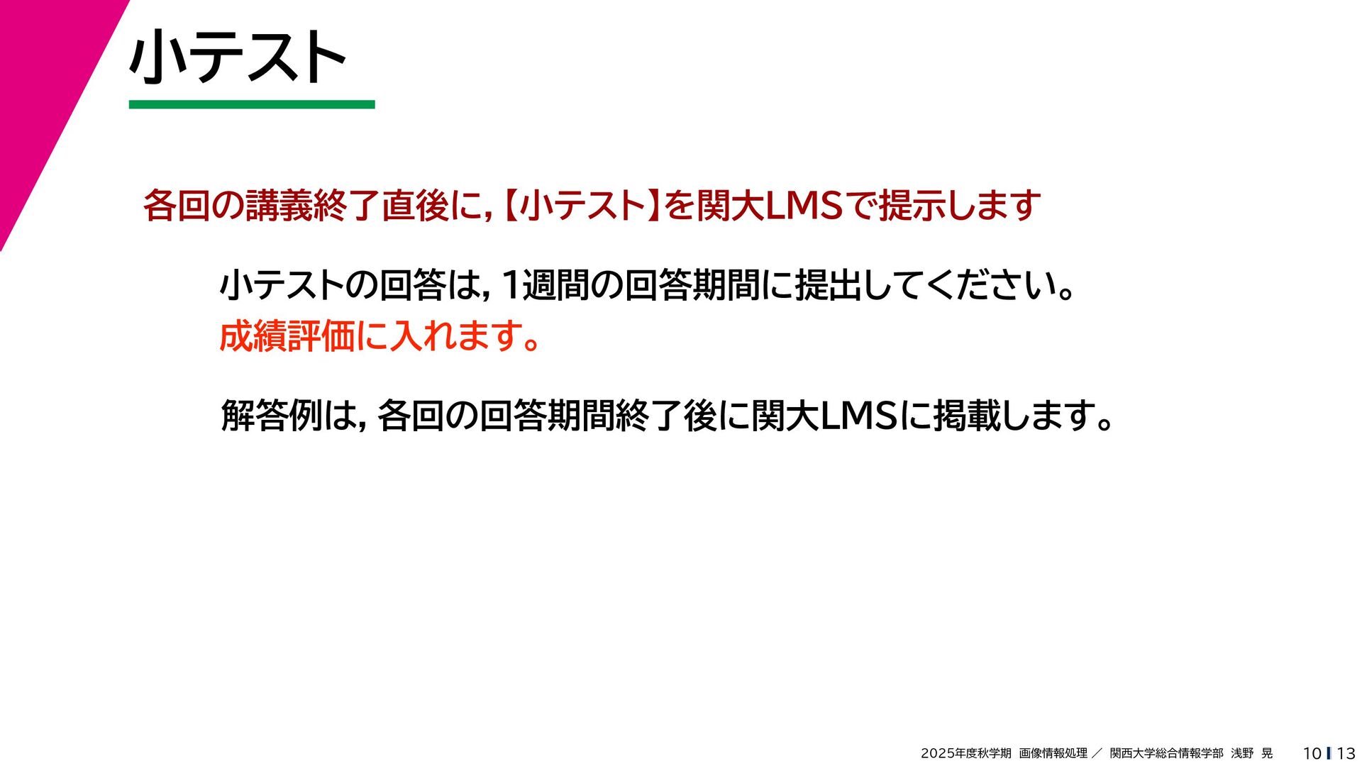 13 2025年度秋学期 画像情報処理 / 関西大学総合情報学部 浅野 晃 小テスト 10 各回の講義終了直後に,【小テスト】を関大LMSで提示します 小テストの回答は,1週間の回答期間に提出してください。 成績評価に入れます。 解答例は,各回の回答期間終了後に関大LMSに掲載します。