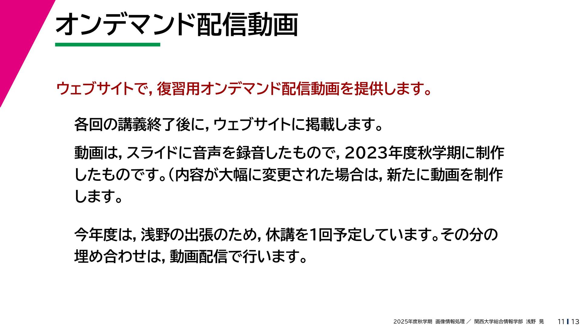 13 2025年度秋学期 画像情報処理 / 関西大学総合情報学部 浅野 晃 オンデマンド配信動画 11 ウェブサイトで,復習用オンデマンド配信動画を提供します。 各回の講義終了後に,ウェブサイトに掲載します。 動画は,スライドに音声を録音したもので,2023年度秋学期に制作 したものです。(内容が大幅に変更された場合は,新たに動画を制作 します。