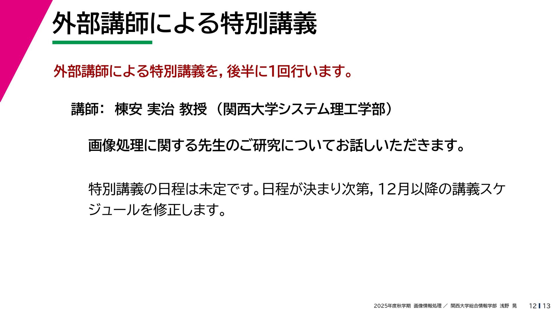 13 2025年度秋学期 画像情報処理 / 関西大学総合情報学部 浅野 晃 外部講師による特別講義 12 外部講師による特別講義を,後半に1回行います。 講師: 棟安 実治 教授 (関西大学システム理工学部) 画像処理に関する先生のご研究についてお話しいただきます。