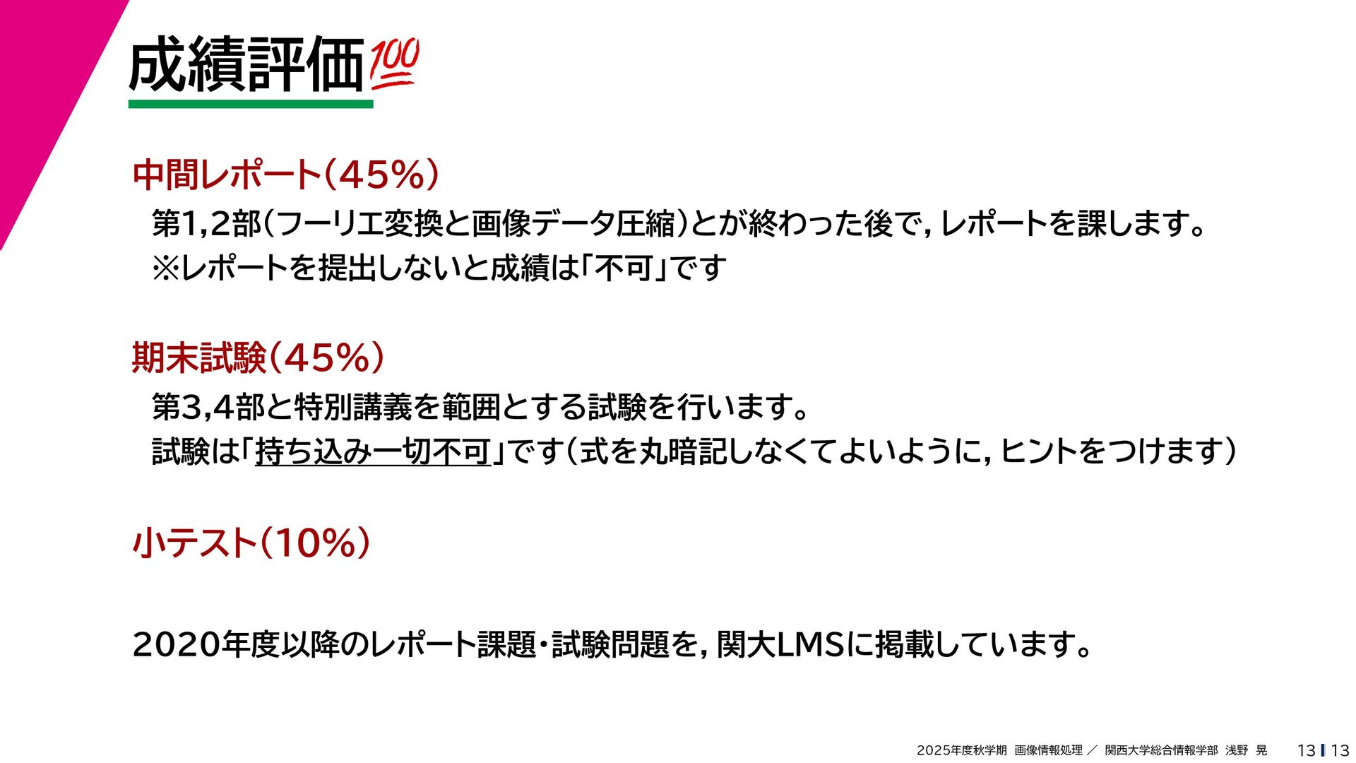 13 2025年度秋学期 画像情報処理 / 関西大学総合情報学部 浅野 晃 成績評価💯💯 13 2020年度以降のレポート課題・試験問題を,関大LMSに掲載しています。 期末試験(45%) 第3,4部と特別講義を範囲とする試験を行います。 試験は「持ち込み一切不可」です(式を丸暗記しなくてよいように,ヒントをつけます) 中間レポート(45%)