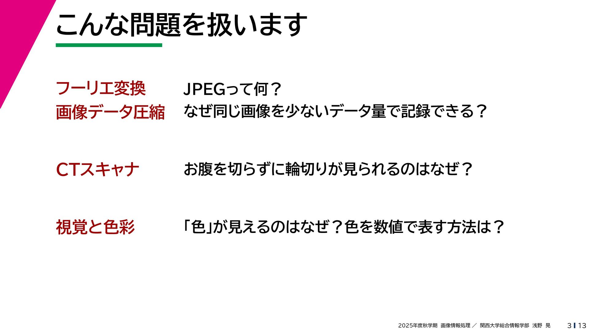 13 2025年度秋学期 画像情報処理 / 関西大学総合情報学部 浅野 晃 こんな問題を扱います 3 フーリエ変換 画像データ圧縮 CTスキャナ JPEGって何? なぜ同じ画像を少ないデータ量で記録できる?