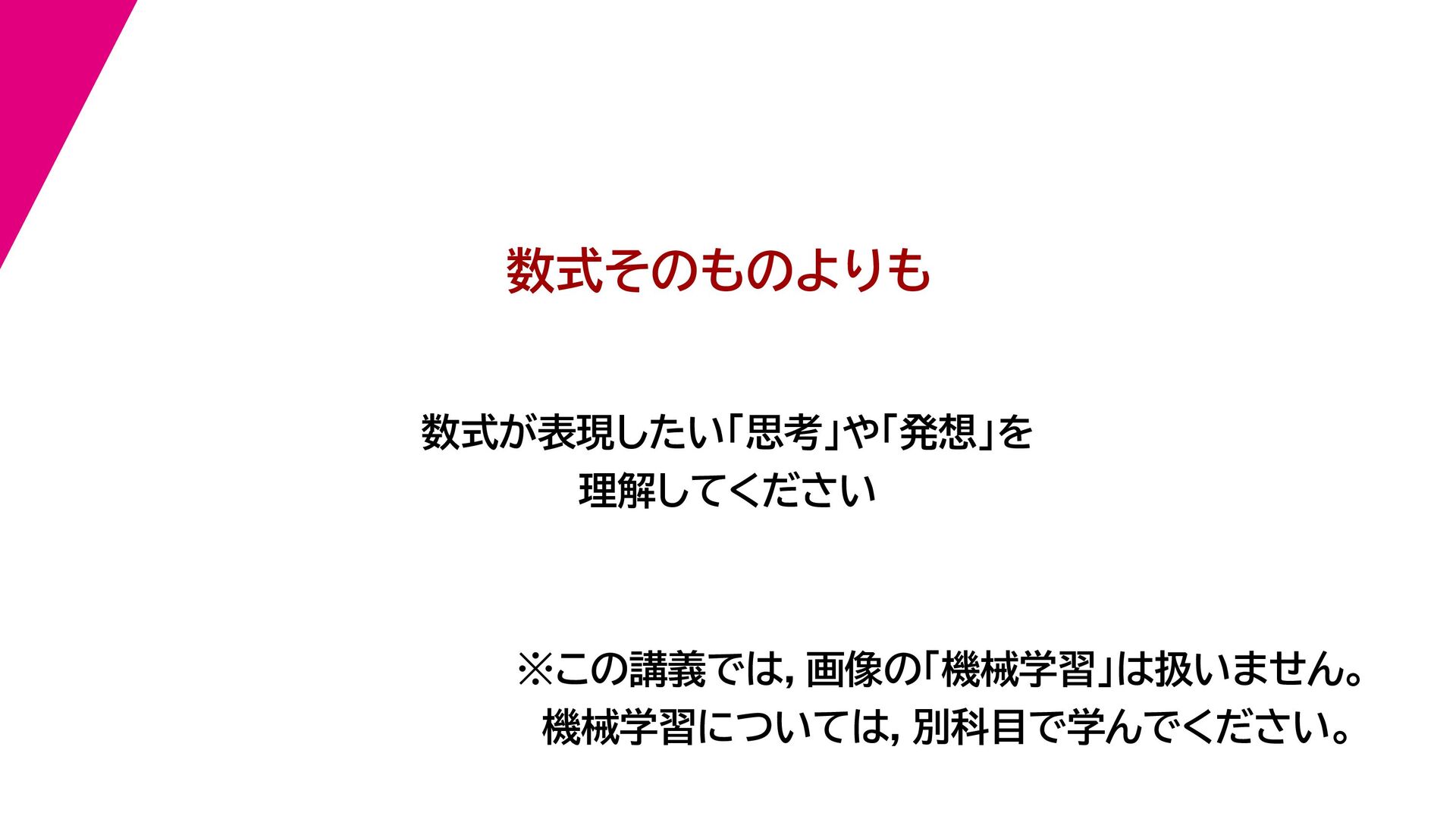 数式が表現したい「思考」や「発想」を 理解してください 数式そのものよりも ※この講義では,画像の「機械学習」は扱いません。 機械学習については,別科目で学んでください。