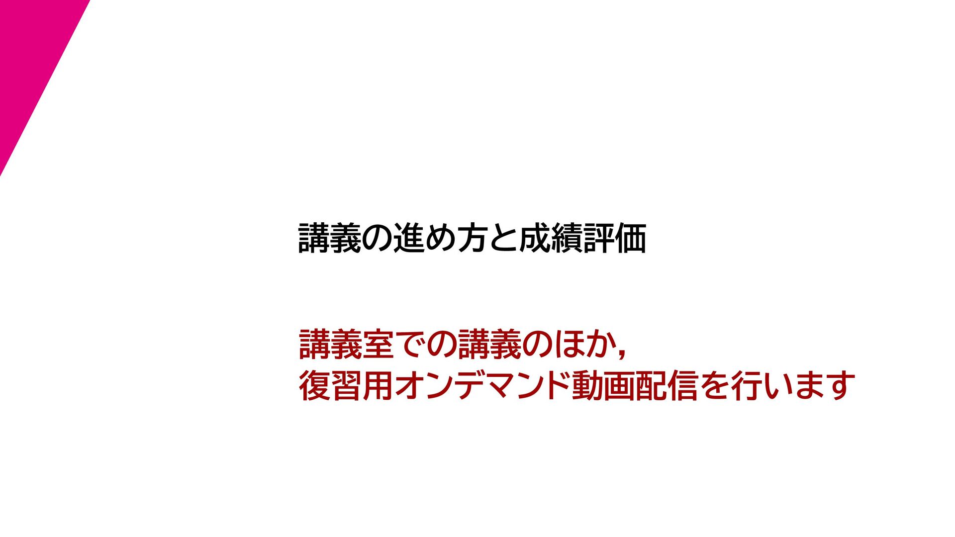 講義の進め方と成績評価 講義室での講義のほか, 復習用オンデマンド動画配信を行います
