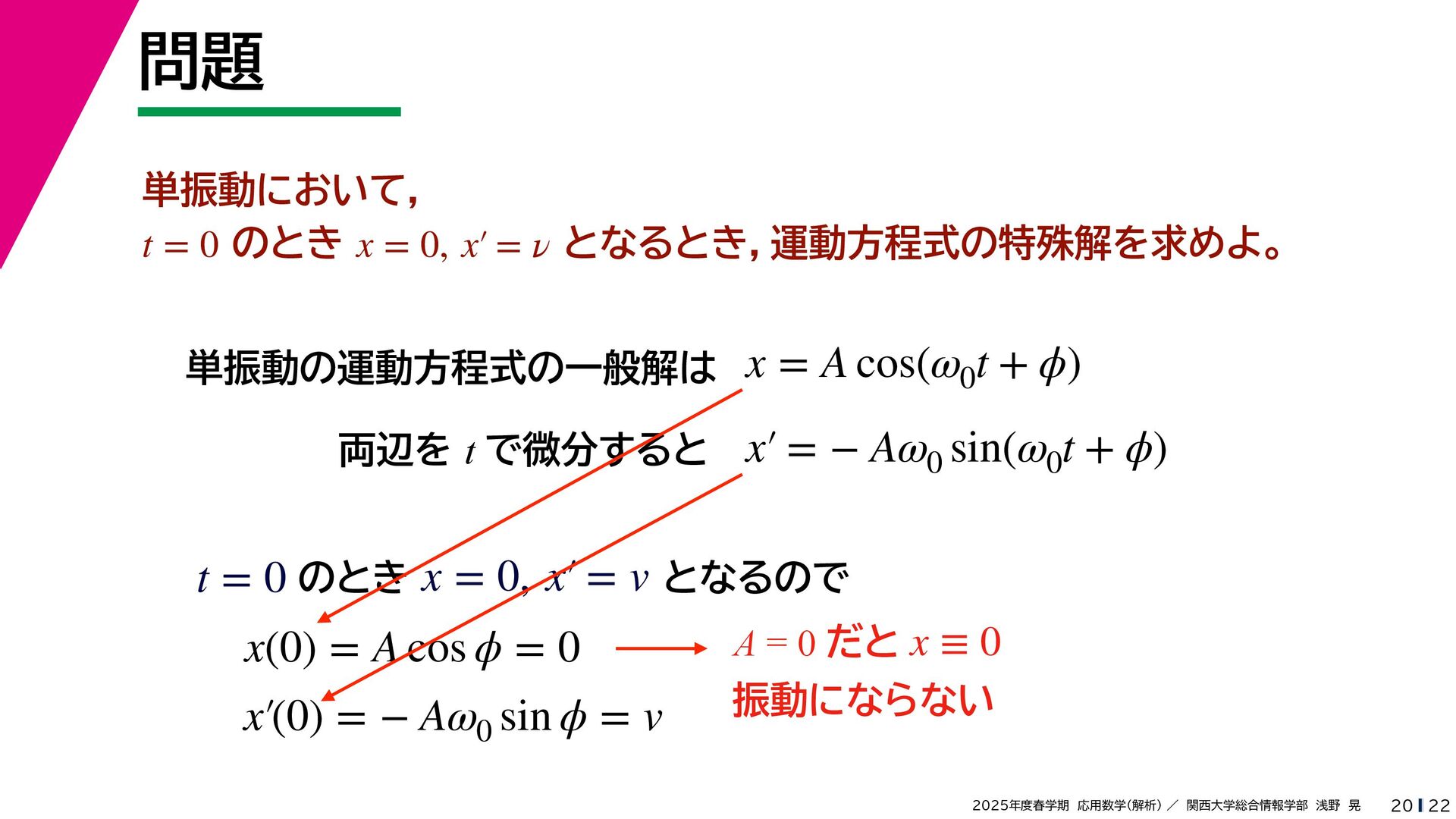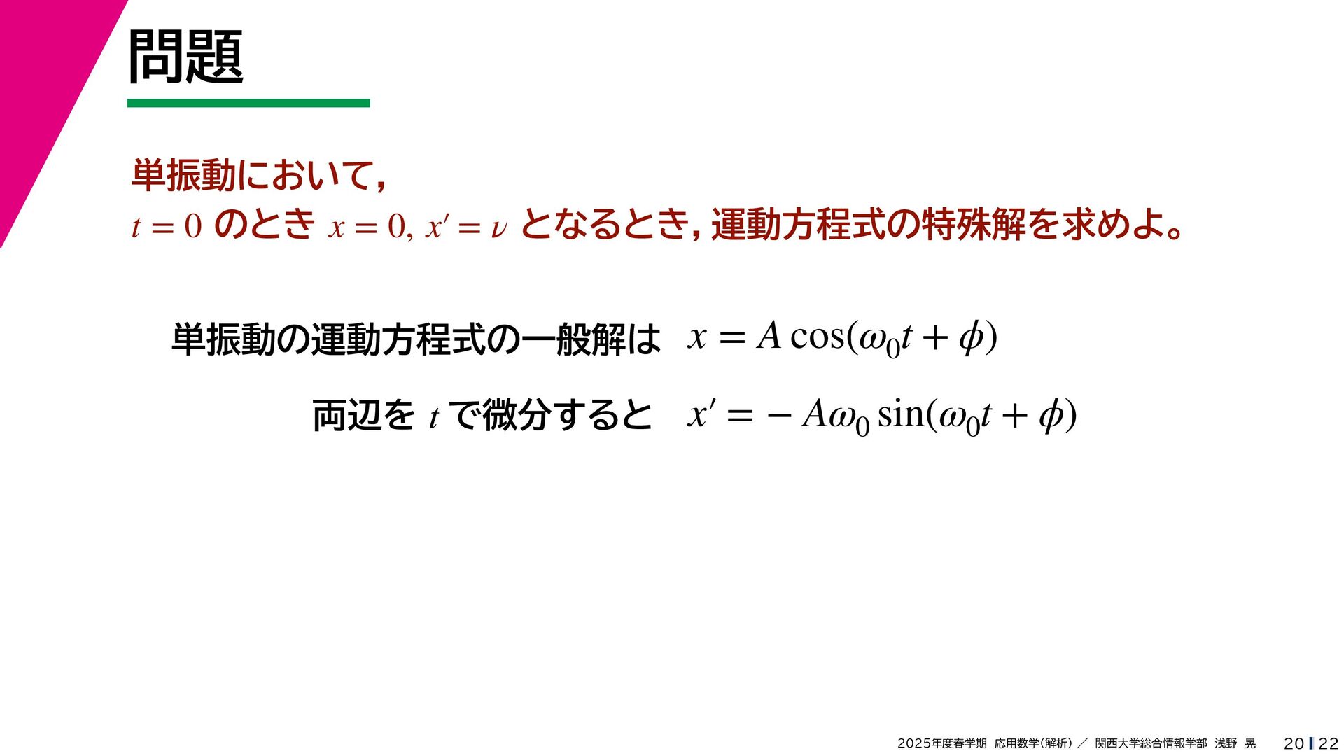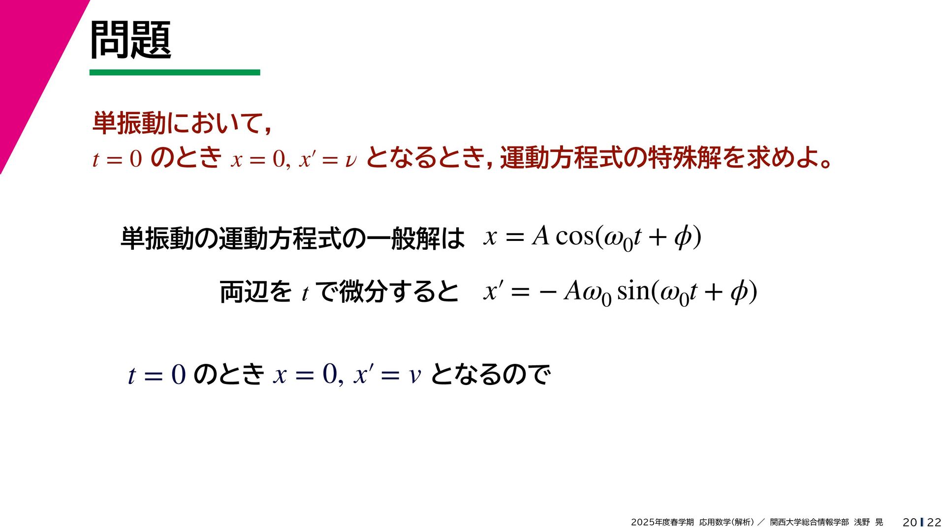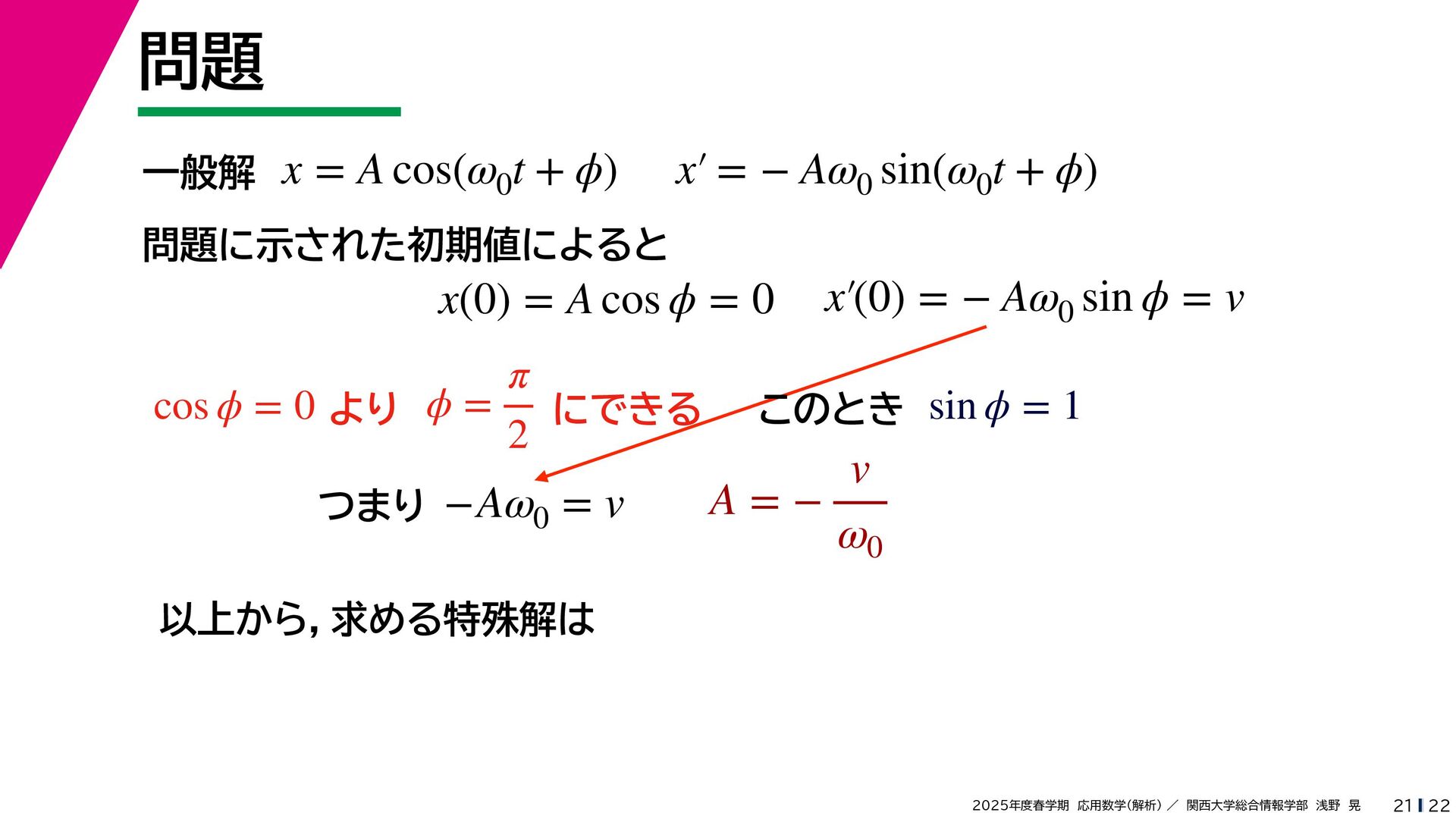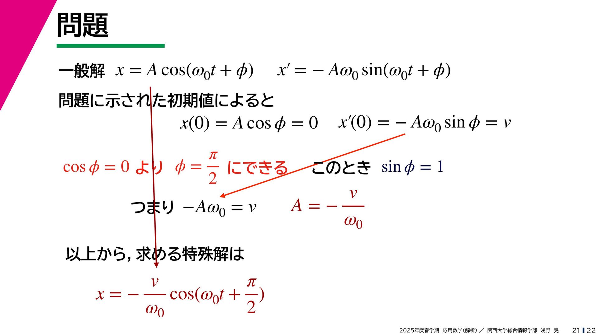 + ϕ) x′ = − Aω0 sin(ω0 t + ϕ) x(0) = A cos ϕ = 0 x′ (0) = − Aω0 sin ϕ = v 一般解 問題に示された初期値によると より cos ϕ = 0 ϕ = π 2 にできる sin ϕ = 1 このとき −Aω0 = v つまり A = − v ω0 以上から,求める特殊解は x = − v ω0 cos(ω0 t + π 2 ) すなわち x = v ω0 sin ω0 t
