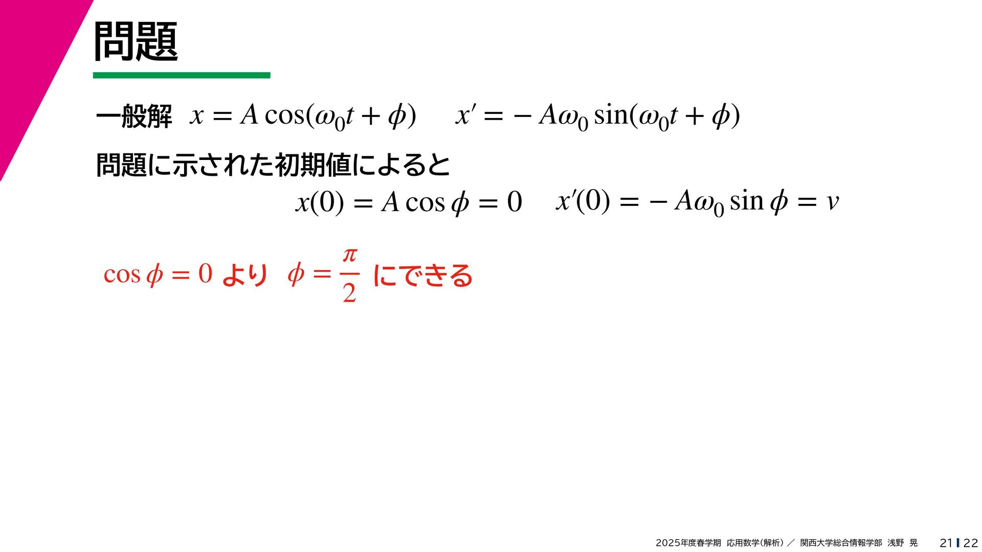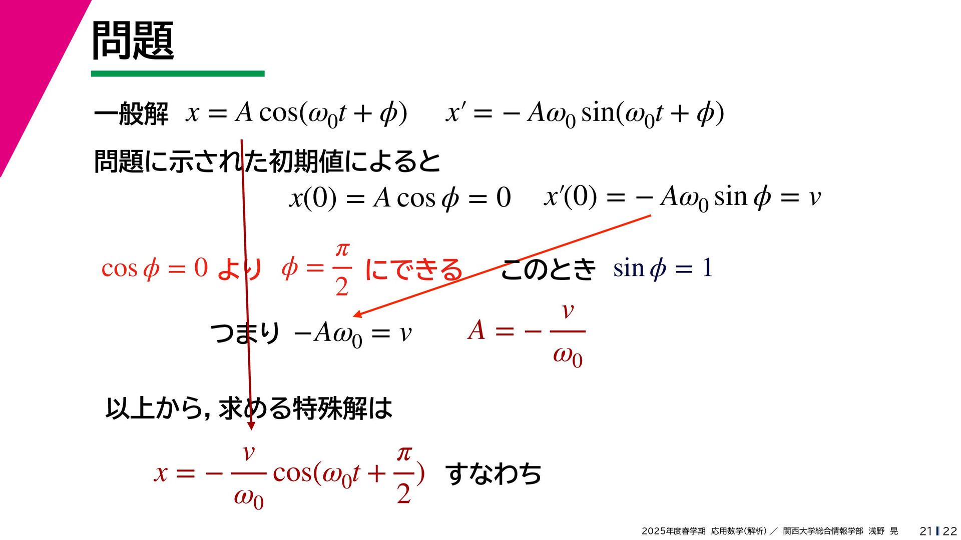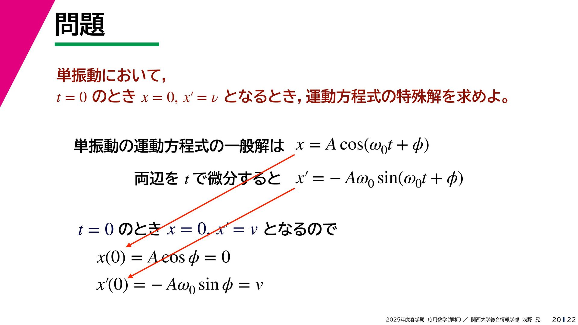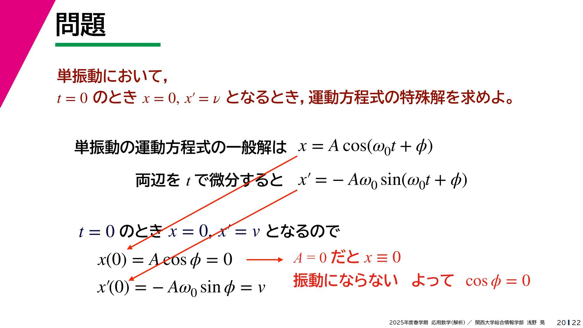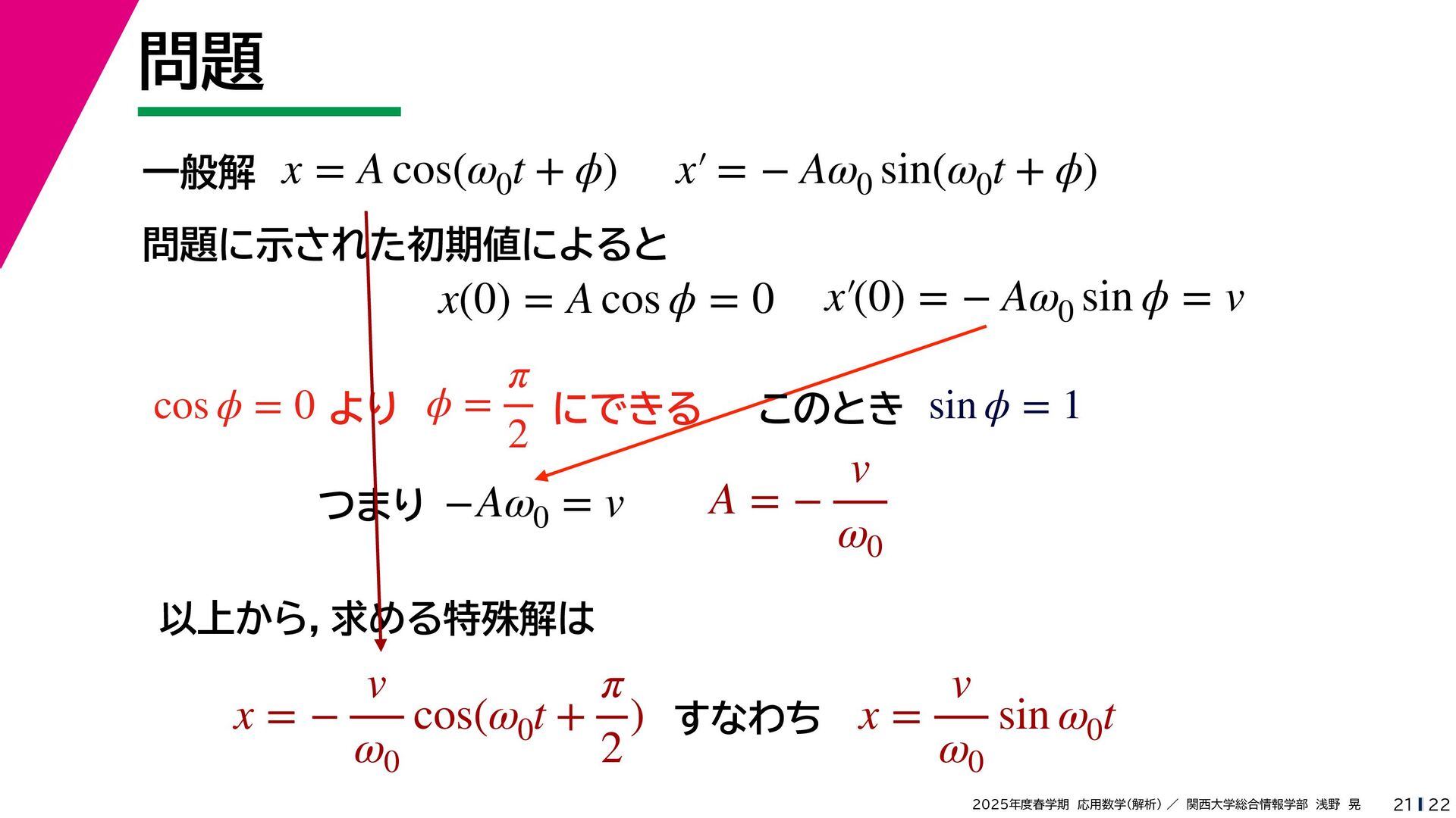 + ϕ) x′ = − Aω0 sin(ω0 t + ϕ) x(0) = A cos ϕ = 0 x′ (0) = − Aω0 sin ϕ = v 一般解 問題に示された初期値によると より cos ϕ = 0 ϕ = π 2 にできる sin ϕ = 1 このとき −Aω0 = v つまり A = − v ω0 以上から,求める特殊解は x = − v ω0 cos(ω0 t + π 2 ) すなわち x = v ω0 sin ω0 t
