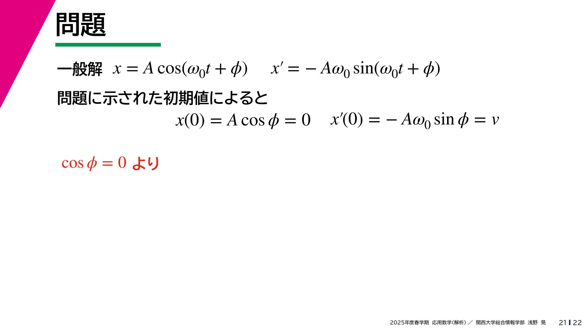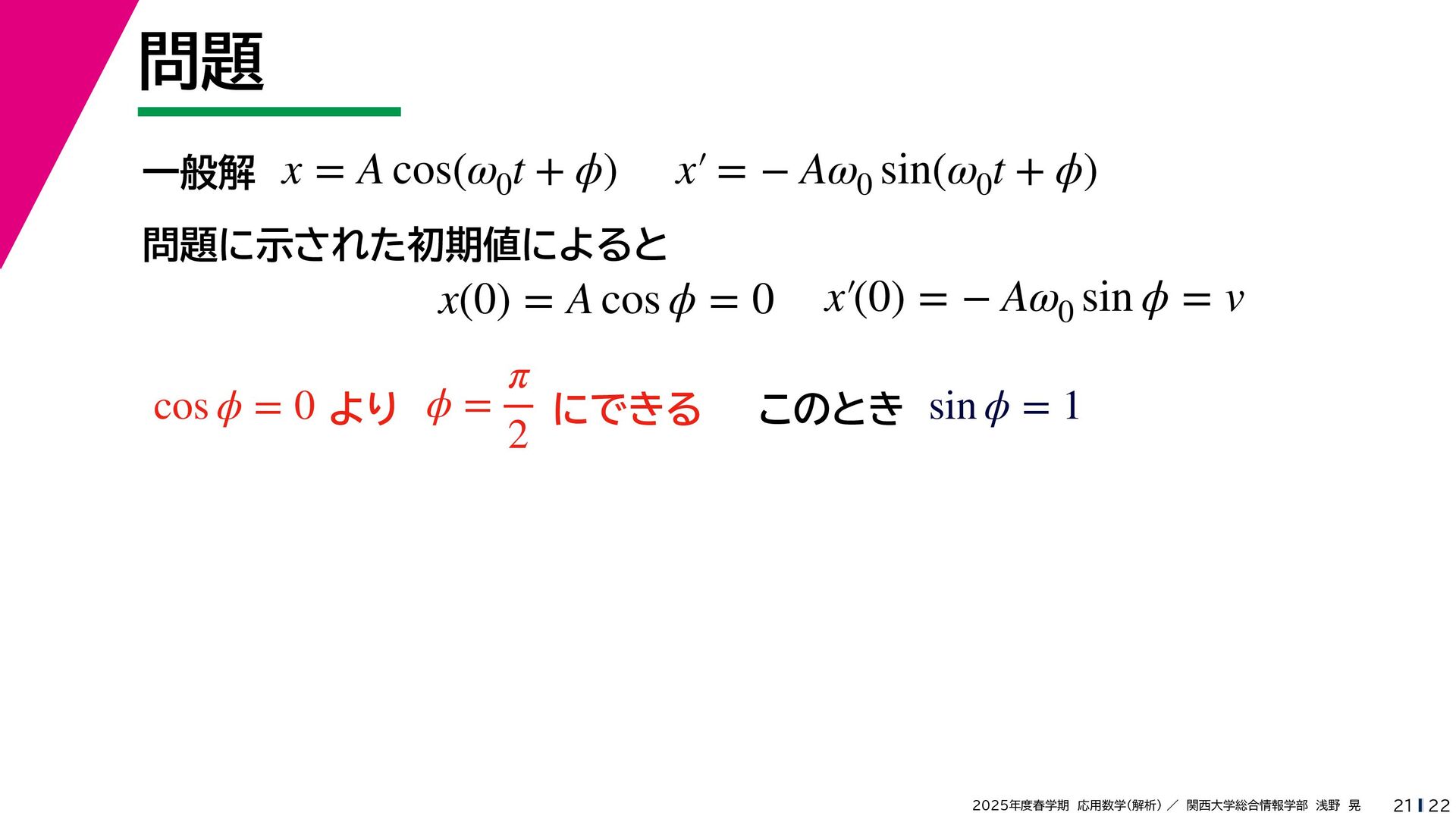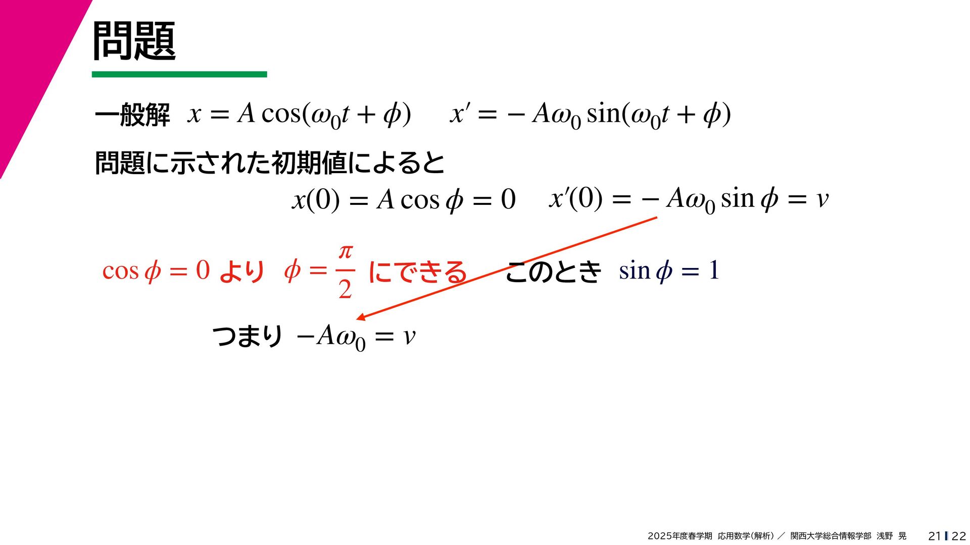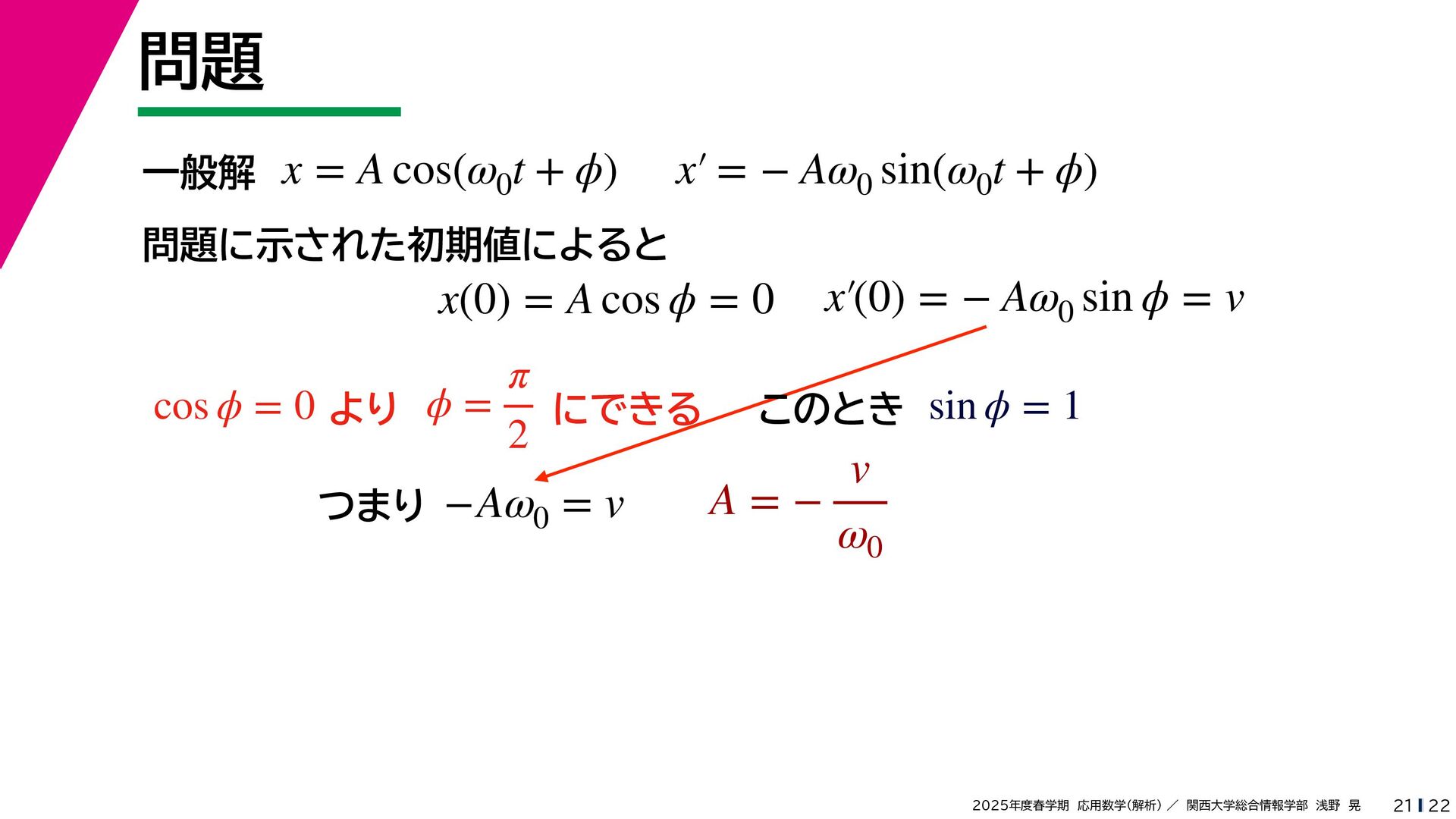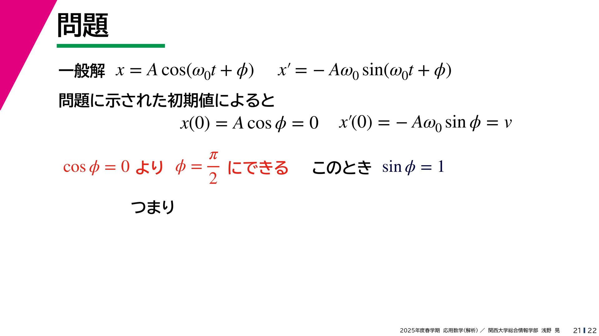 + ϕ) x′ = − Aω0 sin(ω0 t + ϕ) x(0) = A cos ϕ = 0 x′ (0) = − Aω0 sin ϕ = v 一般解 問題に示された初期値によると より cos ϕ = 0 ϕ = π 2 にできる sin ϕ = 1 このとき −Aω0 = v つまり A = − v ω0 以上から,求める特殊解は x = − v ω0 cos(ω0 t + π 2 ) すなわち x = v ω0 sin ω0 t