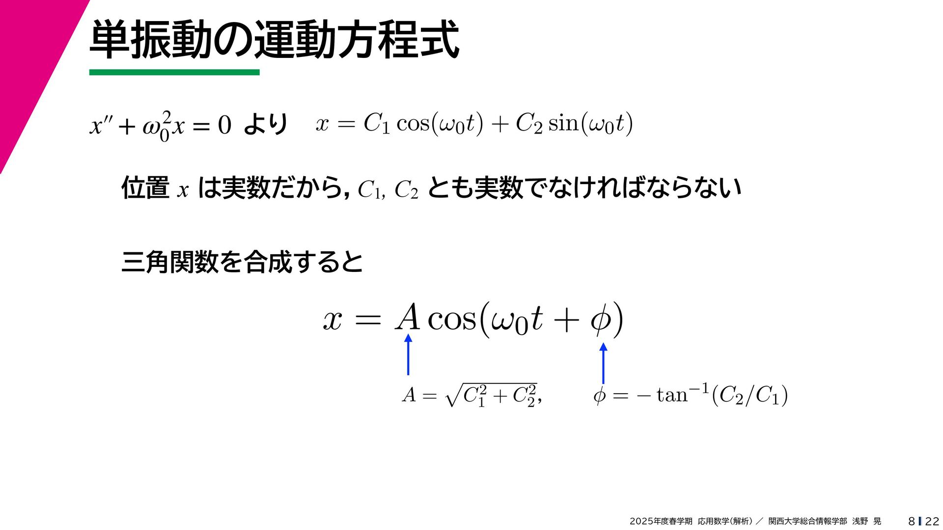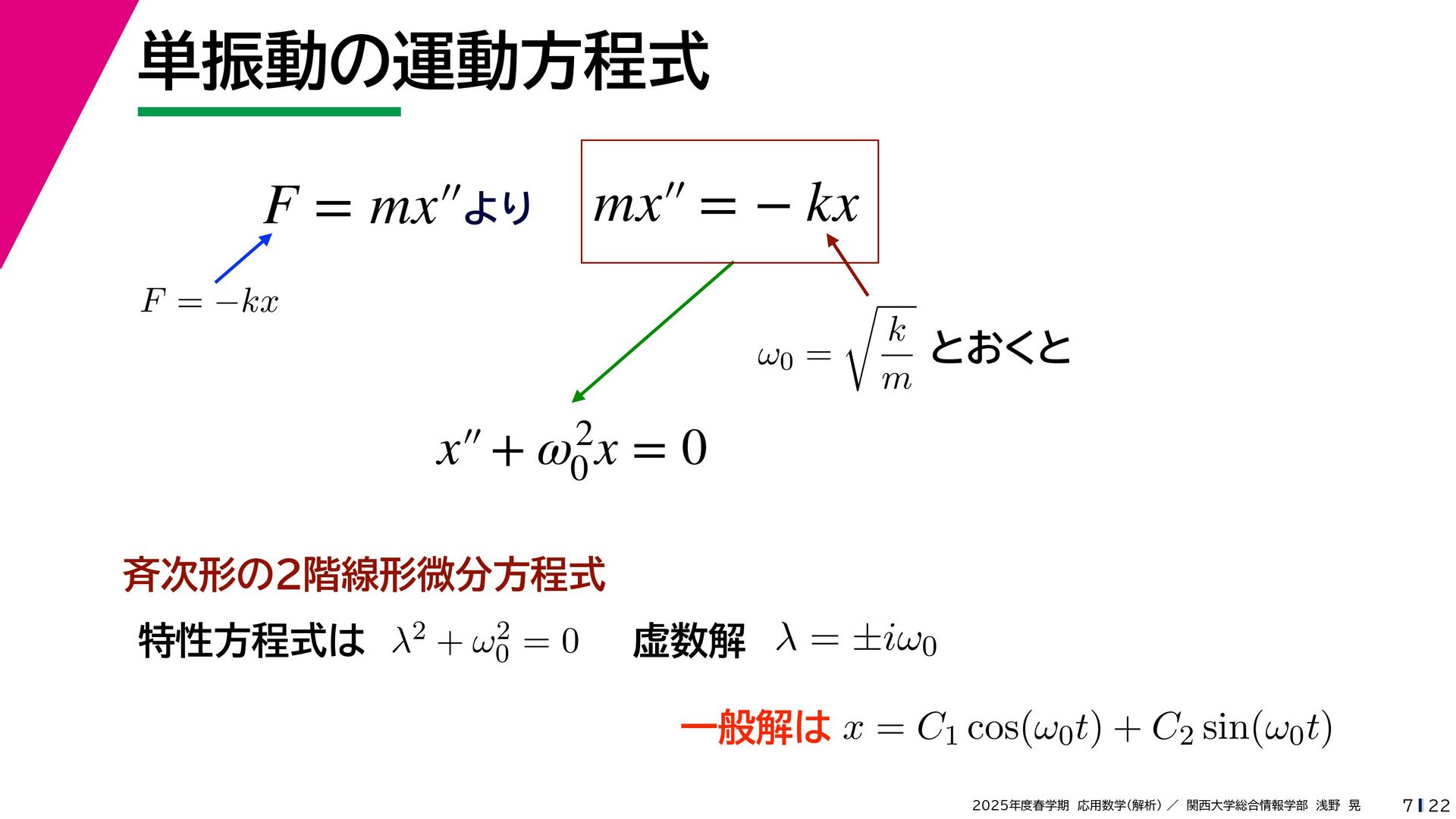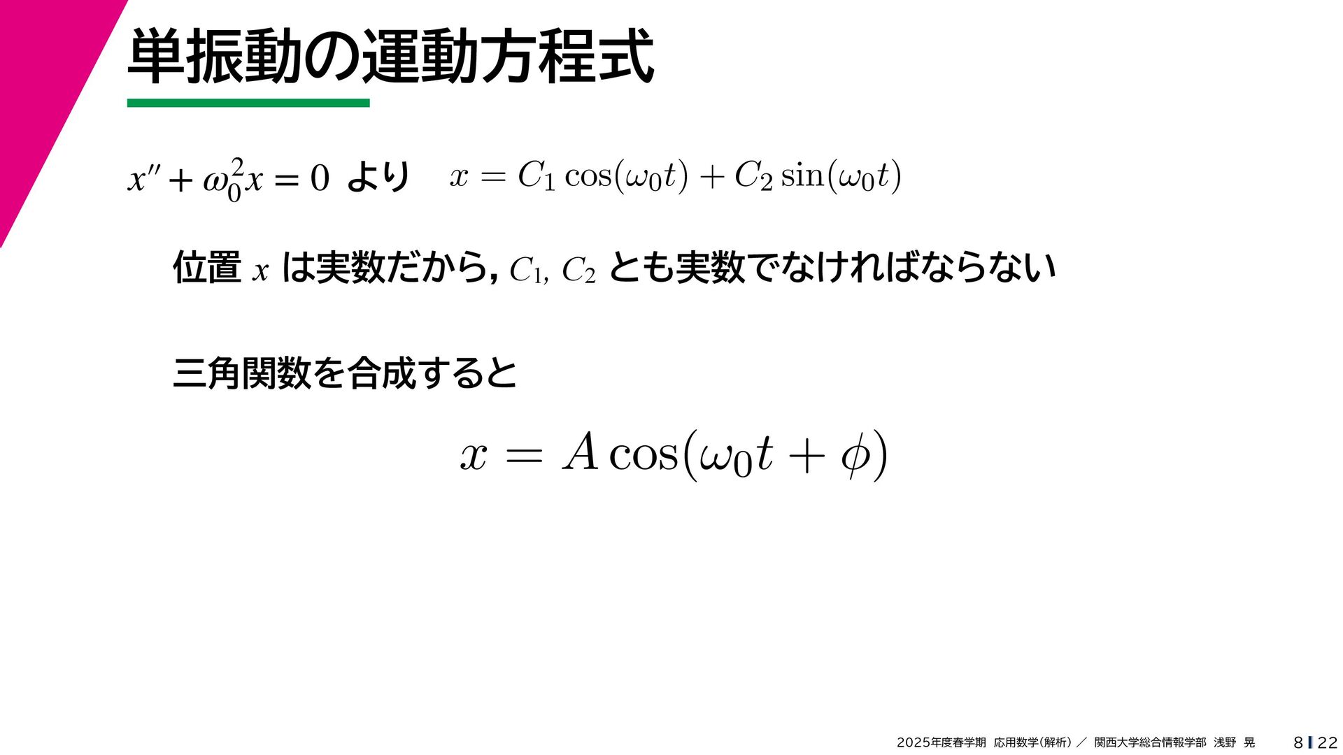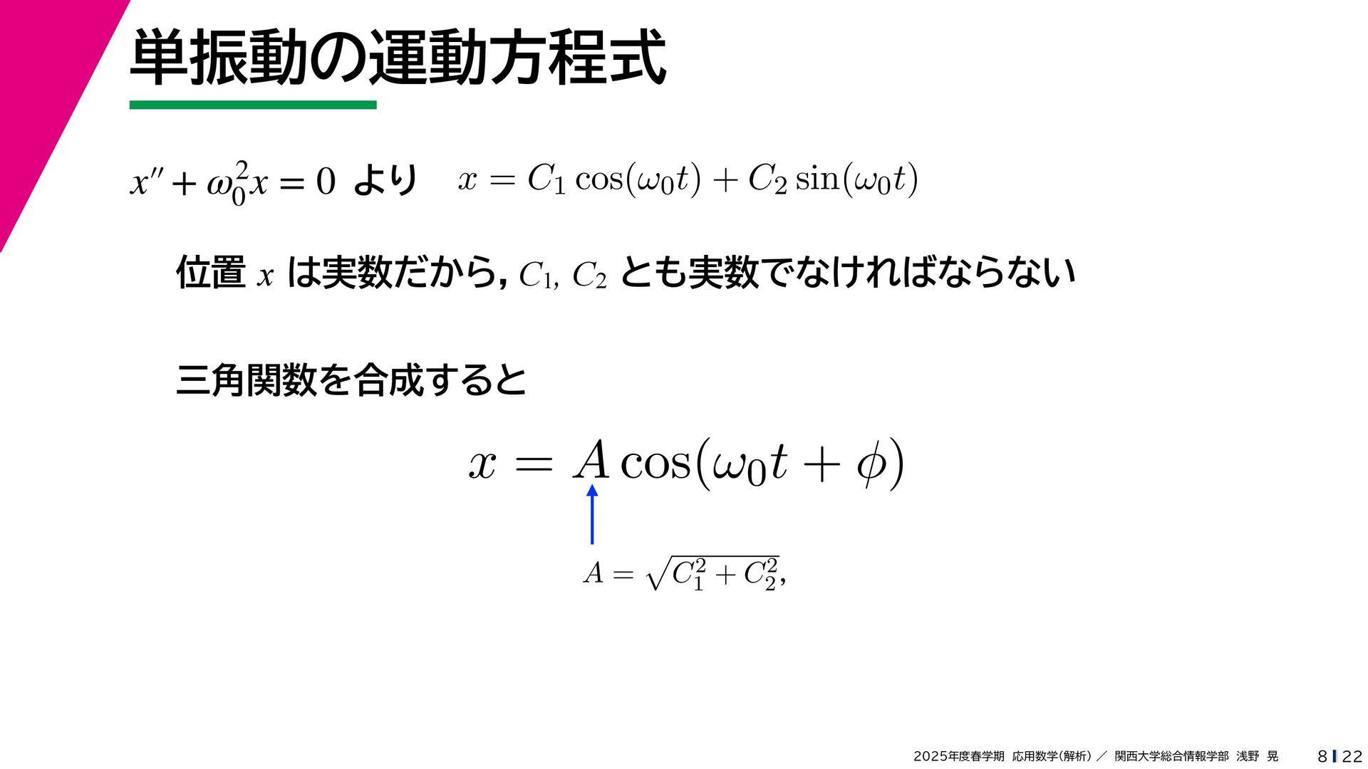 + ϕ) x′ = − Aω0 sin(ω0 t + ϕ) x(0) = A cos ϕ = 0 x′ (0) = − Aω0 sin ϕ = v 一般解 問題に示された初期値によると より cos ϕ = 0 ϕ = π 2 にできる sin ϕ = 1 このとき −Aω0 = v つまり A = − v ω0 以上から,求める特殊解は x = − v ω0 cos(ω0 t + π 2 ) すなわち x = v ω0 sin ω0 t