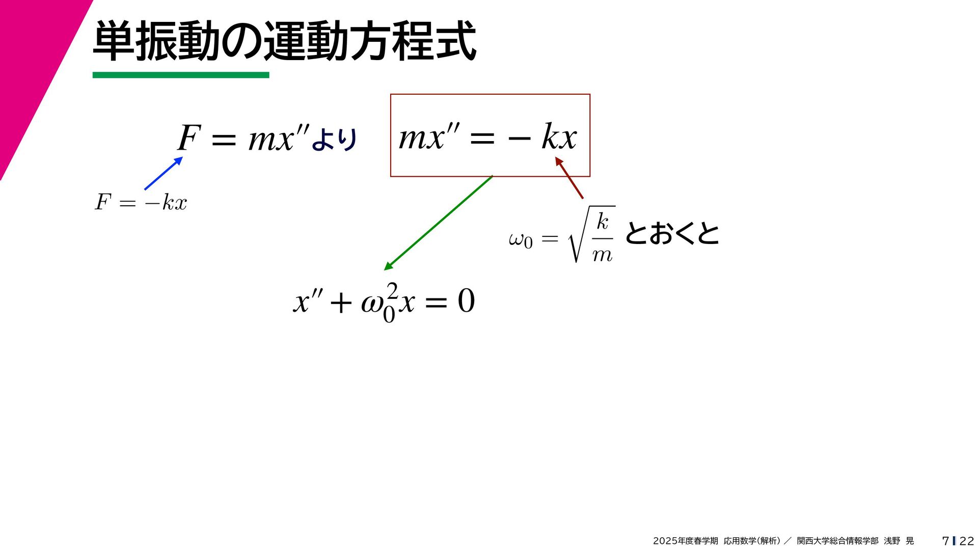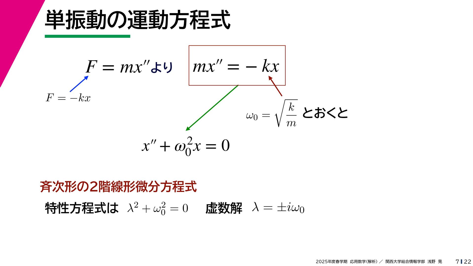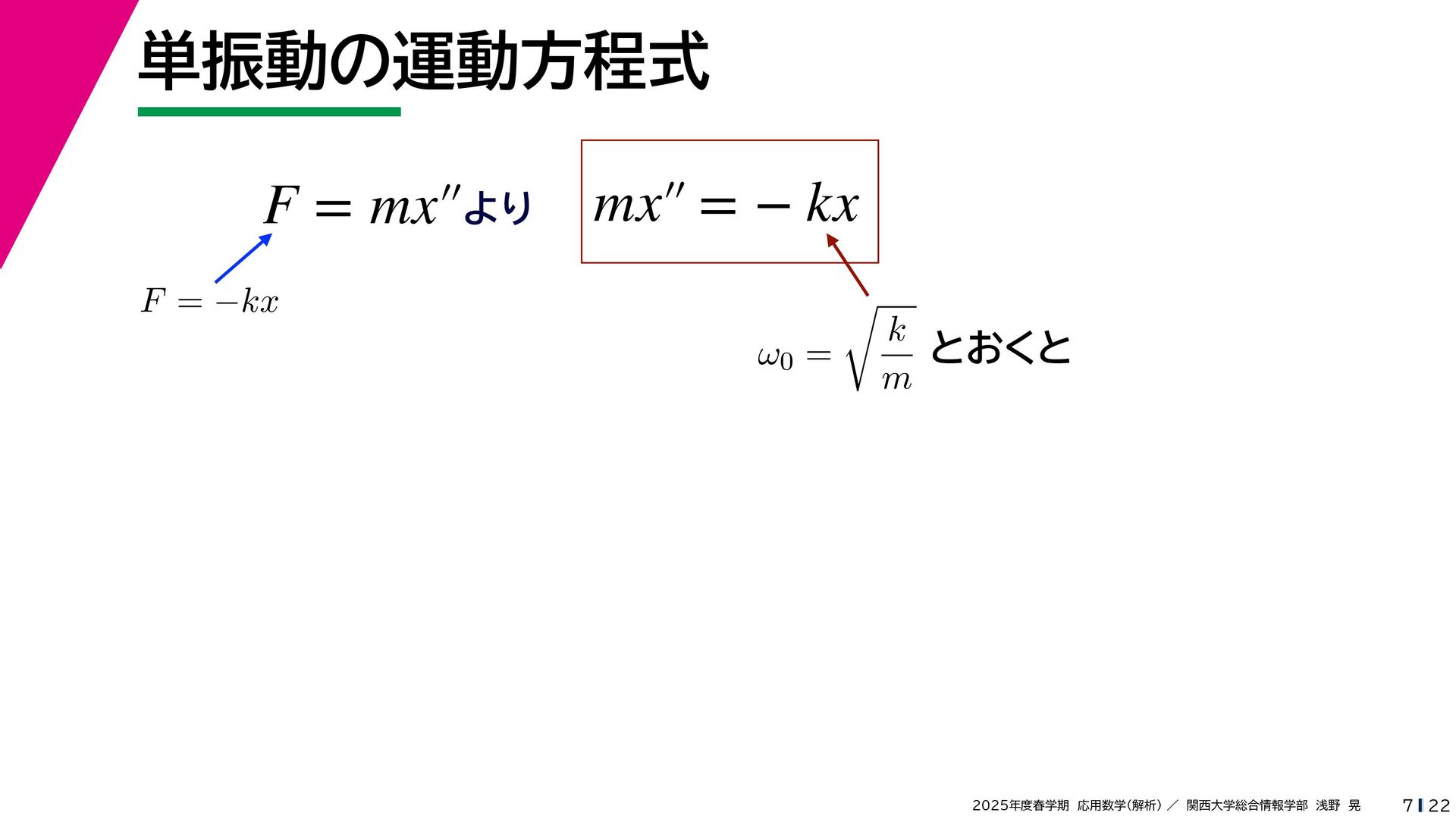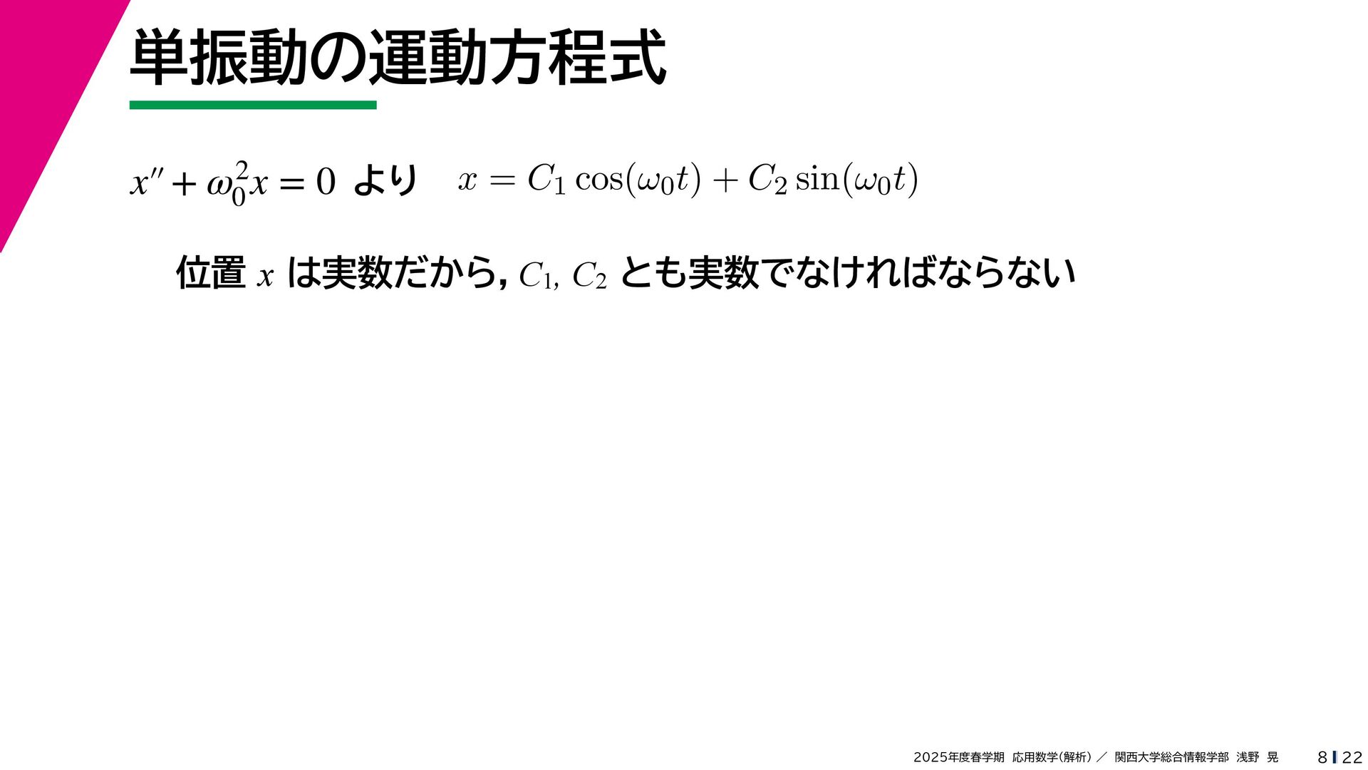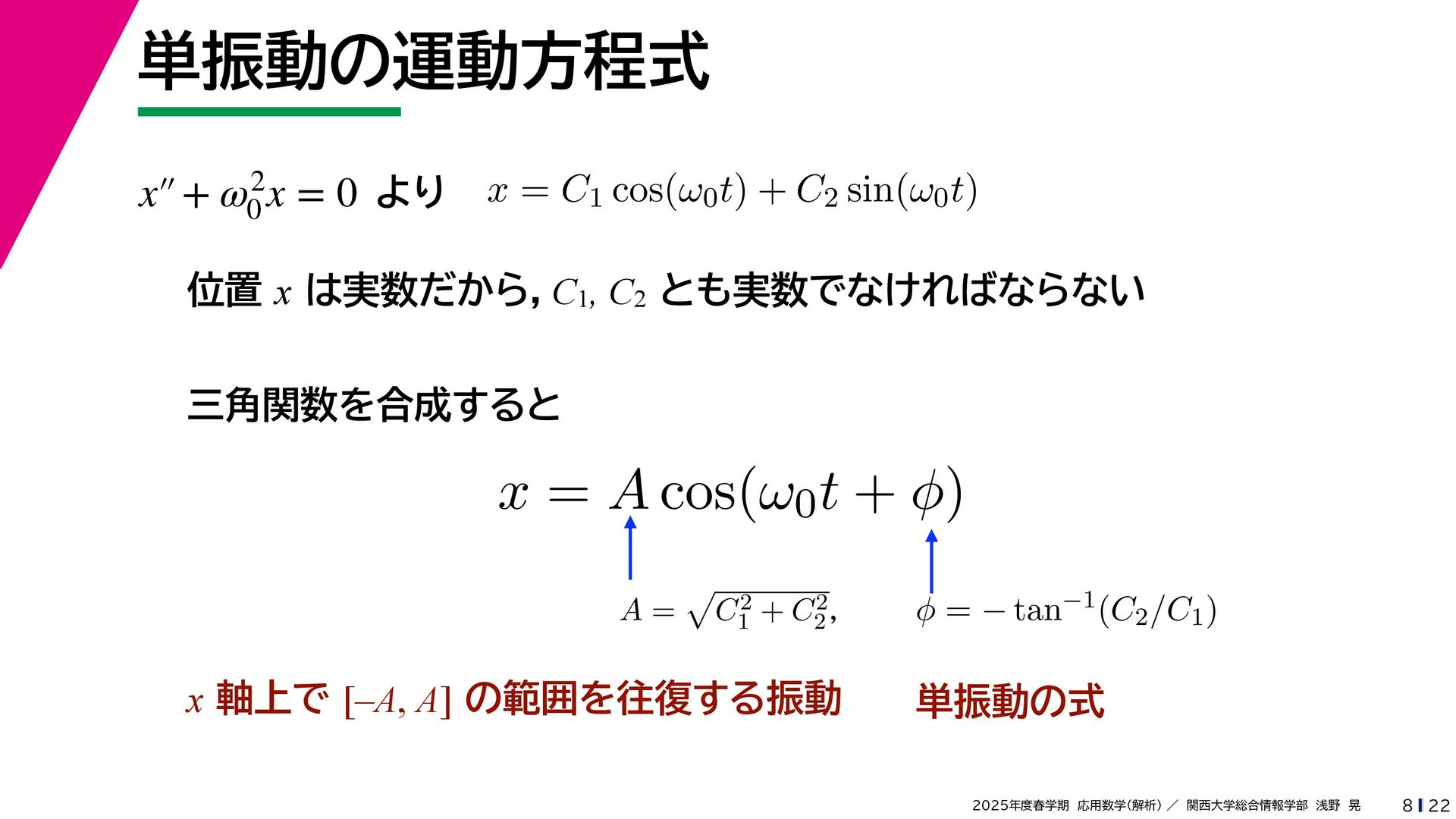 + ϕ) x′ = − Aω0 sin(ω0 t + ϕ) x(0) = A cos ϕ = 0 x′ (0) = − Aω0 sin ϕ = v 一般解 問題に示された初期値によると より cos ϕ = 0 ϕ = π 2 にできる sin ϕ = 1 このとき −Aω0 = v つまり A = − v ω0 以上から,求める特殊解は x = − v ω0 cos(ω0 t + π 2 ) すなわち x = v ω0 sin ω0 t