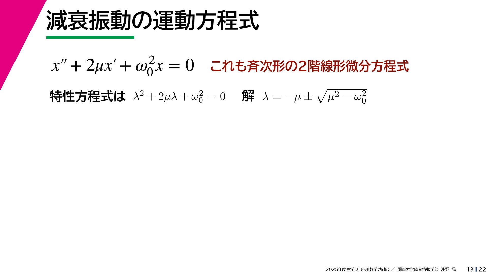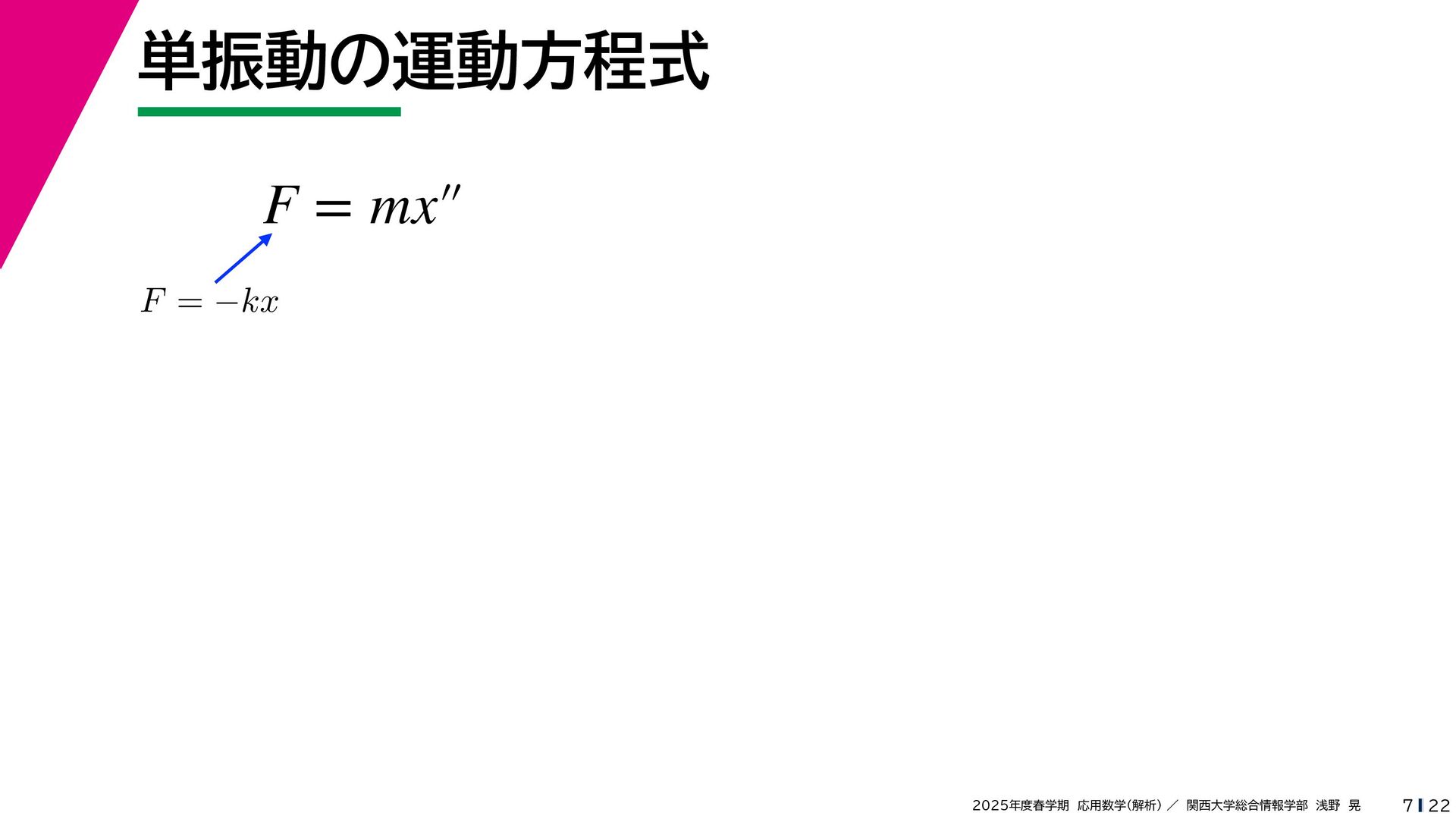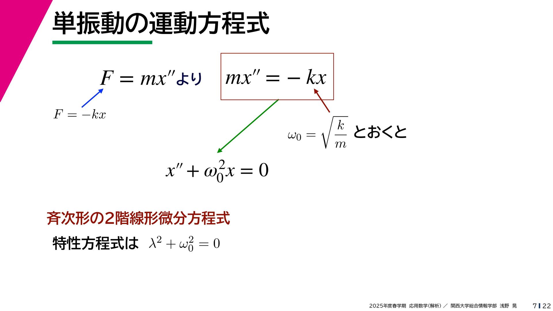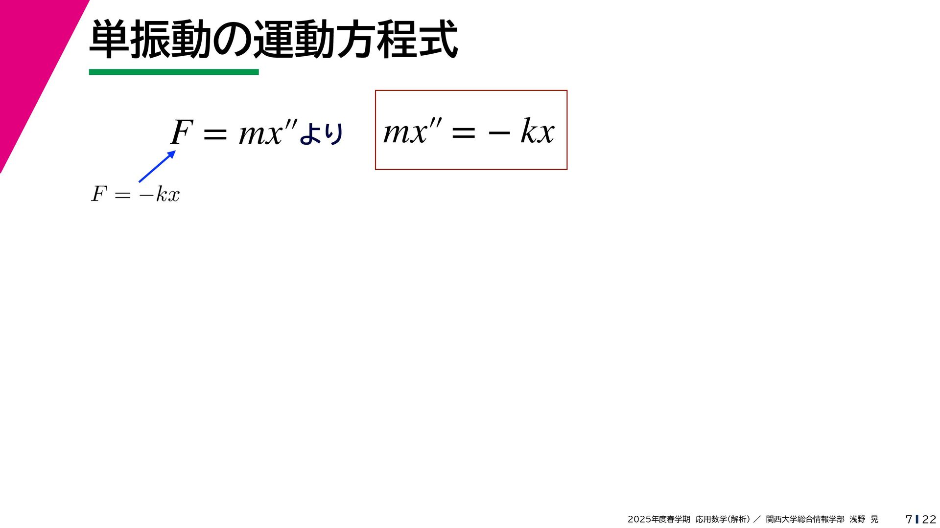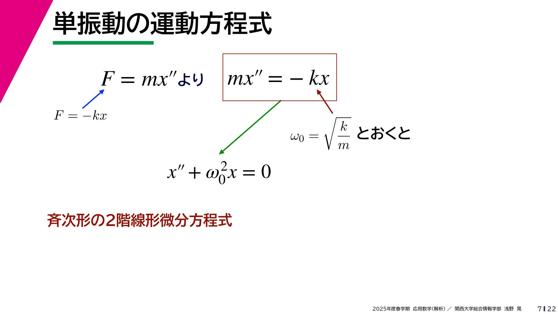 + ϕ) x′ = − Aω0 sin(ω0 t + ϕ) x(0) = A cos ϕ = 0 x′ (0) = − Aω0 sin ϕ = v 一般解 問題に示された初期値によると より cos ϕ = 0 ϕ = π 2 にできる sin ϕ = 1 このとき −Aω0 = v つまり A = − v ω0 以上から,求める特殊解は x = − v ω0 cos(ω0 t + π 2 ) すなわち x = v ω0 sin ω0 t