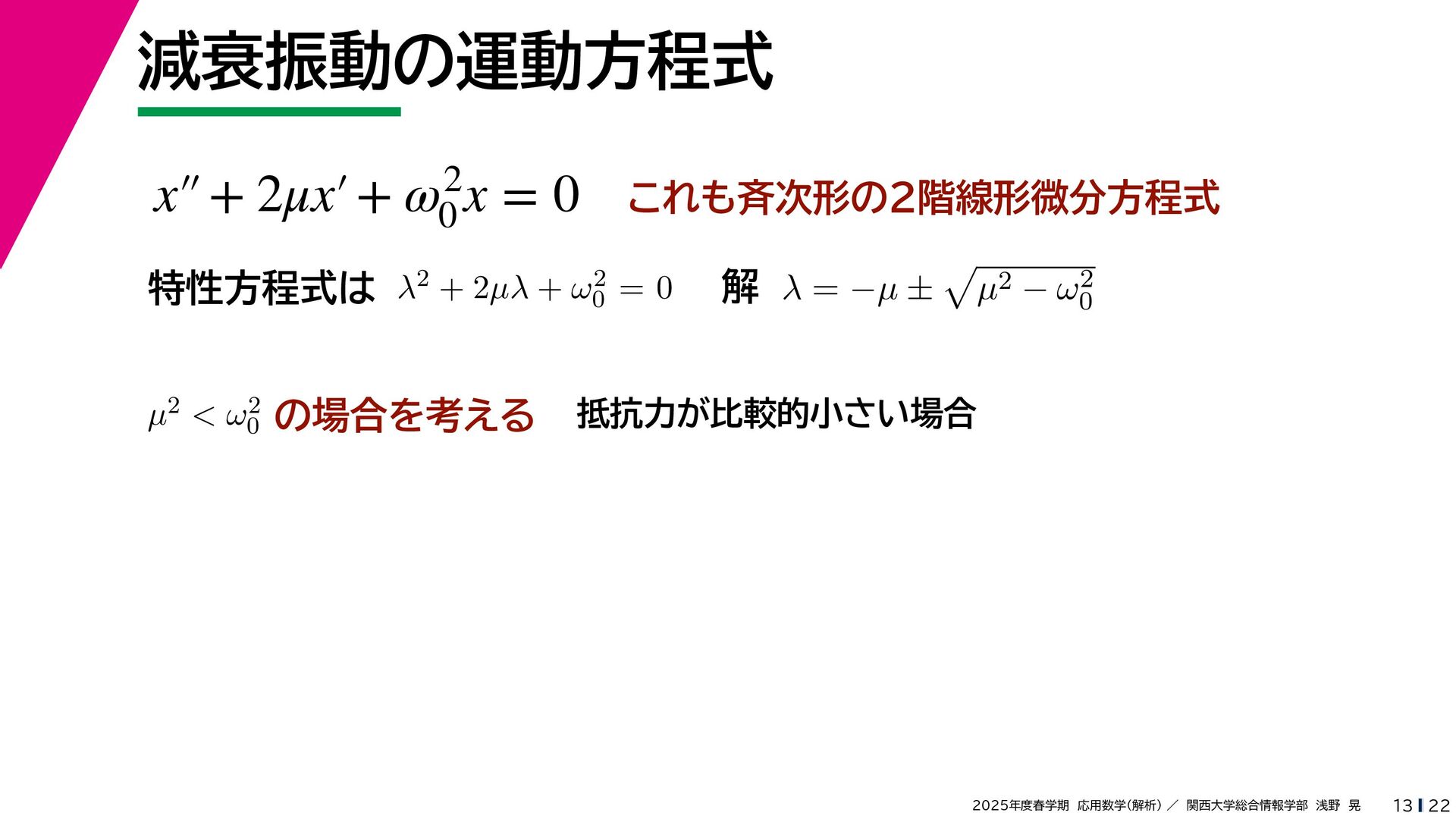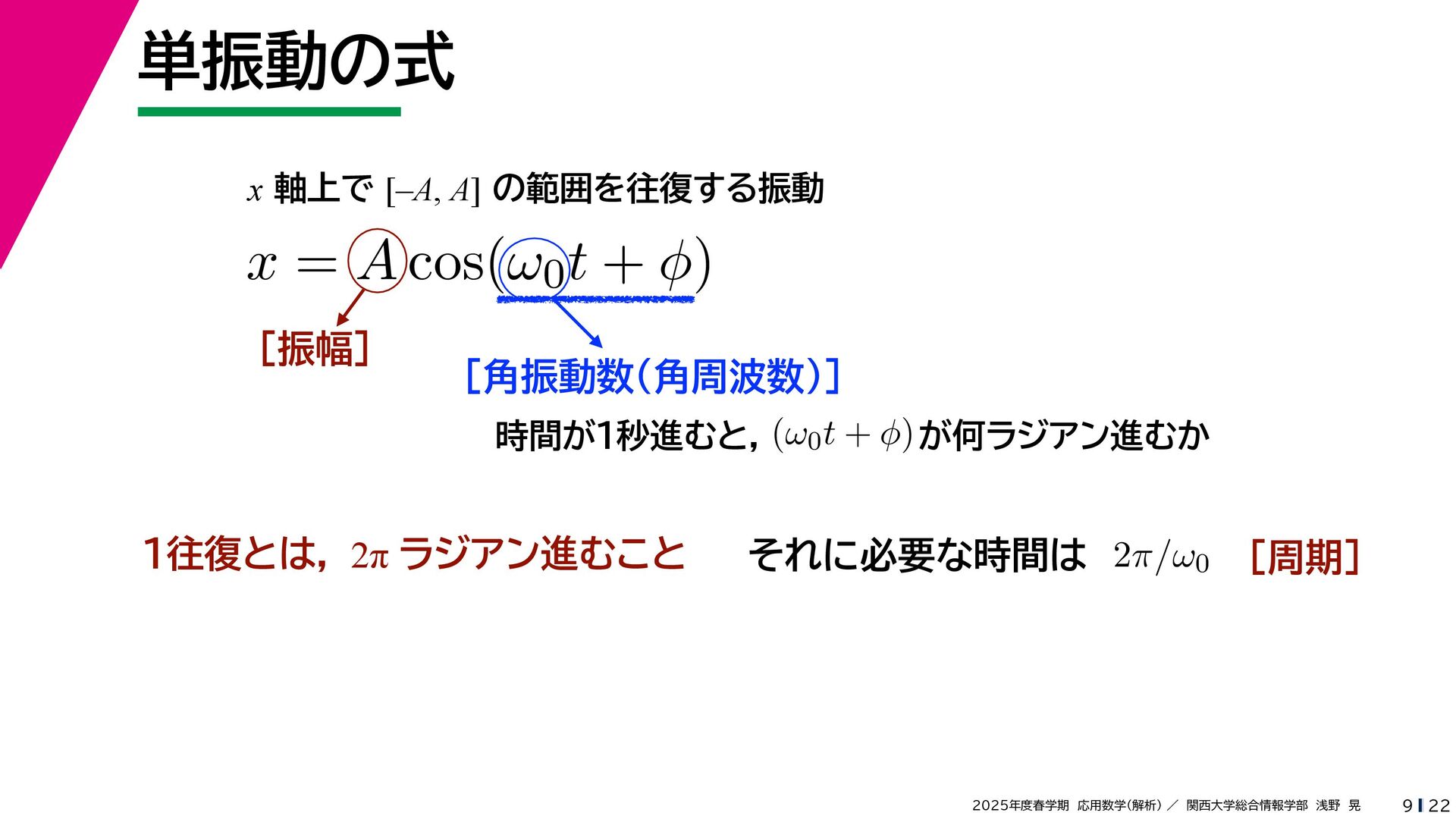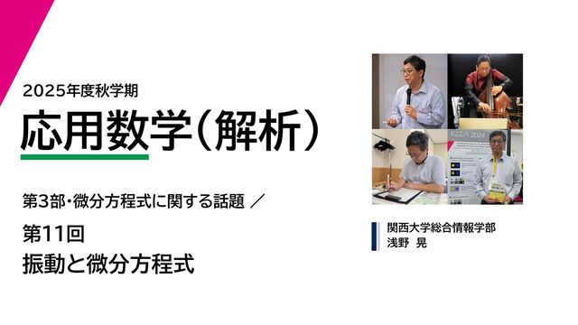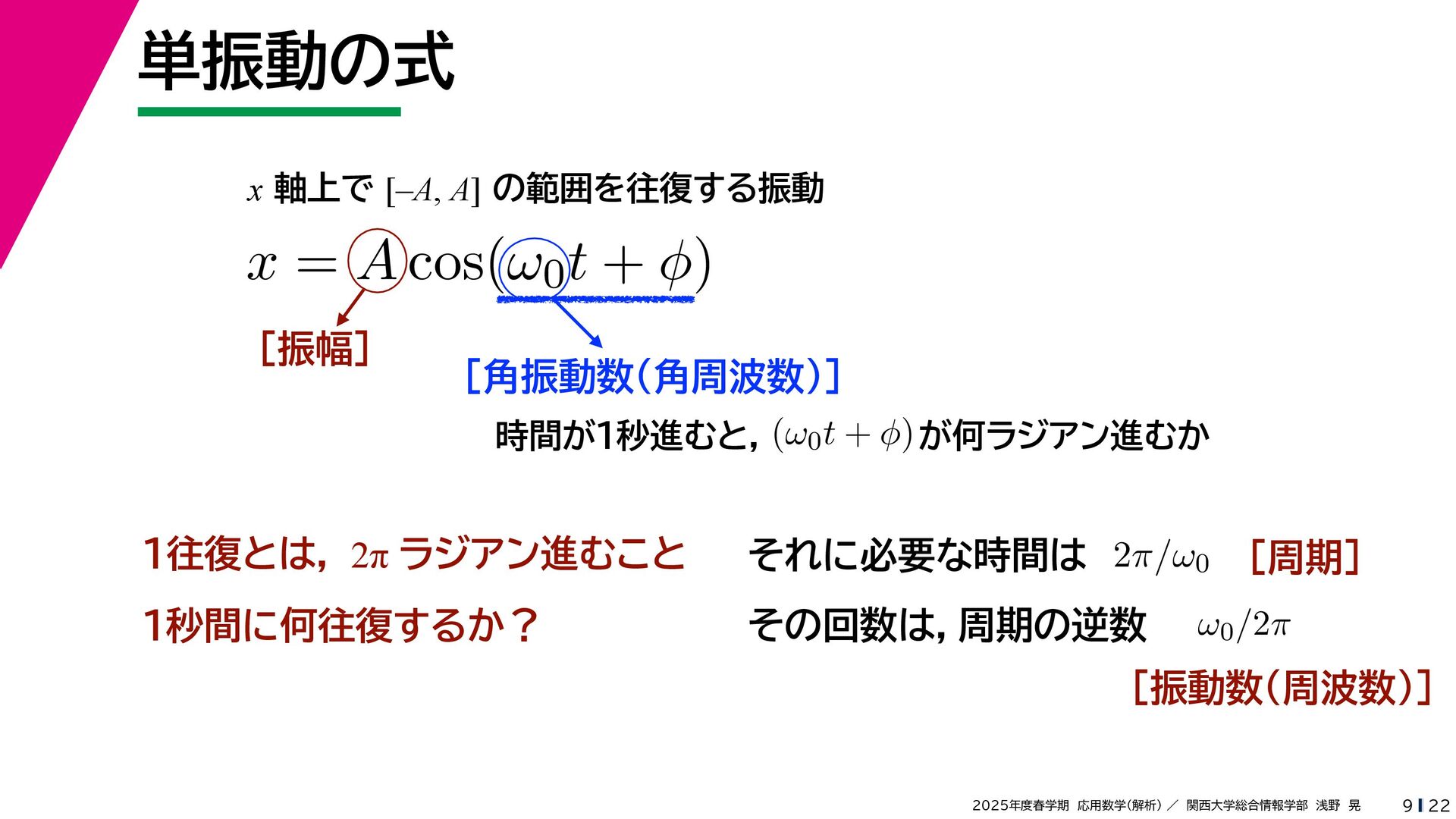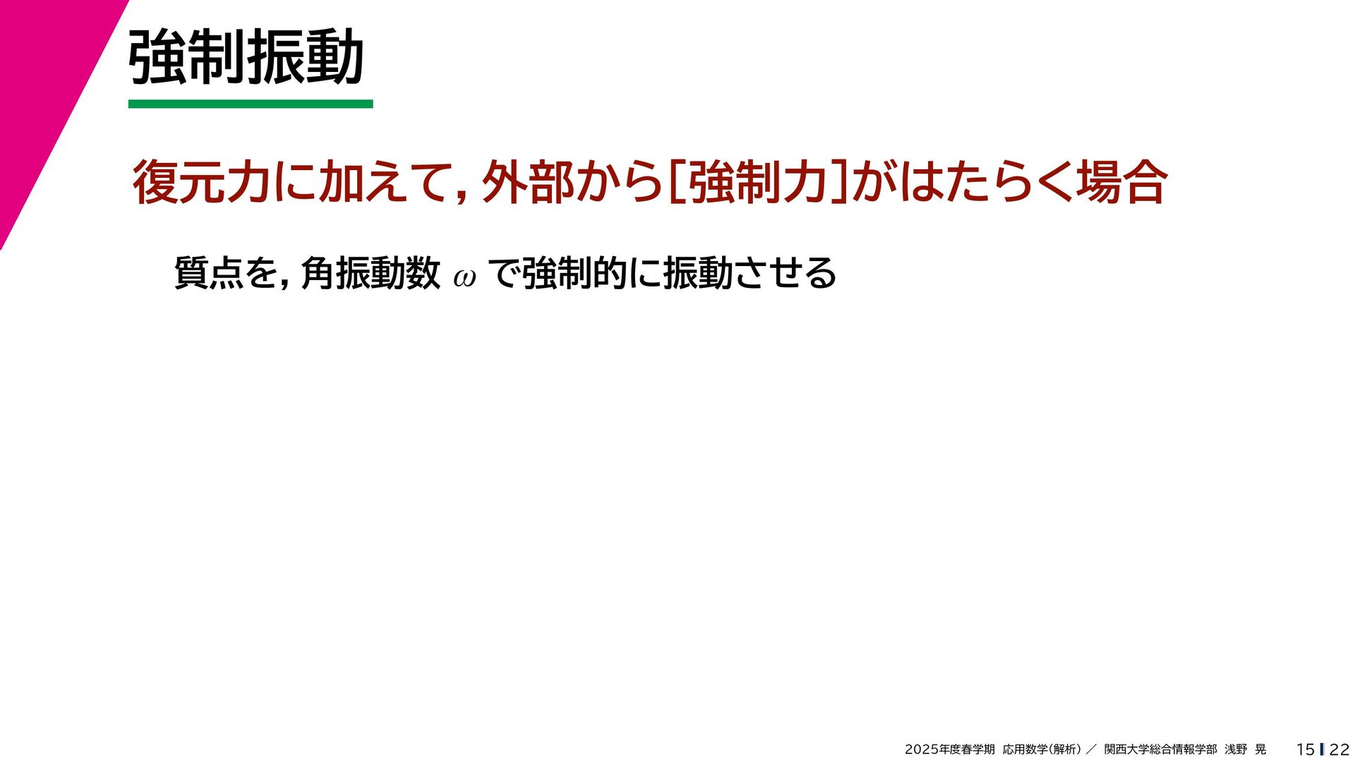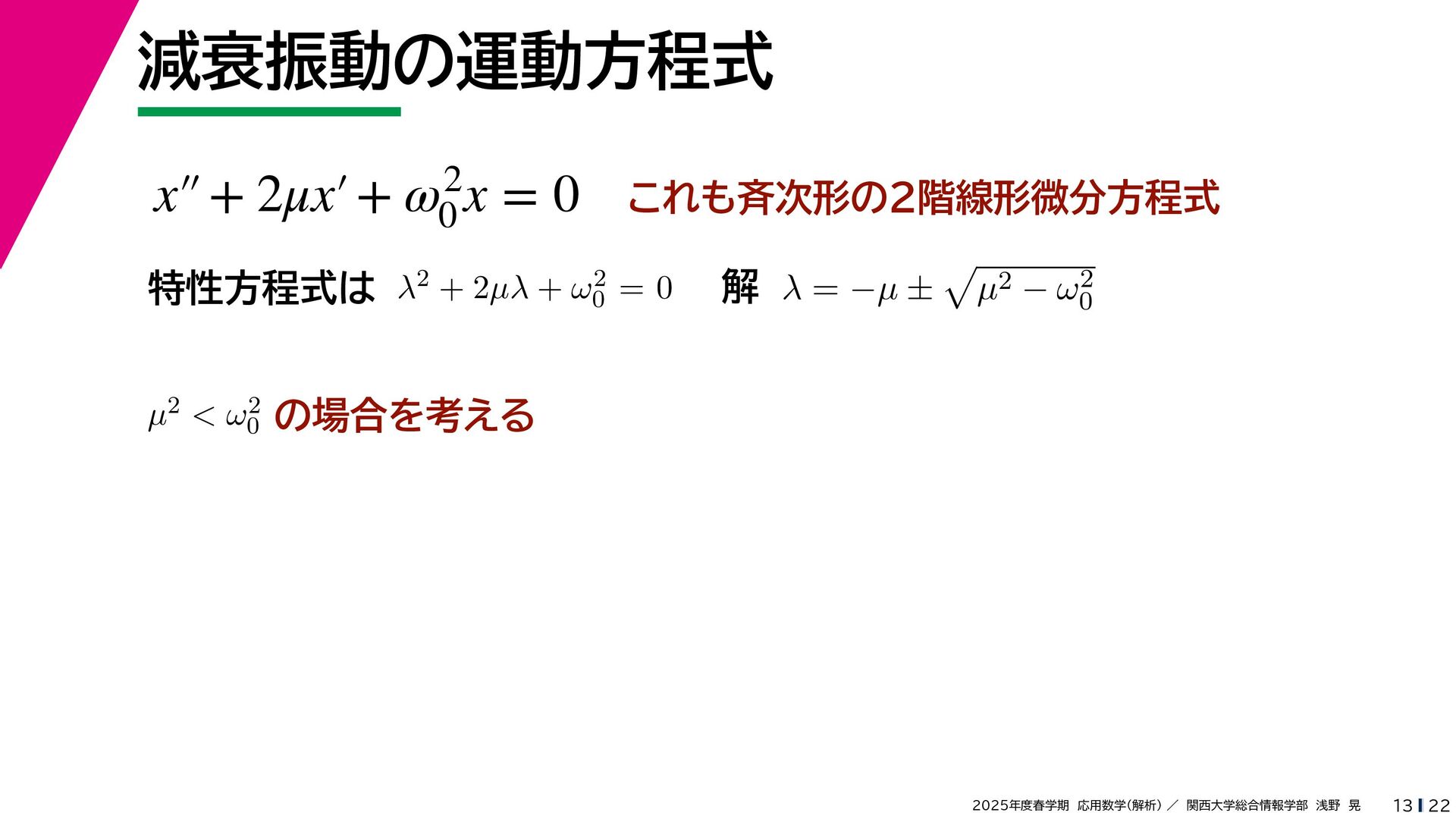 + ϕ) x′ = − Aω0 sin(ω0 t + ϕ) x(0) = A cos ϕ = 0 x′ (0) = − Aω0 sin ϕ = v 一般解 問題に示された初期値によると より cos ϕ = 0 ϕ = π 2 にできる sin ϕ = 1 このとき −Aω0 = v つまり A = − v ω0 以上から,求める特殊解は x = − v ω0 cos(ω0 t + π 2 ) すなわち x = v ω0 sin ω0 t