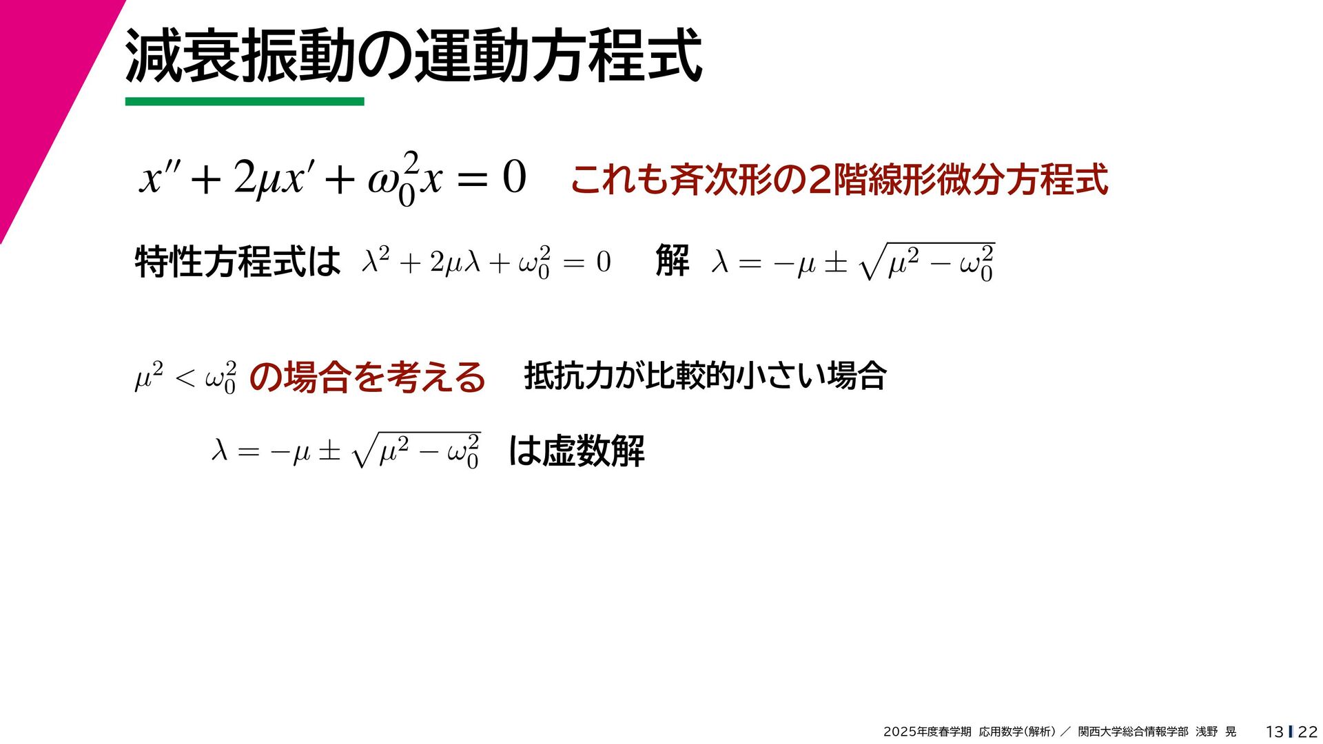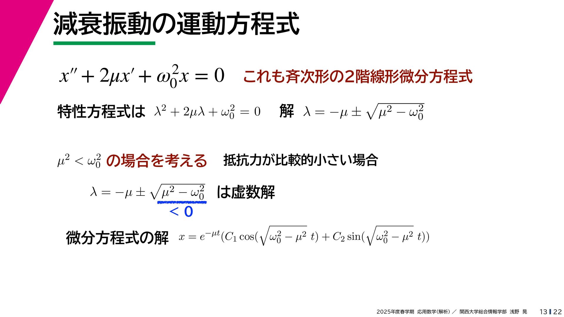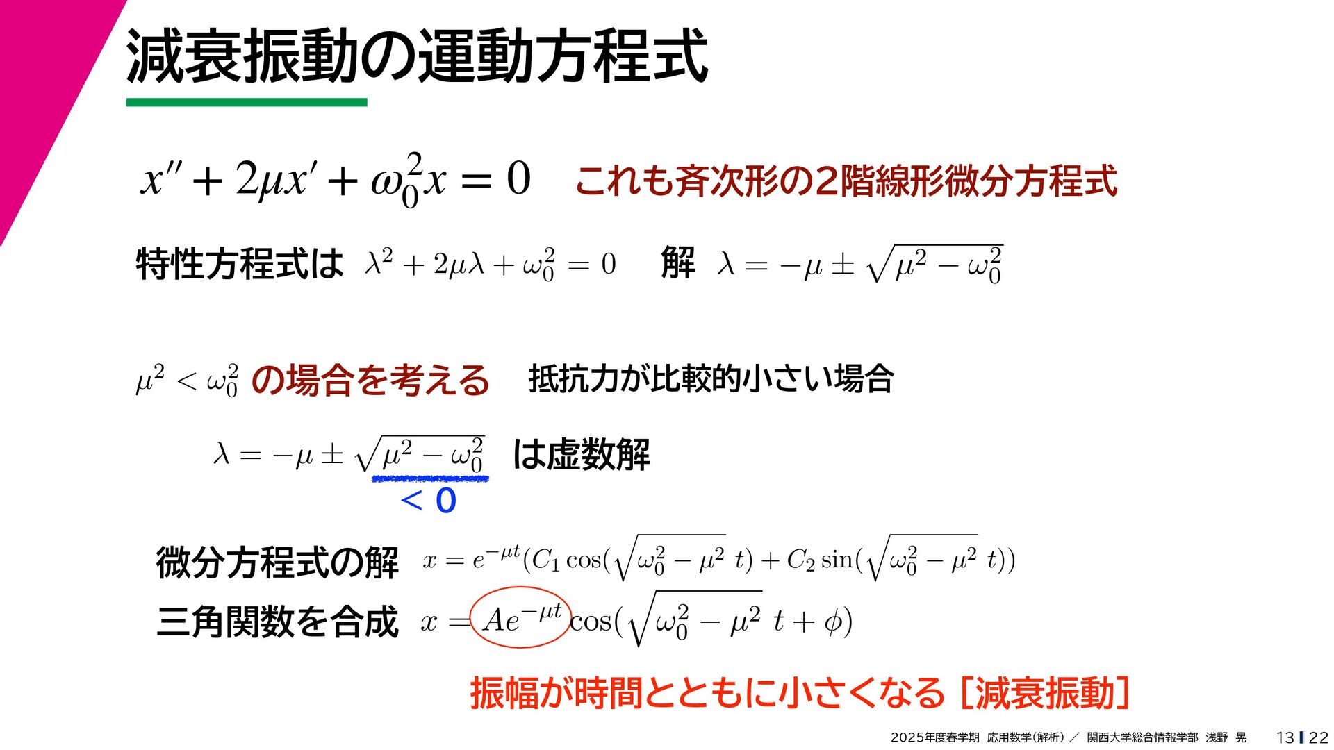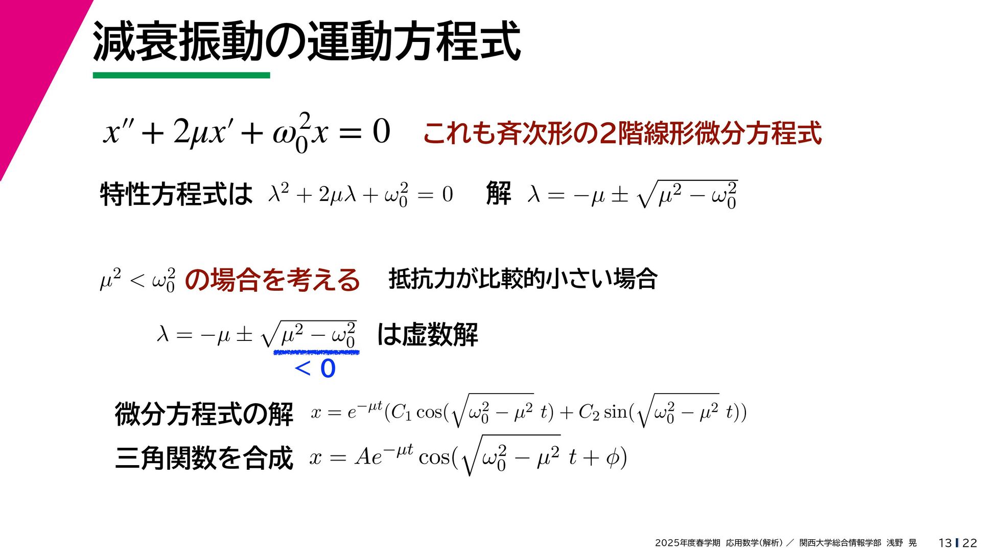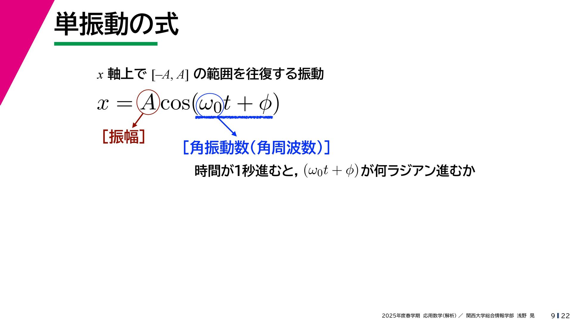 + ϕ) x′ = − Aω0 sin(ω0 t + ϕ) x(0) = A cos ϕ = 0 x′ (0) = − Aω0 sin ϕ = v 一般解 問題に示された初期値によると より cos ϕ = 0 ϕ = π 2 にできる sin ϕ = 1 このとき −Aω0 = v つまり A = − v ω0 以上から,求める特殊解は x = − v ω0 cos(ω0 t + π 2 ) すなわち x = v ω0 sin ω0 t