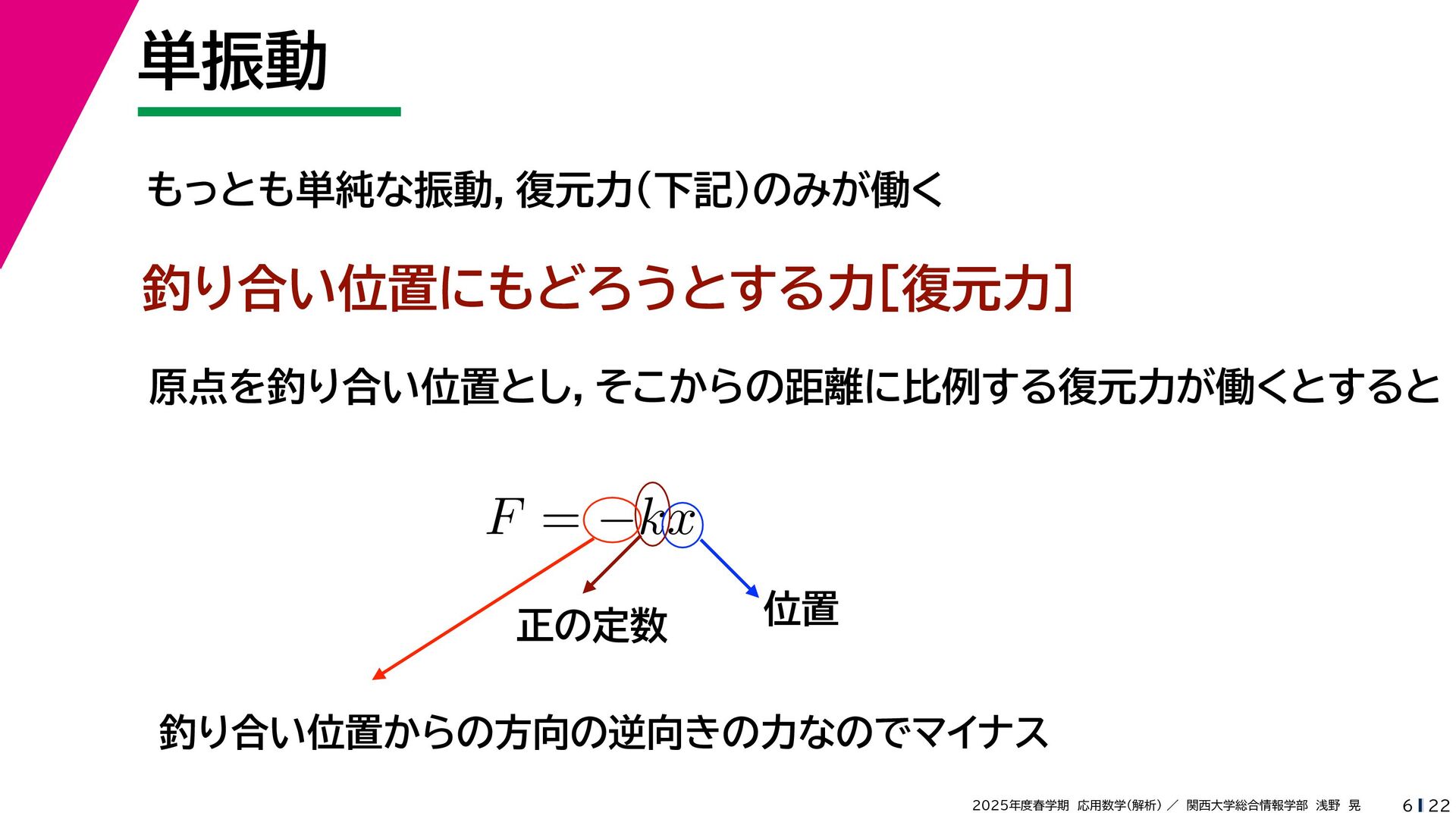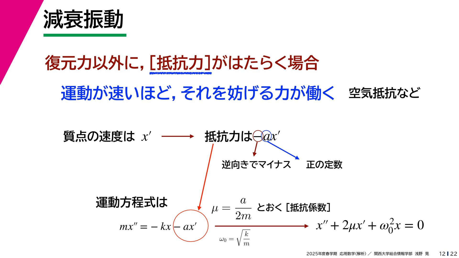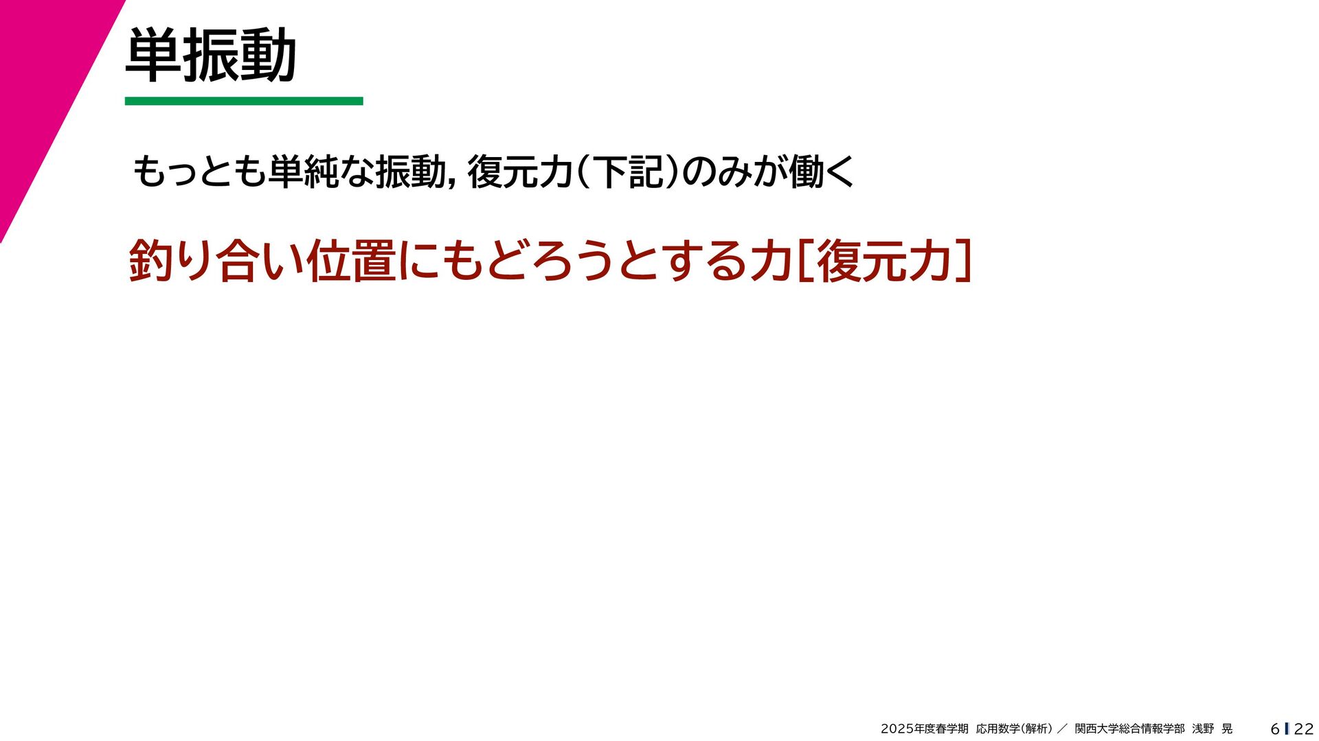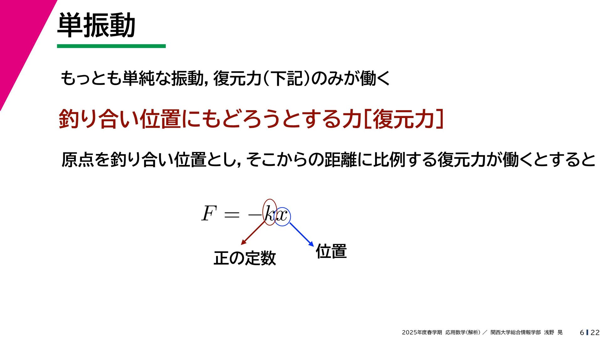 + ϕ) x′ = − Aω0 sin(ω0 t + ϕ) x(0) = A cos ϕ = 0 x′ (0) = − Aω0 sin ϕ = v 一般解 問題に示された初期値によると より cos ϕ = 0 ϕ = π 2 にできる sin ϕ = 1 このとき −Aω0 = v つまり A = − v ω0 以上から,求める特殊解は x = − v ω0 cos(ω0 t + π 2 ) すなわち x = v ω0 sin ω0 t