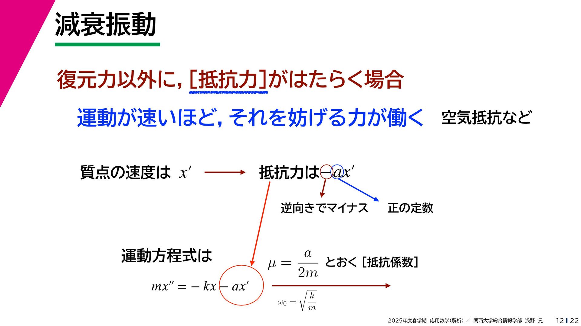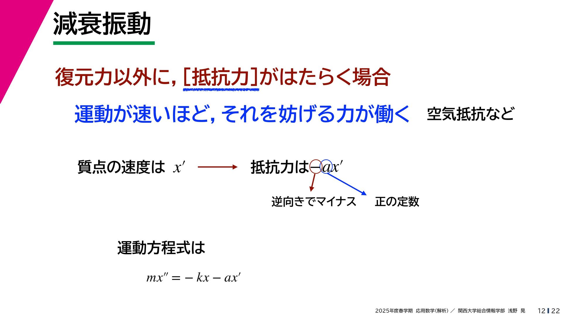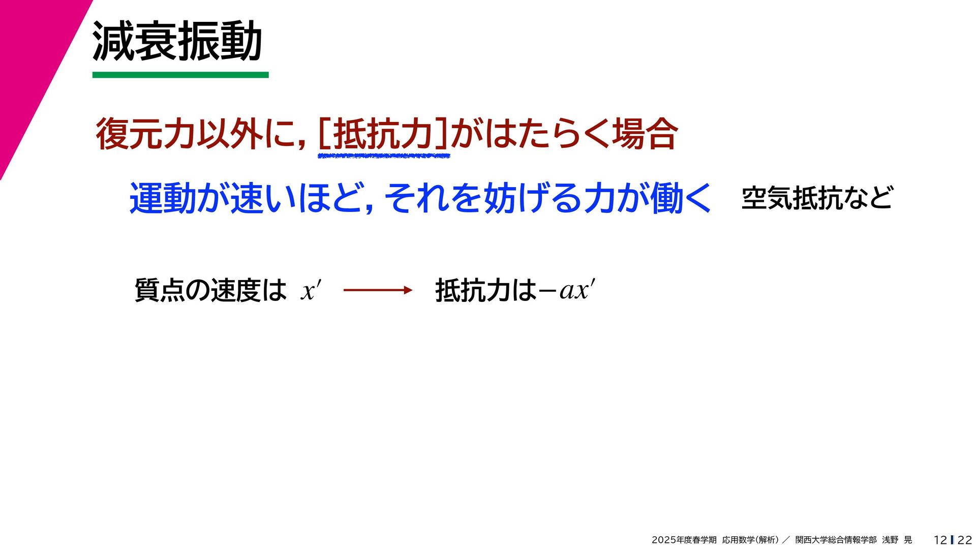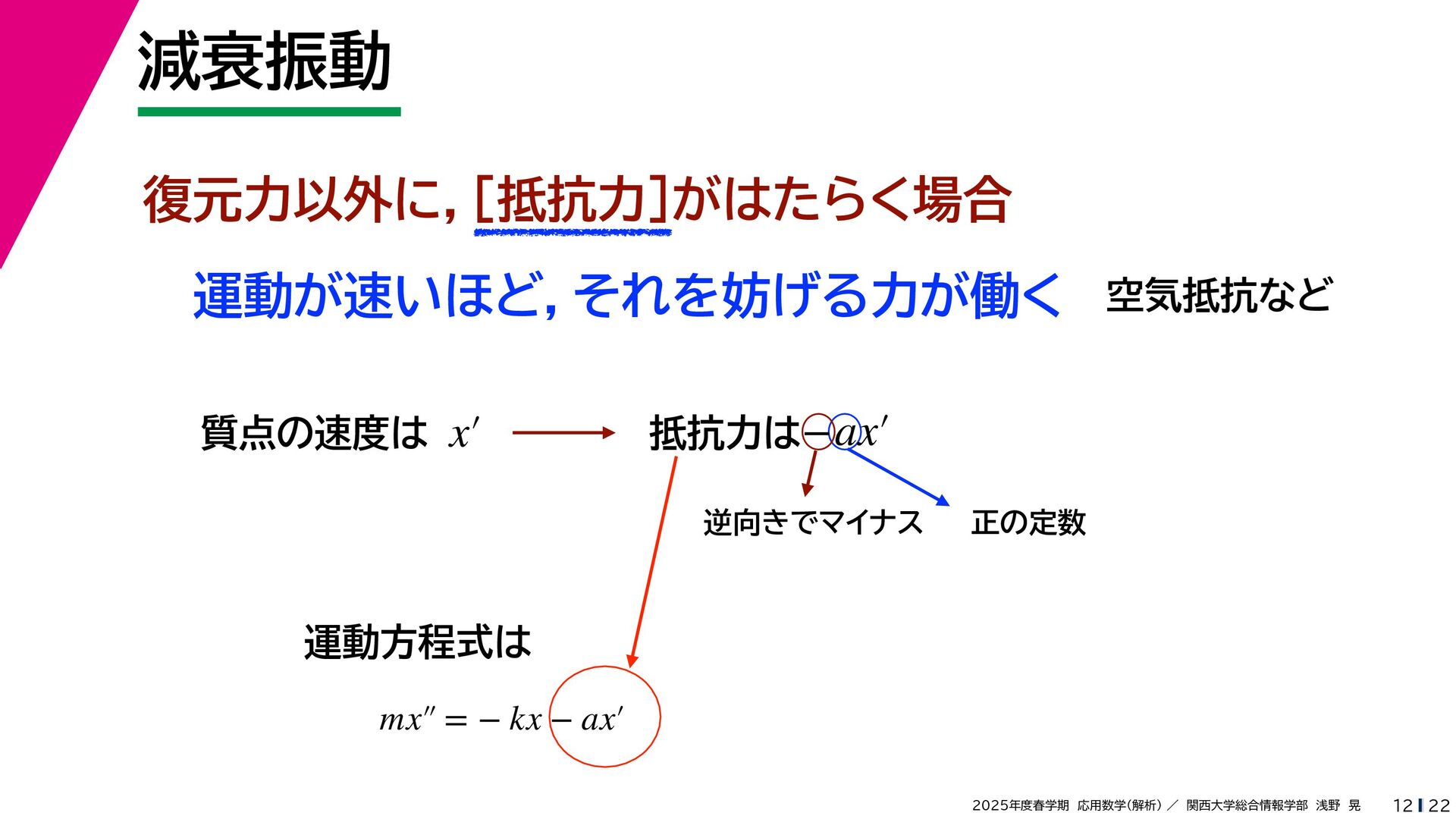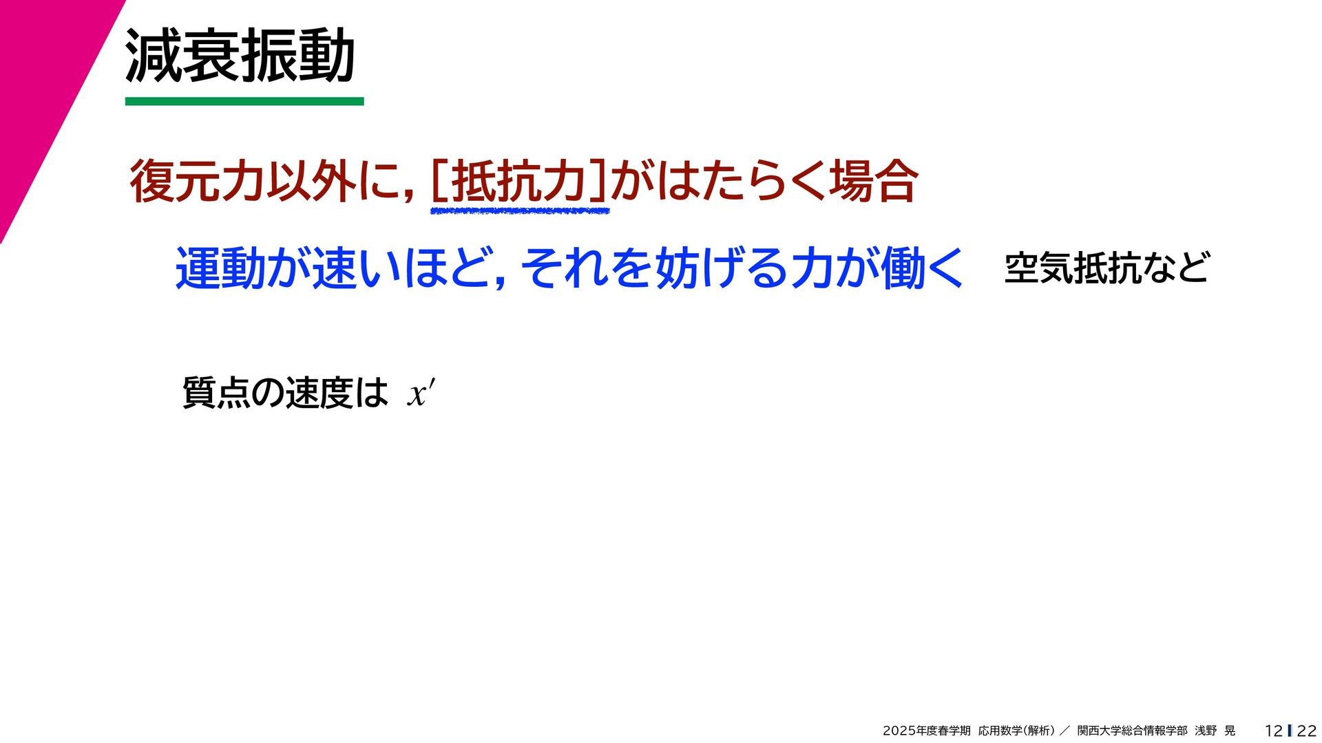 + ϕ) x′ = − Aω0 sin(ω0 t + ϕ) x(0) = A cos ϕ = 0 x′ (0) = − Aω0 sin ϕ = v 一般解 問題に示された初期値によると より cos ϕ = 0 ϕ = π 2 にできる sin ϕ = 1 このとき −Aω0 = v つまり A = − v ω0 以上から,求める特殊解は x = − v ω0 cos(ω0 t + π 2 ) すなわち x = v ω0 sin ω0 t