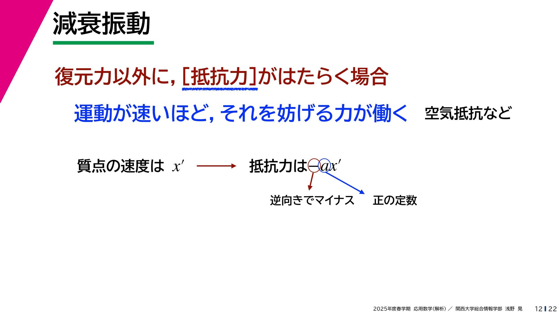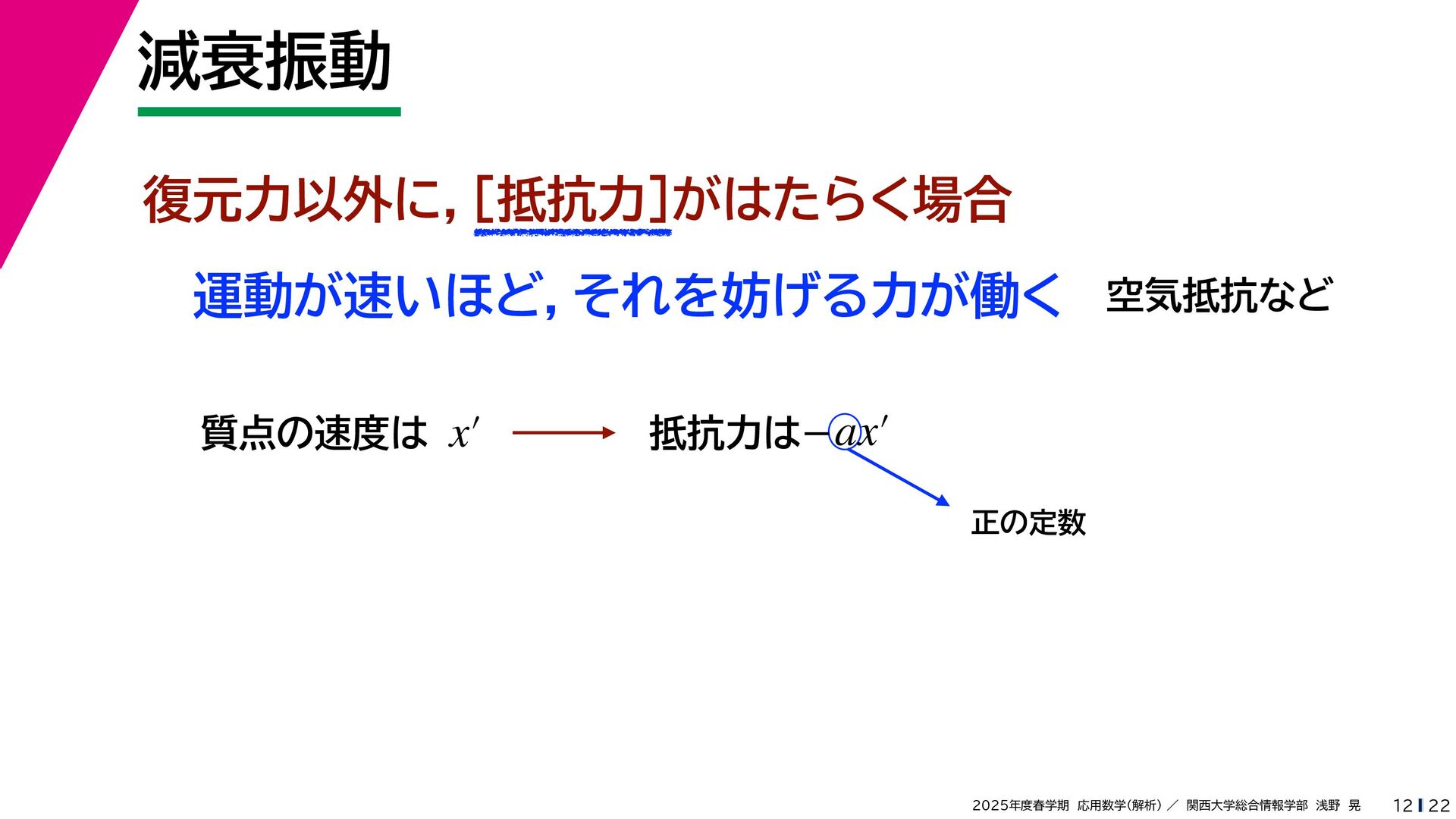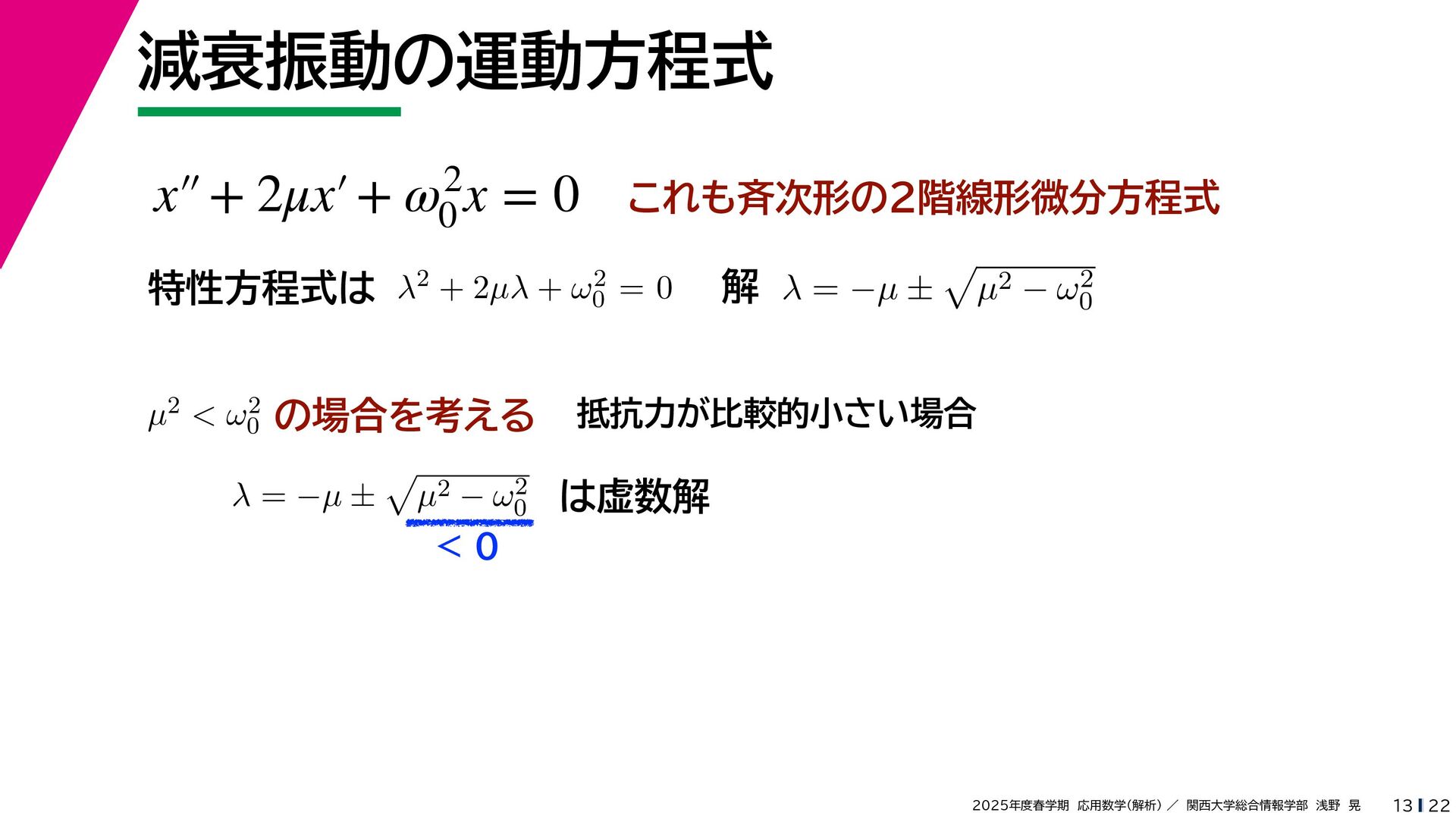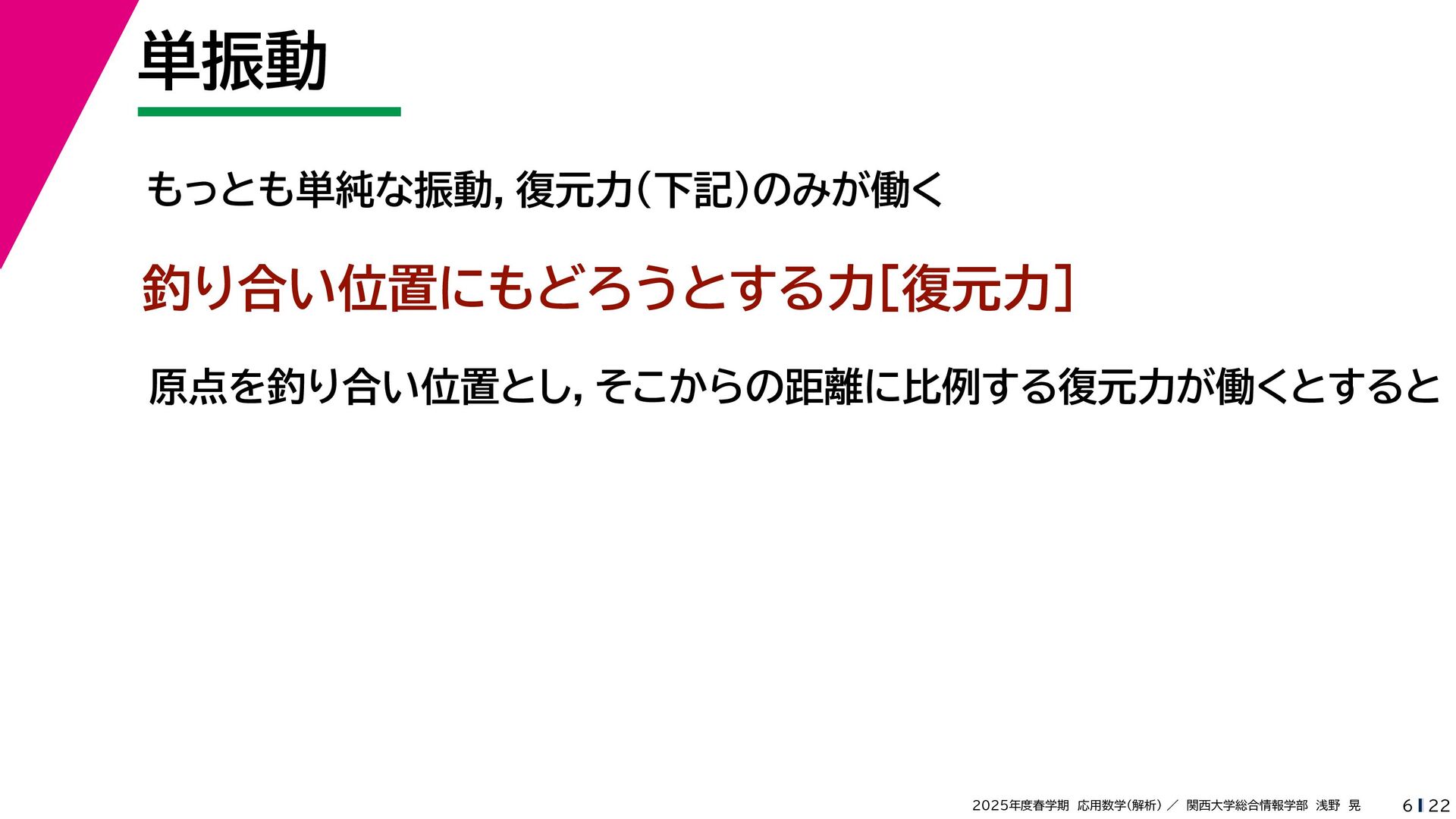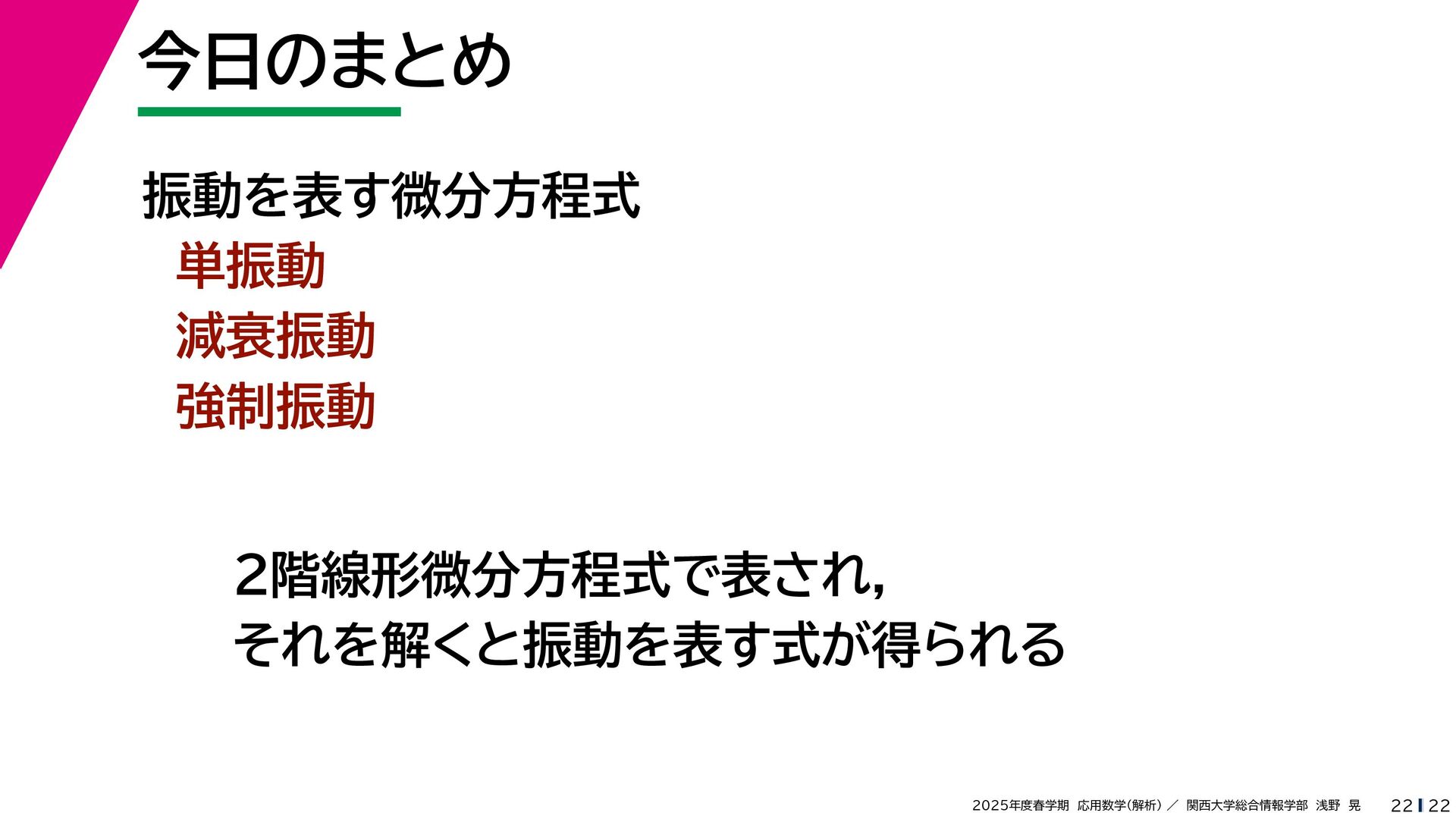 + ϕ) x′ = − Aω0 sin(ω0 t + ϕ) x(0) = A cos ϕ = 0 x′ (0) = − Aω0 sin ϕ = v 一般解 問題に示された初期値によると より cos ϕ = 0 ϕ = π 2 にできる sin ϕ = 1 このとき −Aω0 = v つまり A = − v ω0 以上から,求める特殊解は x = − v ω0 cos(ω0 t + π 2 ) すなわち x = v ω0 sin ω0 t
