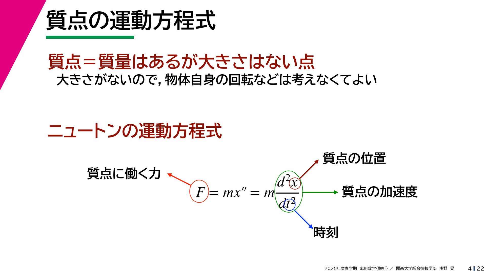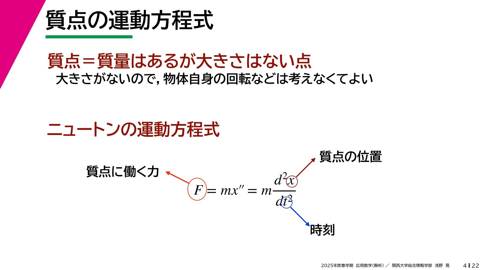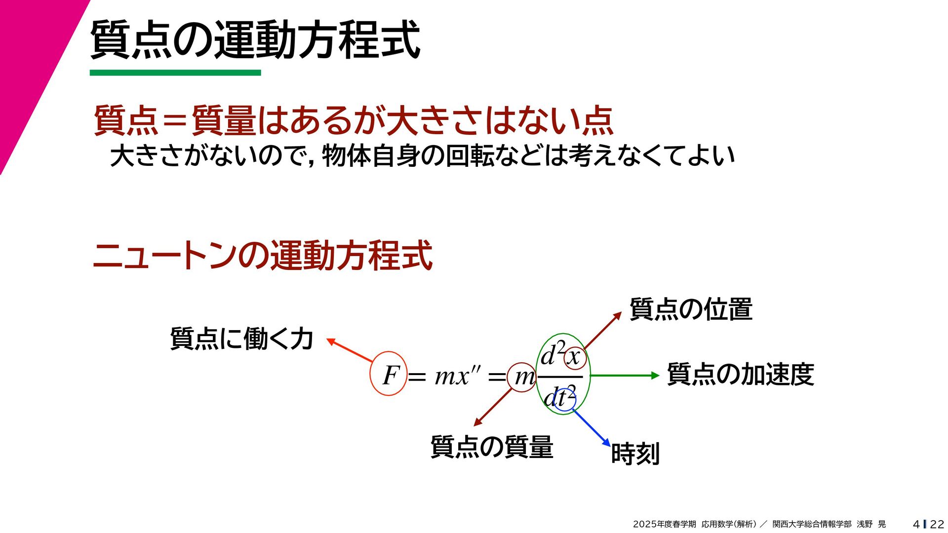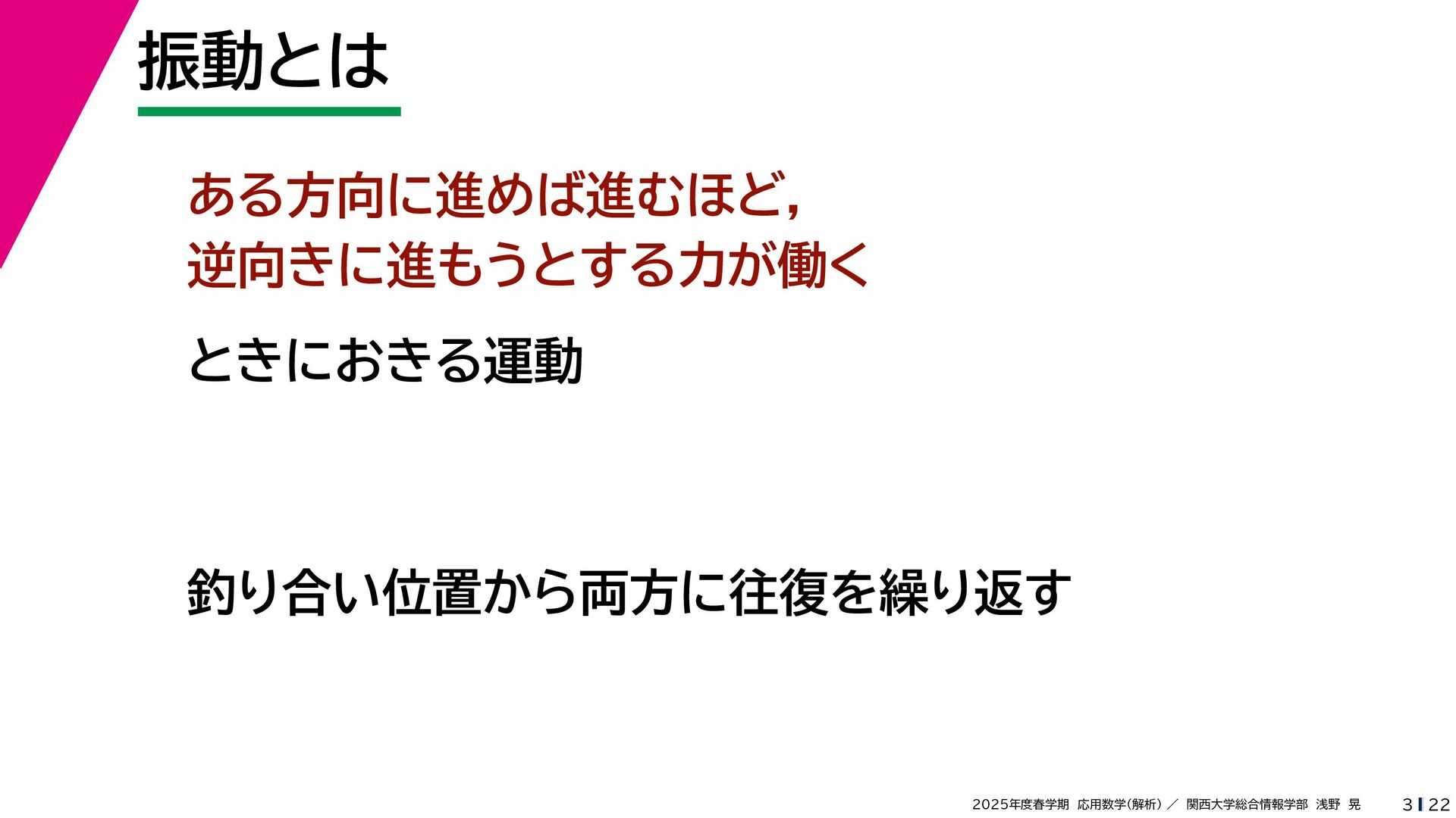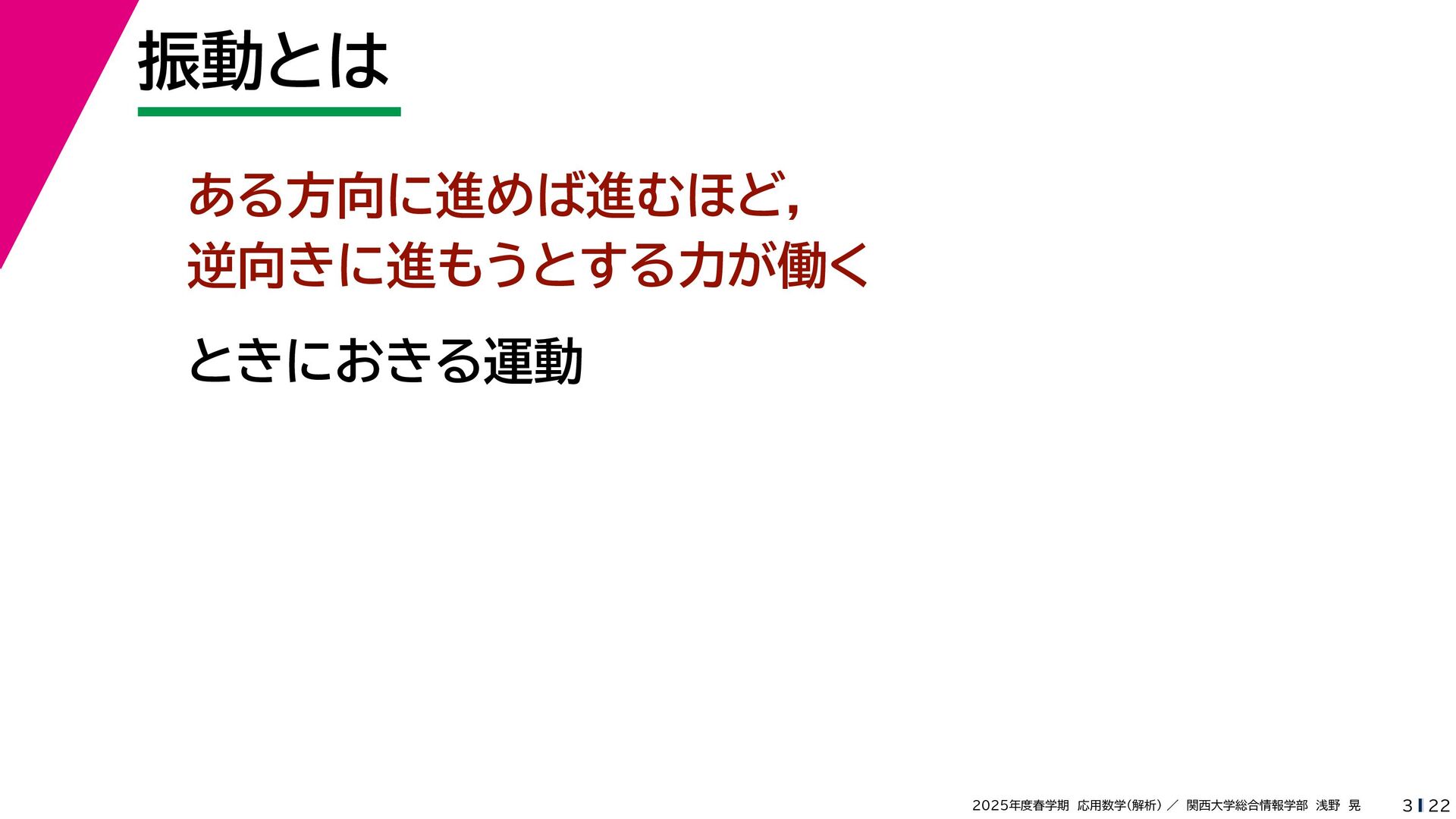 + ϕ) x′ = − Aω0 sin(ω0 t + ϕ) x(0) = A cos ϕ = 0 x′ (0) = − Aω0 sin ϕ = v 一般解 問題に示された初期値によると より cos ϕ = 0 ϕ = π 2 にできる sin ϕ = 1 このとき −Aω0 = v つまり A = − v ω0 以上から,求める特殊解は x = − v ω0 cos(ω0 t + π 2 ) すなわち x = v ω0 sin ω0 t