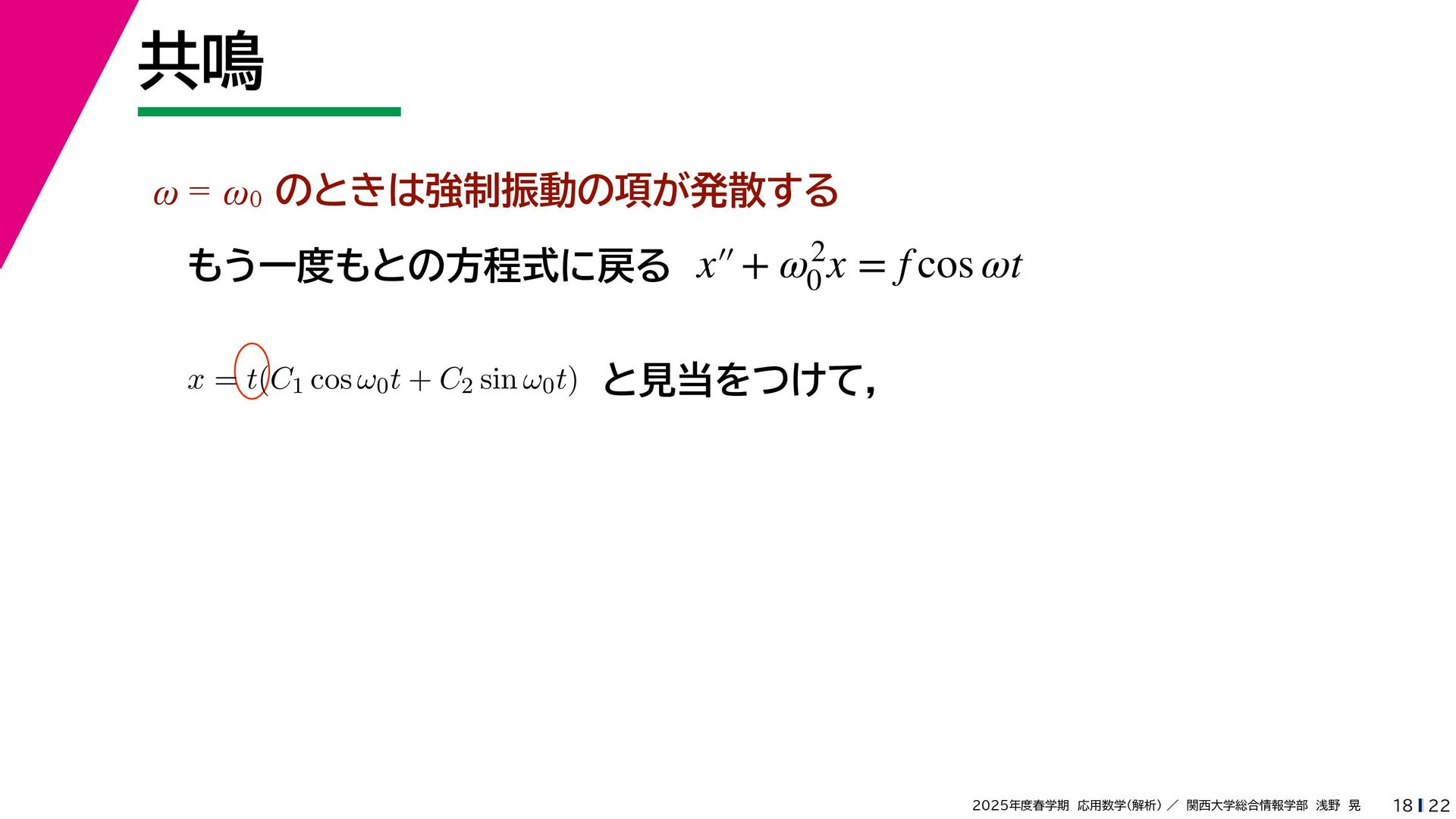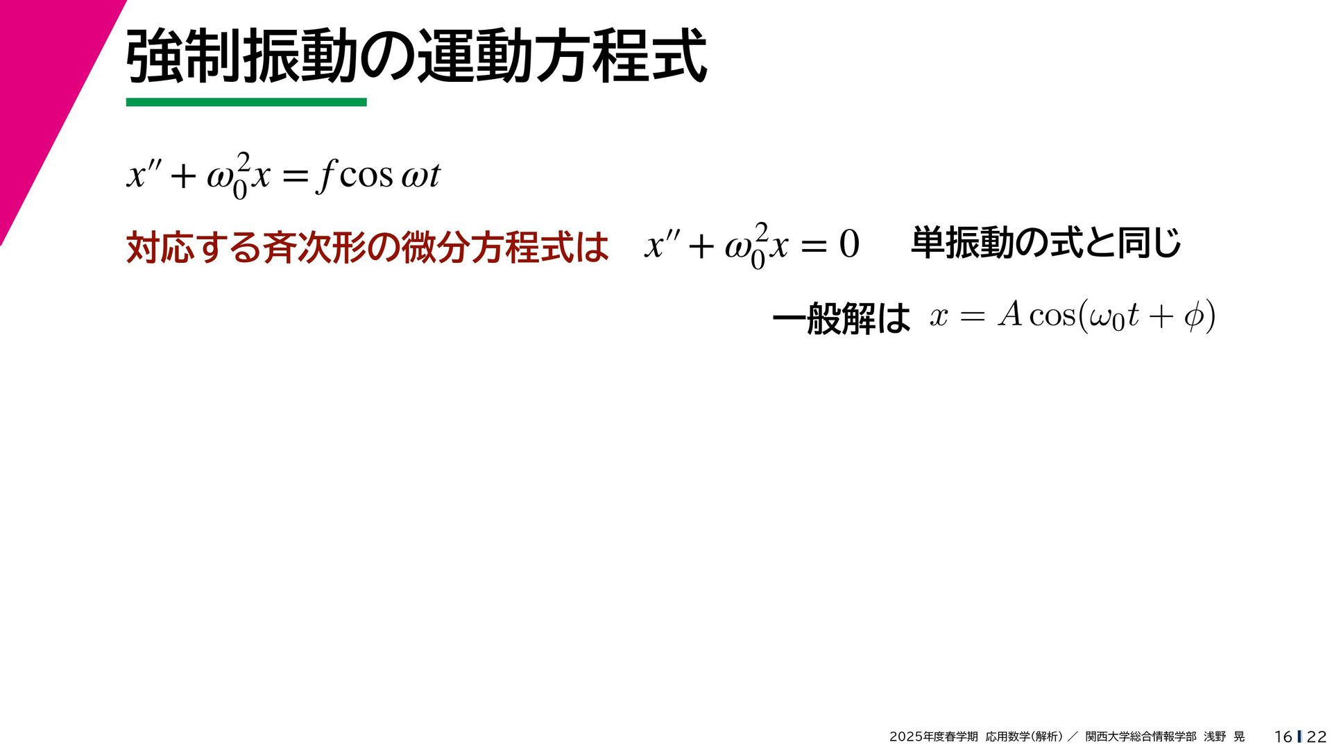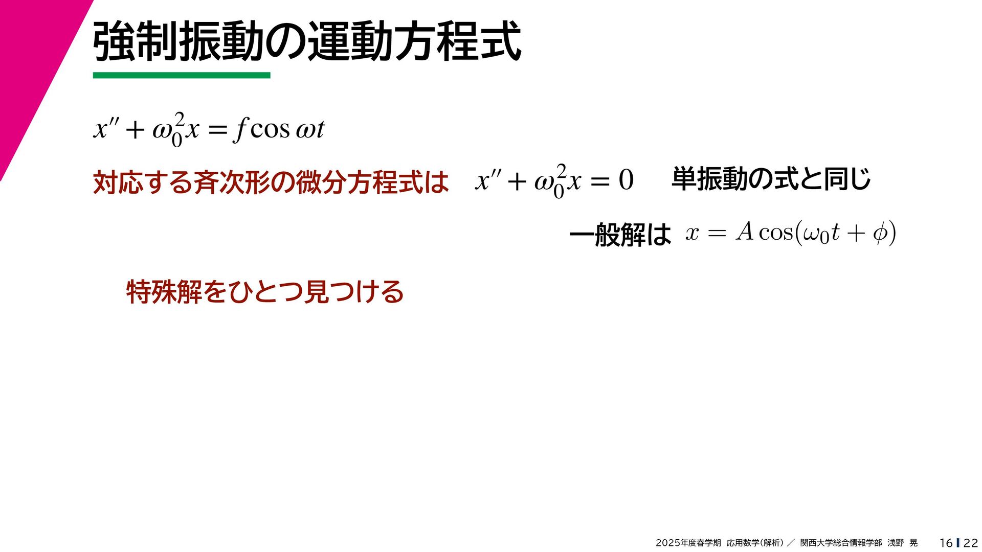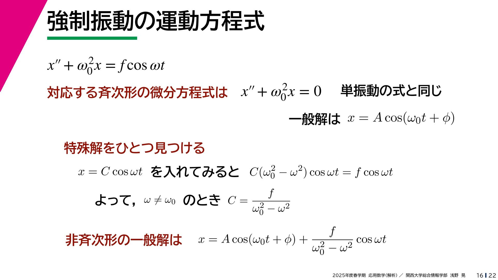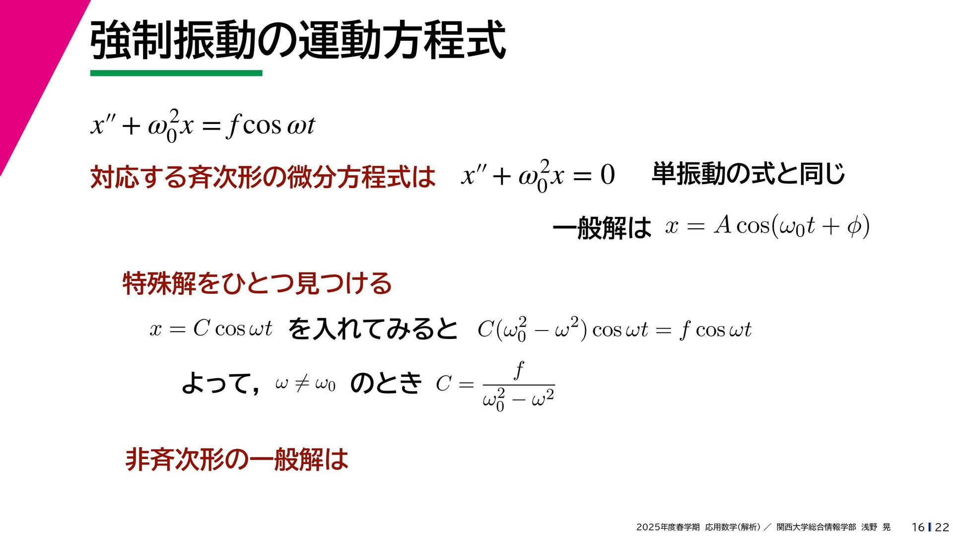 A cos(ω0t + φ) 特殊解をひとつ見つける x = C cos ωt を入れてみると C(ω2 0 − ω2) cos ωt = f cos ωt よって, C = f ω2 0 − ω2 のとき ω ̸= ω0 非斉次形の一般解は x′ ′ + ω2 0 x = f cos ωt x′ ′ + ω2 0 x = 0
