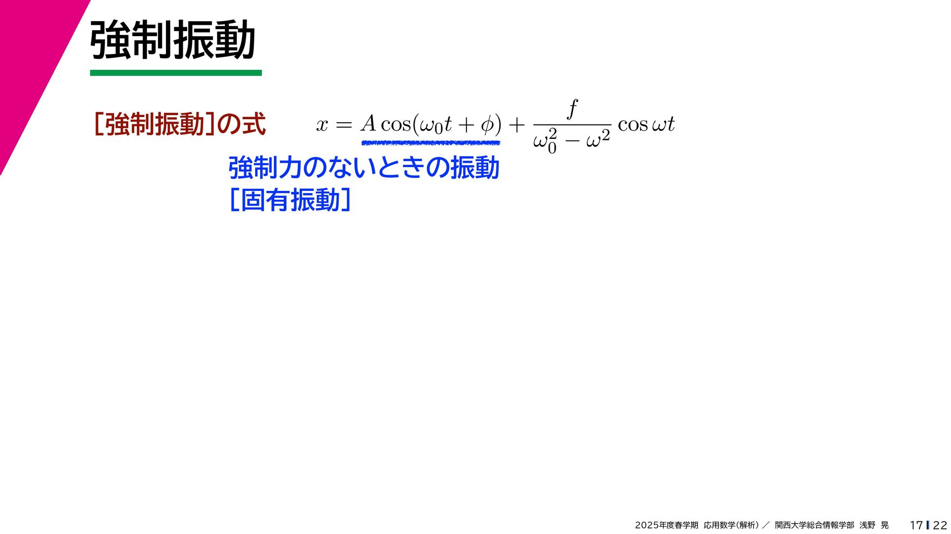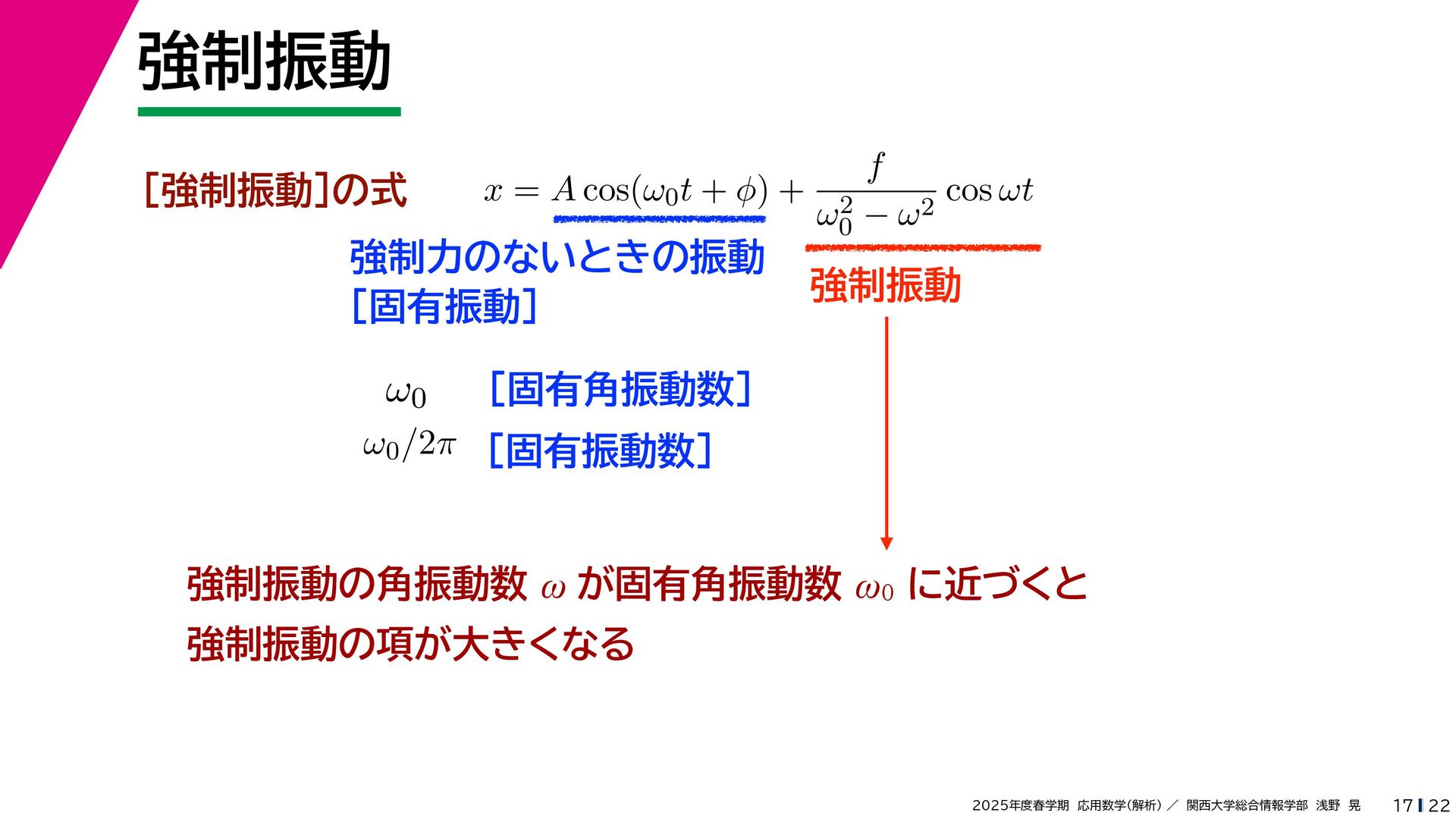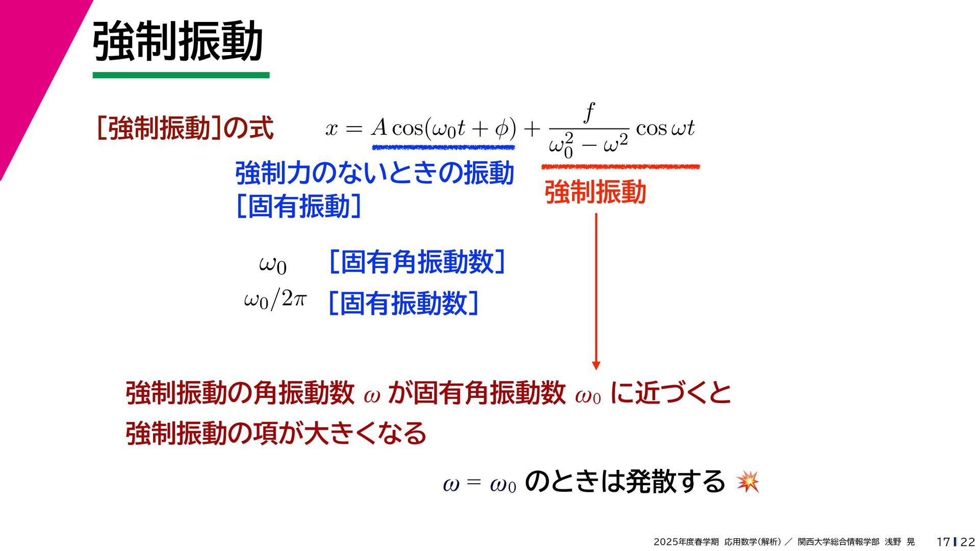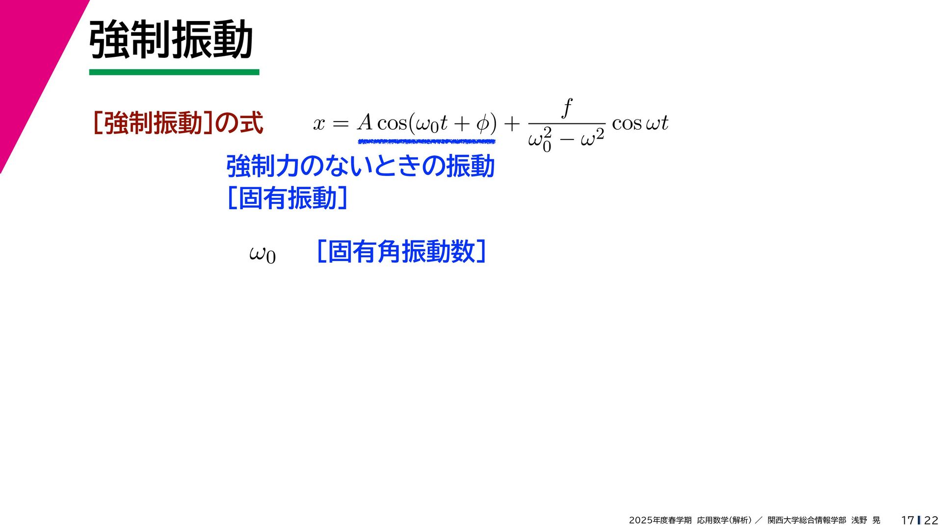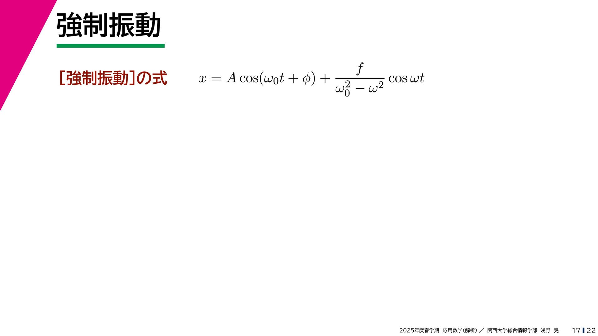 A cos(ω0t + φ) 特殊解をひとつ見つける x = C cos ωt を入れてみると C(ω2 0 − ω2) cos ωt = f cos ωt よって, C = f ω2 0 − ω2 のとき ω ̸= ω0 非斉次形の一般解は x′ ′ + ω2 0 x = f cos ωt x′ ′ + ω2 0 x = 0