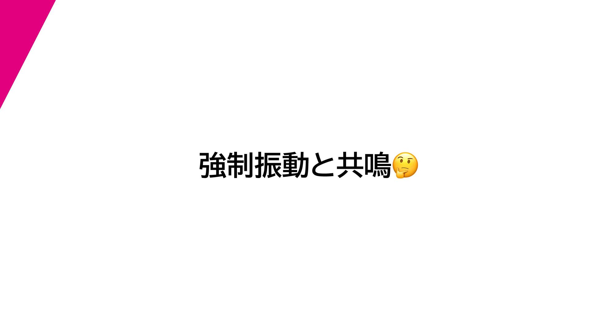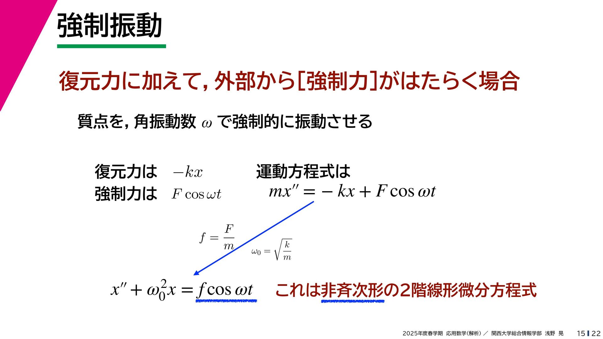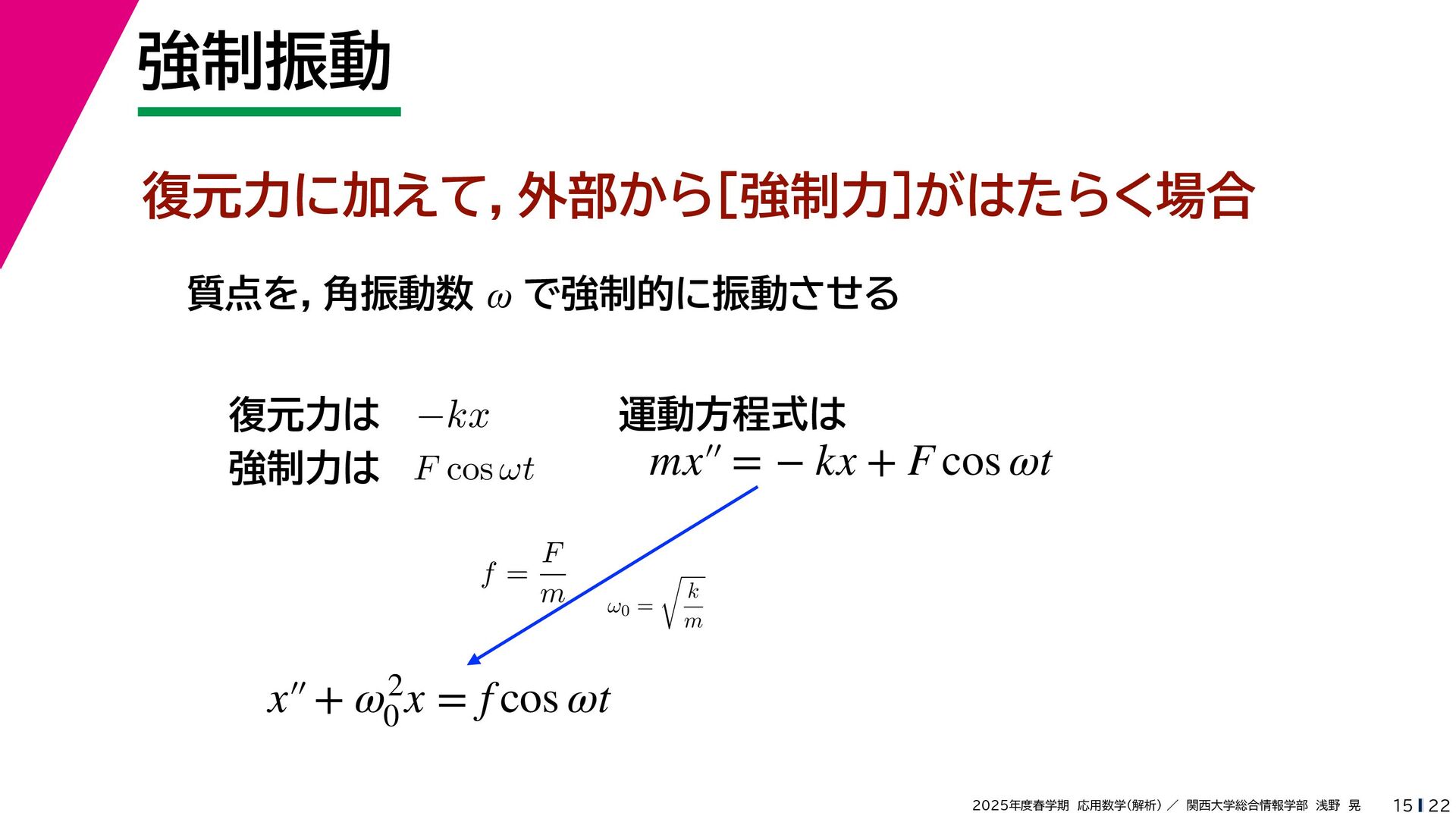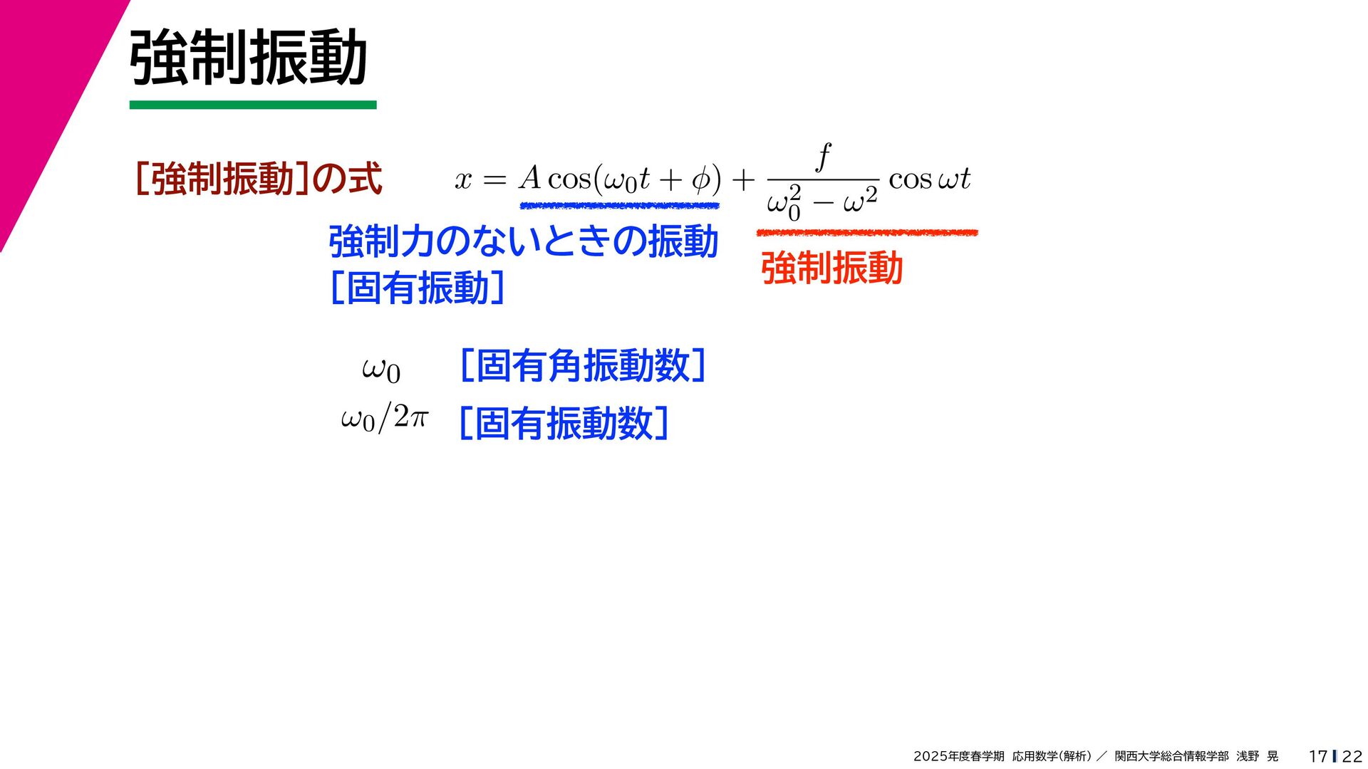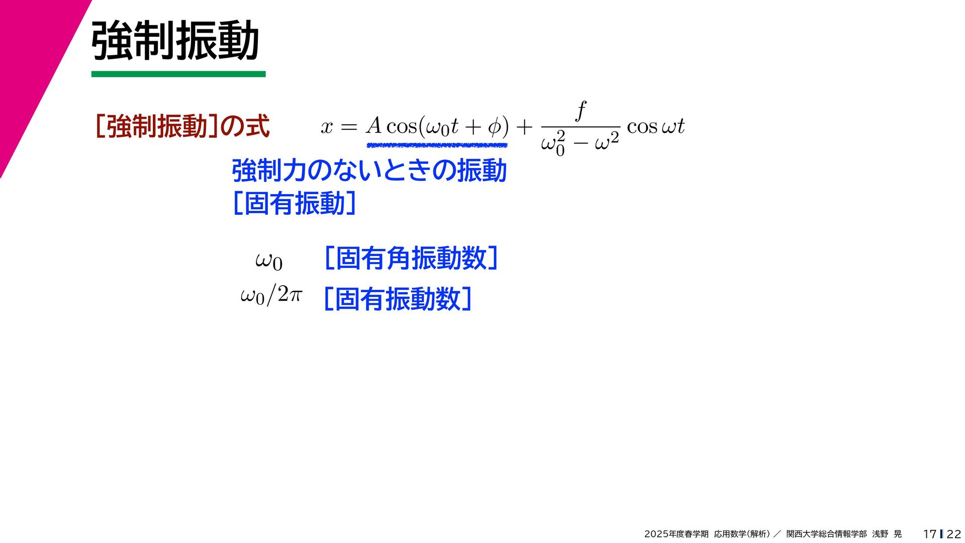 A cos(ω0t + φ) 特殊解をひとつ見つける x = C cos ωt を入れてみると C(ω2 0 − ω2) cos ωt = f cos ωt よって, C = f ω2 0 − ω2 のとき ω ̸= ω0 非斉次形の一般解は x′ ′ + ω2 0 x = f cos ωt x′ ′ + ω2 0 x = 0