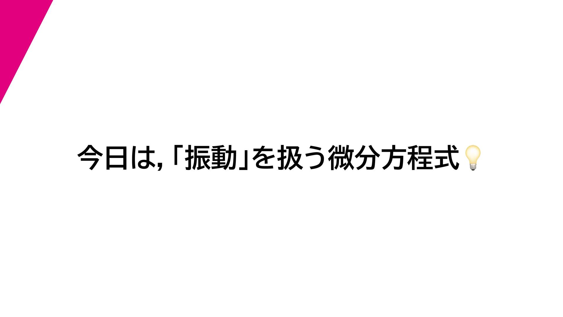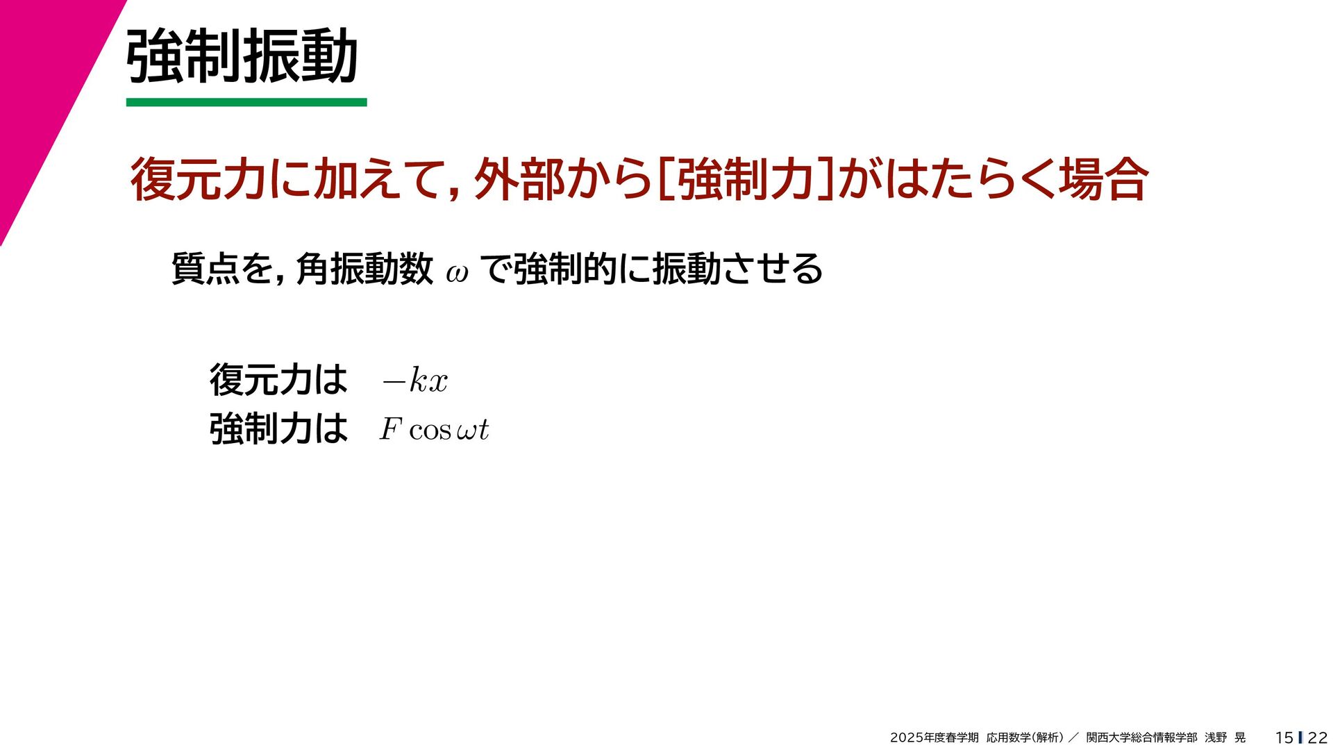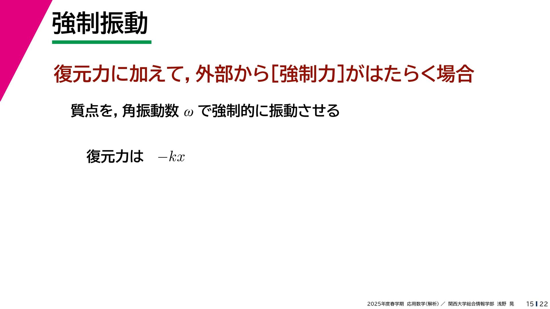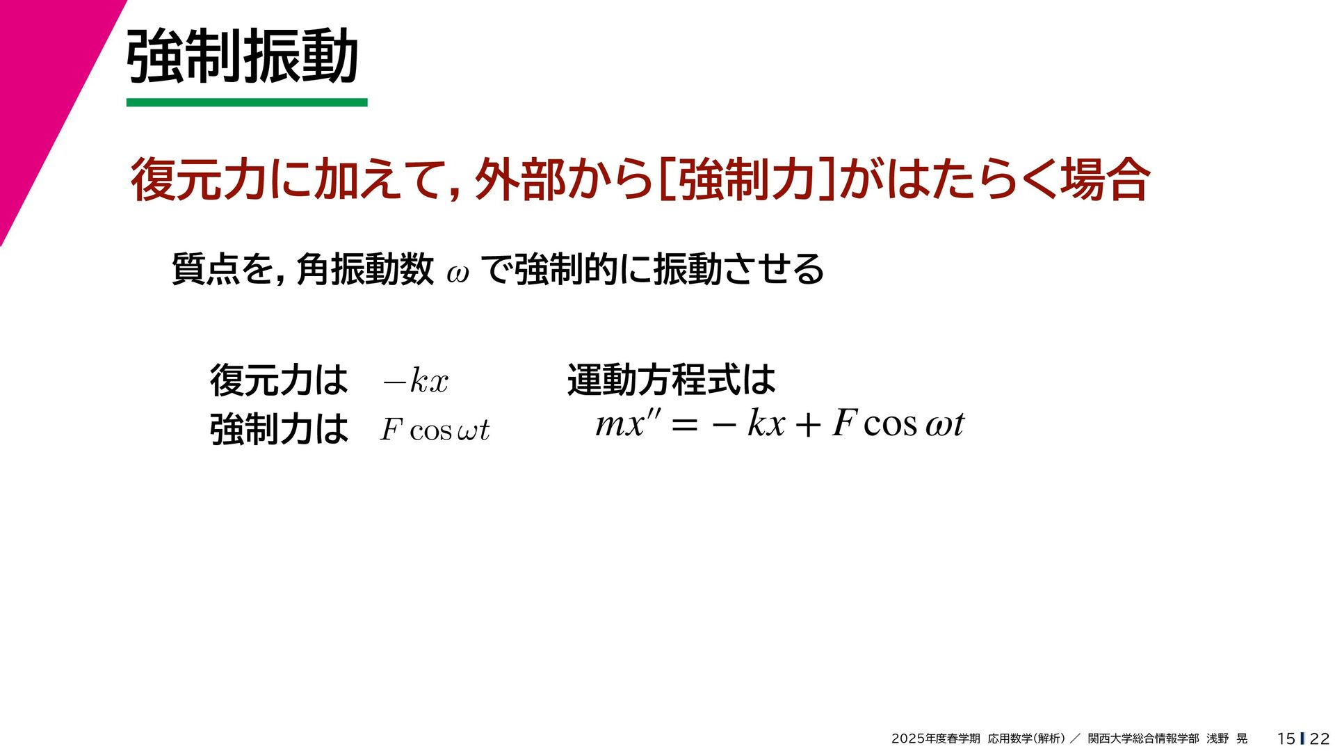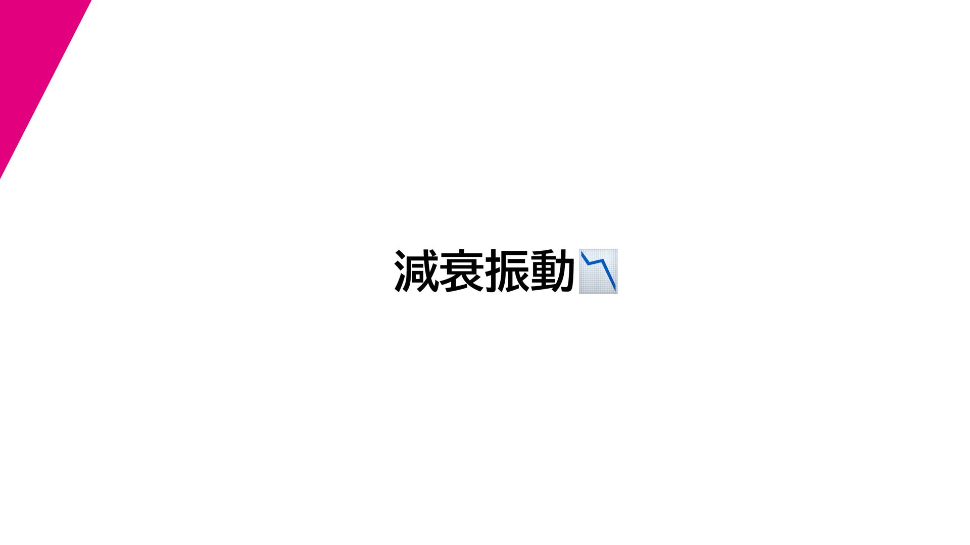 A cos(ω0t + φ) 特殊解をひとつ見つける x = C cos ωt を入れてみると C(ω2 0 − ω2) cos ωt = f cos ωt よって, C = f ω2 0 − ω2 のとき ω ̸= ω0 非斉次形の一般解は x′ ′ + ω2 0 x = f cos ωt x′ ′ + ω2 0 x = 0