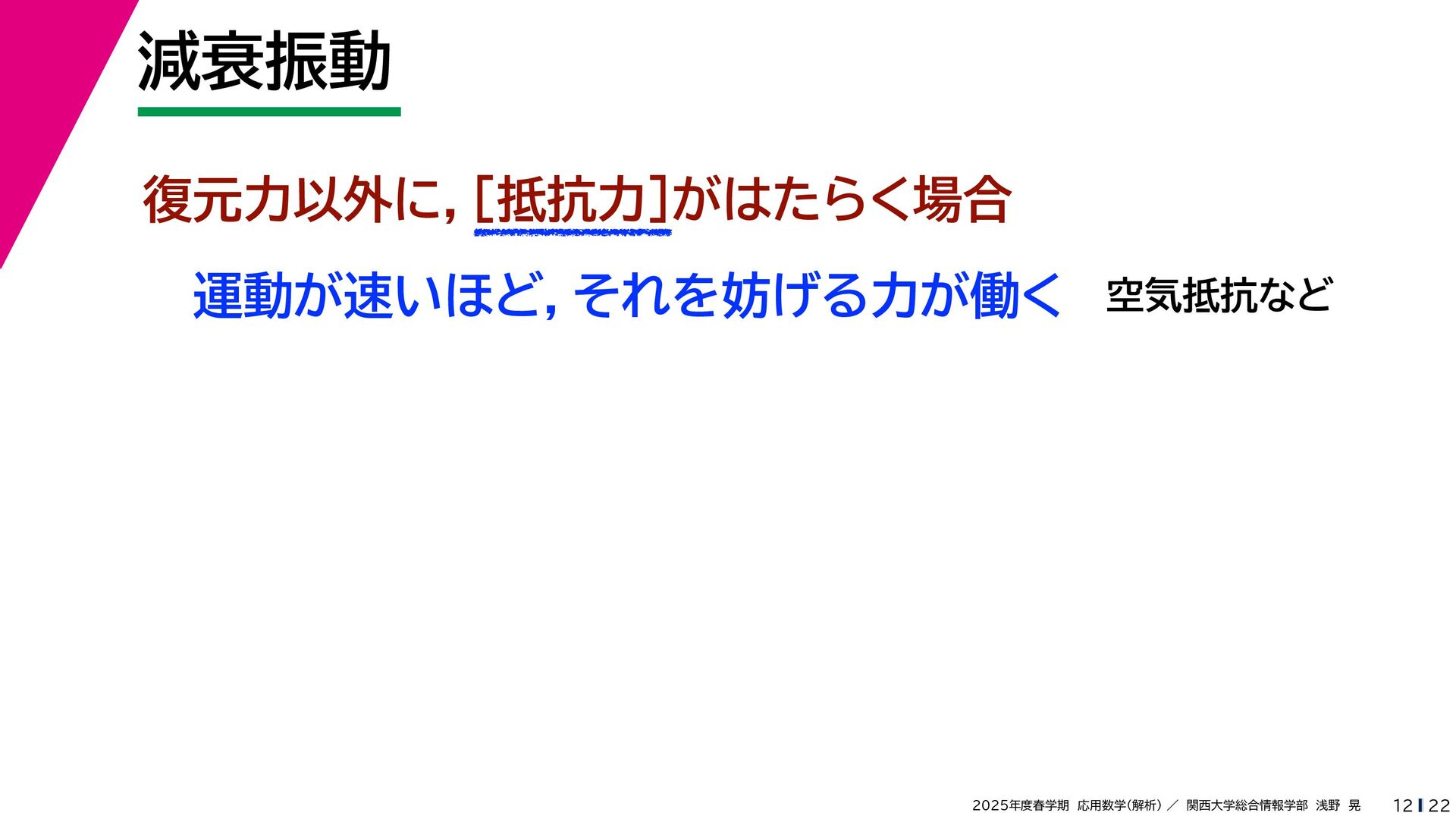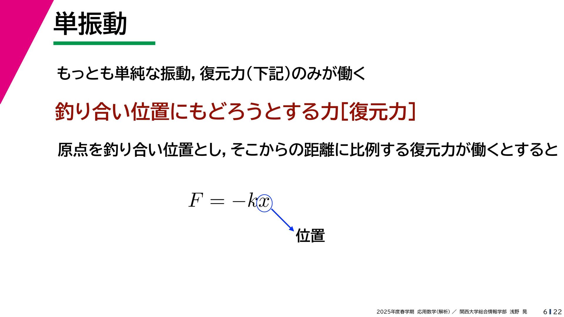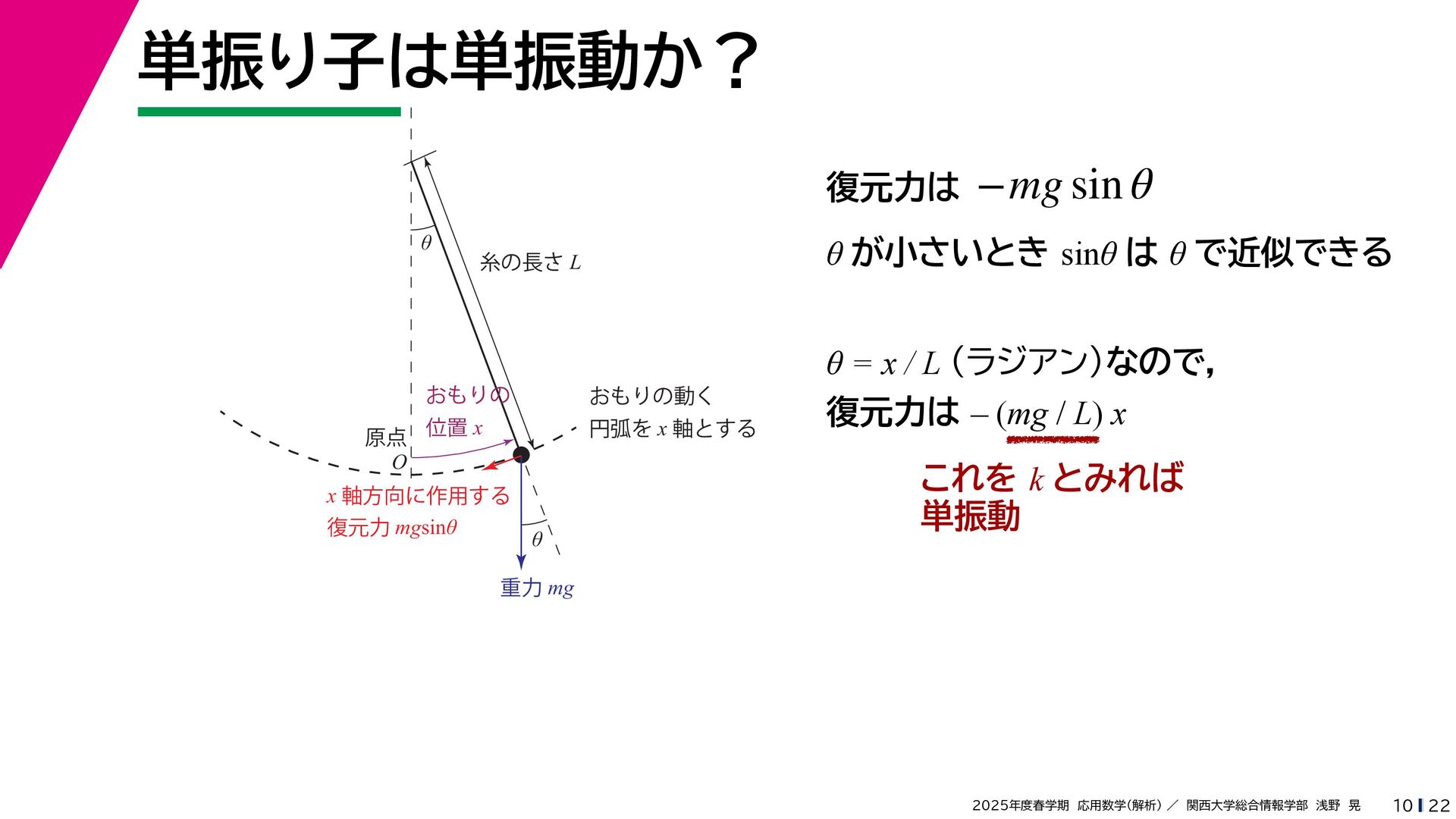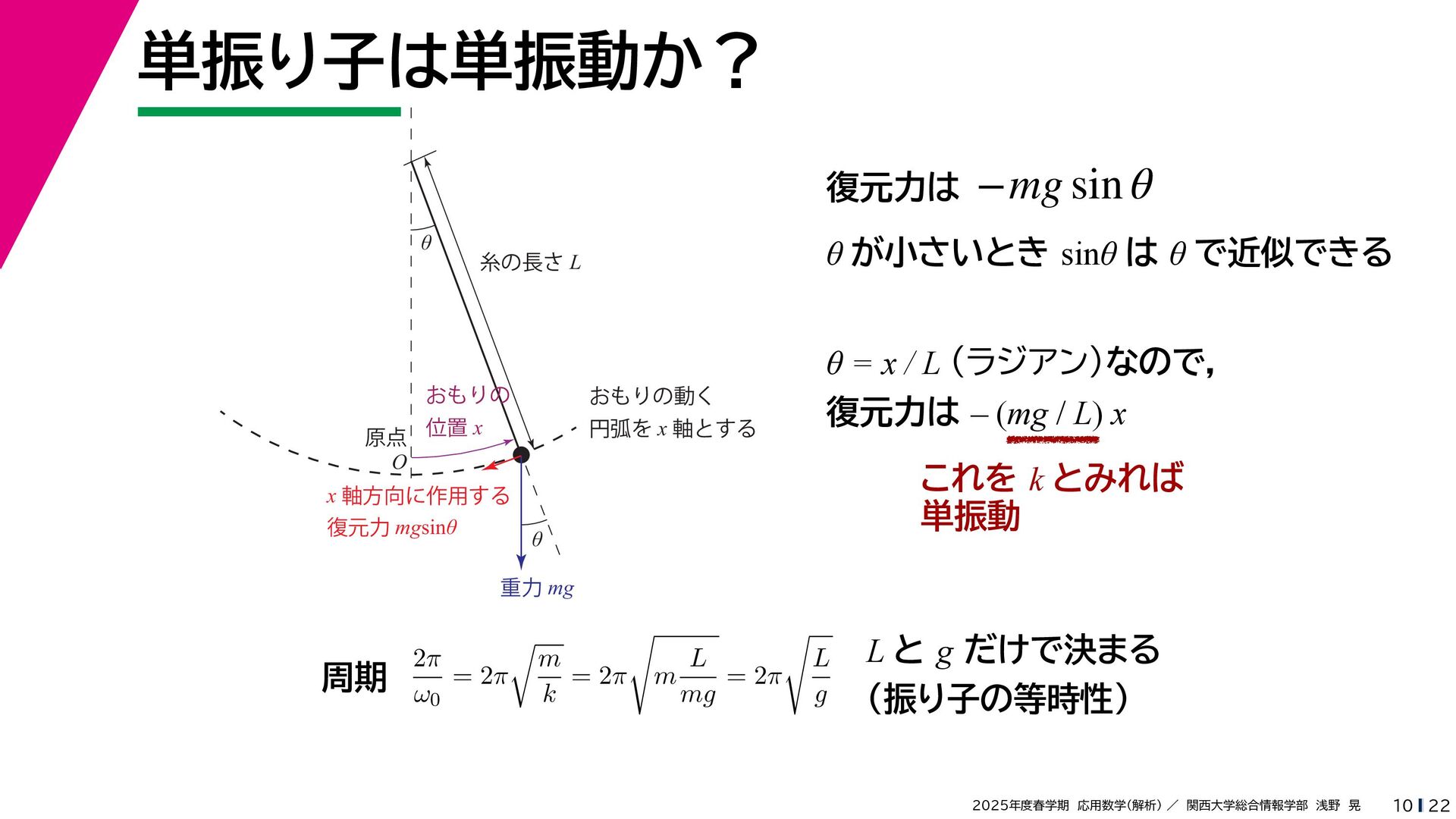 θ で近似できる θ = x / L (ラジアン)なので, 復元力は – (mg / L) x これを k とみれば 単振動 周期 2π ω0 = 2π m k = 2π m L mg = 2π L g L と g だけで決まる (振り子の等時性) −mg sin θ θ 重力 mg おもりの動く 円弧を x 軸とする θ x 軸方向に作用する 復元力 mgsinθ 糸の長さ L おもりの 位置 x 原点 O