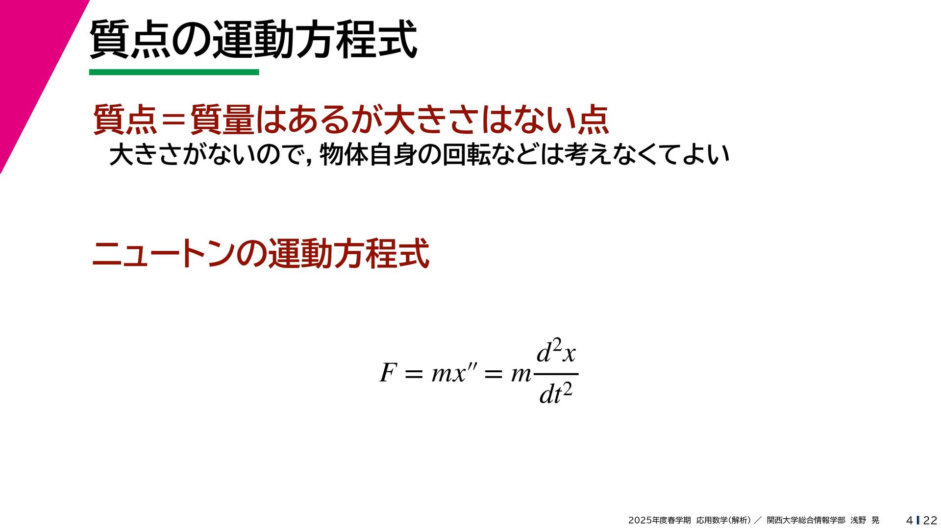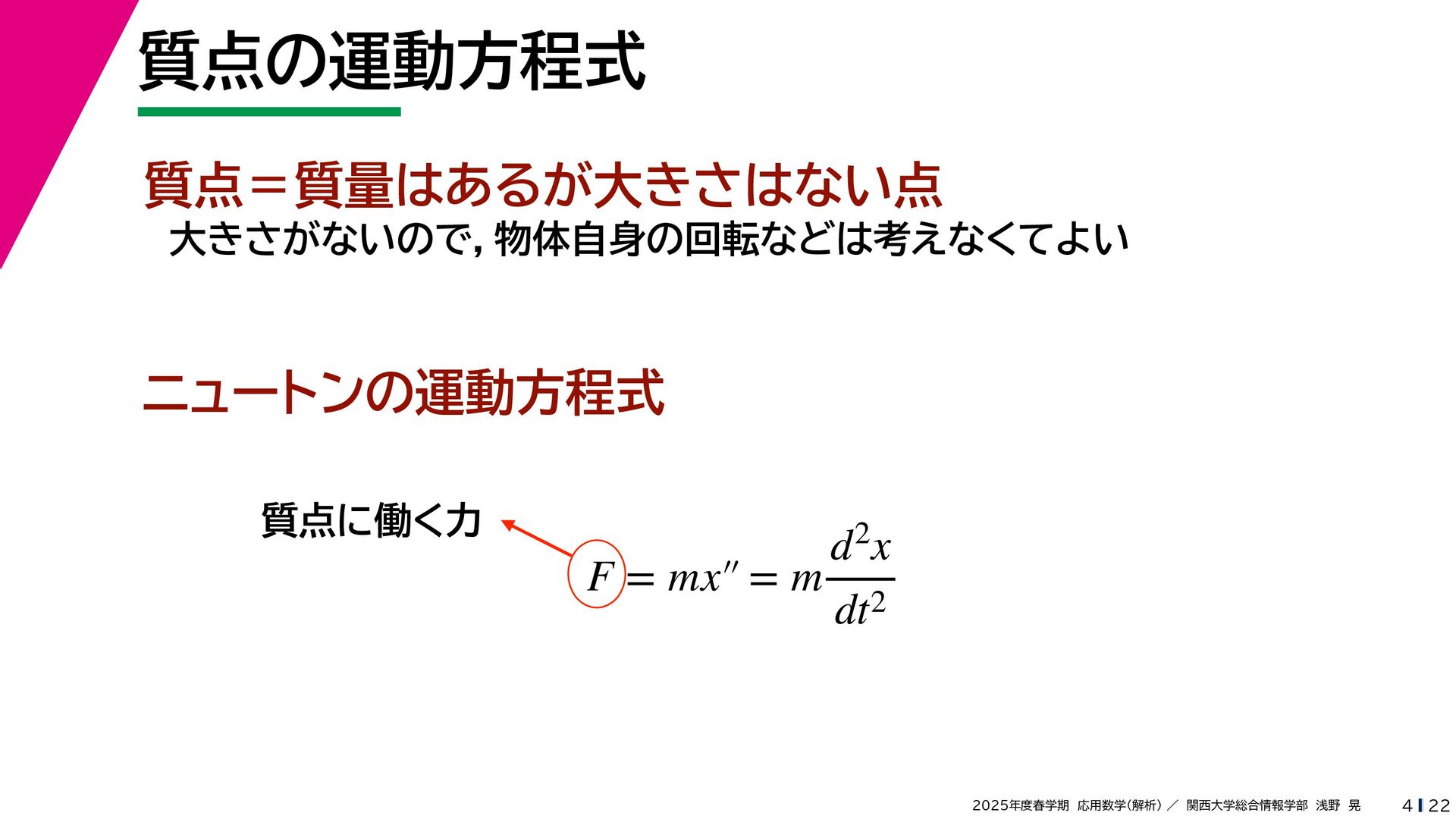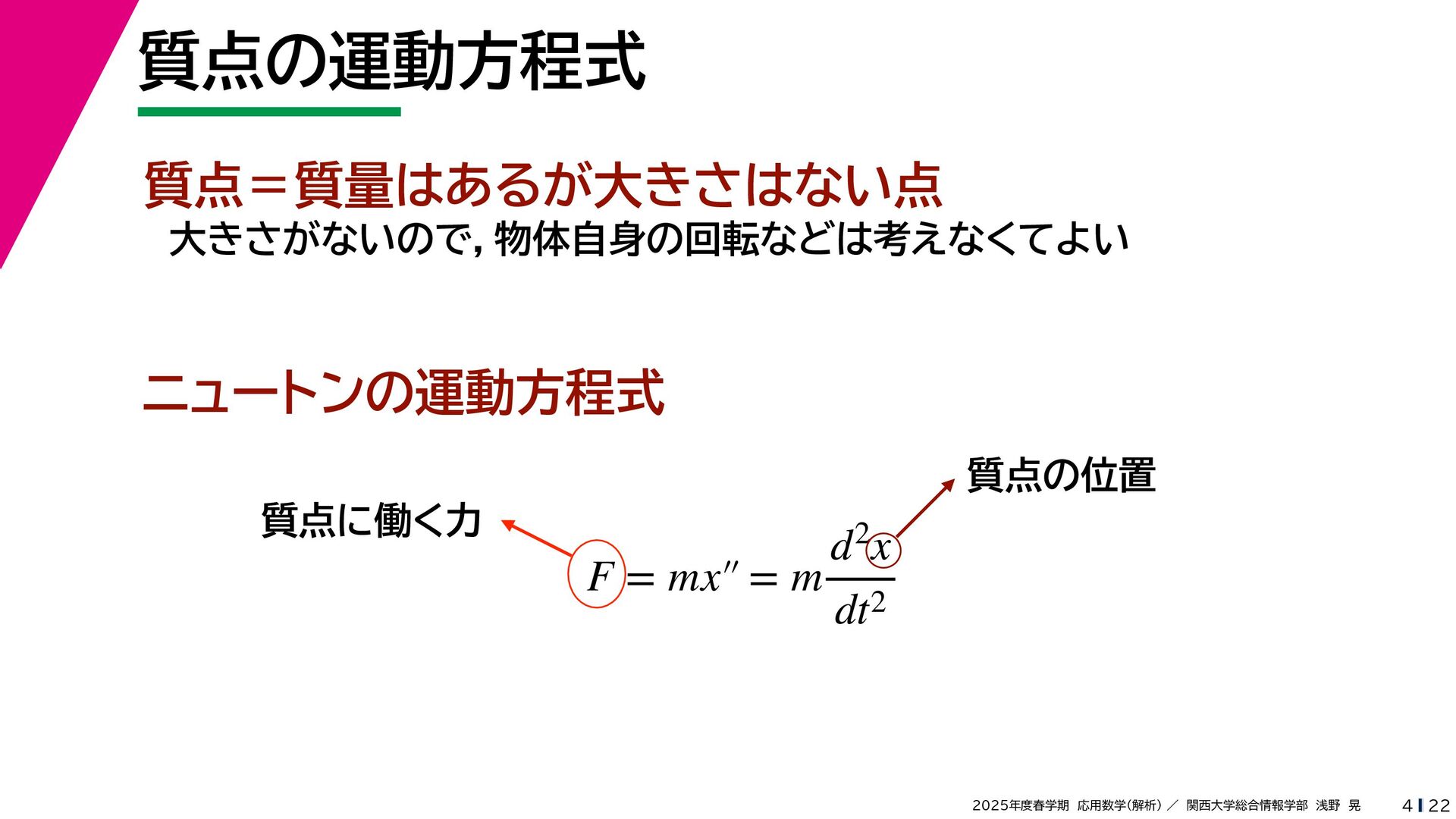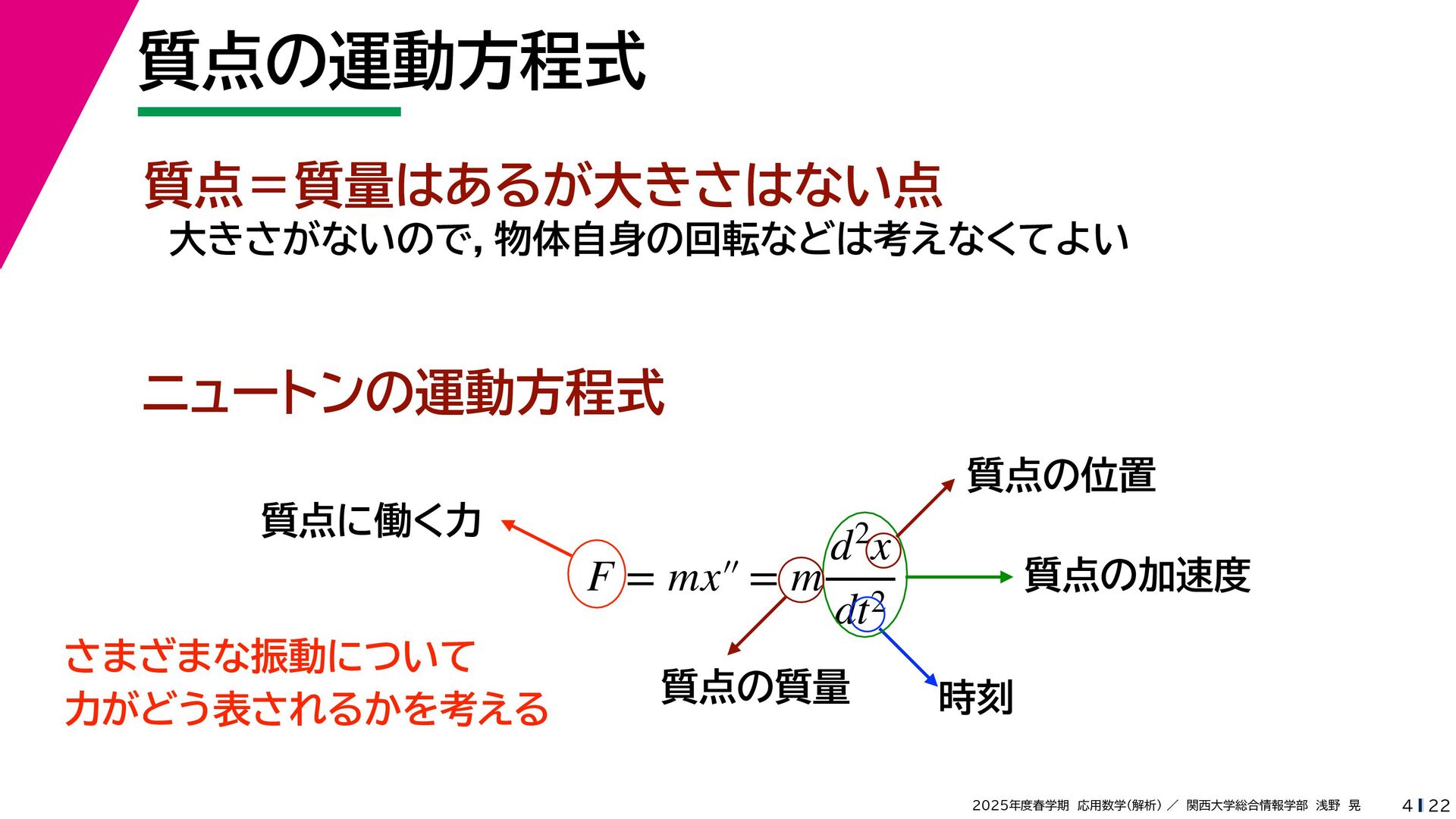 θ で近似できる θ = x / L (ラジアン)なので, 復元力は – (mg / L) x これを k とみれば 単振動 周期 2π ω0 = 2π m k = 2π m L mg = 2π L g L と g だけで決まる (振り子の等時性) −mg sin θ θ 重力 mg おもりの動く 円弧を x 軸とする θ x 軸方向に作用する 復元力 mgsinθ 糸の長さ L おもりの 位置 x 原点 O