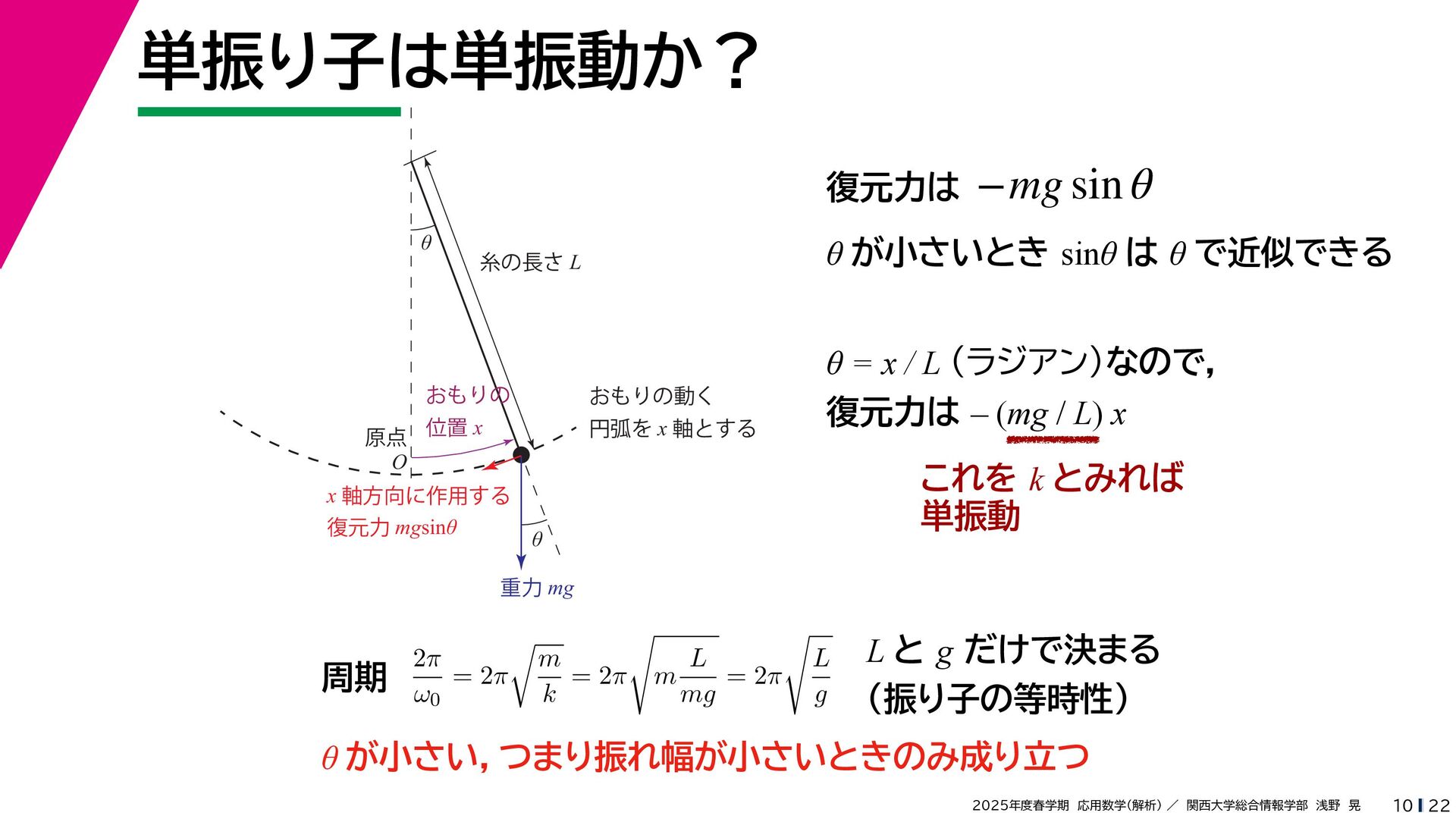 θ で近似できる θ = x / L (ラジアン)なので, 復元力は – (mg / L) x これを k とみれば 単振動 周期 2π ω0 = 2π m k = 2π m L mg = 2π L g L と g だけで決まる (振り子の等時性) θ が小さい,つまり振れ幅が小さいときのみ成り立つ −mg sin θ θ 重力 mg おもりの動く 円弧を x 軸とする θ x 軸方向に作用する 復元力 mgsinθ 糸の長さ L おもりの 位置 x 原点 O