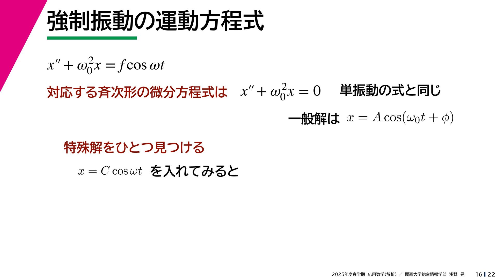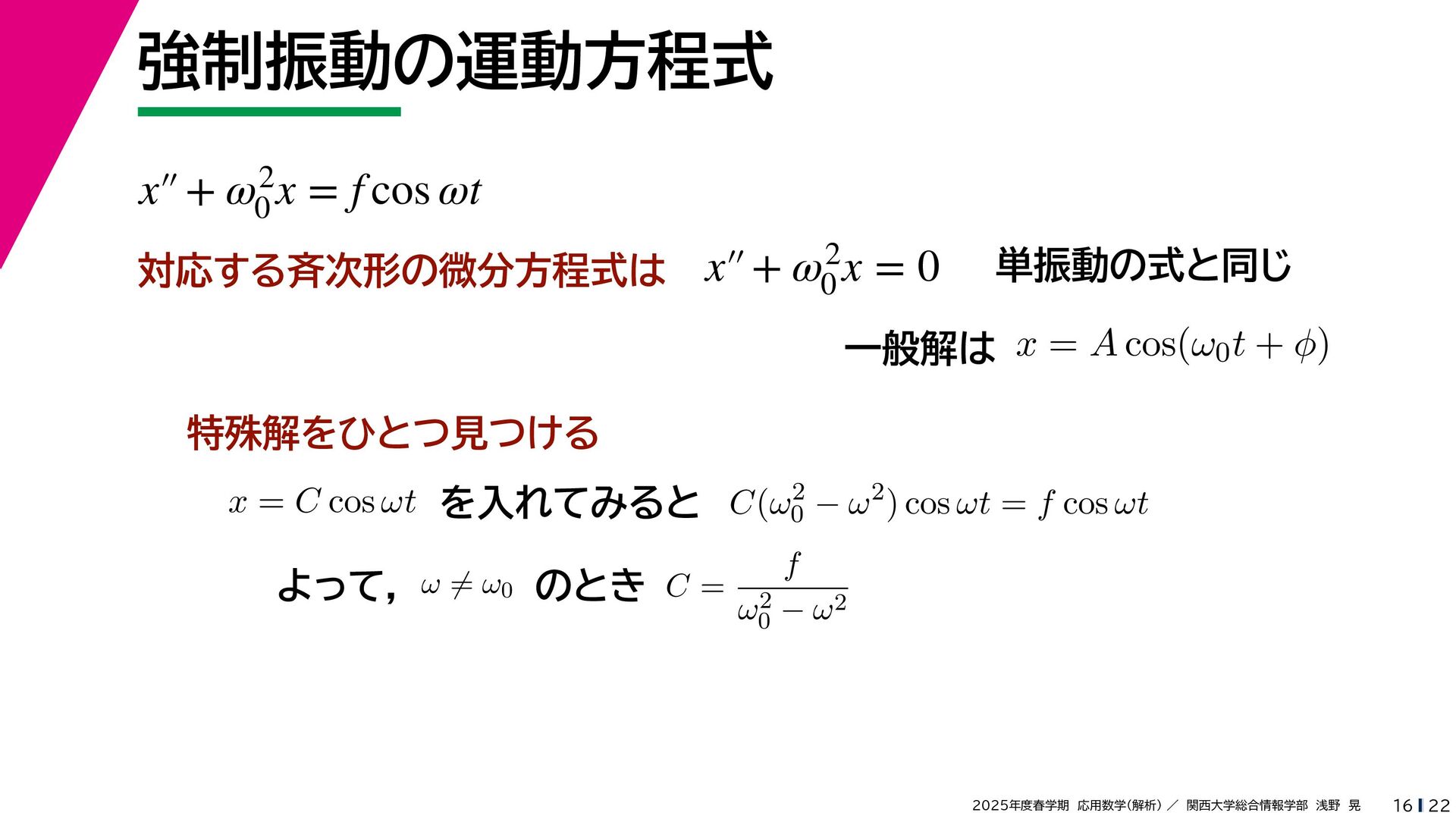 A cos(ω0t + φ) 特殊解をひとつ見つける x = C cos ωt を入れてみると C(ω2 0 − ω2) cos ωt = f cos ωt よって, C = f ω2 0 − ω2 のとき ω ̸= ω0 x′ ′ + ω2 0 x = f cos ωt x′ ′ + ω2 0 x = 0