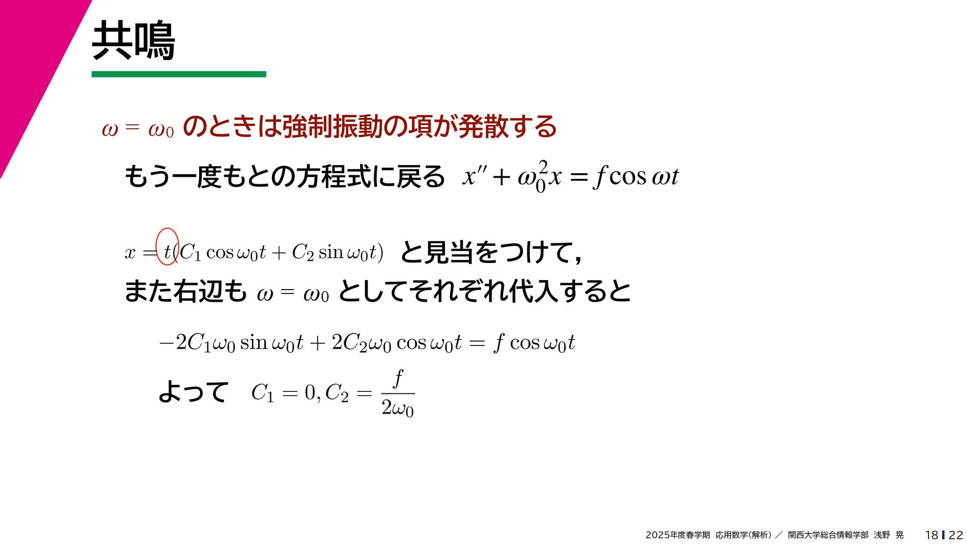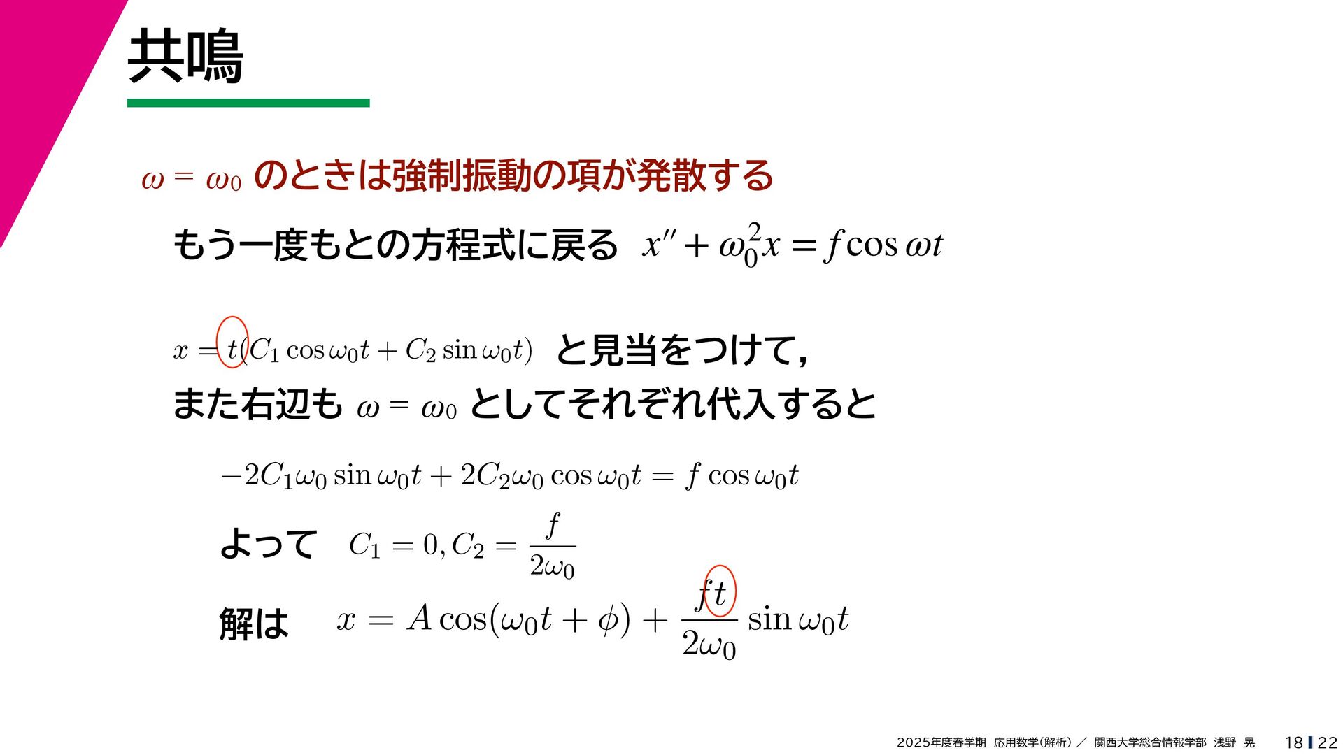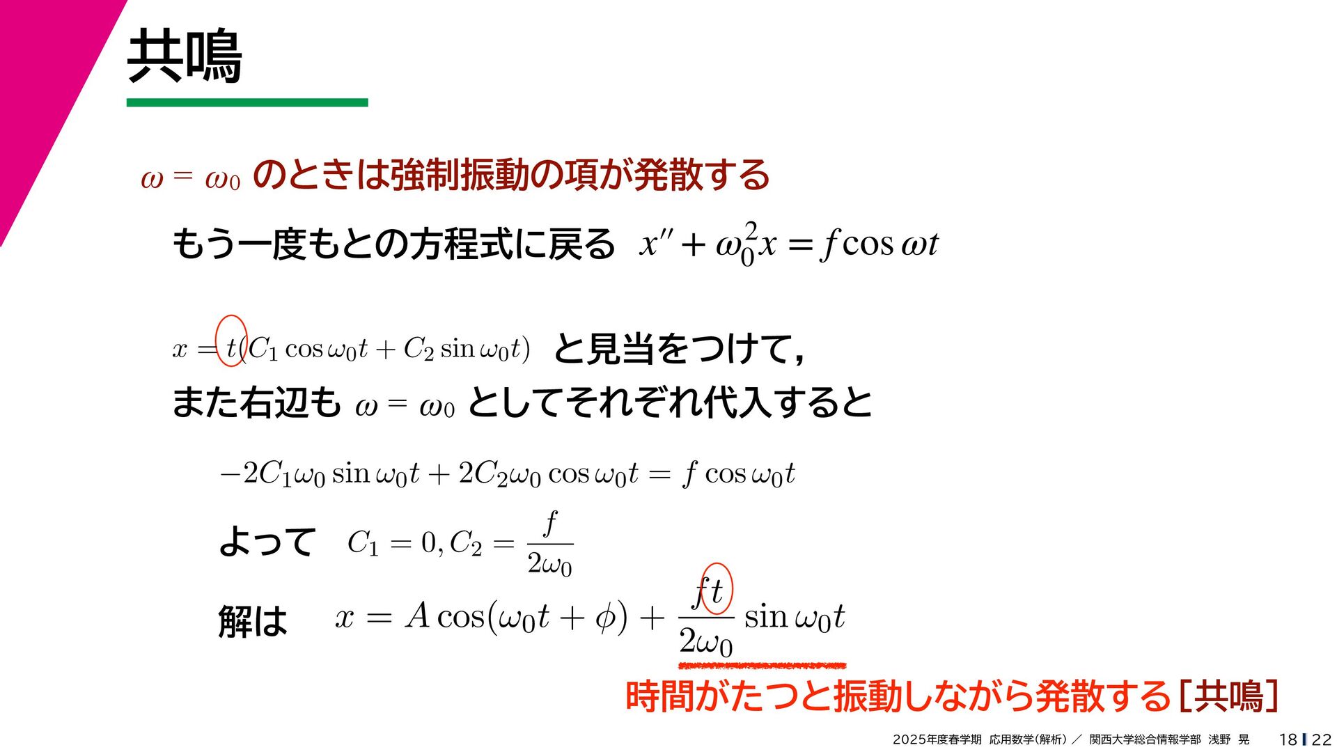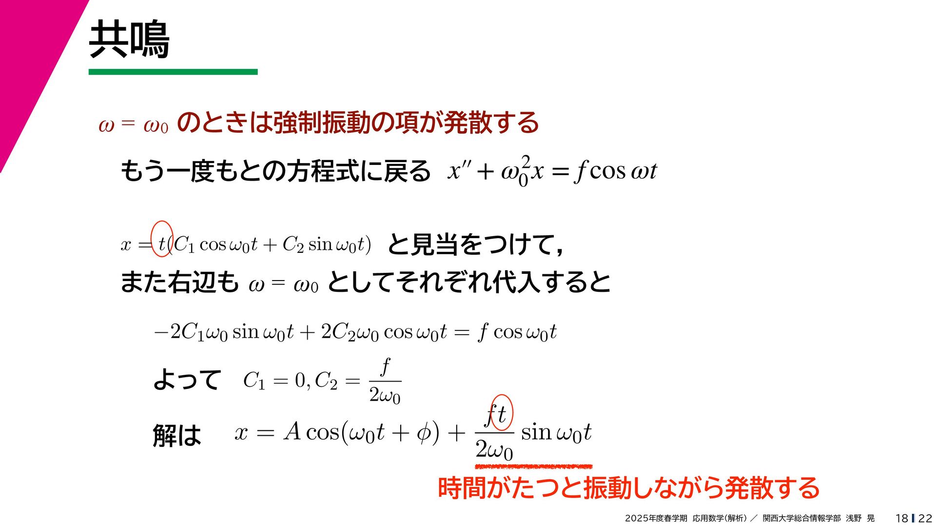 −2C1ω0 sin ω0t + 2C2ω0 cos ω0t = f cos ω0t よって C1 = 0, C2 = f 2ω0 x = A cos(ω0t + φ) + ft 2ω0 sin ω0t 解は 時間がたつと振動しながら発散する[共鳴] x = t(C1 cos ω0t + C2 sin ω0t) と見当をつけて, また右辺も ω = ω0 としてそれぞれ代入すると x′ ′ + ω2 0 x = f cos ωt