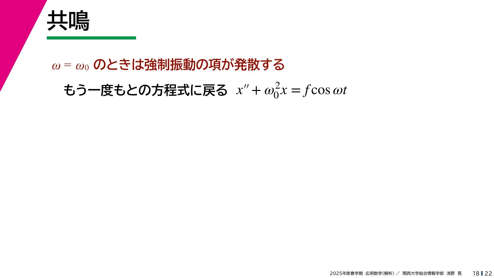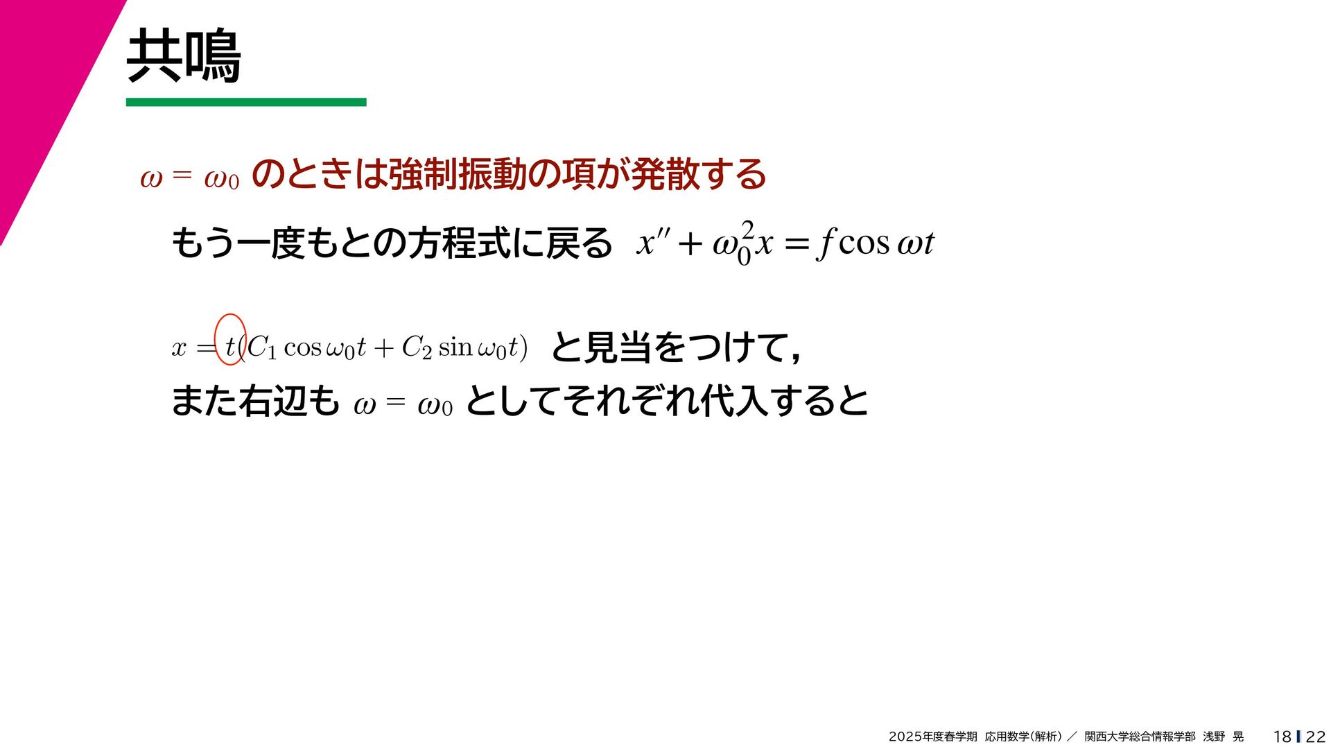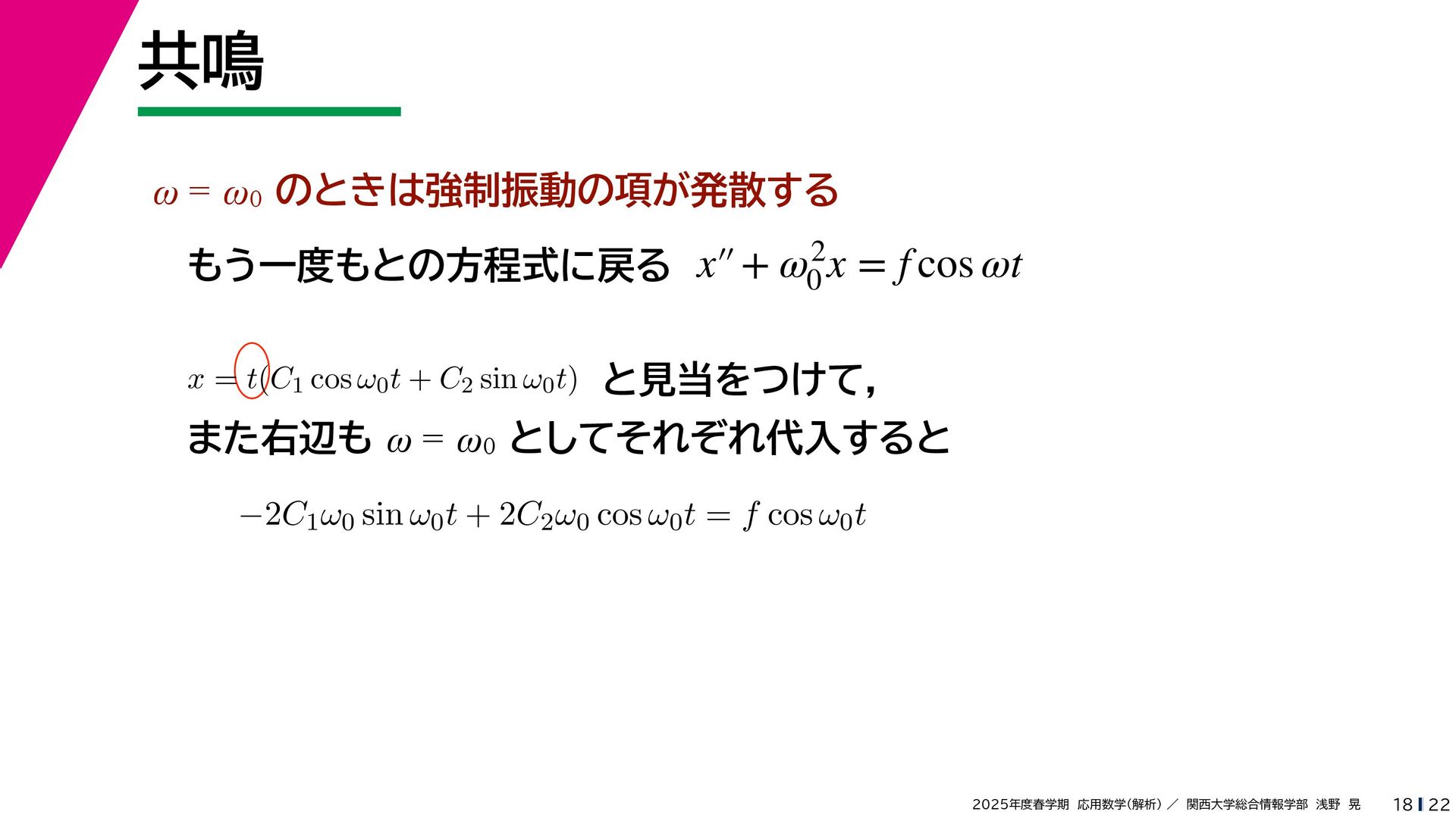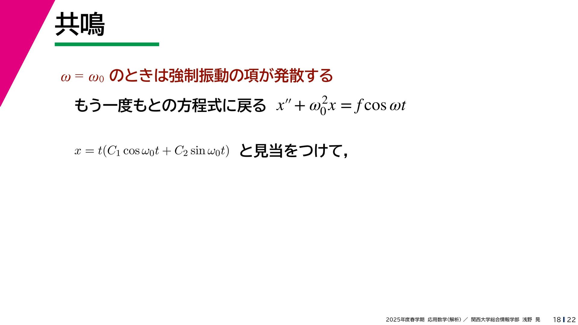 −2C1ω0 sin ω0t + 2C2ω0 cos ω0t = f cos ω0t よって C1 = 0, C2 = f 2ω0 x = A cos(ω0t + φ) + ft 2ω0 sin ω0t 解は 時間がたつと振動しながら発散する[共鳴] x = t(C1 cos ω0t + C2 sin ω0t) と見当をつけて, また右辺も ω = ω0 としてそれぞれ代入すると x′ ′ + ω2 0 x = f cos ωt