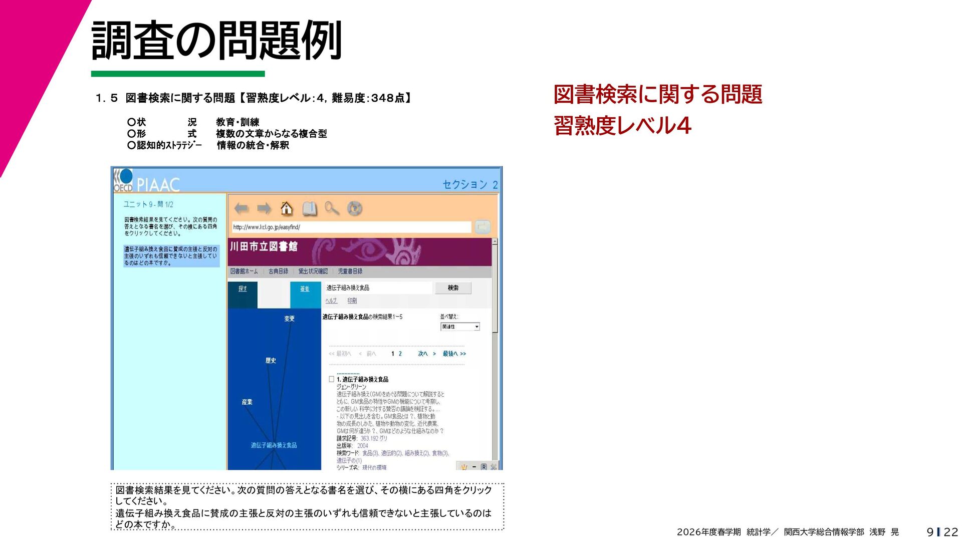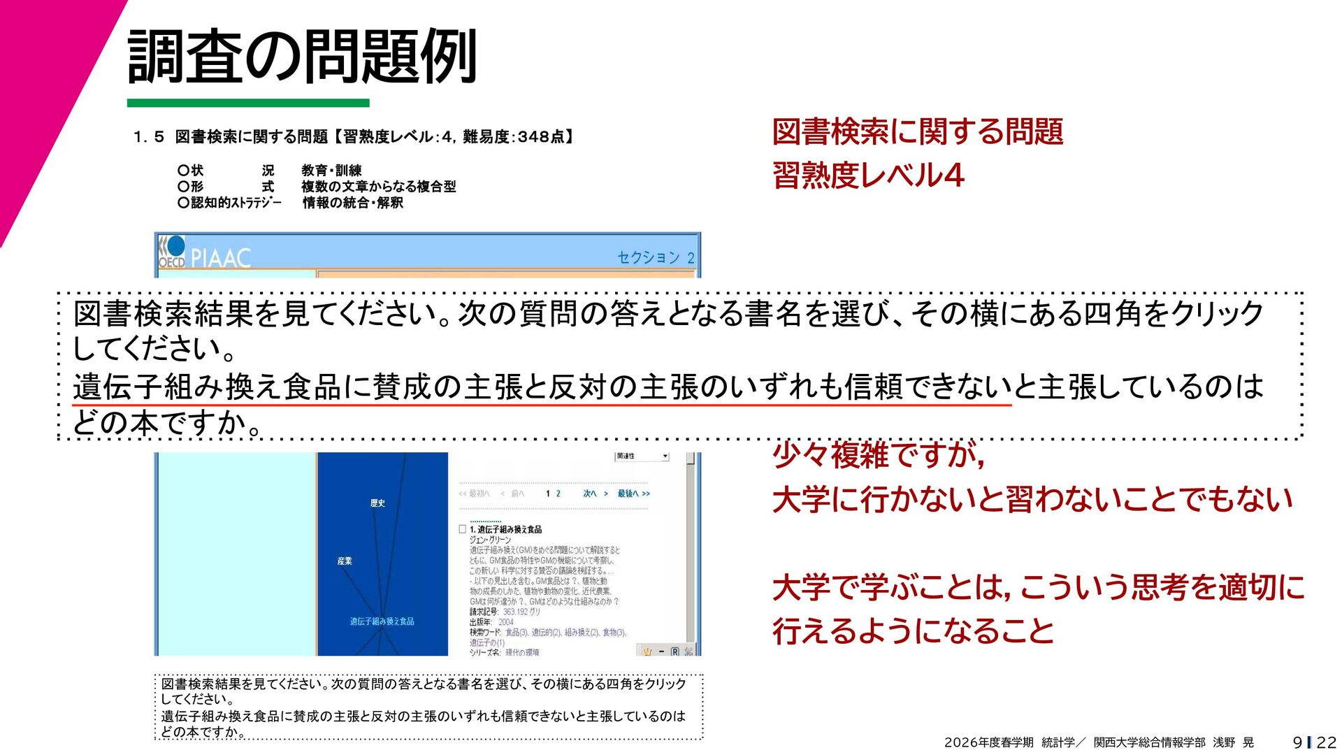4. 22 2026年度春学期 統計学/ 関西大学総合情報学部 浅野 晃 調査の問題例 9 1 1. .5 5 図 図書