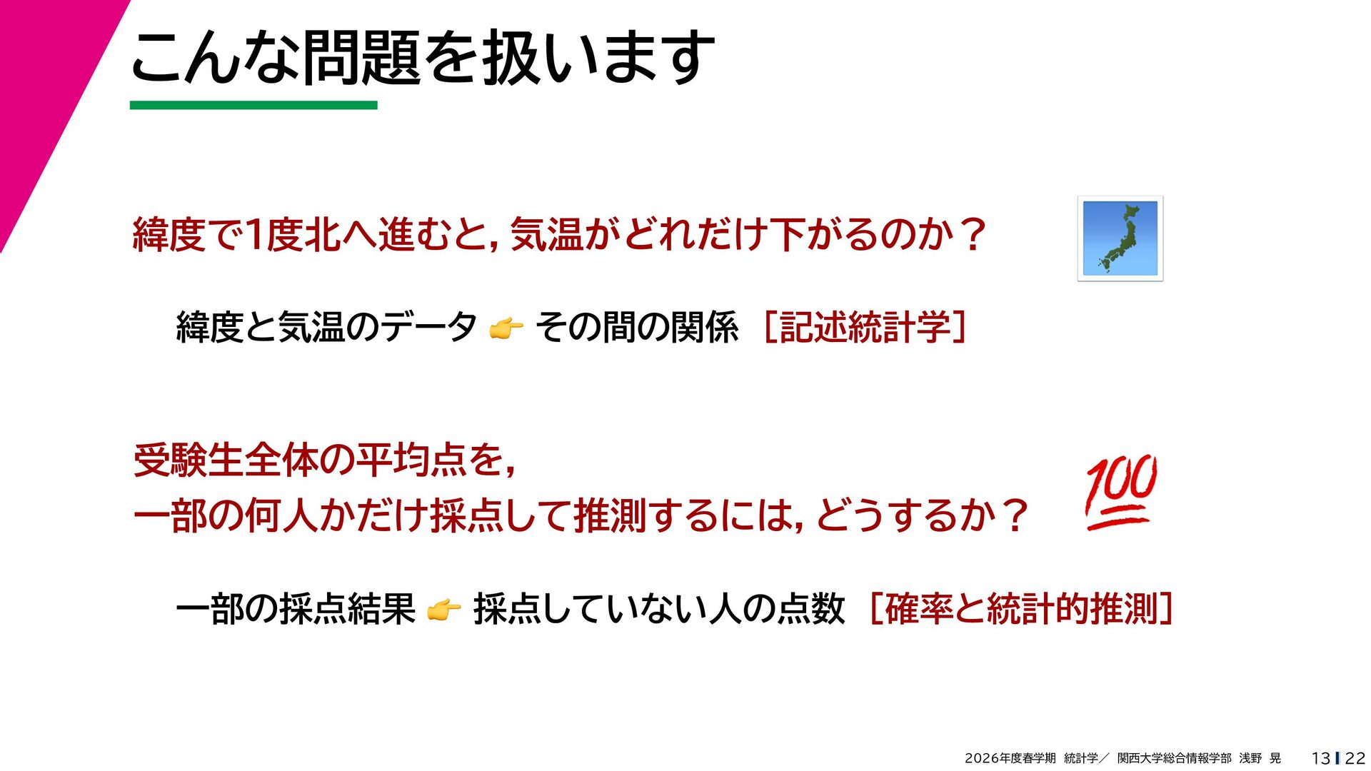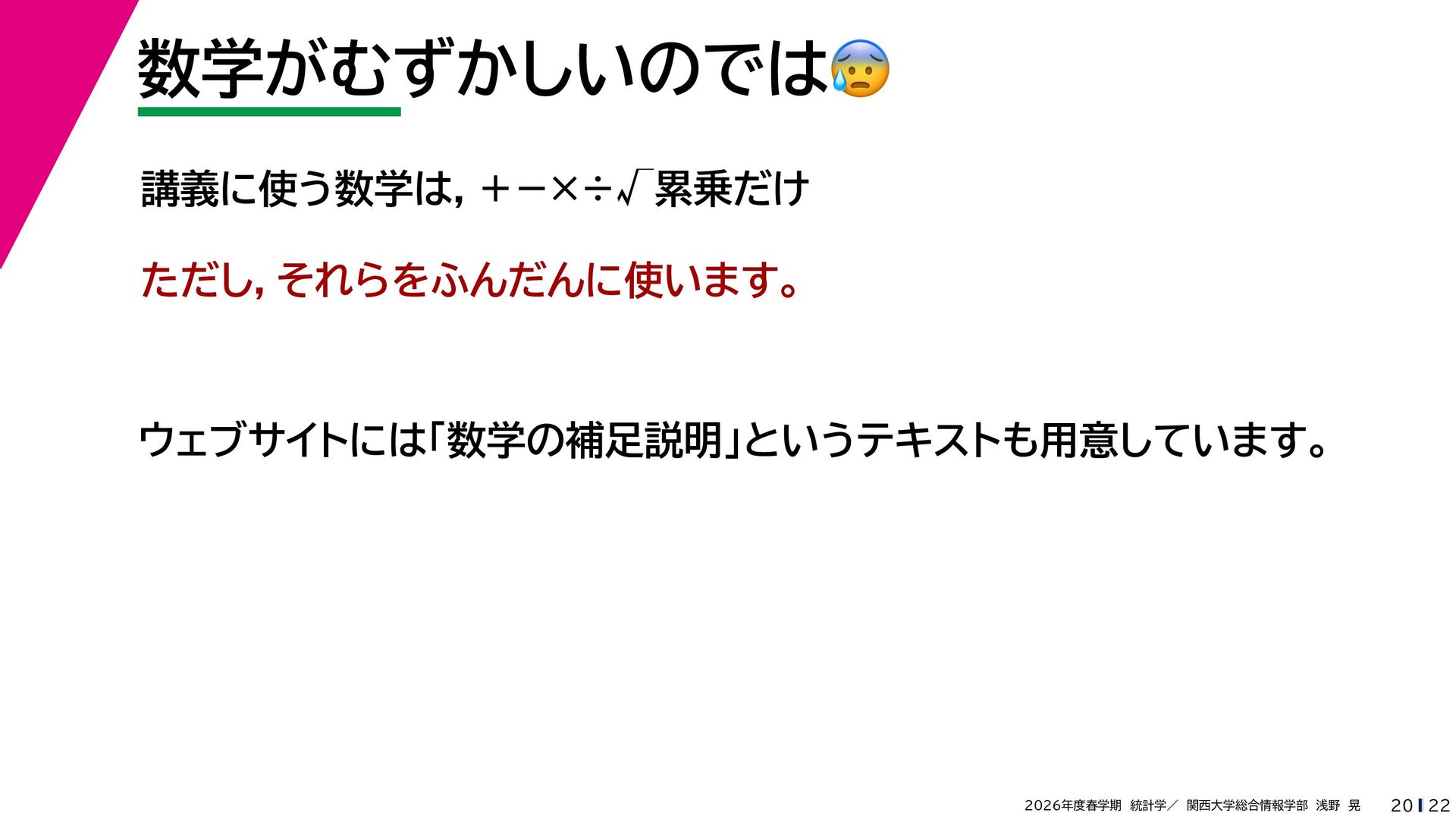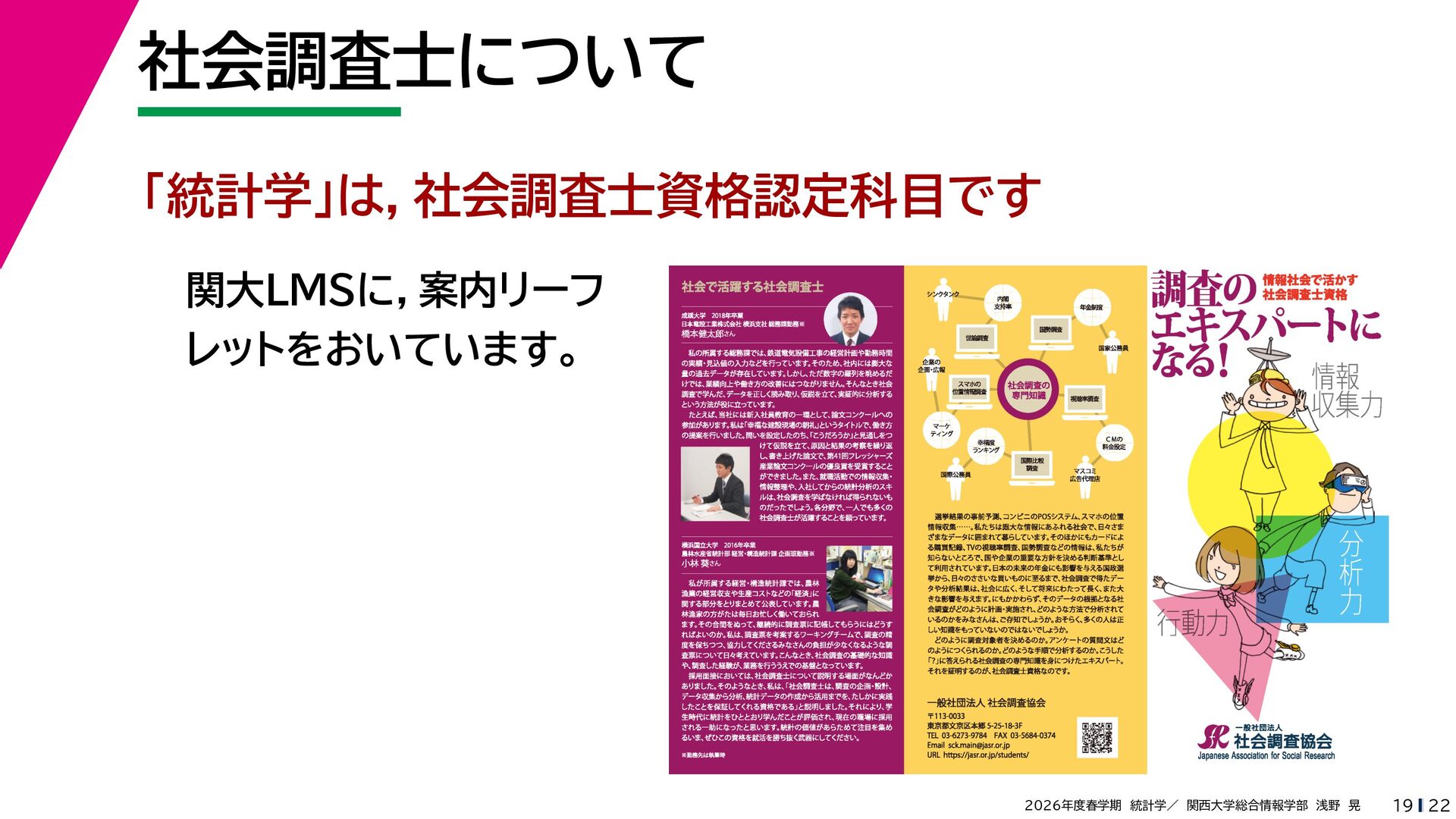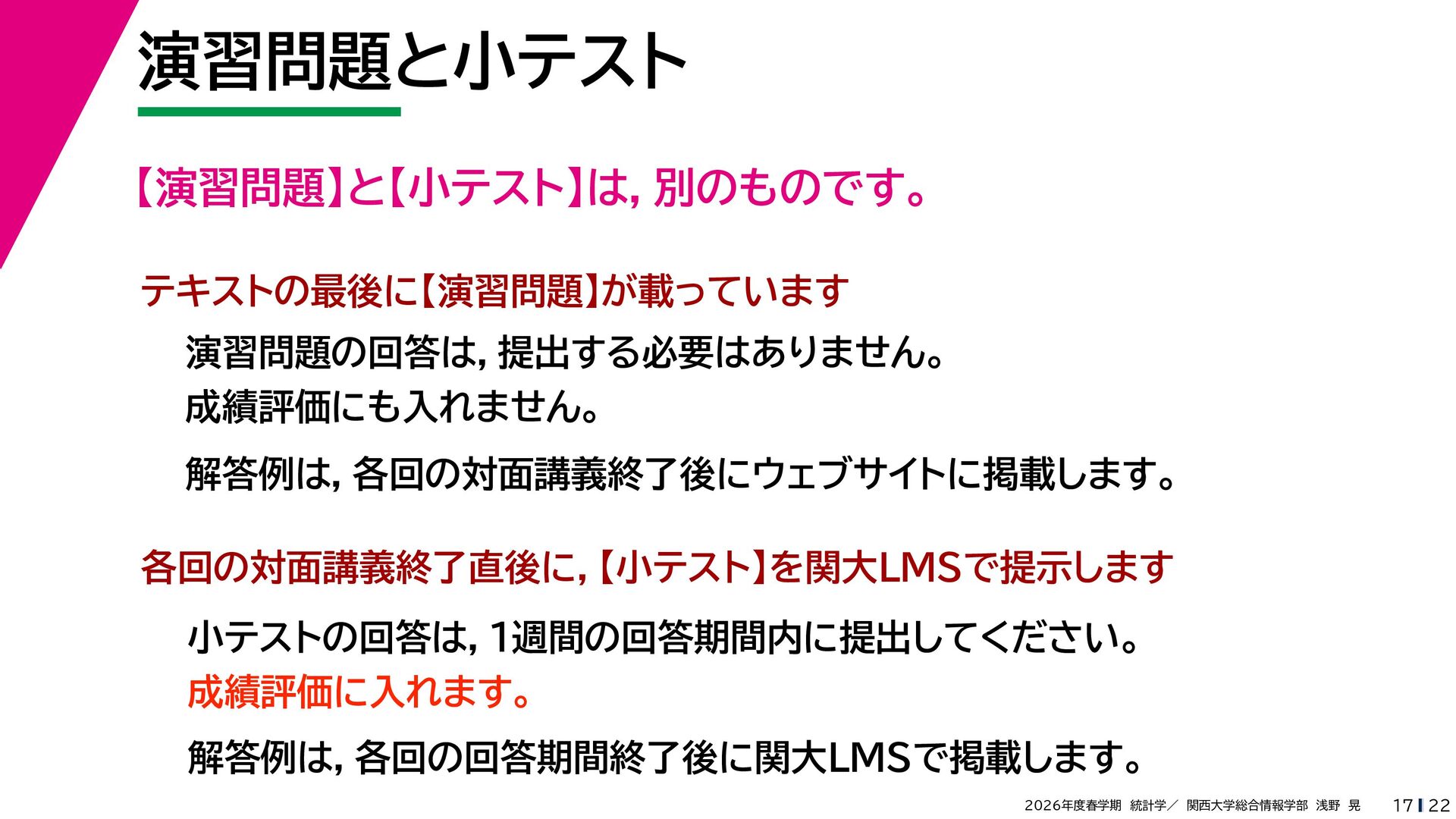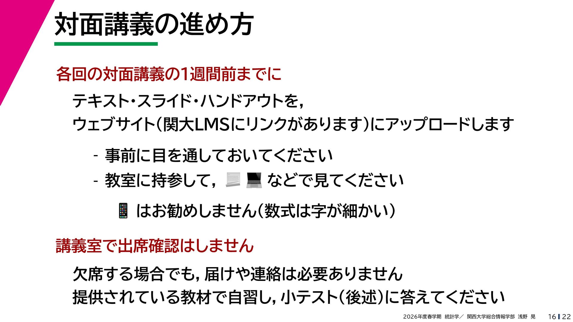 6. 22 2026年度春学期 統計学/ 関西大学総合情報学部 浅野 晃 対面講義の進め方 16 各回の対面講義の1週間前までに - 事前に目を通しておいてください - 教室に持参して, 📃📃